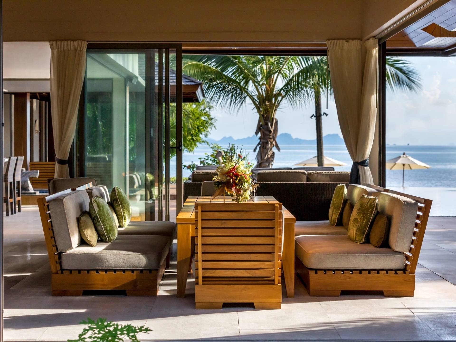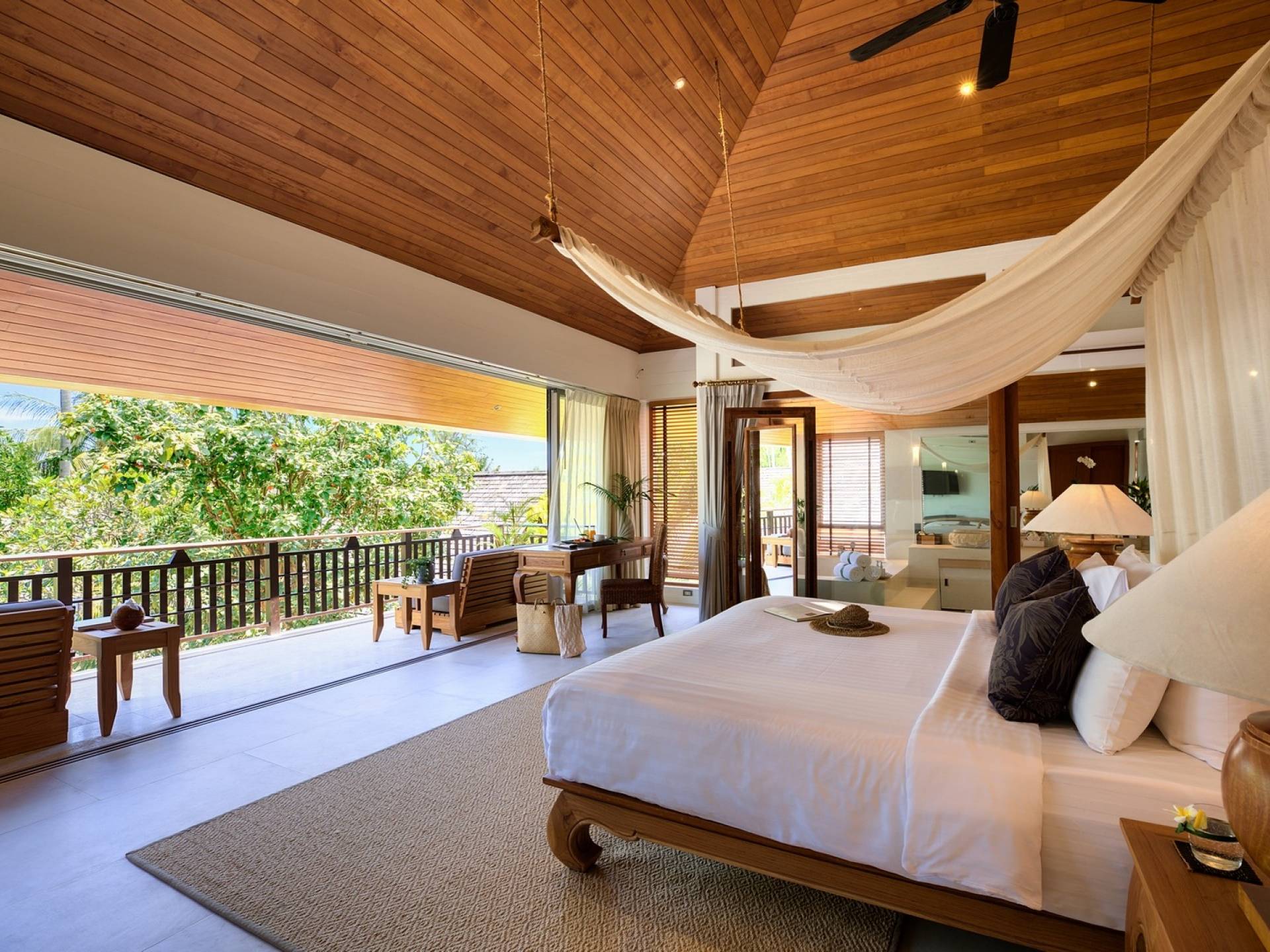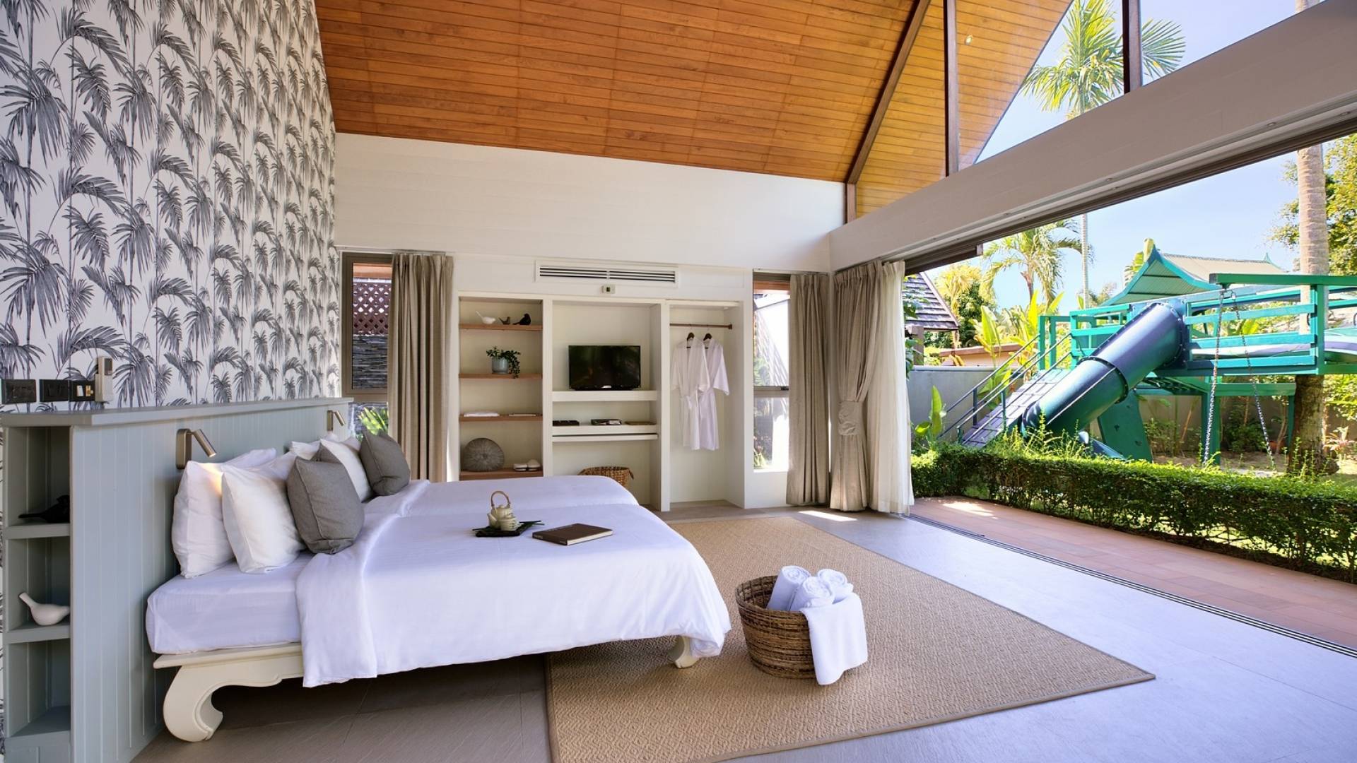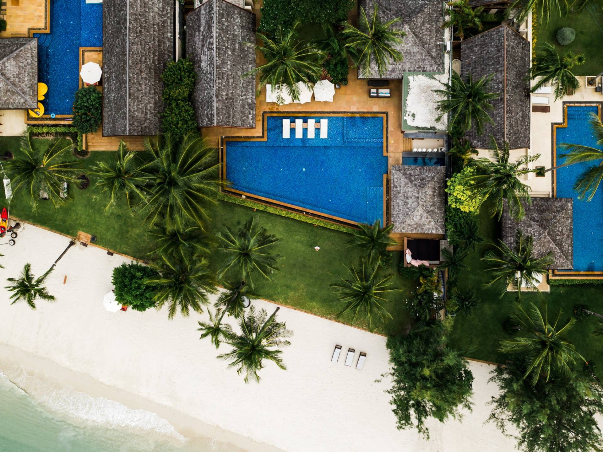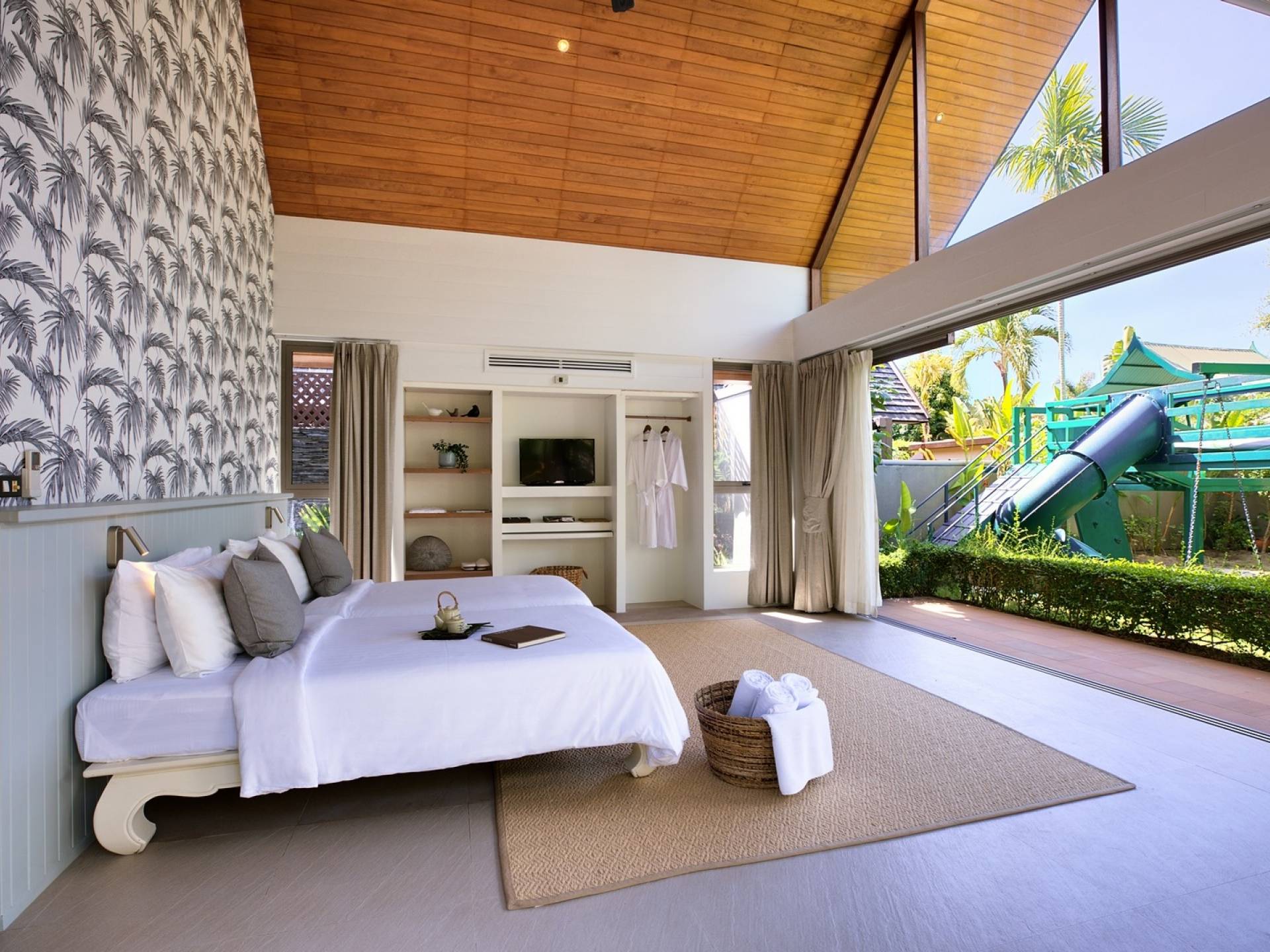 Le couchage a été aménagé pour accueillir les enfants jusqu'au bout. La grande suite parentale accueille 2 lits simples dans une alcôve avec portes coulissantes, la salle de jeux pour enfants peut être aménagée avec 3 lits simples et une salle de bain attenante et 2 des chambres parentales ont une mezzanine au-dessus de leur salle de bain attenante accessible via un échelle pliante (déconseillée aux enfants de moins de 12 ans), enfin, la chambre principale avant accueille un lit d'appoint dans une alcôve au sein de la grande chambre. La vraie vie tropicale tire le meilleur parti des douces brises marines de Samui et du temps chaud. À Baan Kilee, les portes et les fenêtres spécialement conçues peuvent être rabattues, tandis que le monde naturel est également accueilli par le choix de bardeaux de cèdre pour les toits, qui aident la villa à se fondre subtilement dans son environnement. Une bande de pelouse en bord de plage fait face aux espaces de vie, formant une frontière naturelle entre la grande piscine, la plage et la mer.