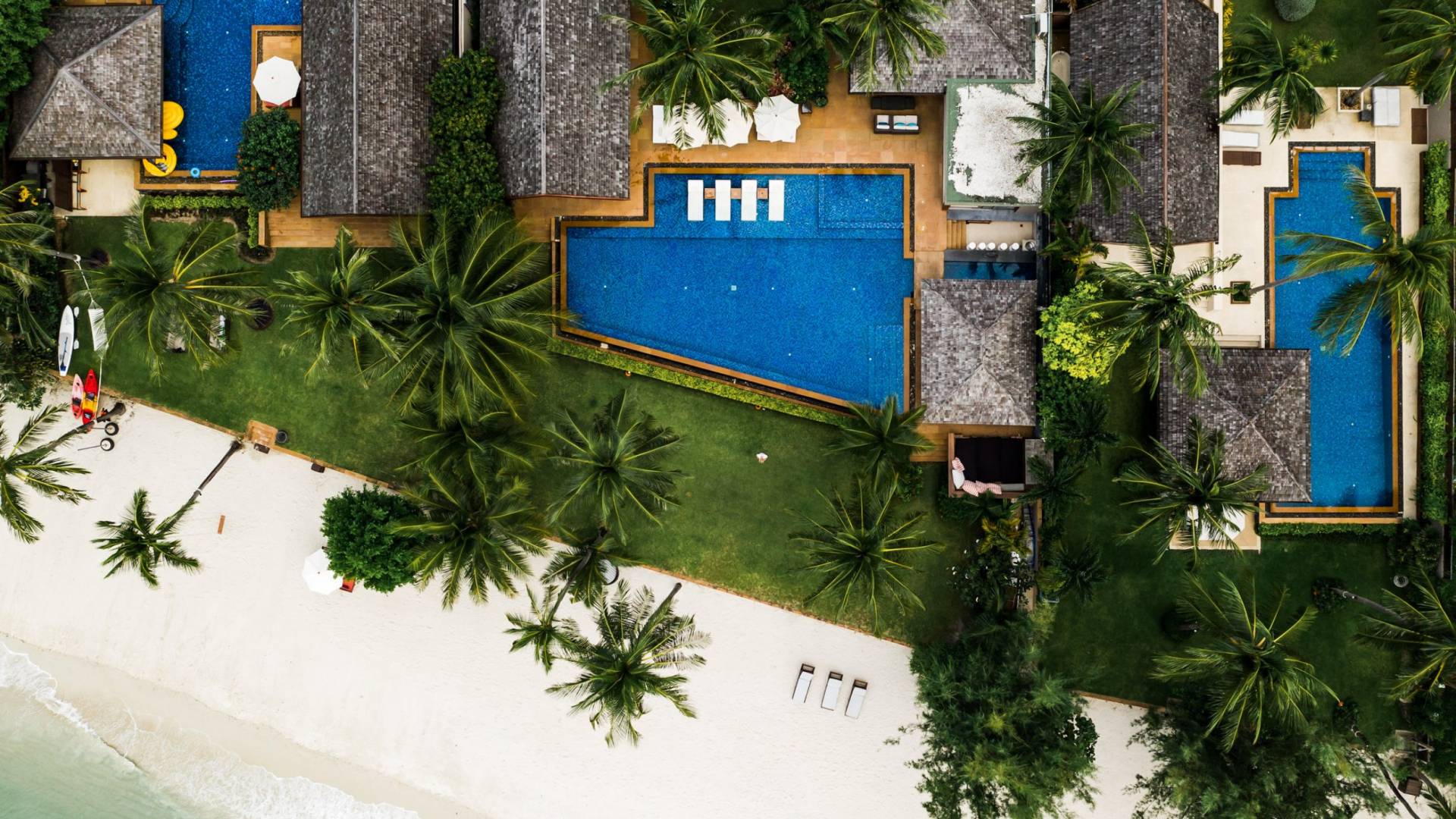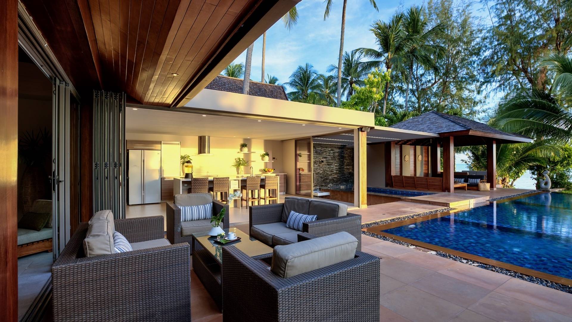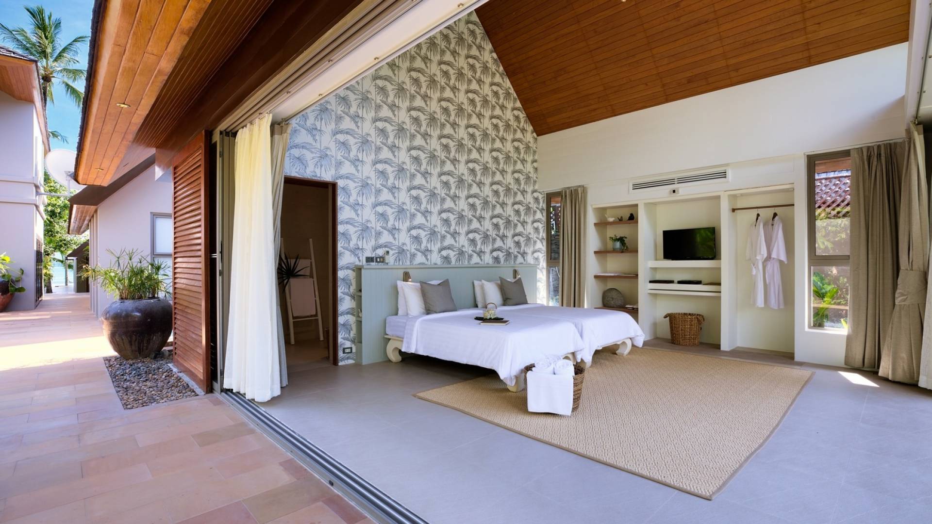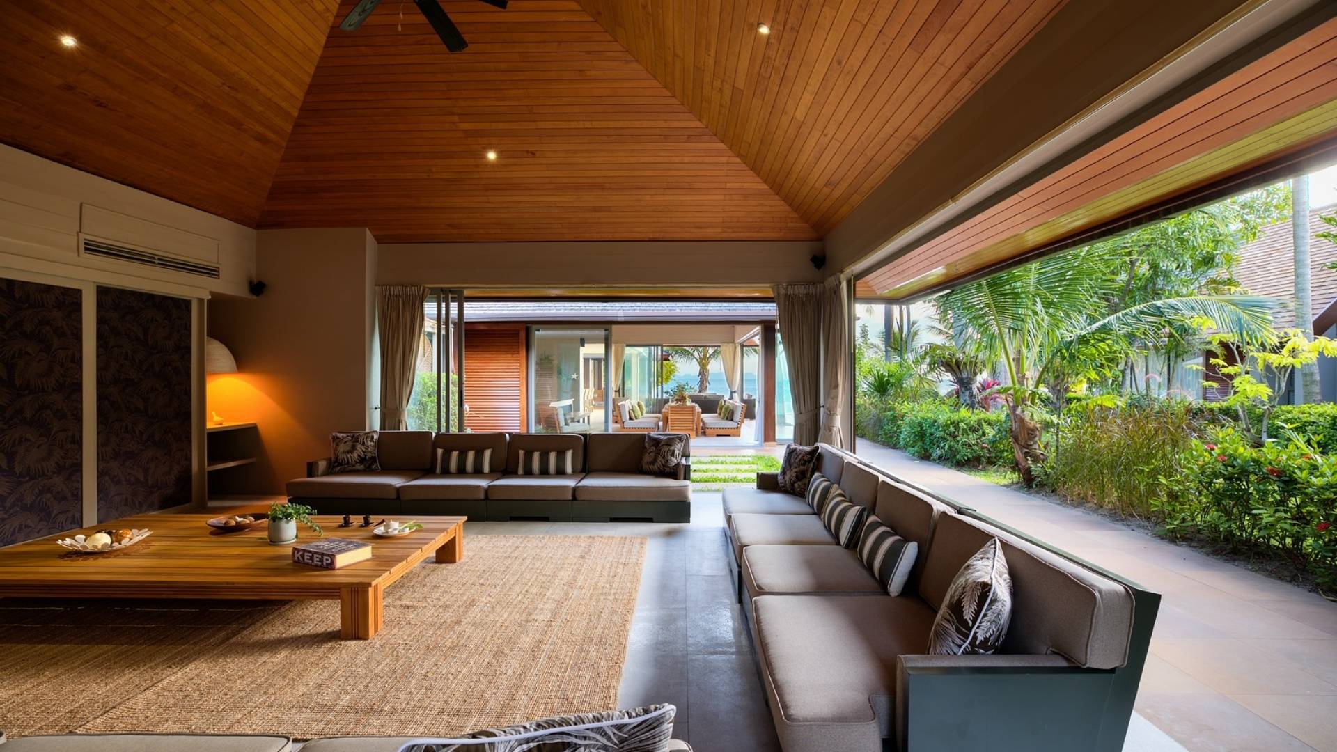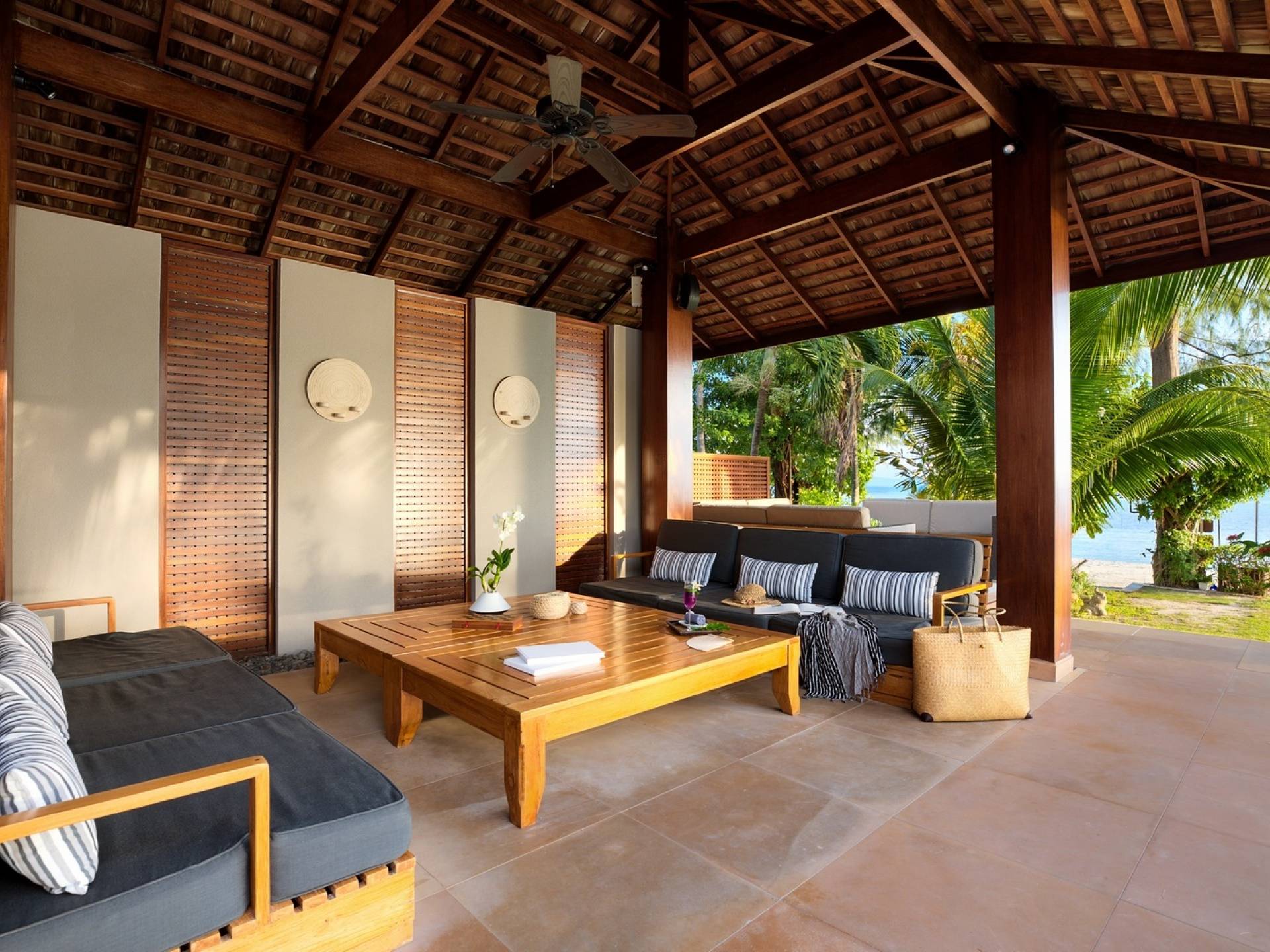 Le couchage a été aménagé pour accueillir les enfants jusqu'au bout. La grande suite parentale accueille 2 lits simples dans une alcôve avec portes coulissantes, la salle de jeux pour enfants peut être aménagée avec 3 lits simples et une salle de bain attenante et 2 des chambres parentales ont une mezzanine au-dessus de leur salle de bain attenante accessible via un échelle pliante (déconseillée aux enfants de moins de 12 ans), enfin, la chambre principale avant accueille un lit d'appoint dans une alcôve au sein de la grande chambre. La vraie vie tropicale tire le meilleur parti des douces brises marines de Samui et du temps chaud. À Baan Kilee, les portes et les fenêtres spécialement conçues peuvent être rabattues, tandis que le monde naturel est également accueilli par le choix de bardeaux de cèdre pour les toits, qui aident la villa à se fondre subtilement dans son environnement. Une bande de pelouse en bord de plage fait face aux espaces de vie, formant une frontière naturelle entre la grande piscine, la plage et la mer.
