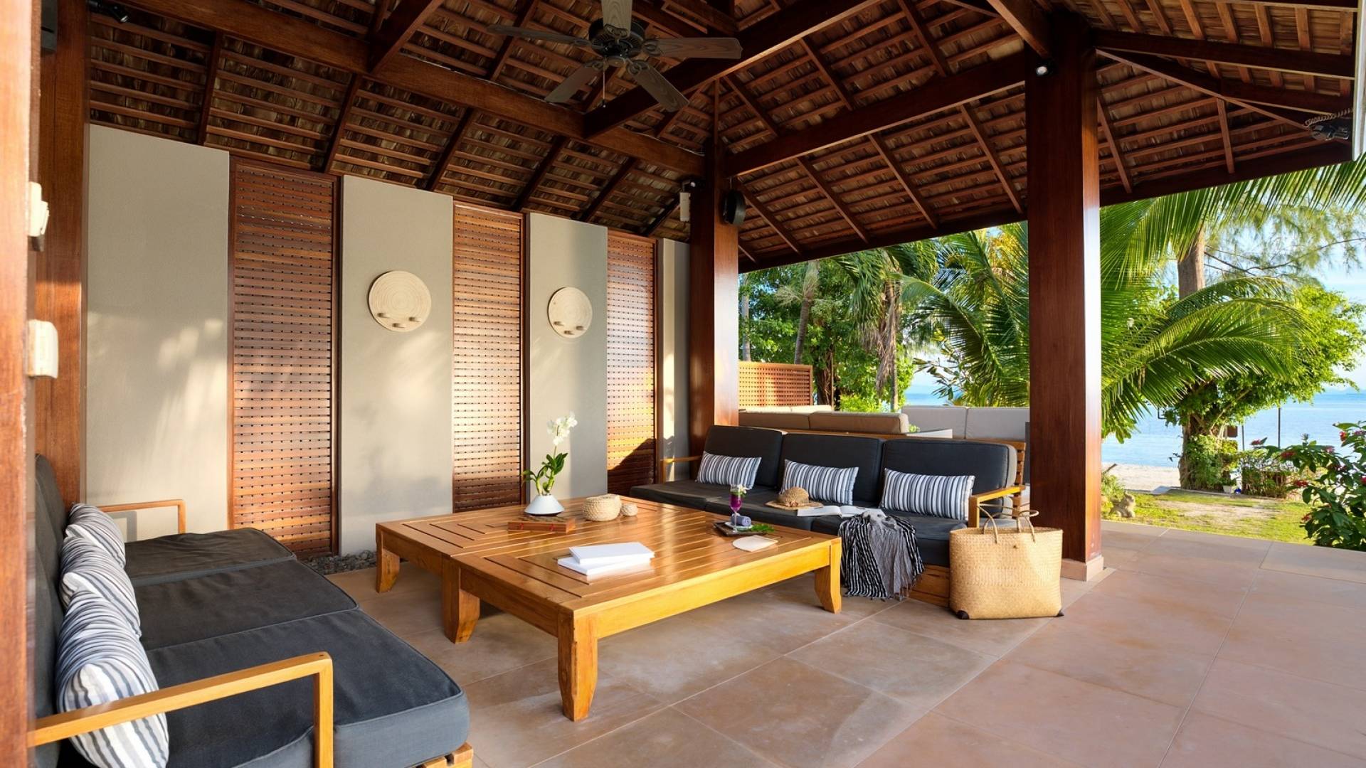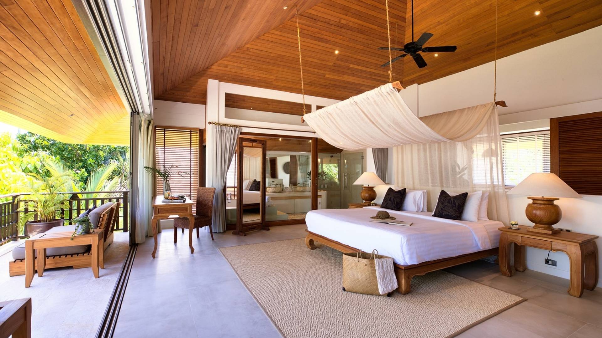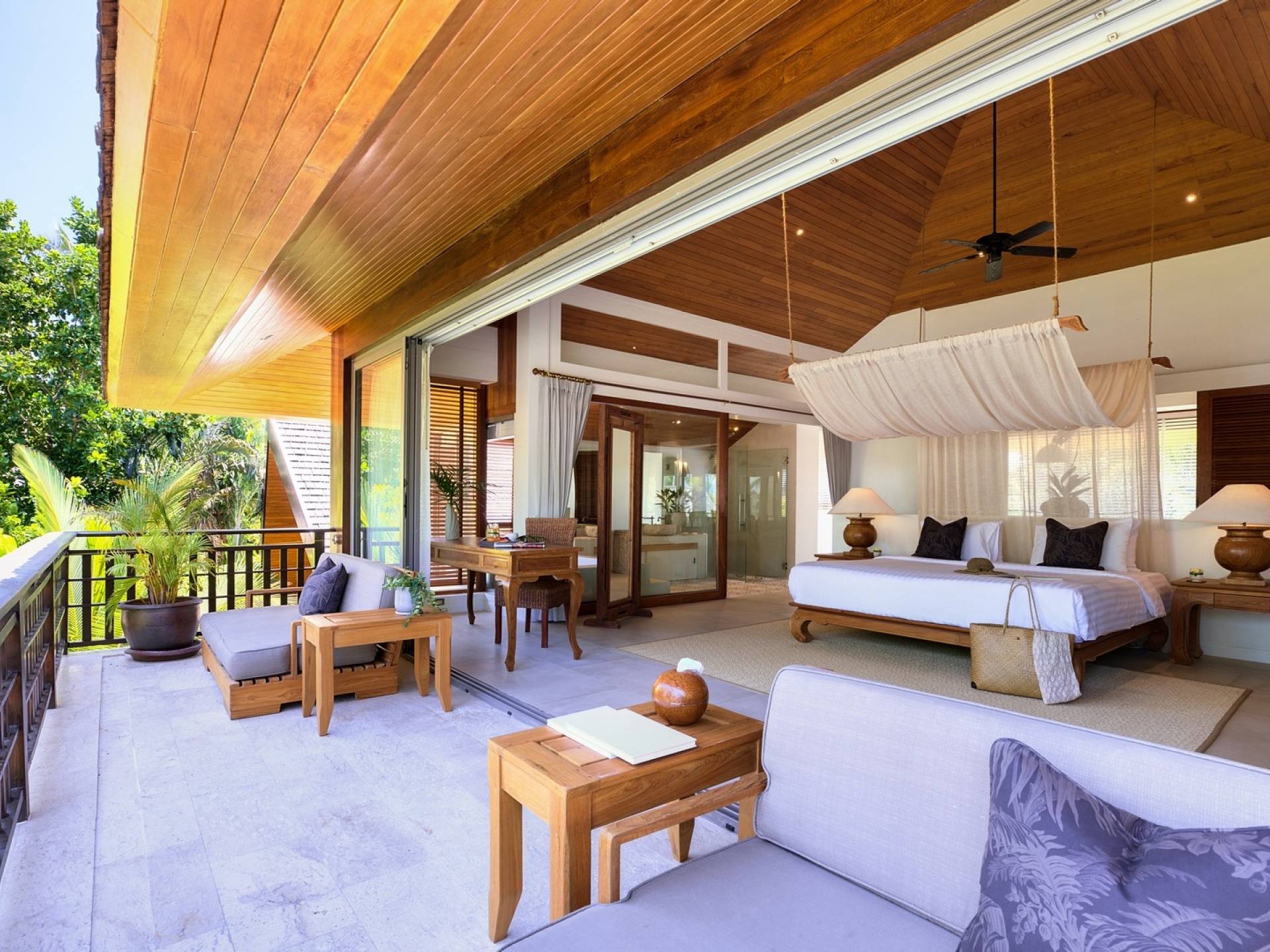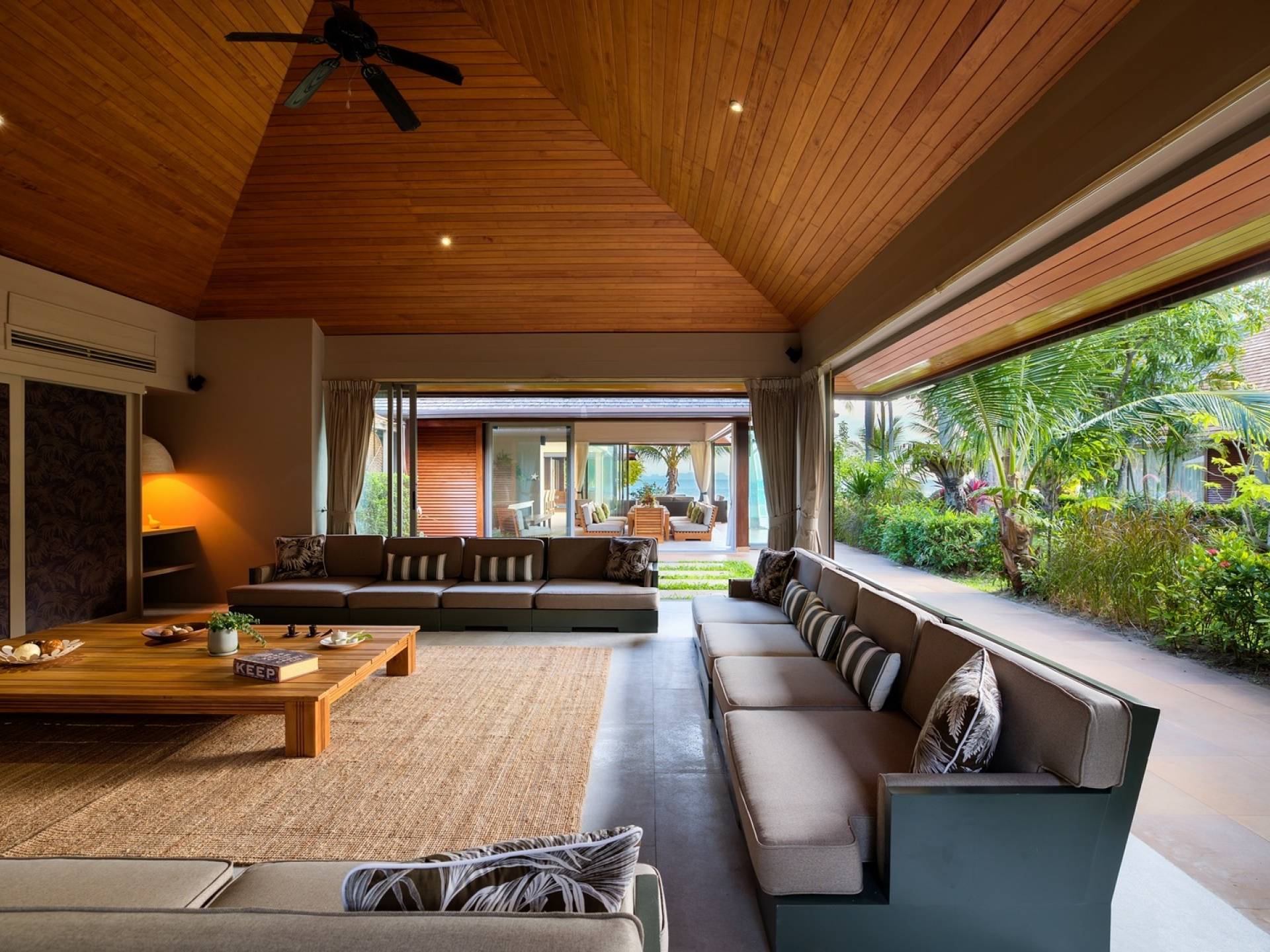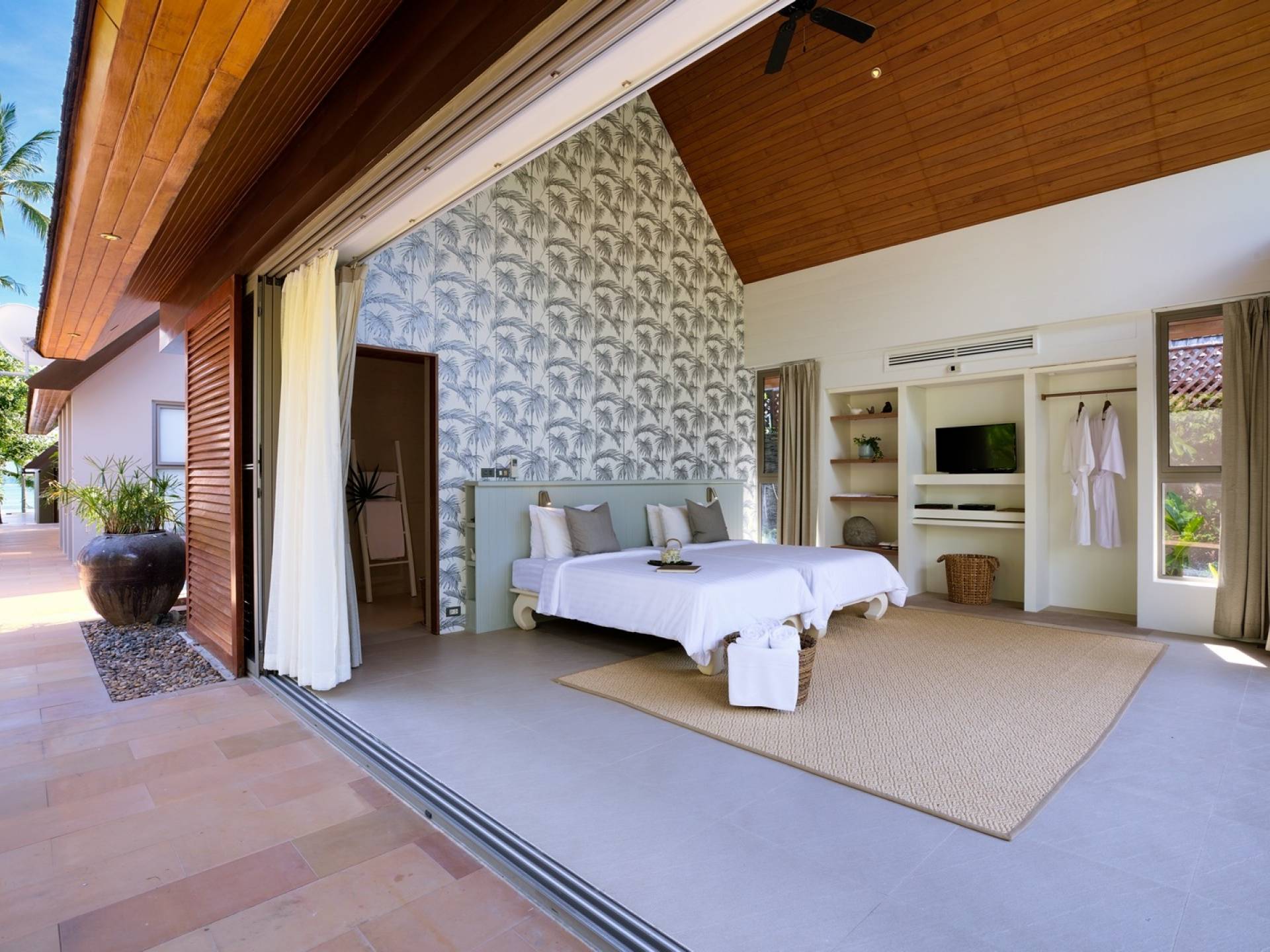 Le couchage a été aménagé pour accueillir les enfants jusqu'au bout. La grande suite parentale accueille 2 lits simples dans une alcôve avec portes coulissantes, la salle de jeux pour enfants peut être aménagée avec 3 lits simples et une salle de bain attenante et 2 des chambres parentales ont une mezzanine au-dessus de leur salle de bain attenante accessible via un échelle pliante (déconseillée aux enfants de moins de 12 ans), enfin, la chambre principale avant accueille un lit d'appoint dans une alcôve au sein de la grande chambre. La vraie vie tropicale tire le meilleur parti des douces brises marines de Samui et du temps chaud. À Baan Kilee, les portes et les fenêtres spécialement conçues peuvent être rabattues, tandis que le monde naturel est également accueilli par le choix de bardeaux de cèdre pour les toits, qui aident la villa à se fondre subtilement dans son environnement. Une bande de pelouse en bord de plage fait face aux espaces de vie, formant une frontière naturelle entre la grande piscine, la plage et la mer.