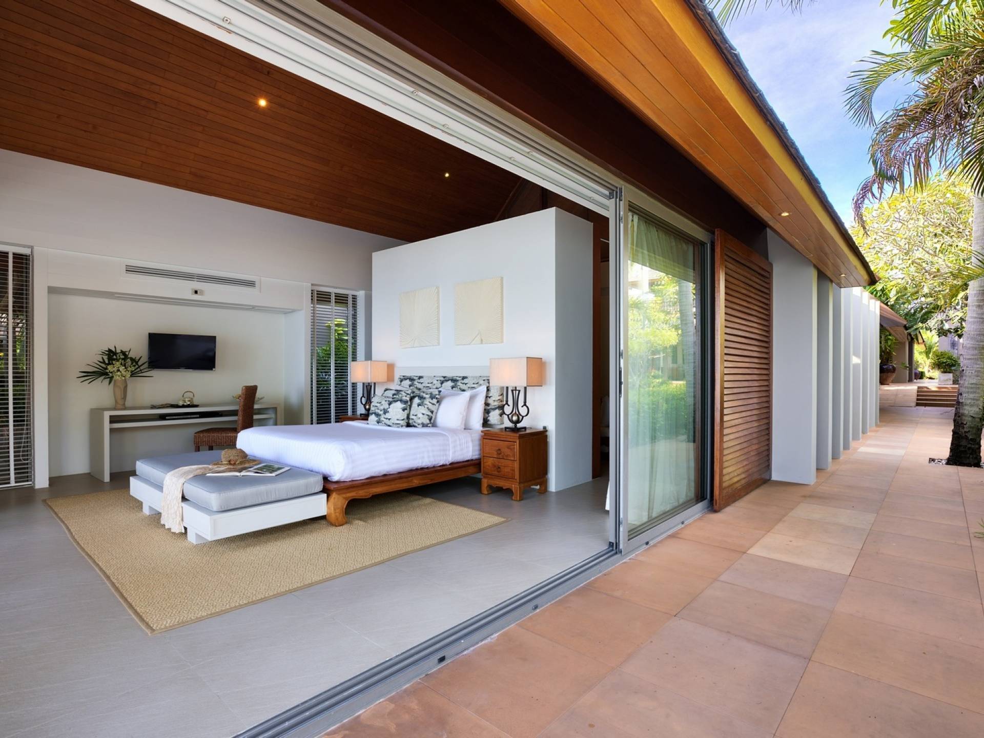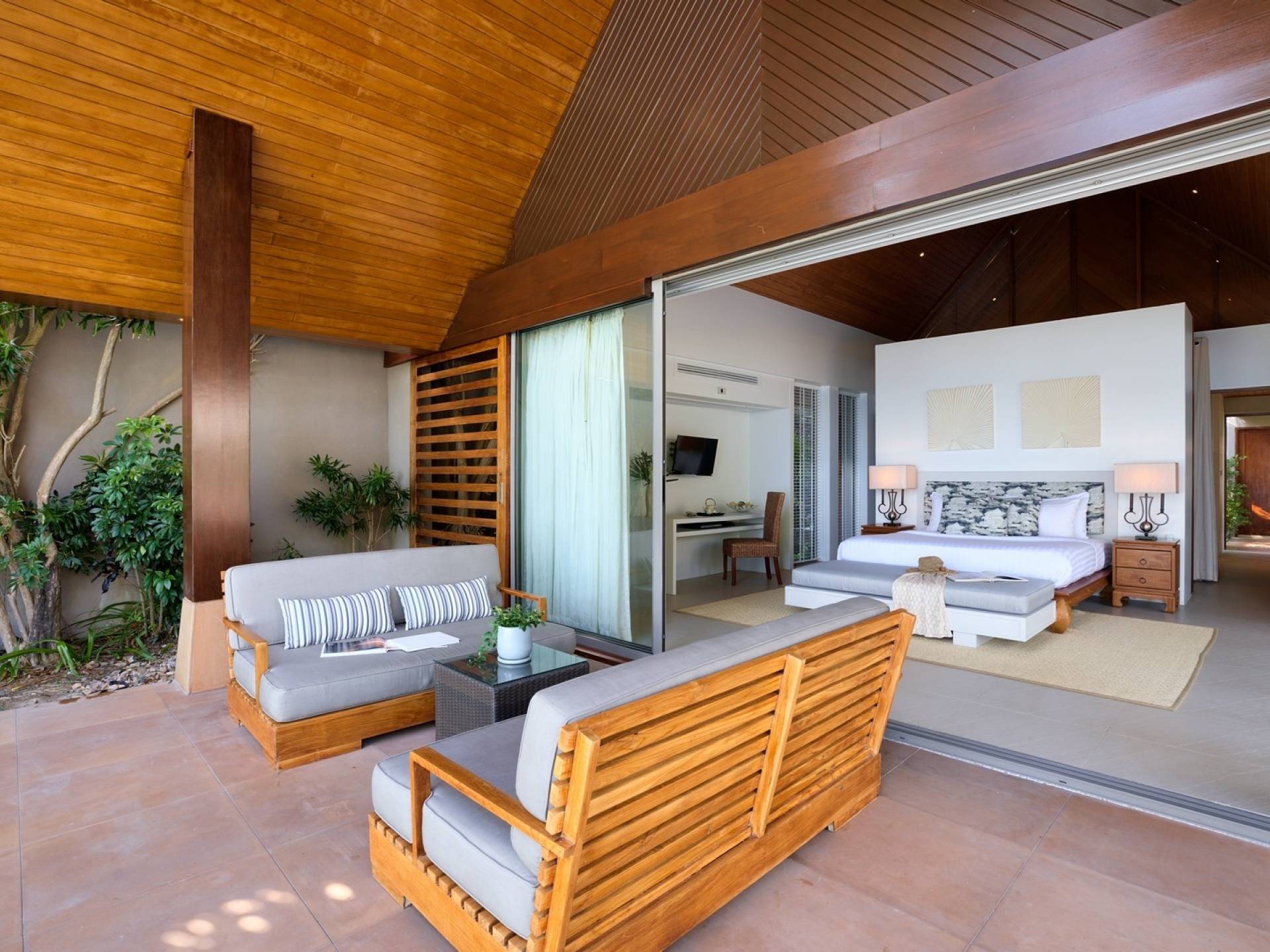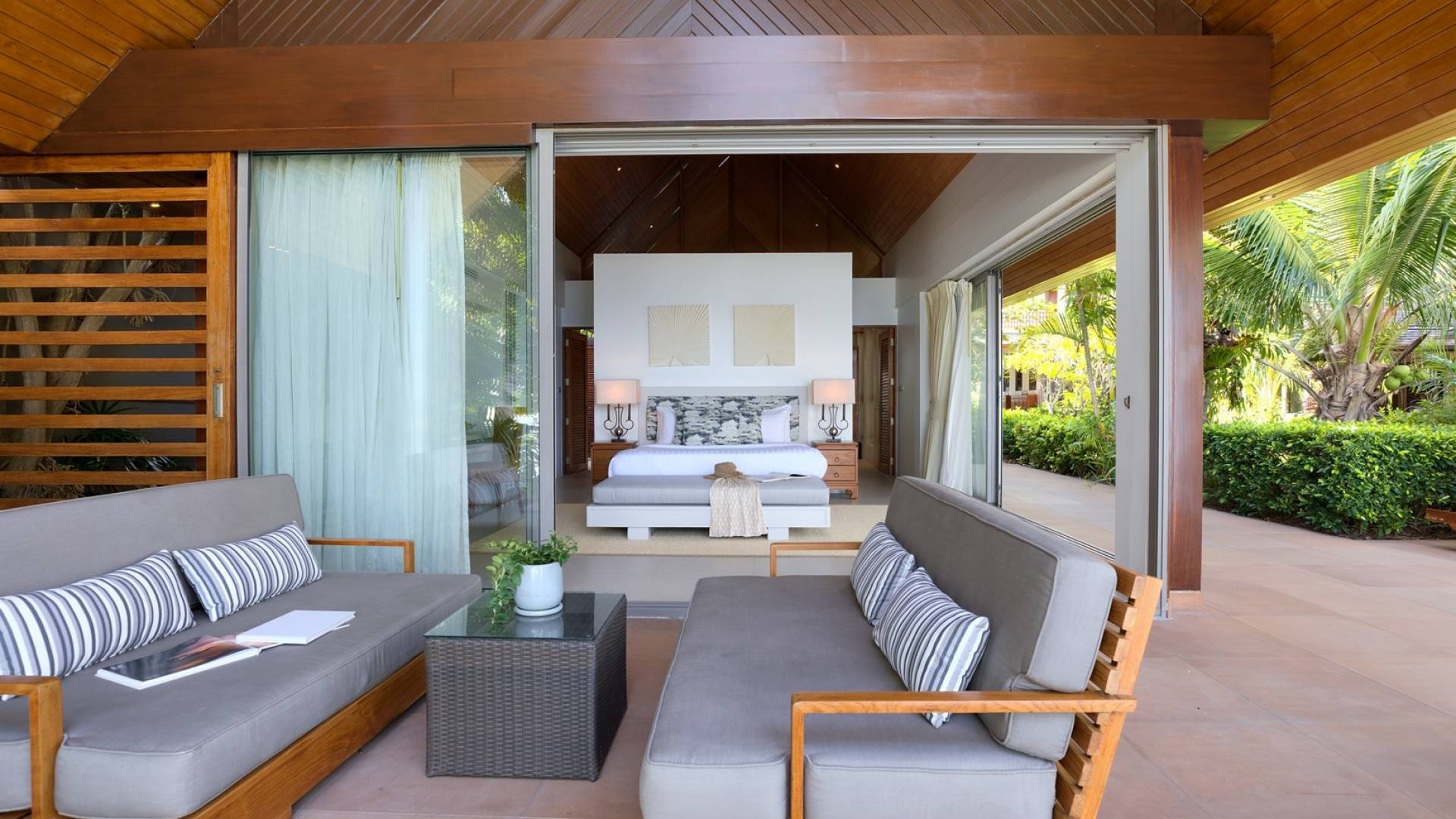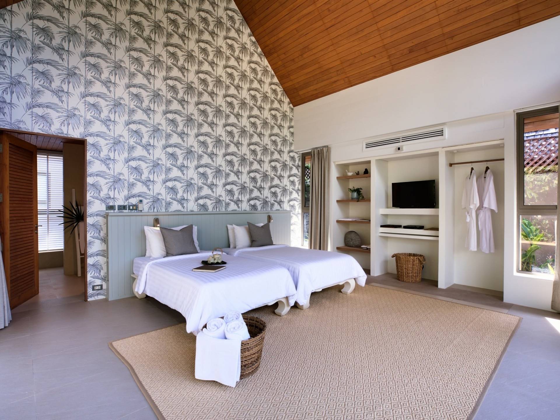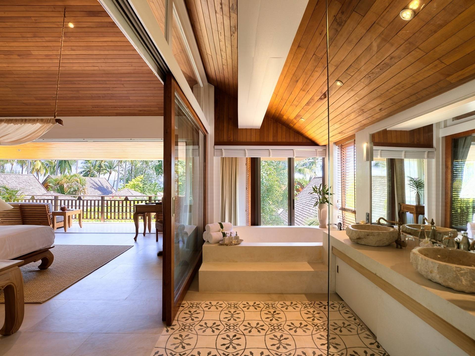 Le couchage a été aménagé pour accueillir les enfants jusqu'au bout. La grande suite parentale accueille 2 lits simples dans une alcôve avec portes coulissantes, la salle de jeux pour enfants peut être aménagée avec 3 lits simples et une salle de bain attenante et 2 des chambres parentales ont une mezzanine au-dessus de leur salle de bain attenante accessible via un échelle pliante (déconseillée aux enfants de moins de 12 ans), enfin, la chambre principale avant accueille un lit d'appoint dans une alcôve au sein de la grande chambre. La vraie vie tropicale tire le meilleur parti des douces brises marines de Samui et du temps chaud. À Baan Kilee, les portes et les fenêtres spécialement conçues peuvent être rabattues, tandis que le monde naturel est également accueilli par le choix de bardeaux de cèdre pour les toits, qui aident la villa à se fondre subtilement dans son environnement. Une bande de pelouse en bord de plage fait face aux espaces de vie, formant une frontière naturelle entre la grande piscine, la plage et la mer.