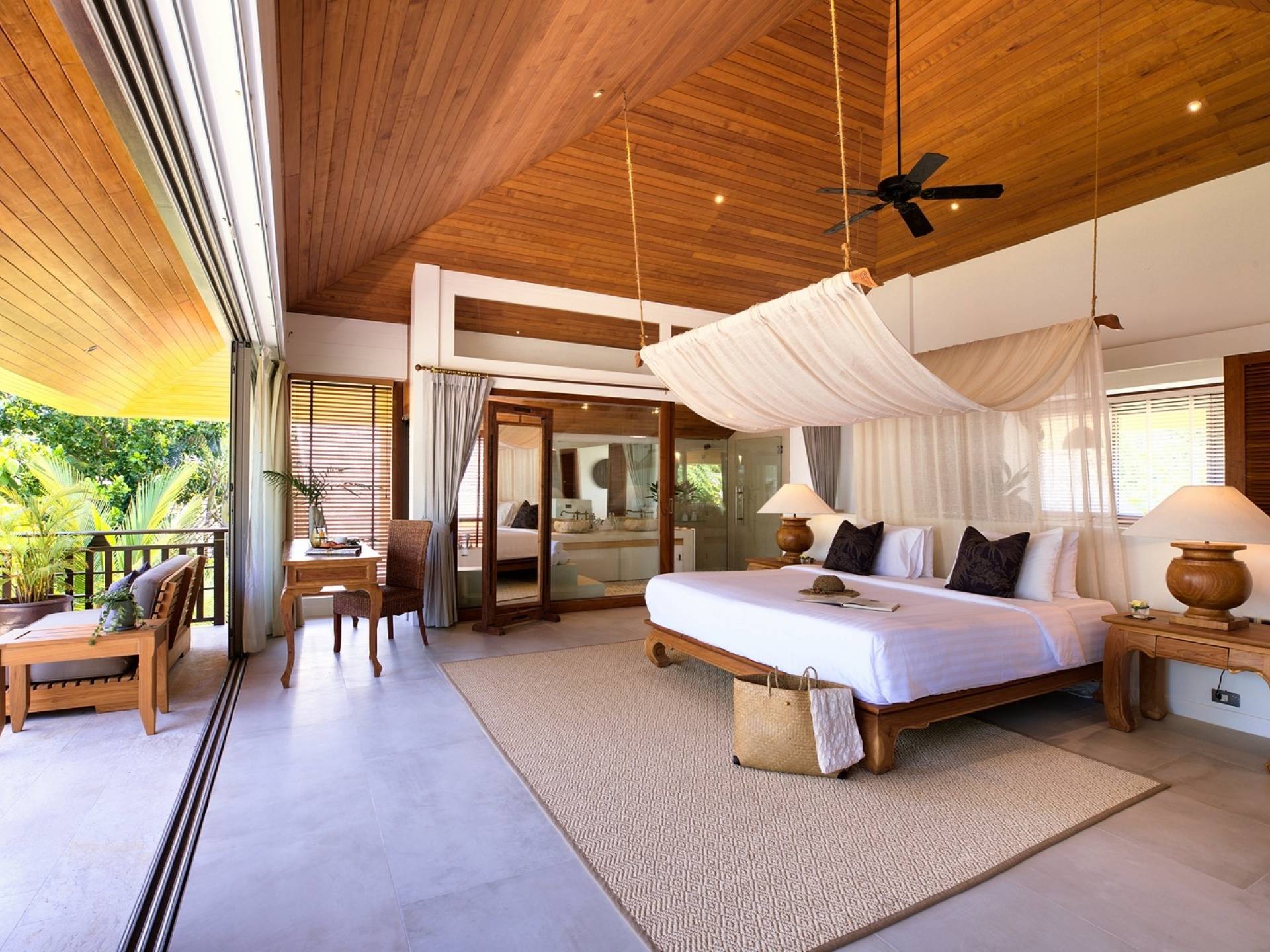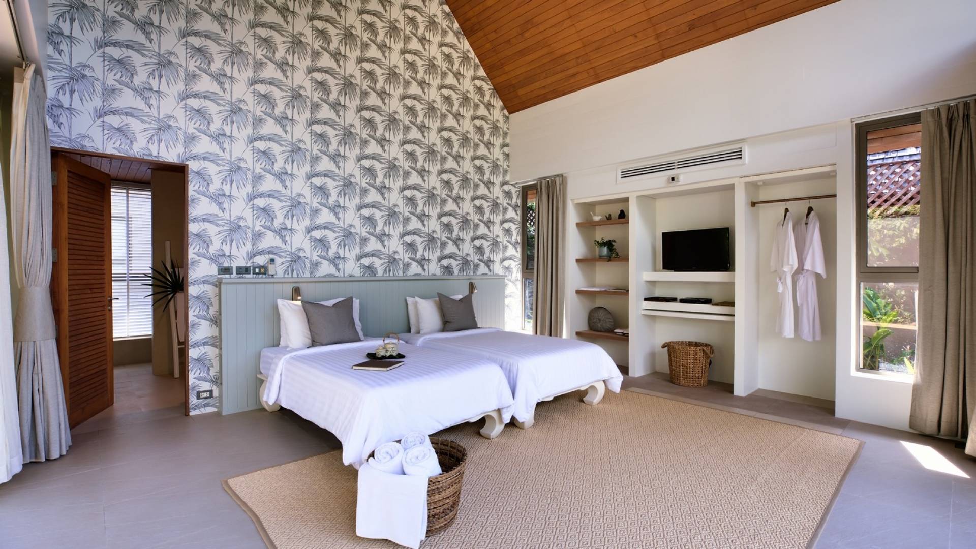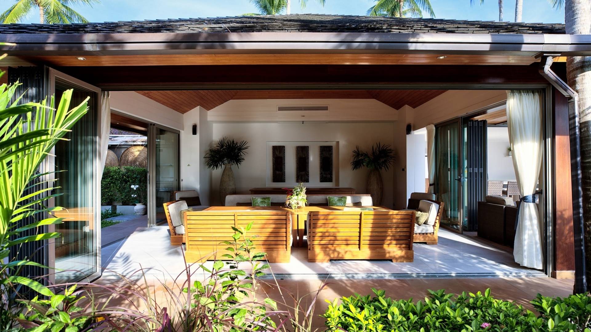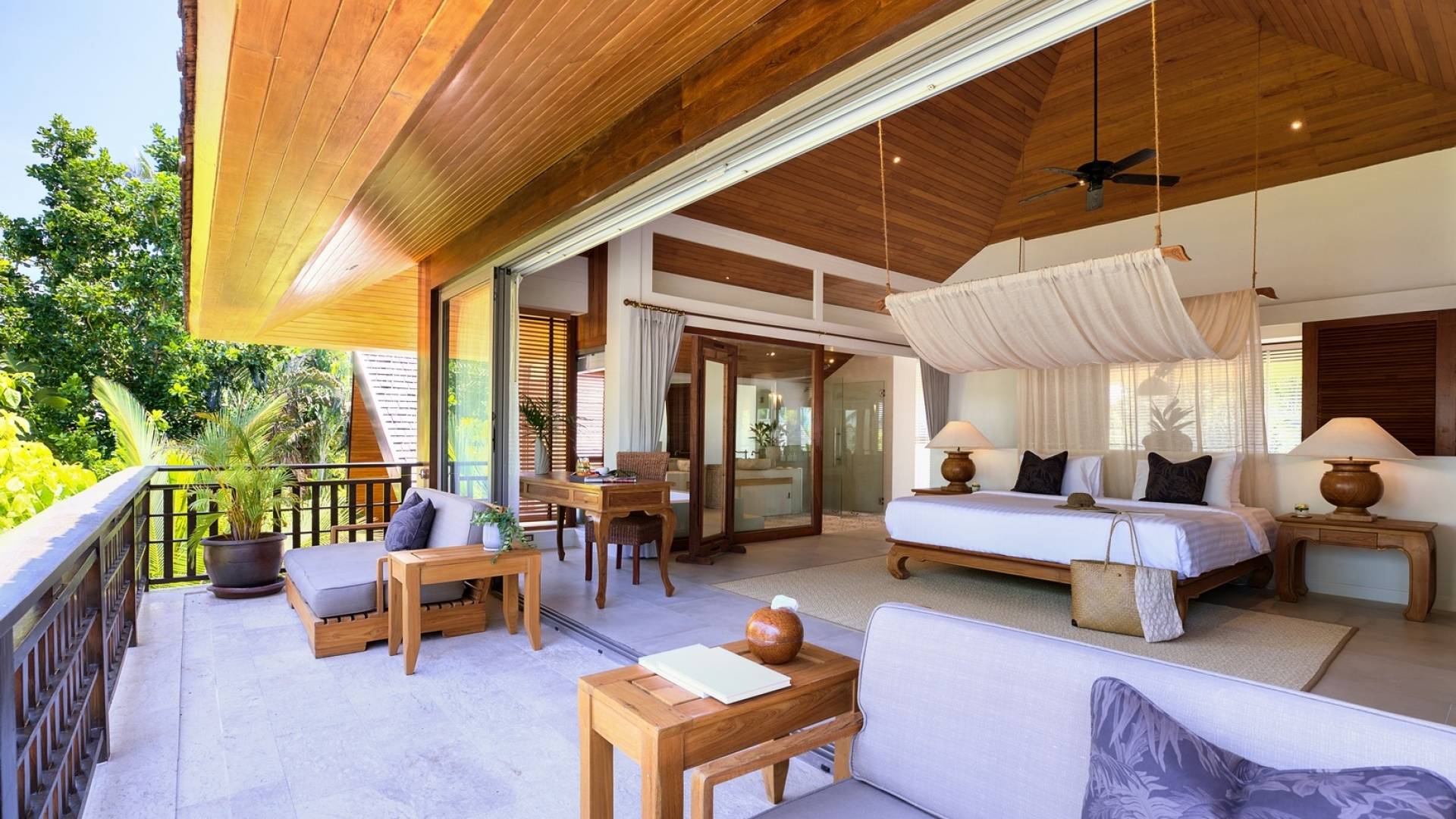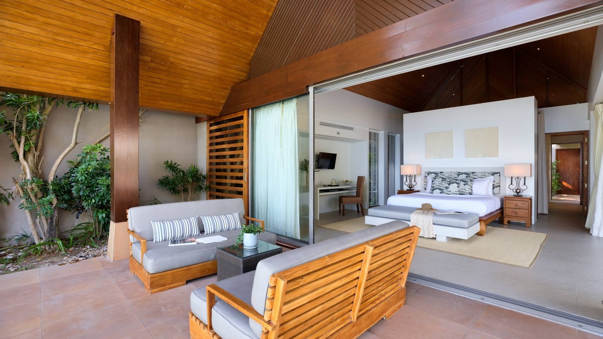 Le couchage a été aménagé pour accueillir les enfants jusqu'au bout. La grande suite parentale accueille 2 lits simples dans une alcôve avec portes coulissantes, la salle de jeux pour enfants peut être aménagée avec 3 lits simples et une salle de bain attenante et 2 des chambres parentales ont une mezzanine au-dessus de leur salle de bain attenante accessible via un échelle pliante (déconseillée aux enfants de moins de 12 ans), enfin, la chambre principale avant accueille un lit d'appoint dans une alcôve au sein de la grande chambre. La vraie vie tropicale tire le meilleur parti des douces brises marines de Samui et du temps chaud. À Baan Kilee, les portes et les fenêtres spécialement conçues peuvent être rabattues, tandis que le monde naturel est également accueilli par le choix de bardeaux de cèdre pour les toits, qui aident la villa à se fondre subtilement dans son environnement. Une bande de pelouse en bord de plage fait face aux espaces de vie, formant une frontière naturelle entre la grande piscine, la plage et la mer.