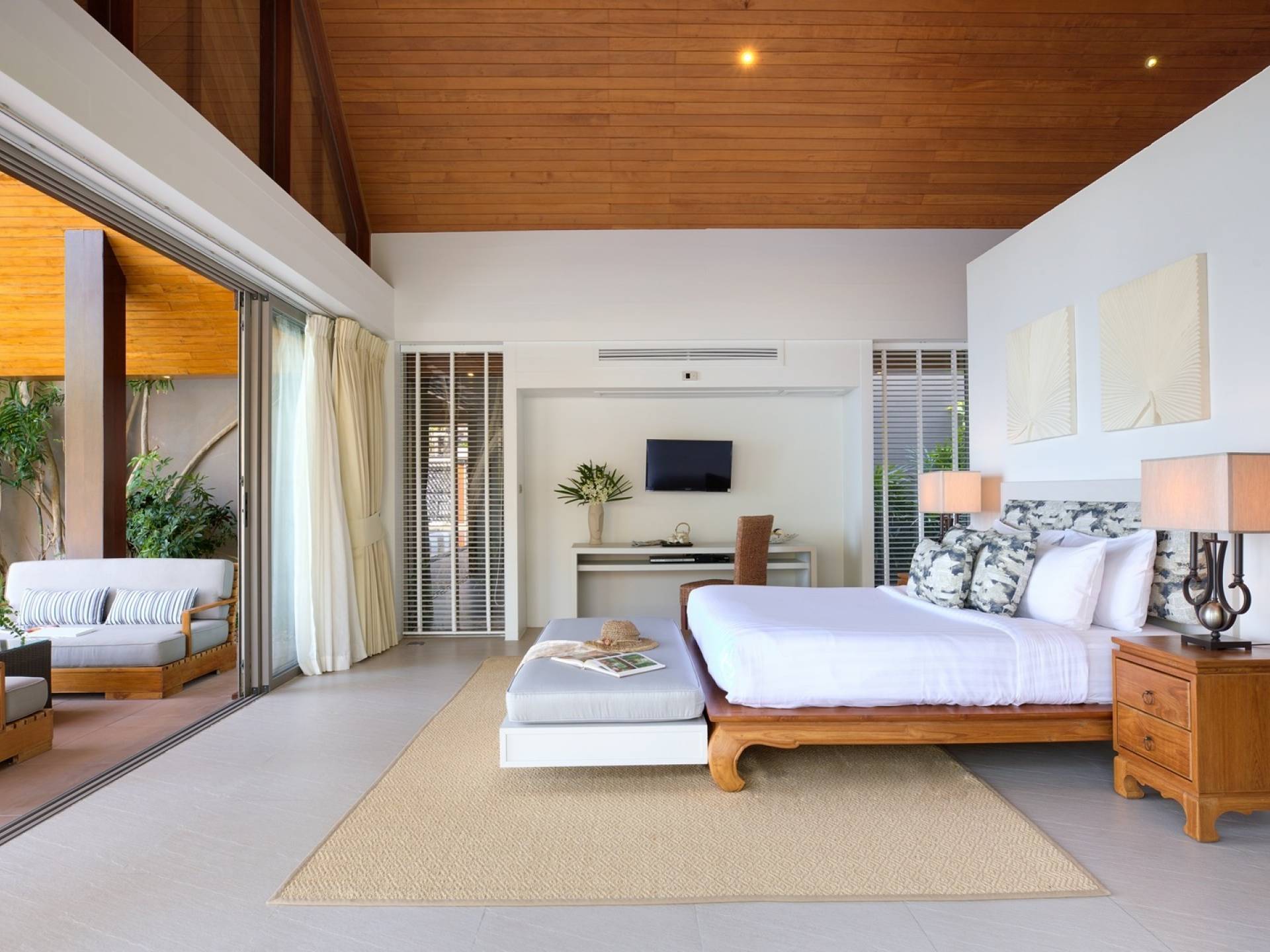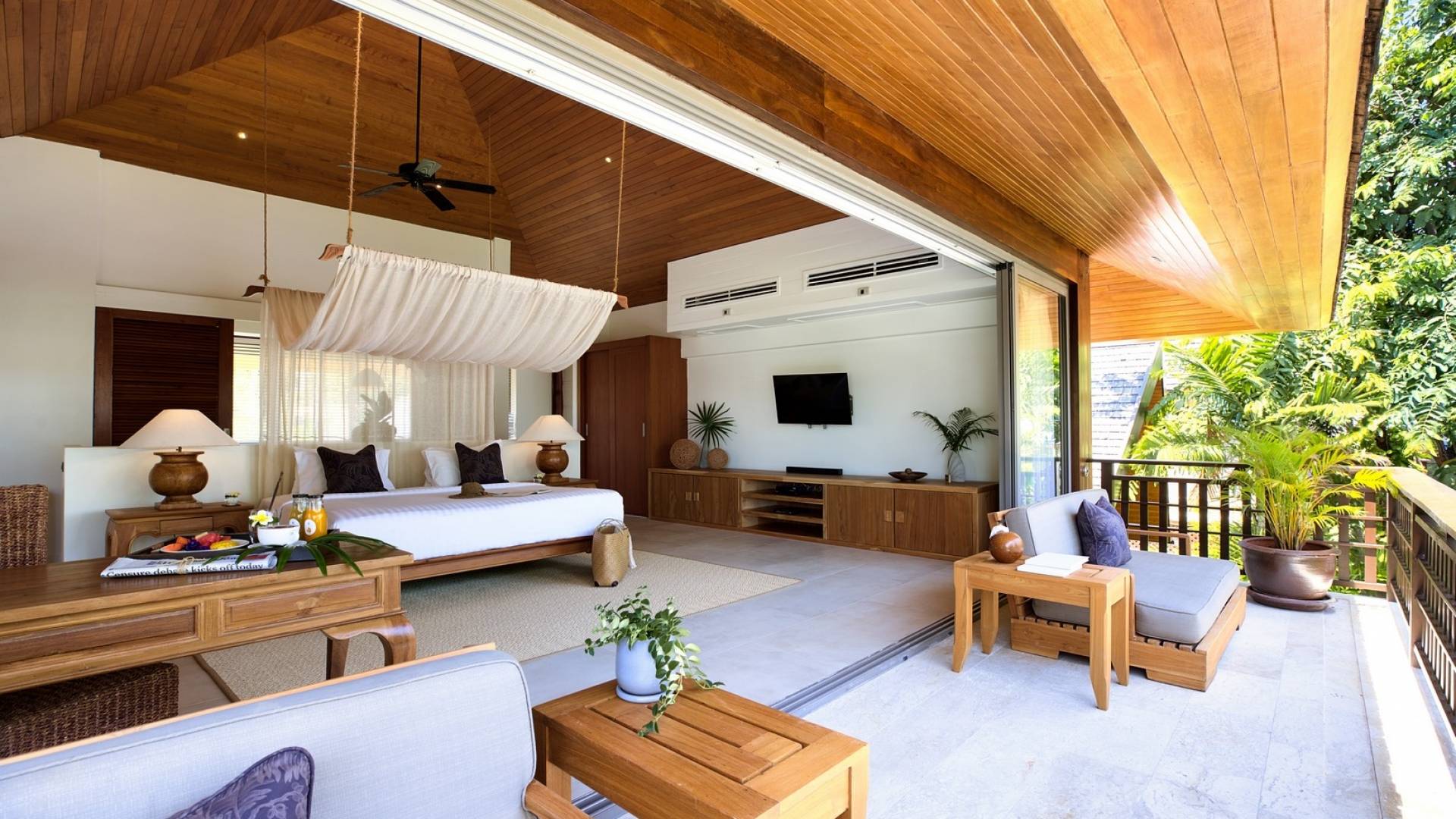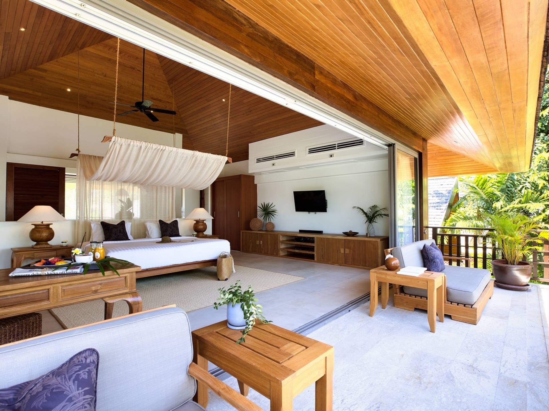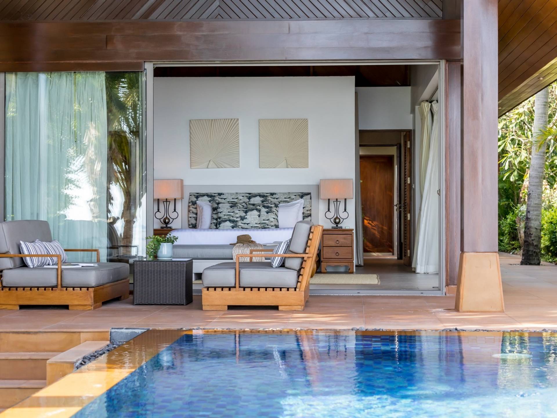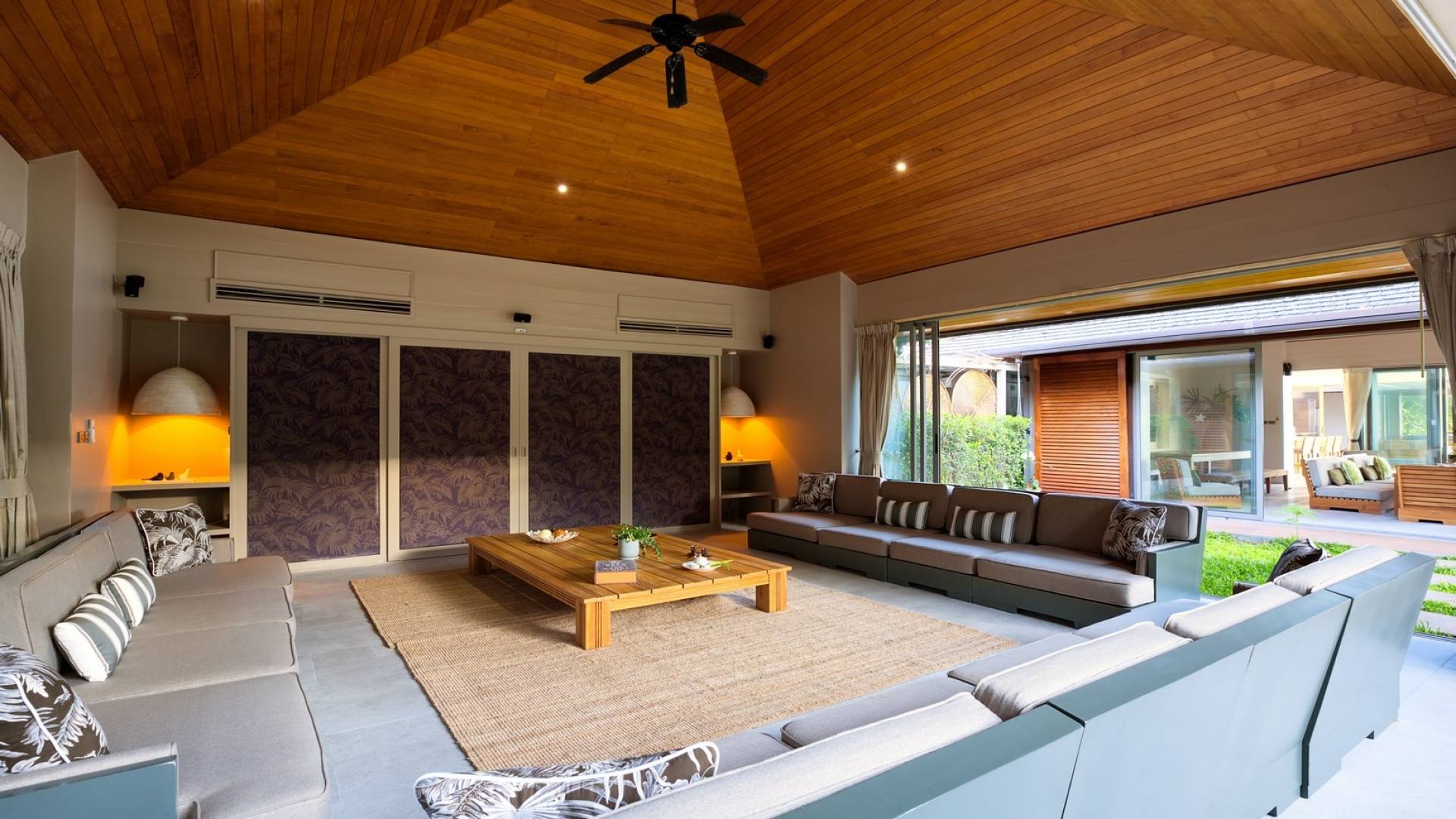 Le couchage a été aménagé pour accueillir les enfants jusqu'au bout. La grande suite parentale accueille 2 lits simples dans une alcôve avec portes coulissantes, la salle de jeux pour enfants peut être aménagée avec 3 lits simples et une salle de bain attenante et 2 des chambres parentales ont une mezzanine au-dessus de leur salle de bain attenante accessible via un échelle pliante (déconseillée aux enfants de moins de 12 ans), enfin, la chambre principale avant accueille un lit d'appoint dans une alcôve au sein de la grande chambre. La vraie vie tropicale tire le meilleur parti des douces brises marines de Samui et du temps chaud. À Baan Kilee, les portes et les fenêtres spécialement conçues peuvent être rabattues, tandis que le monde naturel est également accueilli par le choix de bardeaux de cèdre pour les toits, qui aident la villa à se fondre subtilement dans son environnement. Une bande de pelouse en bord de plage fait face aux espaces de vie, formant une frontière naturelle entre la grande piscine, la plage et la mer.