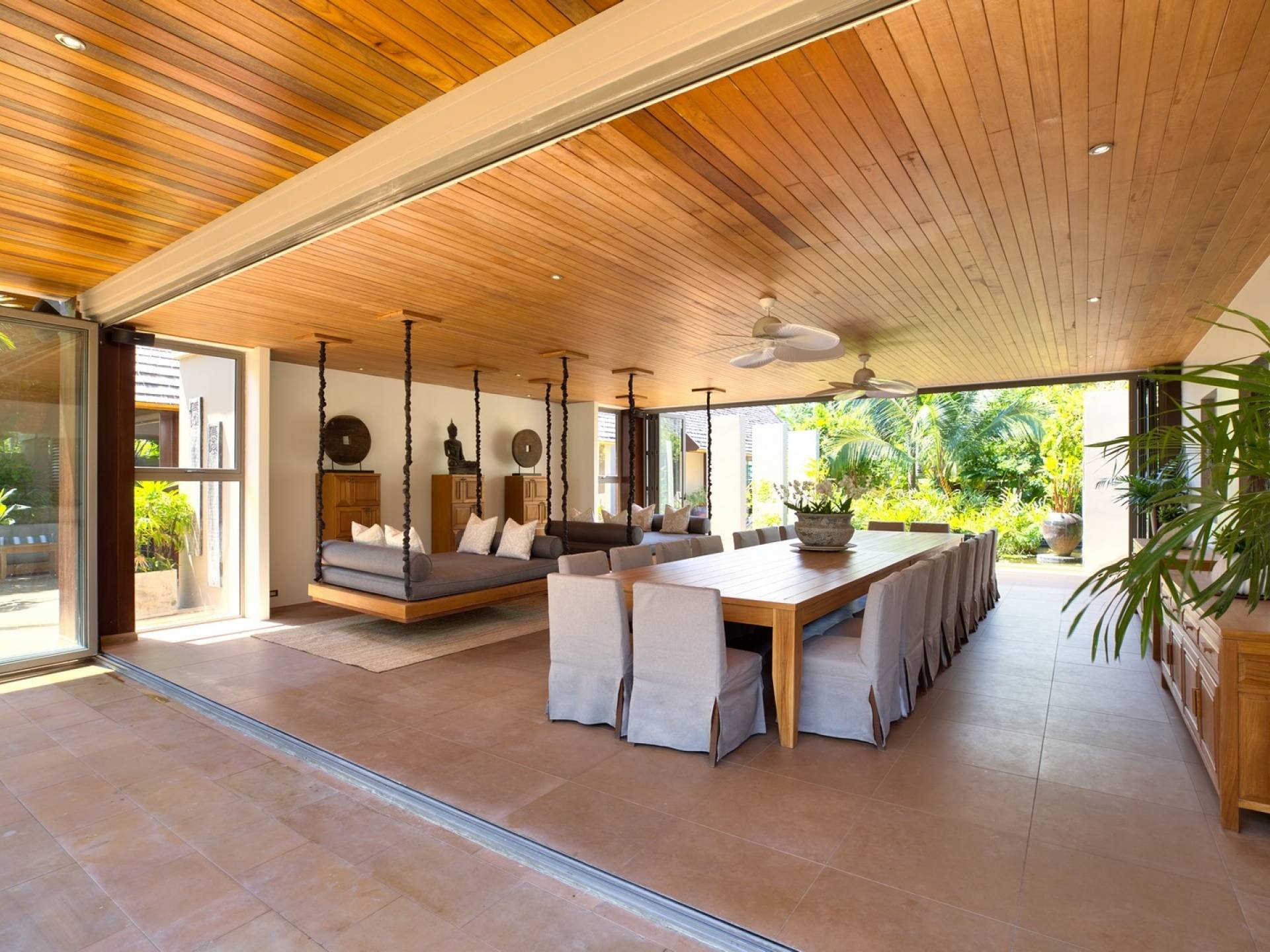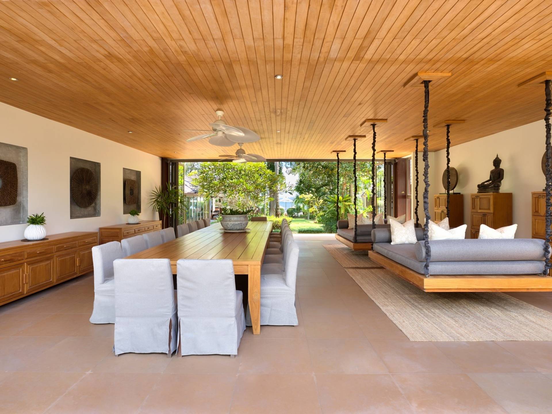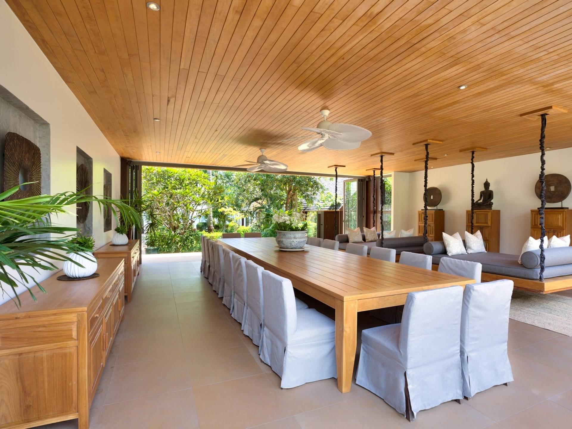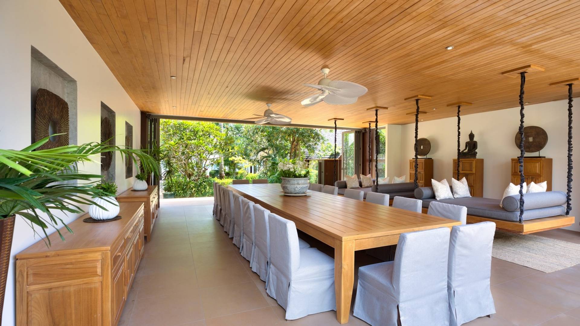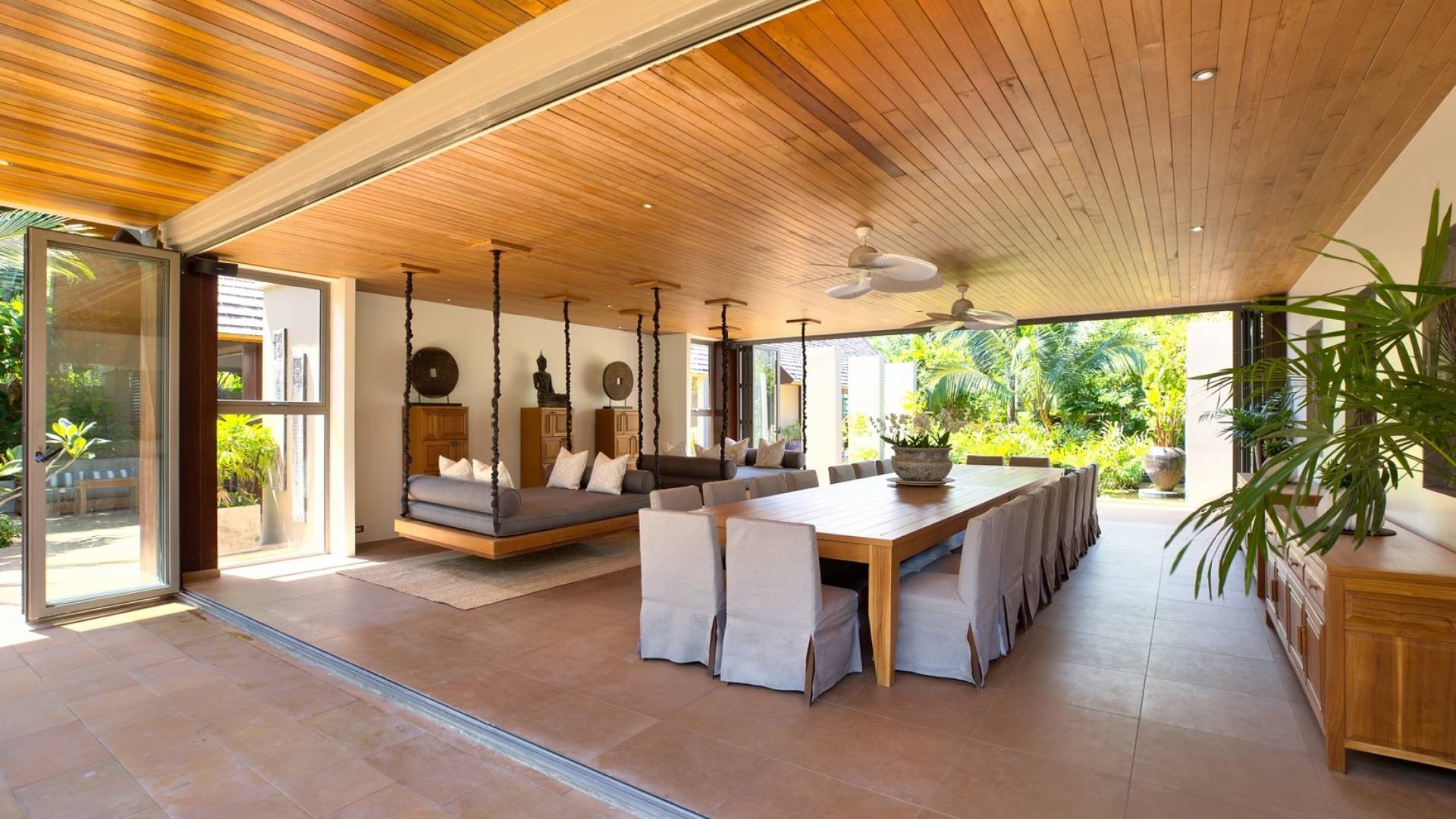 En entrant dans cette vaste villa par une grande porte coulissante qui offre l'une des entrées les plus grandioses de Samui, vous entrez dans un joli jardin avec une allée couverte d'orchidées qui passe par un joli étang de nénuphars et mène à la salle à manger principale . À l'intérieur, deux sièges suspendus sont suspendus au plafond par des chaînes et la grande table à manger présente un endroit spectaculaire pour recevoir des amis ou des invités. Au-delà de cette salle impressionnante, vous descendez quelques marches ornées vers un autre jardin, flanqué de chaque côté de pavillons. Sur le côté gauche, ces bâtiments individuels abritent respectivement le salon principal, le salon et la cuisine de la villa, tandis que sur le côté droit, vous trouverez deux grandes chambres d'hôtes confortablement meublées avec des escaliers en bois déroulant spécialement conçus reliant deux lofts. logement idéal pour les enfants.