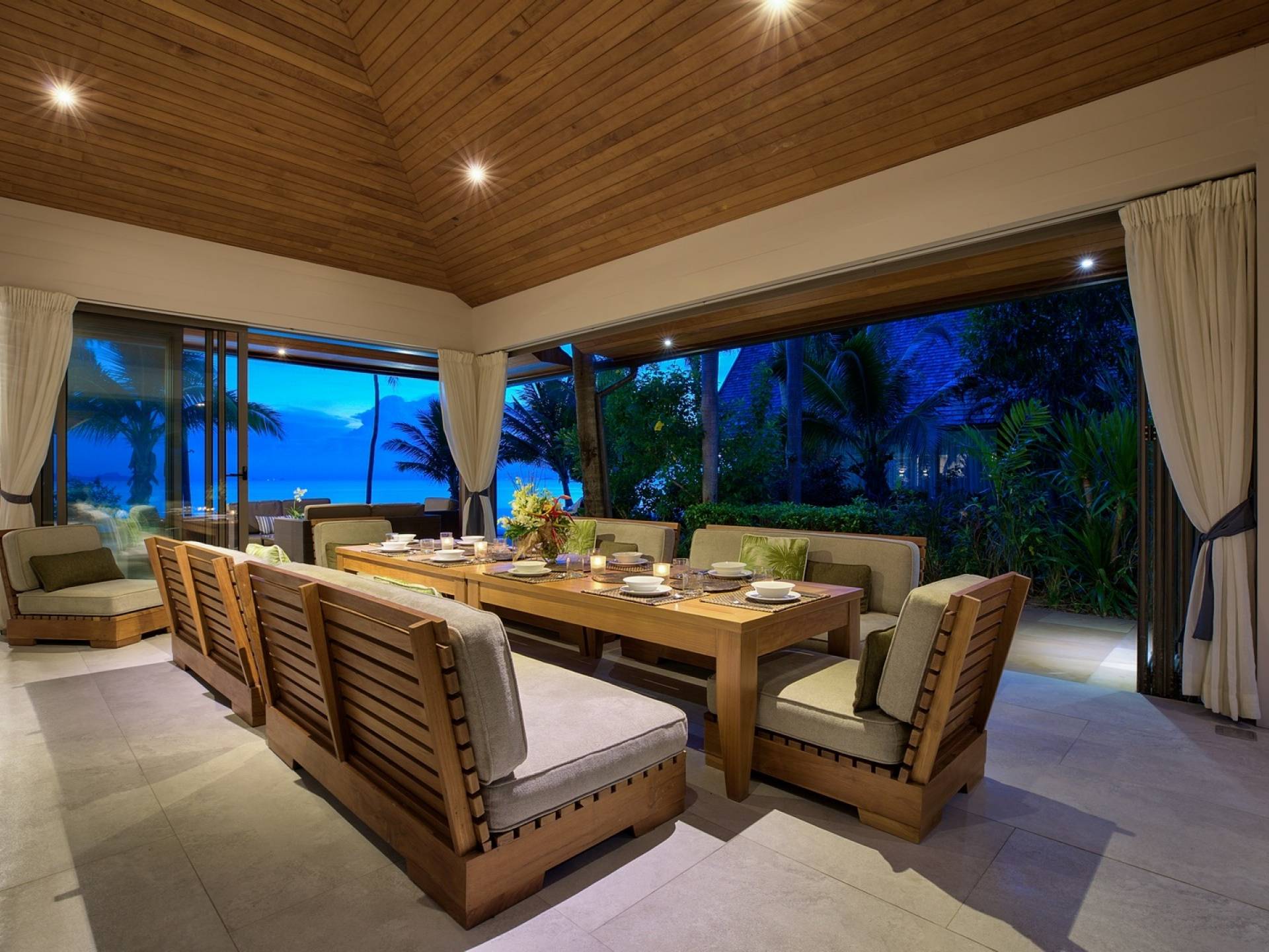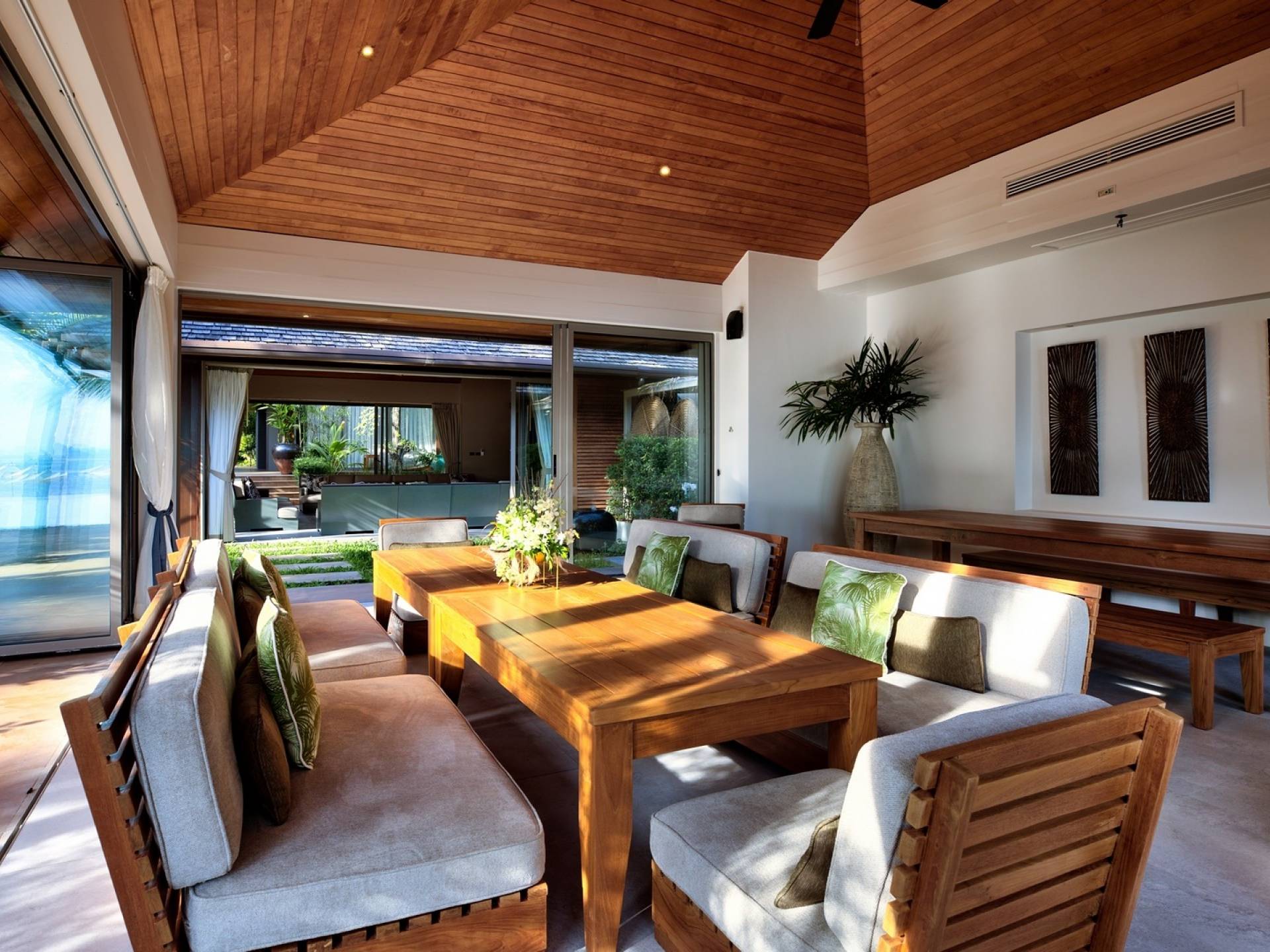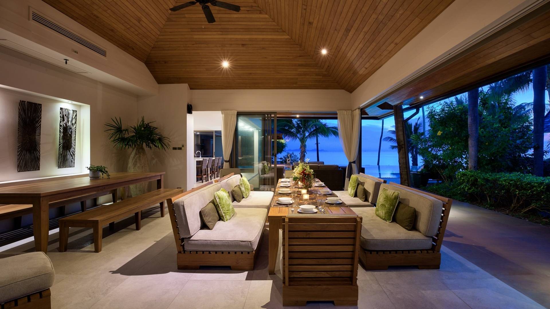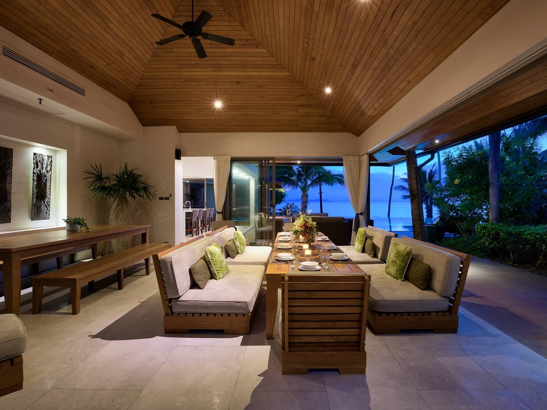 En entrant dans cette vaste villa par une grande porte coulissante qui offre l'une des entrées les plus grandioses de Samui, vous entrez dans un joli jardin avec une allée couverte d'orchidées qui passe par un joli étang de nénuphars et mène à la salle à manger principale . À l'intérieur, deux sièges suspendus sont suspendus au plafond par des chaînes et la grande table à manger présente un endroit spectaculaire pour recevoir des amis ou des invités. Au-delà de cette salle impressionnante, vous descendez quelques marches ornées vers un autre jardin, flanqué de chaque côté de pavillons. Sur le côté gauche, ces bâtiments individuels abritent respectivement le salon principal, le salon et la cuisine de la villa, tandis que sur le côté droit, vous trouverez deux grandes chambres d'hôtes confortablement meublées avec des escaliers en bois déroulant spécialement conçus reliant deux lofts. logement idéal pour les enfants.