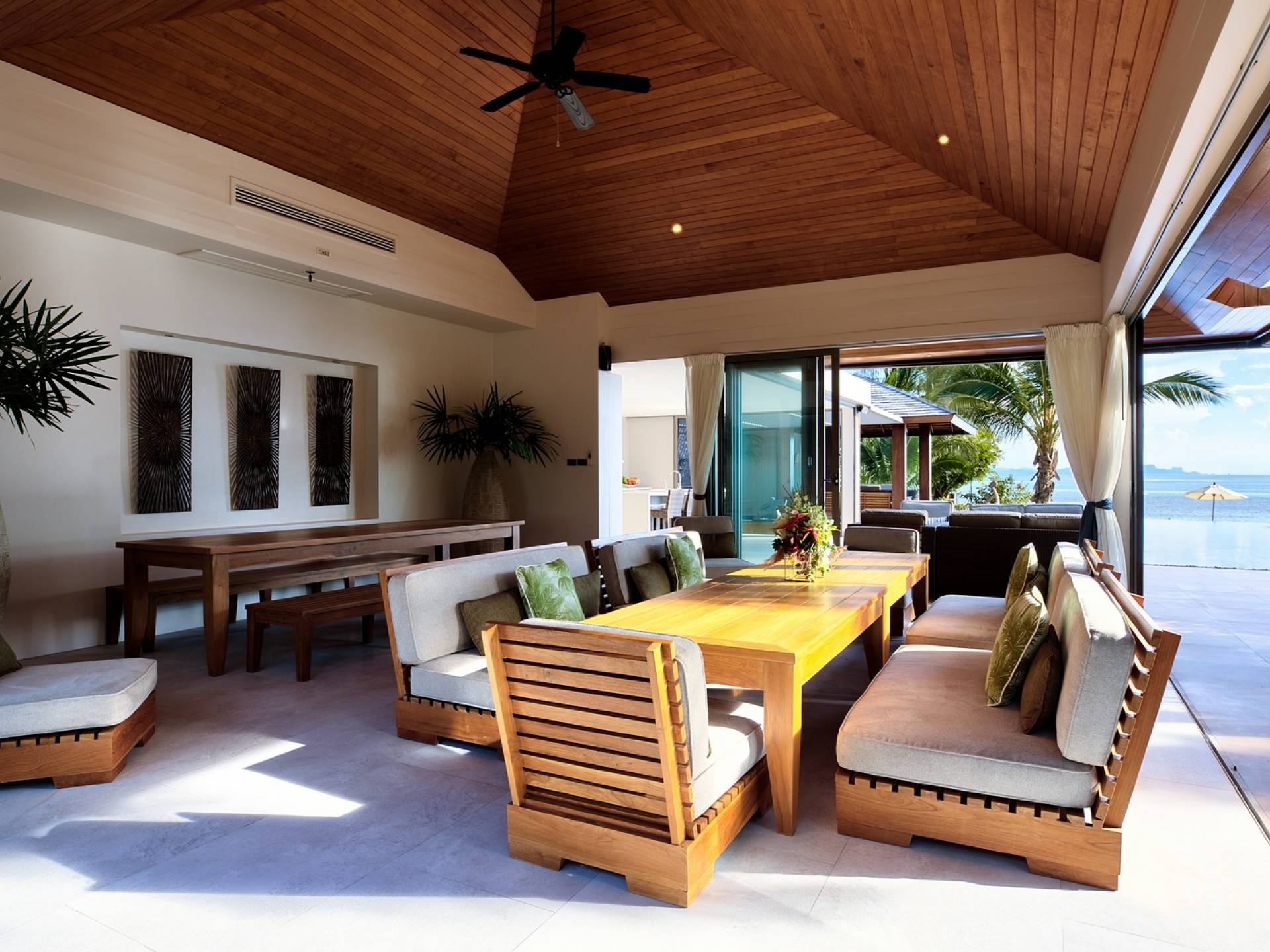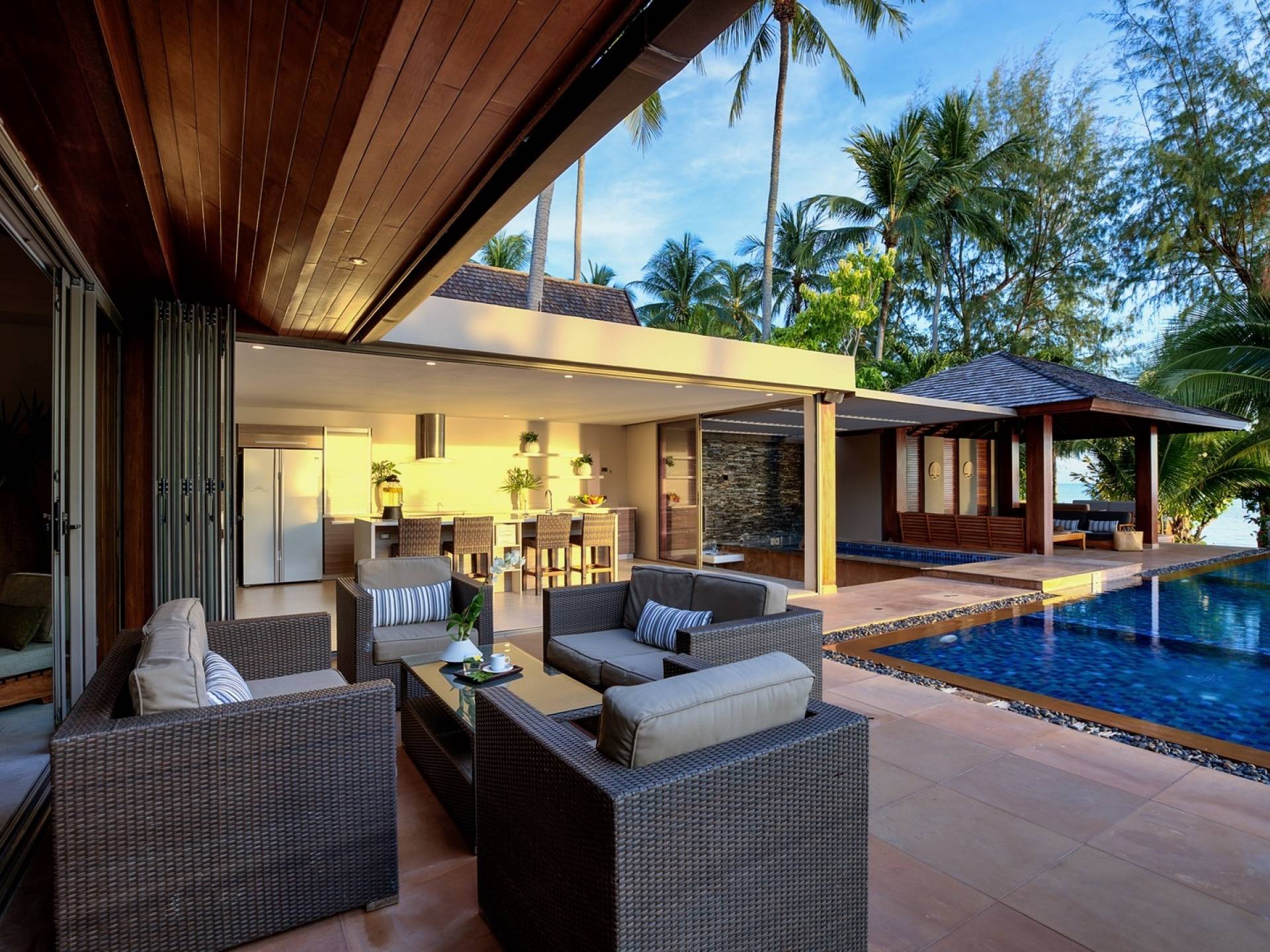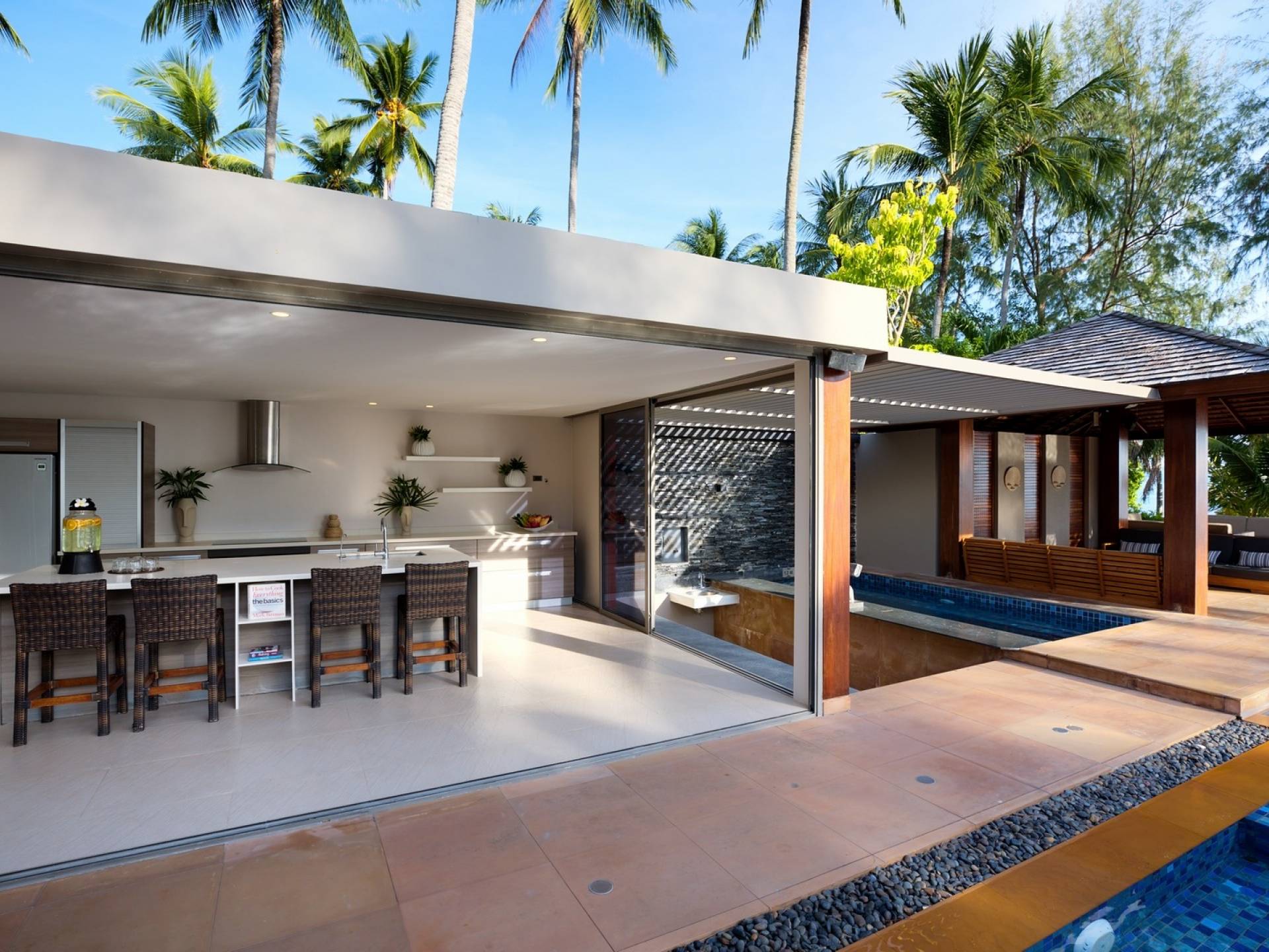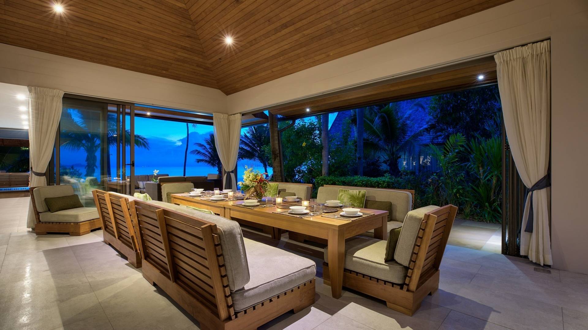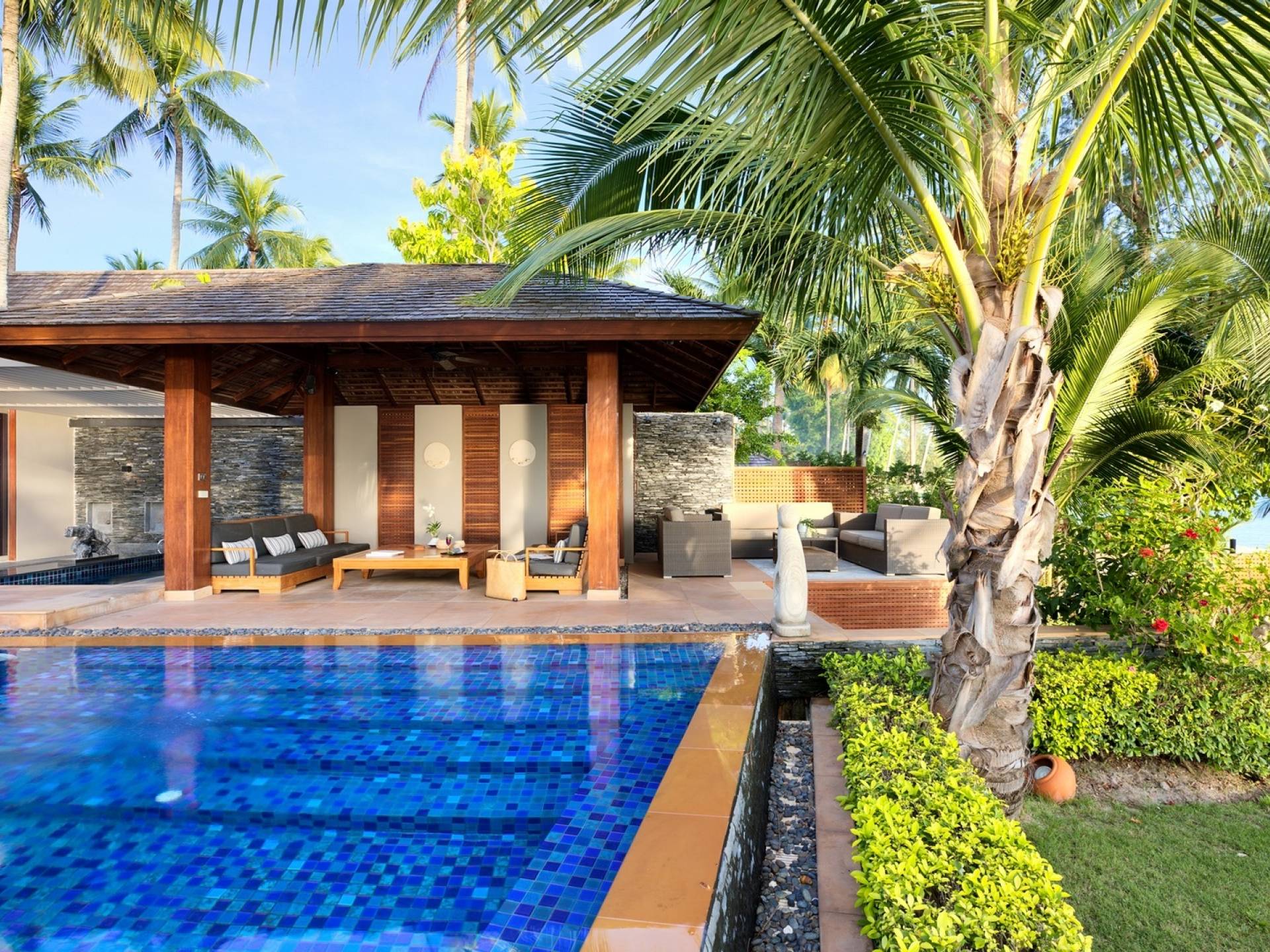 En entrant dans cette vaste villa par une grande porte coulissante qui offre l'une des entrées les plus grandioses de Samui, vous entrez dans un joli jardin avec une allée couverte d'orchidées qui passe par un joli étang de nénuphars et mène à la salle à manger principale . À l'intérieur, deux sièges suspendus sont suspendus au plafond par des chaînes et la grande table à manger présente un endroit spectaculaire pour recevoir des amis ou des invités. Au-delà de cette salle impressionnante, vous descendez quelques marches ornées vers un autre jardin, flanqué de chaque côté de pavillons. Sur le côté gauche, ces bâtiments individuels abritent respectivement le salon principal, le salon et la cuisine de la villa, tandis que sur le côté droit, vous trouverez deux grandes chambres d'hôtes confortablement meublées avec des escaliers en bois déroulant spécialement conçus reliant deux lofts. logement idéal pour les enfants.