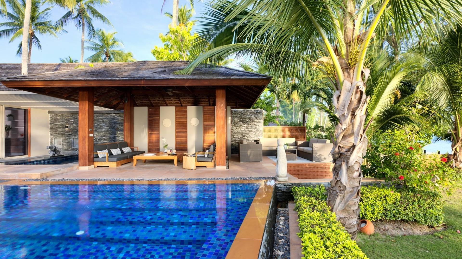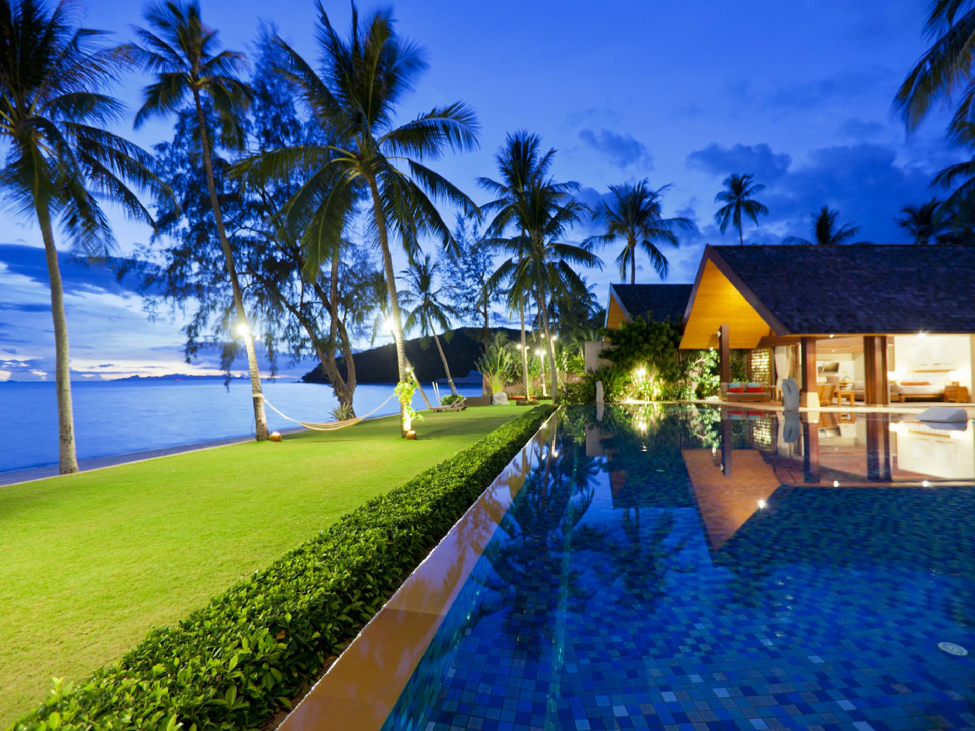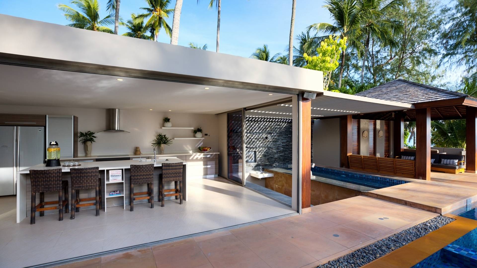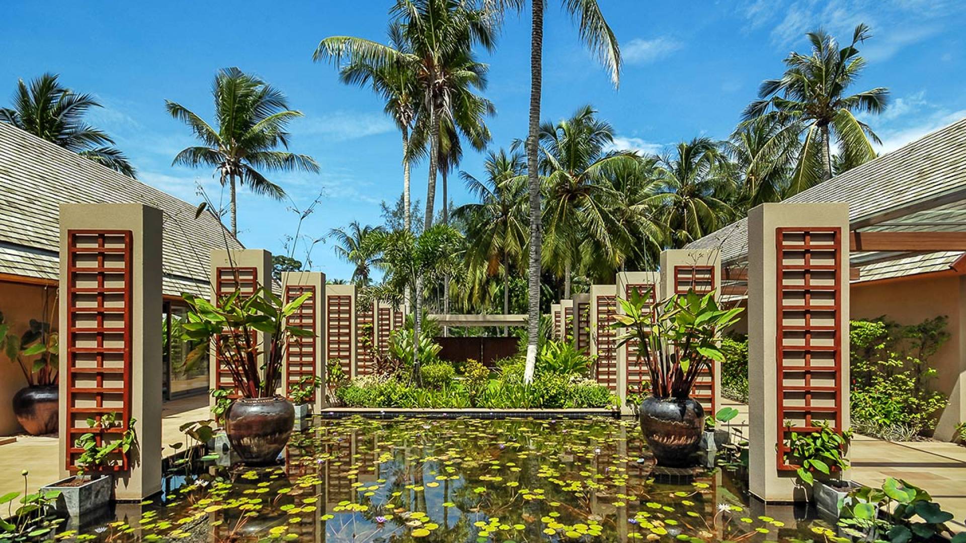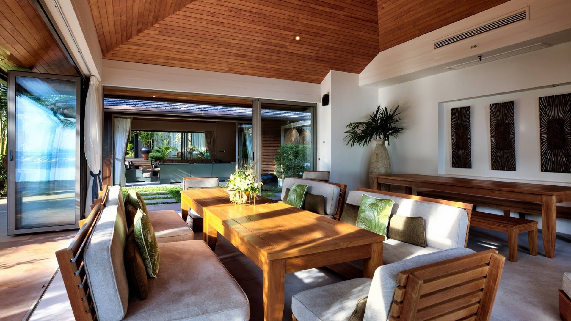 En entrant dans cette vaste villa par une grande porte coulissante qui offre l'une des entrées les plus grandioses de Samui, vous entrez dans un joli jardin avec une allée couverte d'orchidées qui passe par un joli étang de nénuphars et mène à la salle à manger principale . À l'intérieur, deux sièges suspendus sont suspendus au plafond par des chaînes et la grande table à manger présente un endroit spectaculaire pour recevoir des amis ou des invités. Au-delà de cette salle impressionnante, vous descendez quelques marches ornées vers un autre jardin, flanqué de chaque côté de pavillons. Sur le côté gauche, ces bâtiments individuels abritent respectivement le salon principal, le salon et la cuisine de la villa, tandis que sur le côté droit, vous trouverez deux grandes chambres d'hôtes confortablement meublées avec des escaliers en bois déroulant spécialement conçus reliant deux lofts. logement idéal pour les enfants.