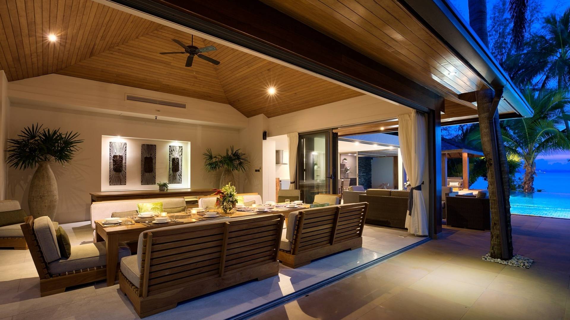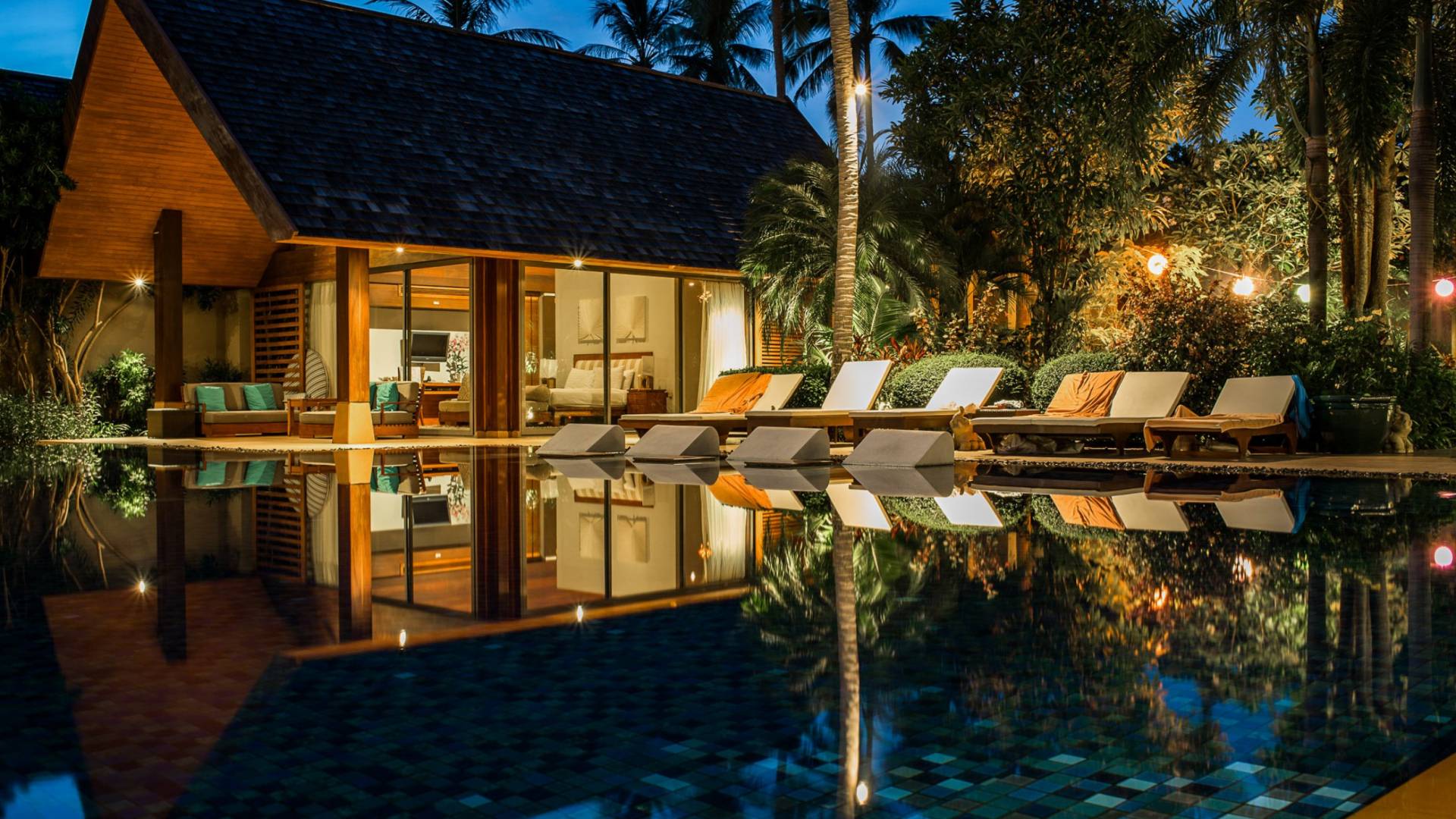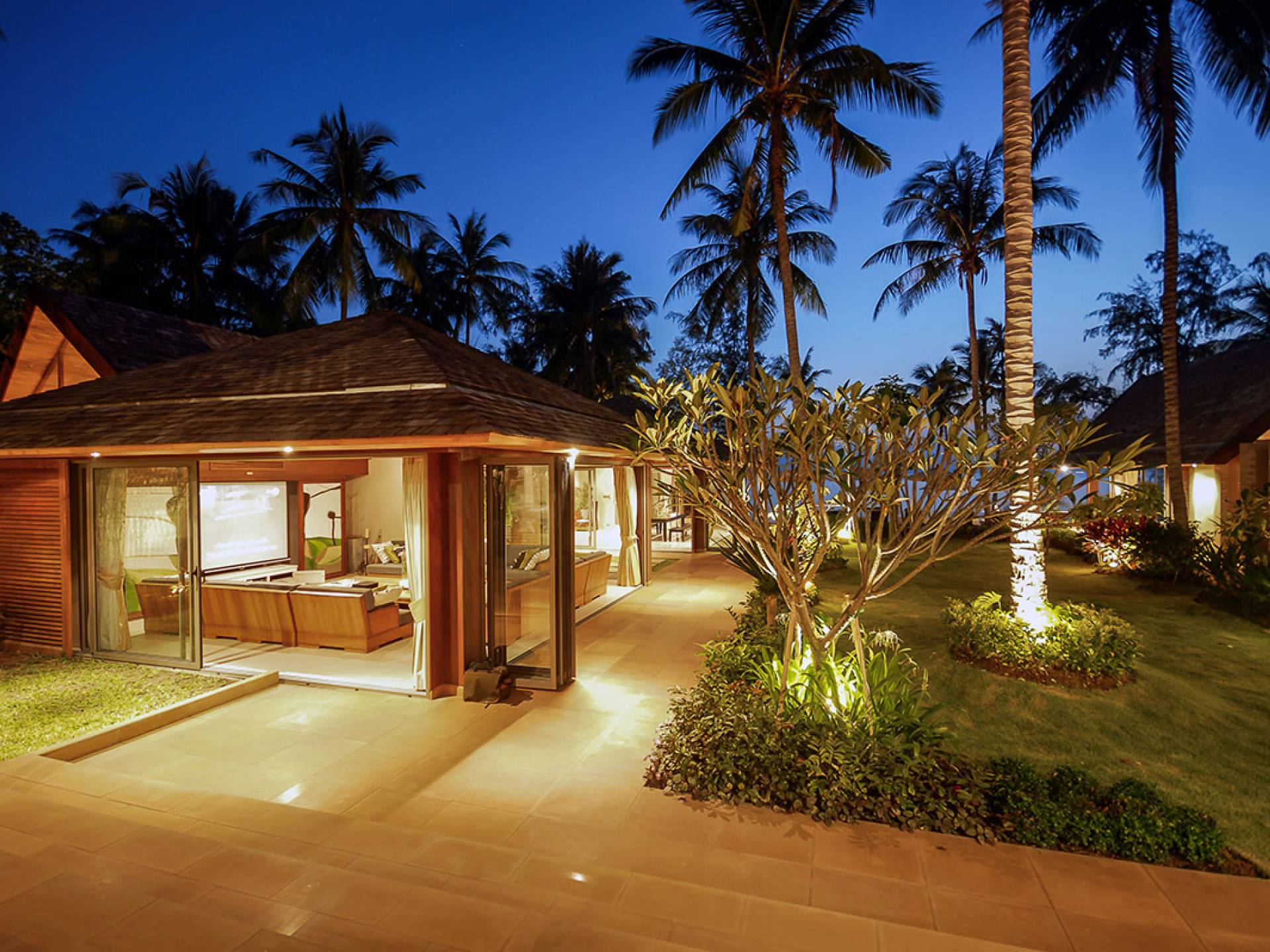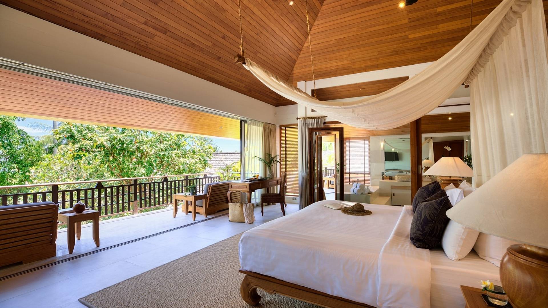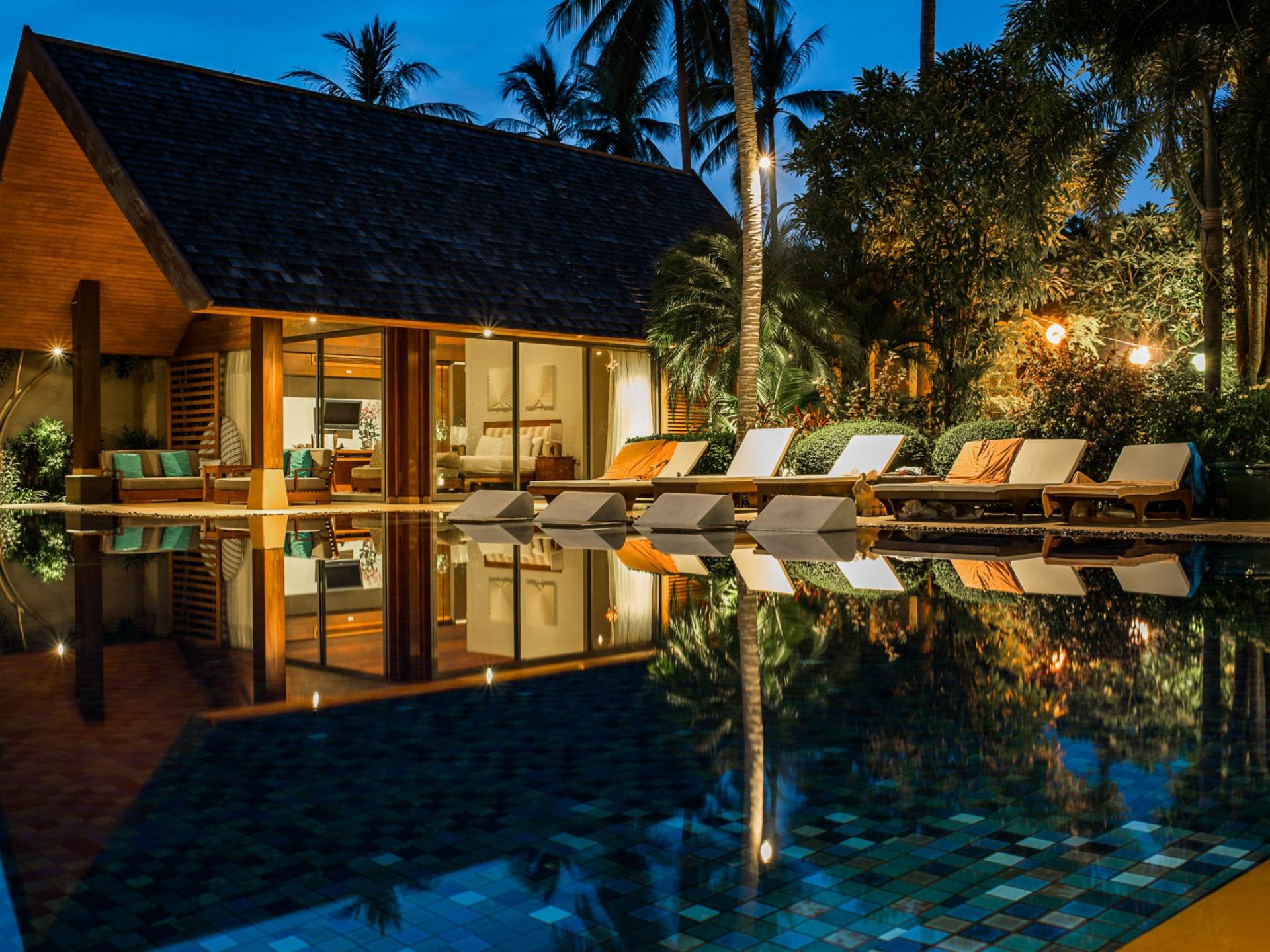 En entrant dans cette vaste villa par une grande porte coulissante qui offre l'une des entrées les plus grandioses de Samui, vous entrez dans un joli jardin avec une allée couverte d'orchidées qui passe par un joli étang de nénuphars et mène à la salle à manger principale . À l'intérieur, deux sièges suspendus sont suspendus au plafond par des chaînes et la grande table à manger présente un endroit spectaculaire pour recevoir des amis ou des invités. Au-delà de cette salle impressionnante, vous descendez quelques marches ornées vers un autre jardin, flanqué de chaque côté de pavillons. Sur le côté gauche, ces bâtiments individuels abritent respectivement le salon principal, le salon et la cuisine de la villa, tandis que sur le côté droit, vous trouverez deux grandes chambres d'hôtes confortablement meublées avec des escaliers en bois déroulant spécialement conçus reliant deux lofts. logement idéal pour les enfants.