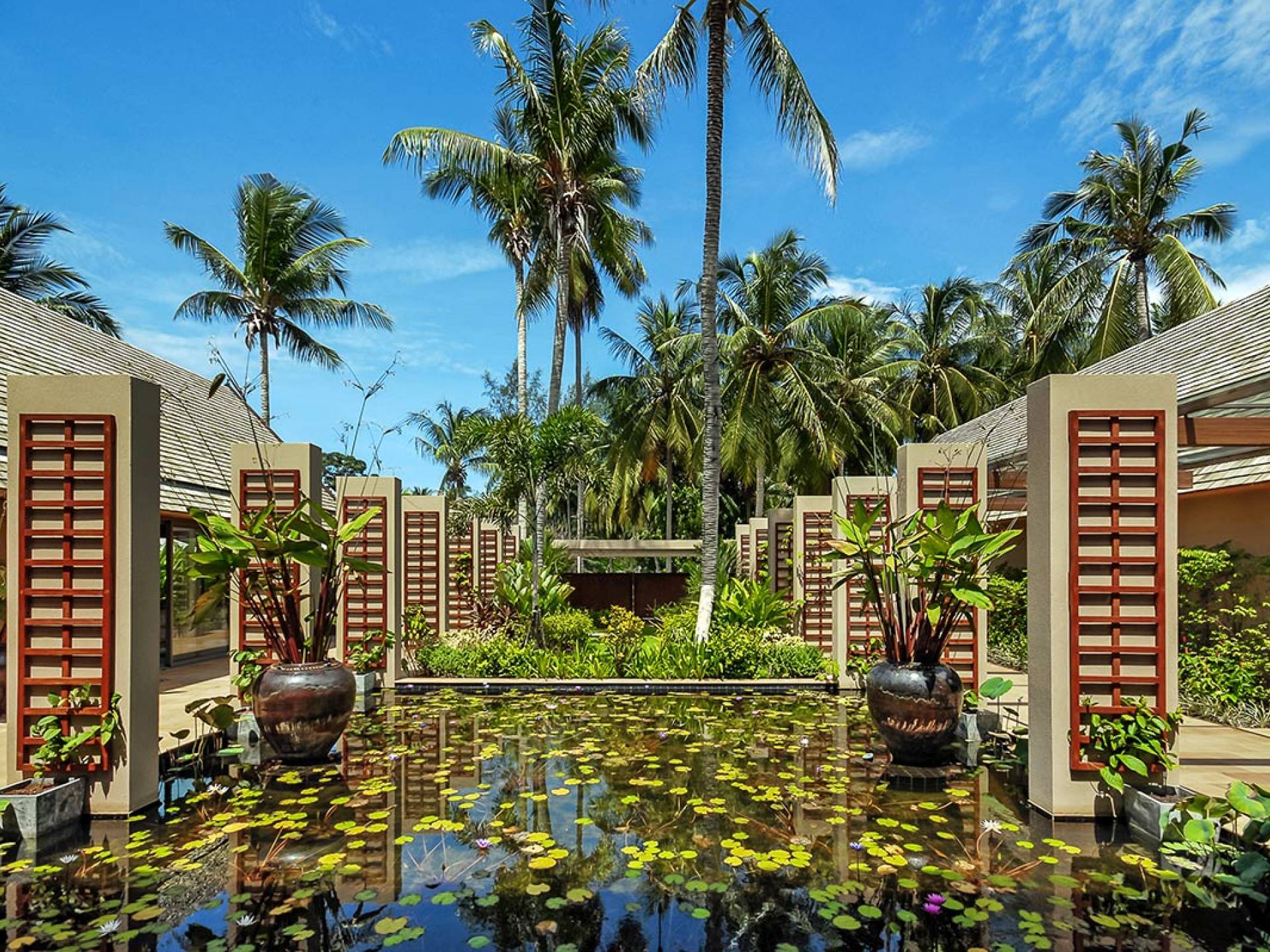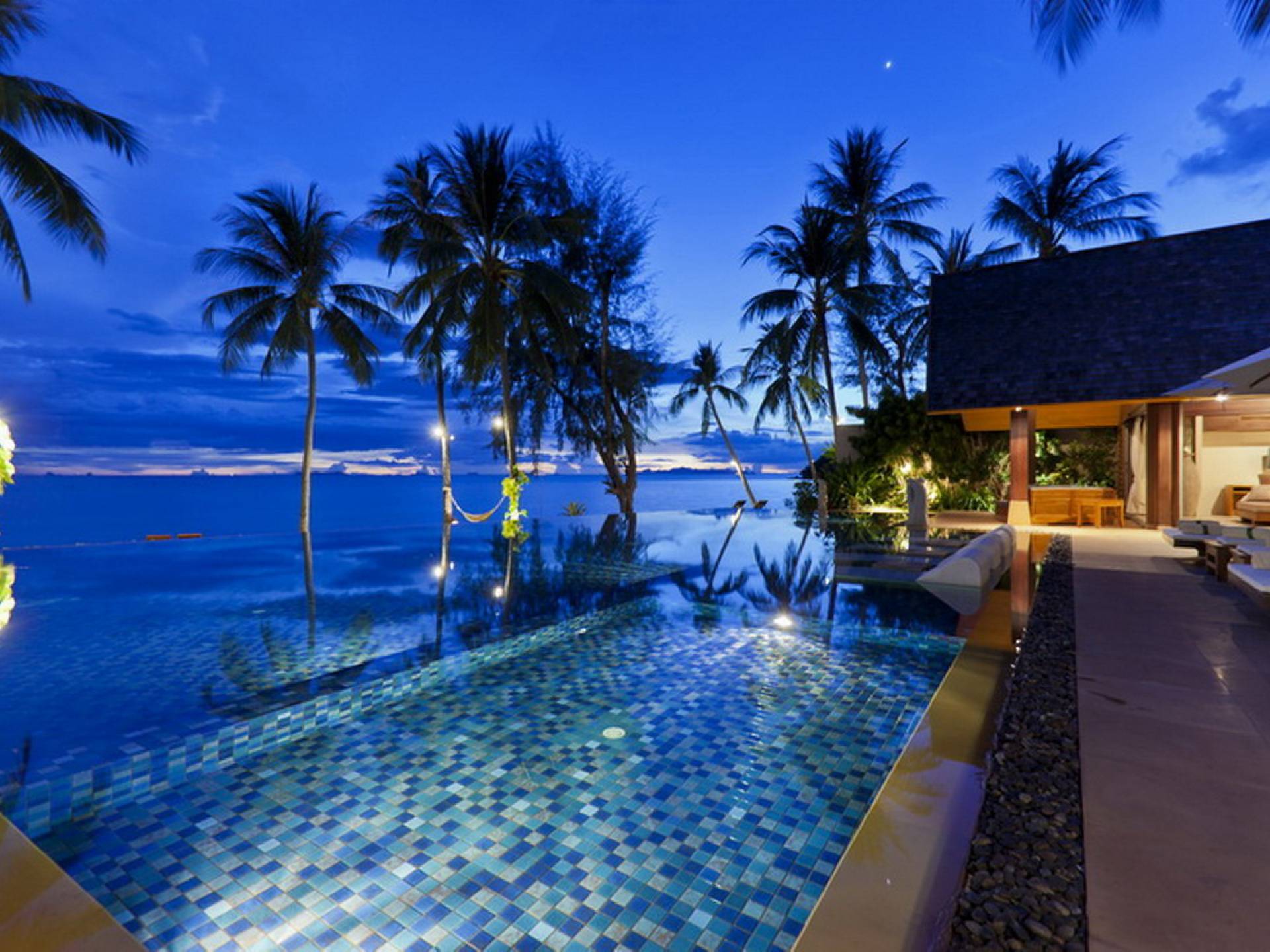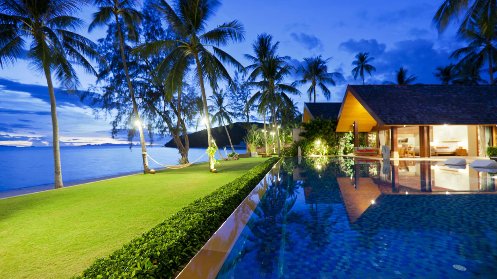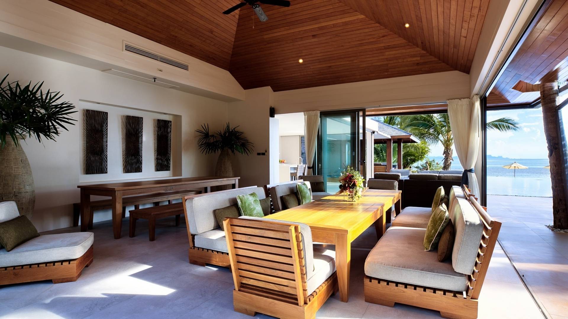 En entrant dans cette vaste villa par une grande porte coulissante qui offre l'une des entrées les plus grandioses de Samui, vous entrez dans un joli jardin avec une allée couverte d'orchidées qui passe par un joli étang de nénuphars et mène à la salle à manger principale . À l'intérieur, deux sièges suspendus sont suspendus au plafond par des chaînes et la grande table à manger présente un endroit spectaculaire pour recevoir des amis ou des invités. Au-delà de cette salle impressionnante, vous descendez quelques marches ornées vers un autre jardin, flanqué de chaque côté de pavillons. Sur le côté gauche, ces bâtiments individuels abritent respectivement le salon principal, le salon et la cuisine de la villa, tandis que sur le côté droit, vous trouverez deux grandes chambres d'hôtes confortablement meublées avec des escaliers en bois déroulant spécialement conçus reliant deux lofts. logement idéal pour les enfants.