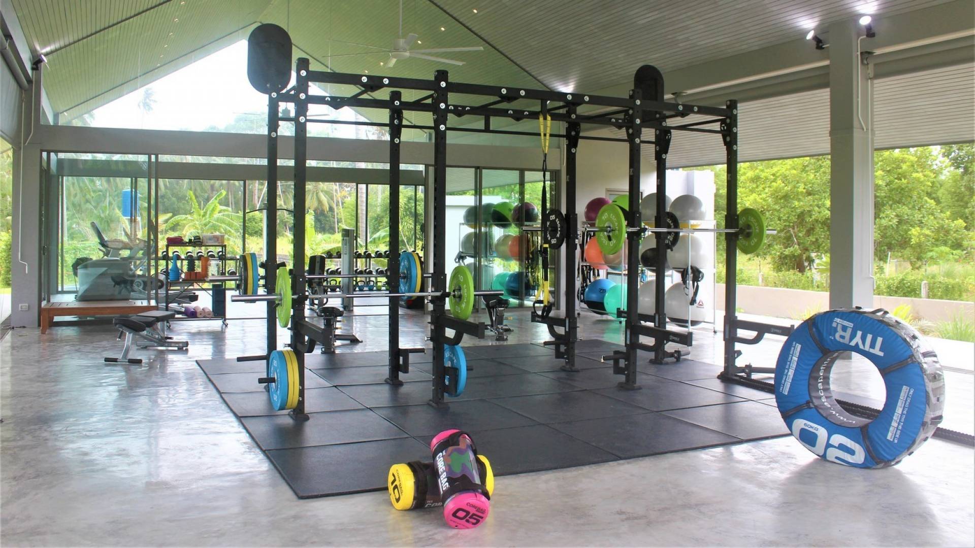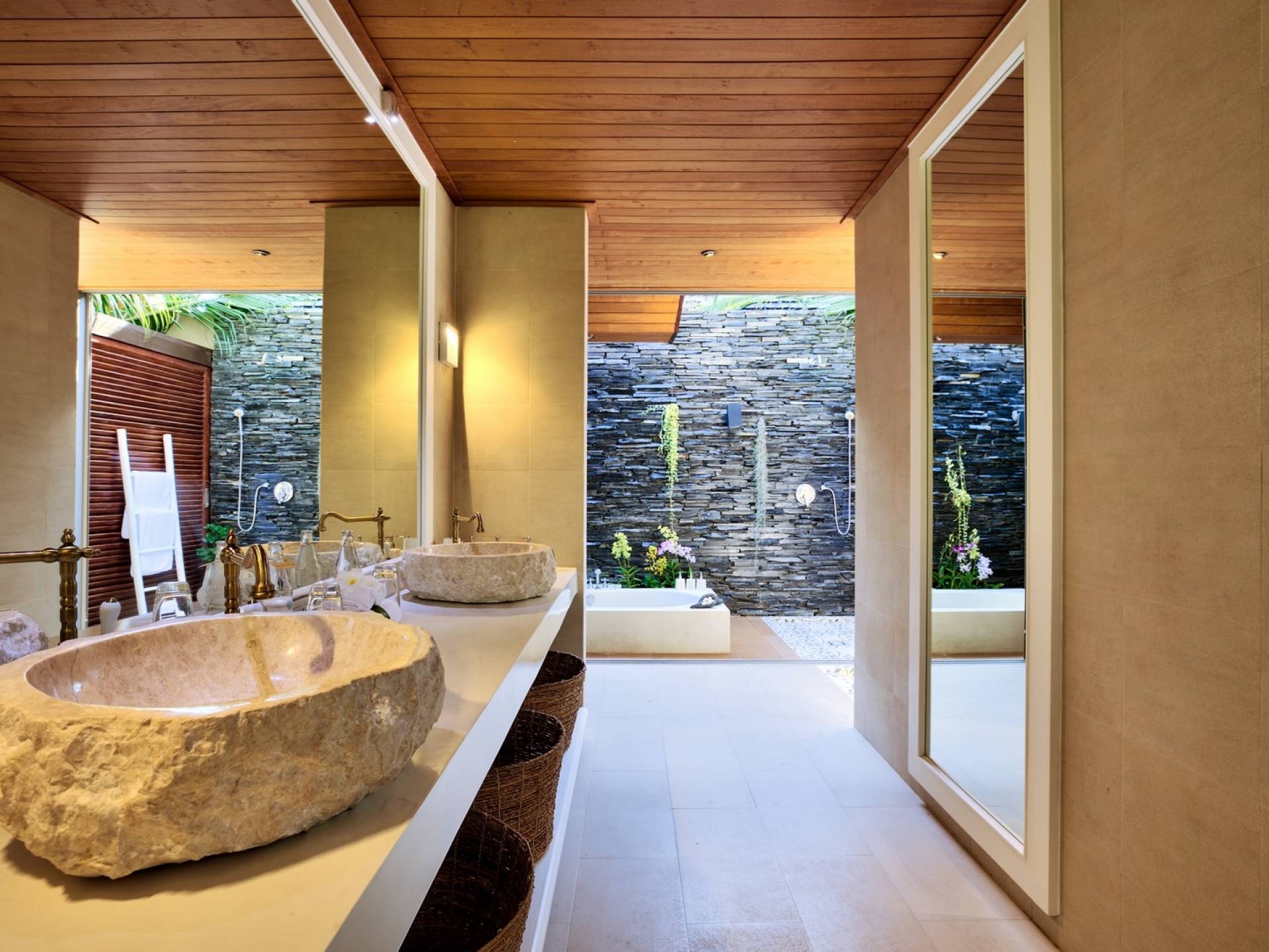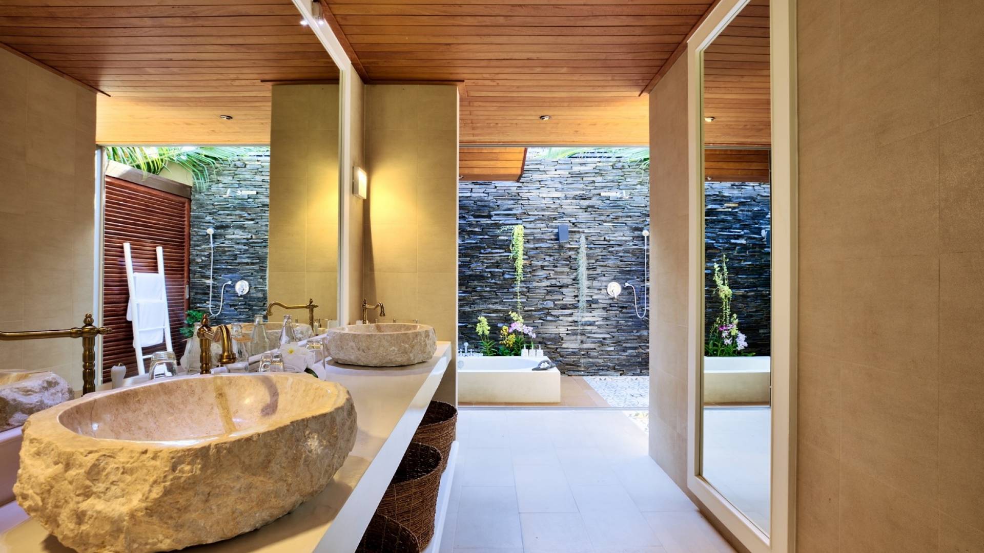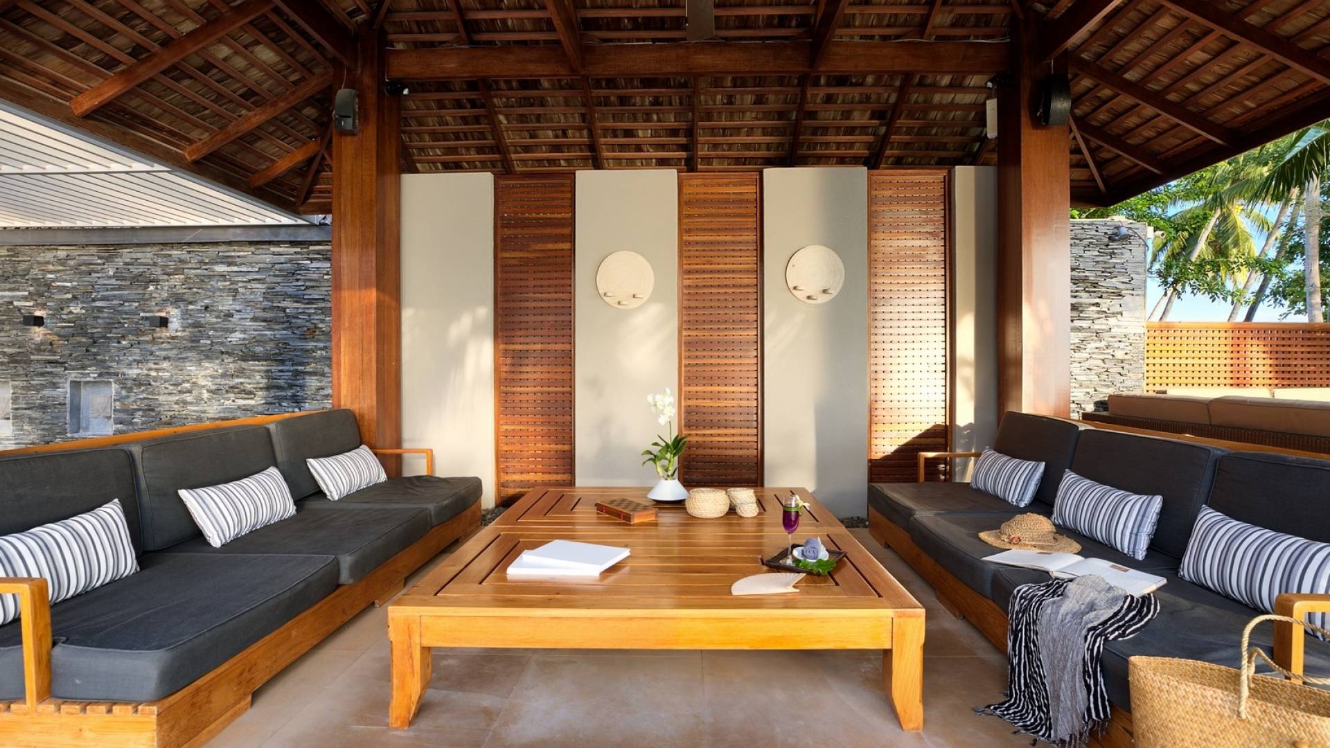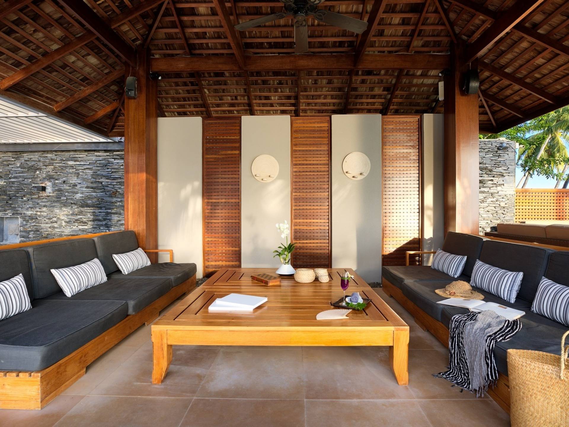 En entrant dans cette vaste villa par une grande porte coulissante qui offre l'une des entrées les plus grandioses de Samui, vous entrez dans un joli jardin avec une allée couverte d'orchidées qui passe par un joli étang de nénuphars et mène à la salle à manger principale . À l'intérieur, deux sièges suspendus sont suspendus au plafond par des chaînes et la grande table à manger présente un endroit spectaculaire pour recevoir des amis ou des invités. Au-delà de cette salle impressionnante, vous descendez quelques marches ornées vers un autre jardin, flanqué de chaque côté de pavillons. Sur le côté gauche, ces bâtiments individuels abritent respectivement le salon principal, le salon et la cuisine de la villa, tandis que sur le côté droit, vous trouverez deux grandes chambres d'hôtes confortablement meublées avec des escaliers en bois déroulant spécialement conçus reliant deux lofts. logement idéal pour les enfants.