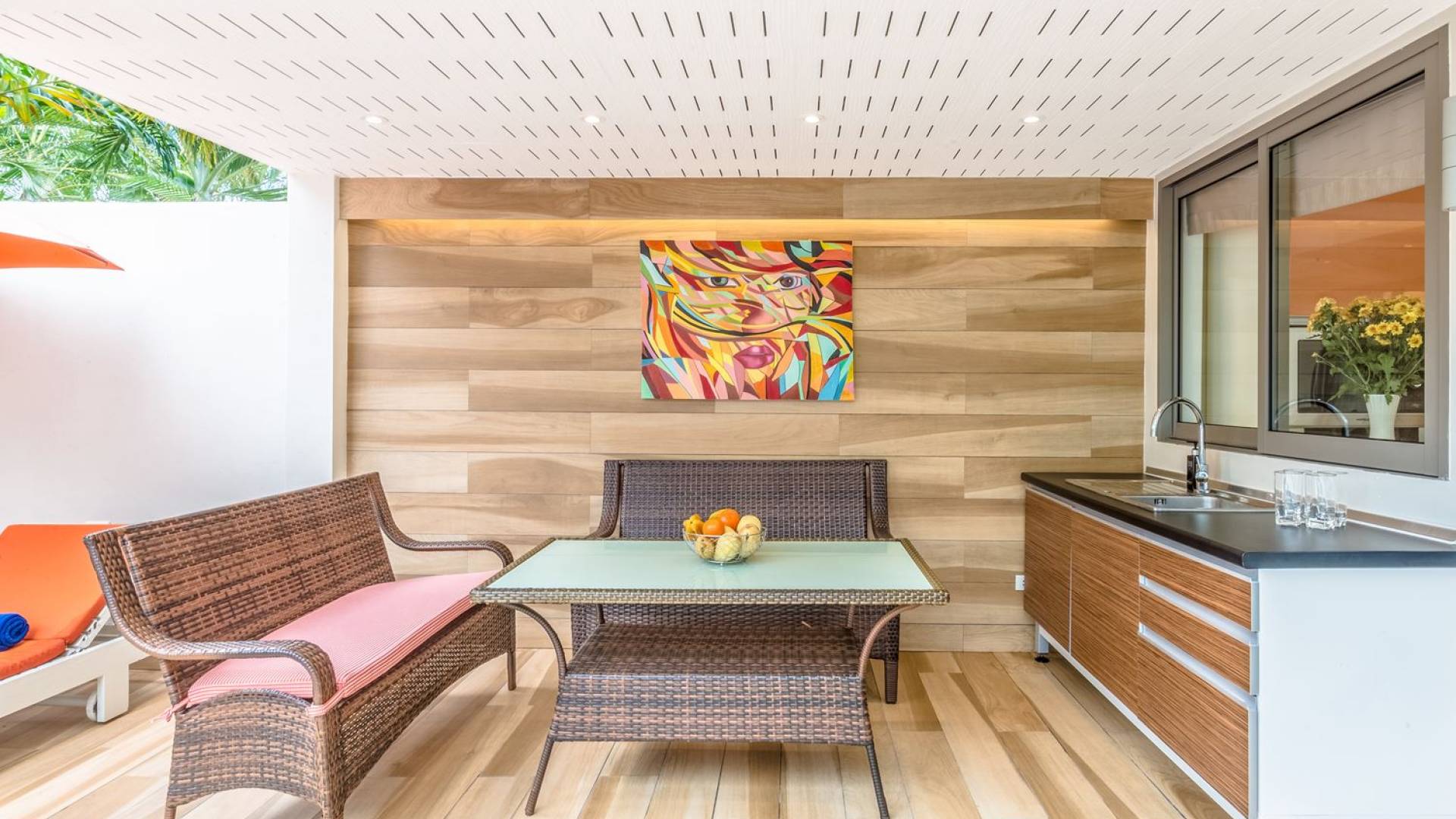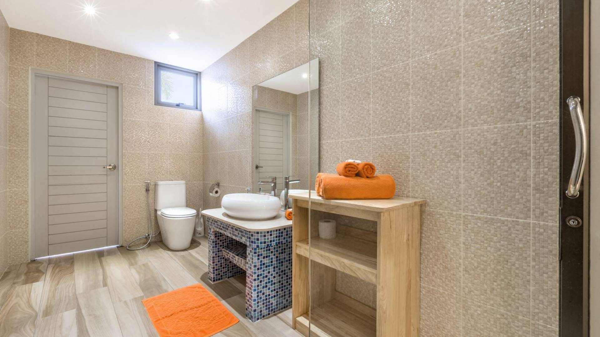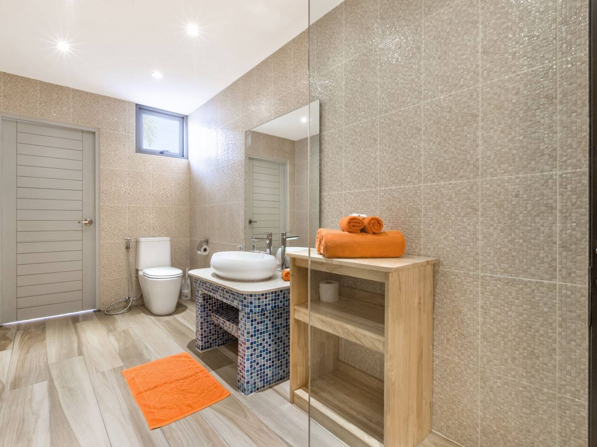 Cette confortable villa de 2 chambres peut accueillir confortablement 4 à 6 personnes. Après avoir passé la porte d'entrée, un chemin ombragé parmi les plantes tropicales vous mène à la villa. À côté de la piscine privée, il y a le salon extérieur qui comprend un canapé en forme de L avec une table basse, une table à manger et un barbecue. Au rez-de-chaussée, il y a une chambre #1 climatisée avec un lit double, TV, coffre-fort, armoire attenante et salle de douche attenante avec wc. La chambre n ° 2 est située au premier étage accessible par un escalier extérieur à l'arrière de la villa. Cette chambre dispose également d'un lit double, d'une salle de douche attenante avec wc et d'une armoire. Cette chambre est également équipée de la climatisation. Il y a des chaises longues et des parasols près de la piscine privée.