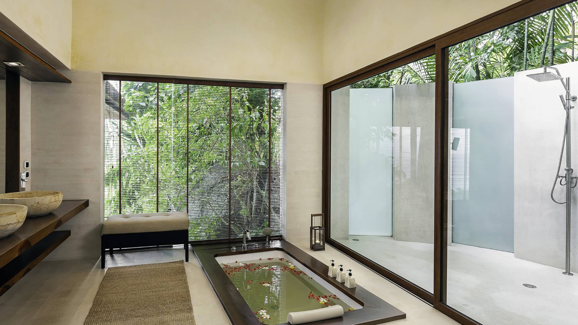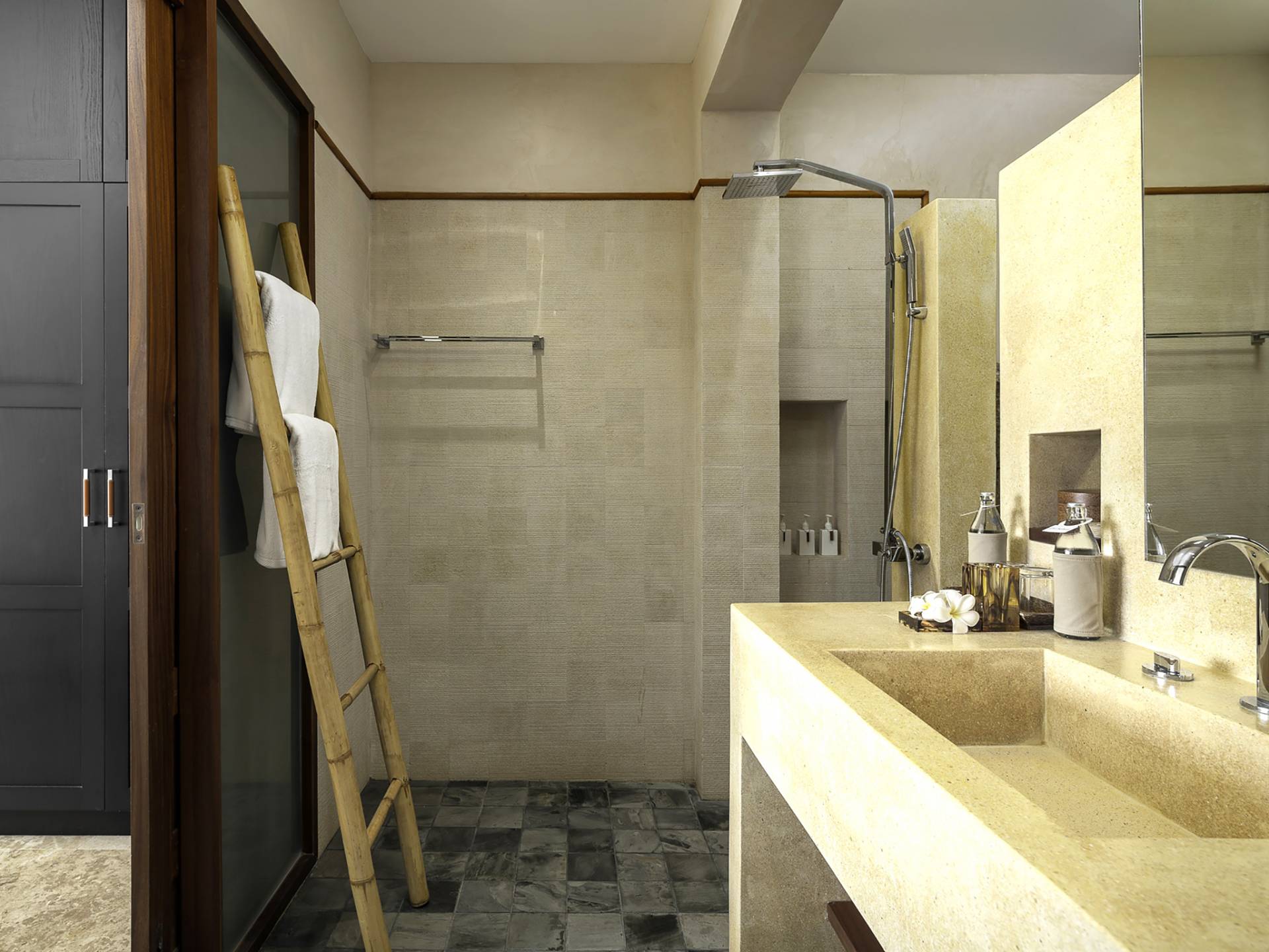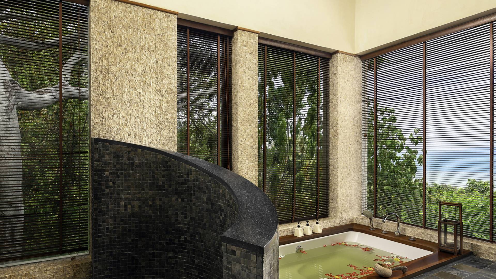 Deux villas indépendantes d'une chambre avec salle de bains privative sont situées sur le côté du bâtiment principal et disposent de lits à baldaquin contemporains avec des armoires en teck sur mesure dans leurs chambres en mezzanine. Les salons privés sont dotés de portes coulissantes en verre de 3,5 mètres de long qui permettent aux clients de se réveiller chaque matin avec des paysages marins à couper le souffle. Le mobilier comprend des canapés encastrés, des tables basses, des fauteuils et des armoires avec des portes cachées pour les téléviseurs à écran plat et les lecteurs DVD. Un mini-réfrigérateur bien approvisionné, un chauffe-eau, un plateau/bouilloire sont également inclus pour votre confort. Chacune des salles de bains de la villa est équipée de baignoires encastrées en teck pour deux, de douches intérieures et extérieures, de carreaux de mosaïque en calcaire importés, de sols en ardoise ou en calcaire importés, de comptoirs en teck et offre également des vues spectaculaires sur l'océan.
