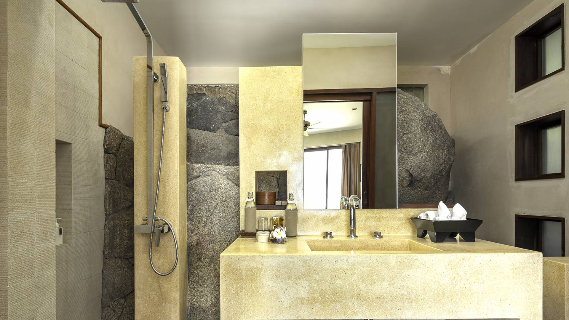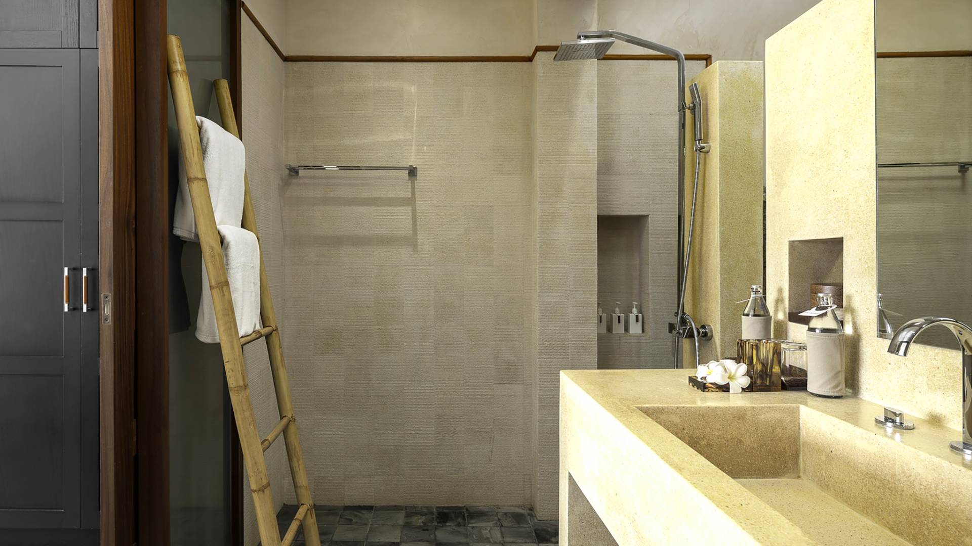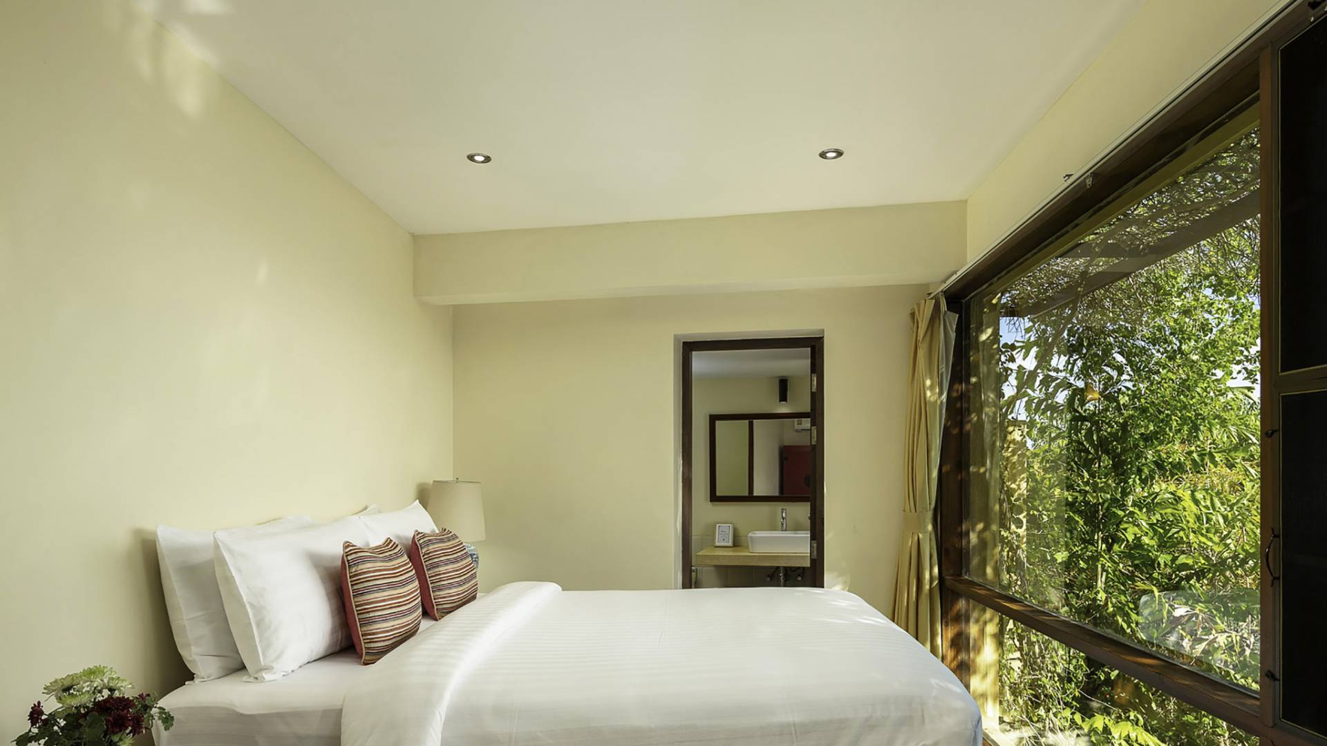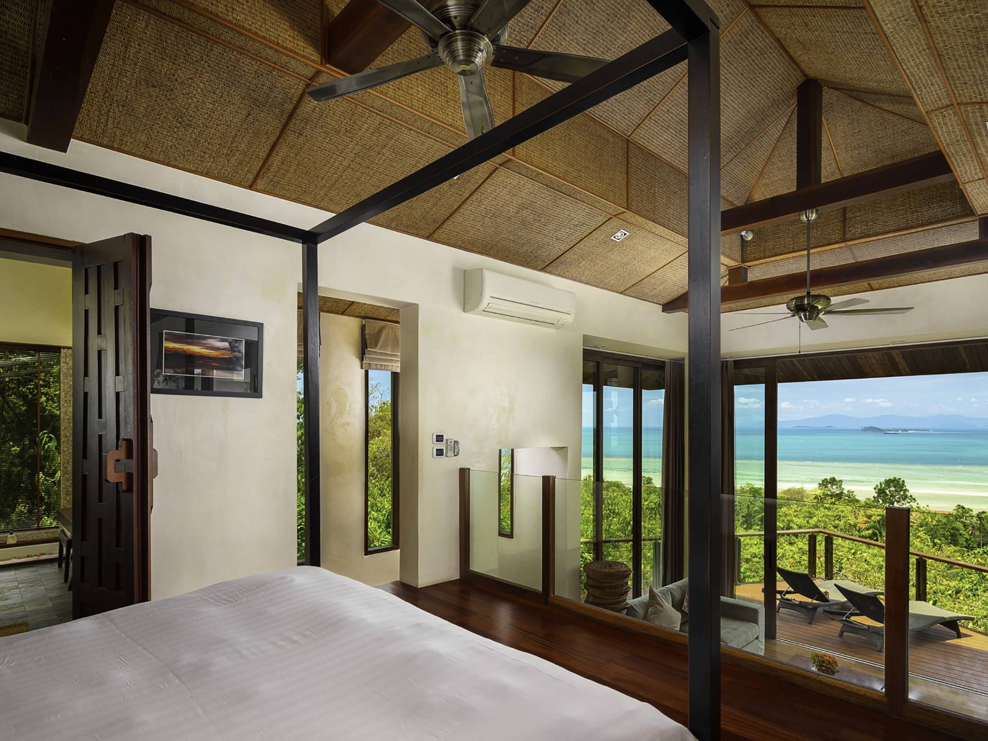 Deux villas indépendantes d'une chambre avec salle de bains privative sont situées sur le côté du bâtiment principal et disposent de lits à baldaquin contemporains avec des armoires en teck sur mesure dans leurs chambres en mezzanine. Les salons privés sont dotés de portes coulissantes en verre de 3,5 mètres de long qui permettent aux clients de se réveiller chaque matin avec des paysages marins à couper le souffle. Le mobilier comprend des canapés encastrés, des tables basses, des fauteuils et des armoires avec des portes cachées pour les téléviseurs à écran plat et les lecteurs DVD. Un mini-réfrigérateur bien approvisionné, un chauffe-eau, un plateau/bouilloire sont également inclus pour votre confort. Chacune des salles de bains de la villa est équipée de baignoires encastrées en teck pour deux, de douches intérieures et extérieures, de carreaux de mosaïque en calcaire importés, de sols en ardoise ou en calcaire importés, de comptoirs en teck et offre également des vues spectaculaires sur l'océan.