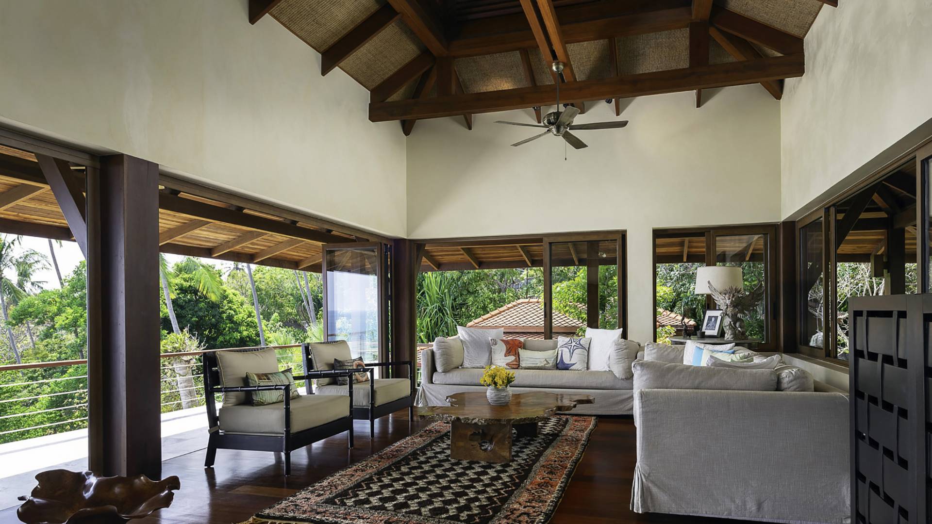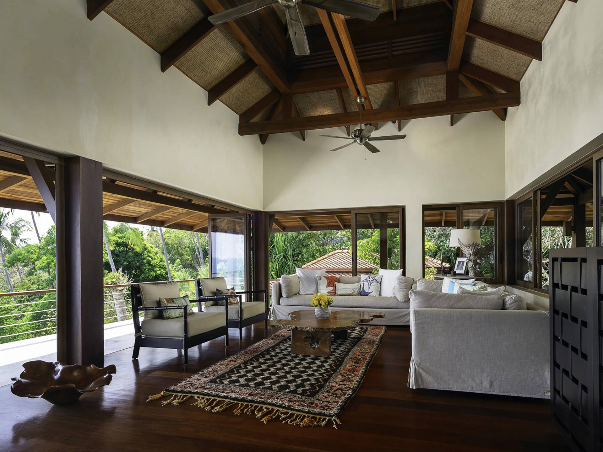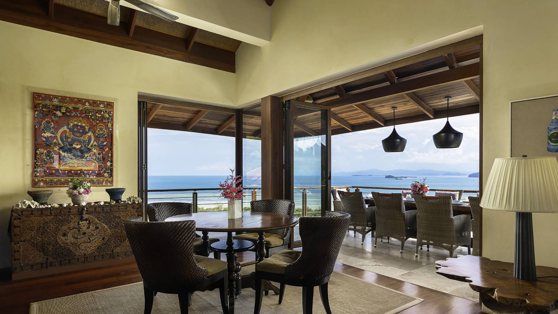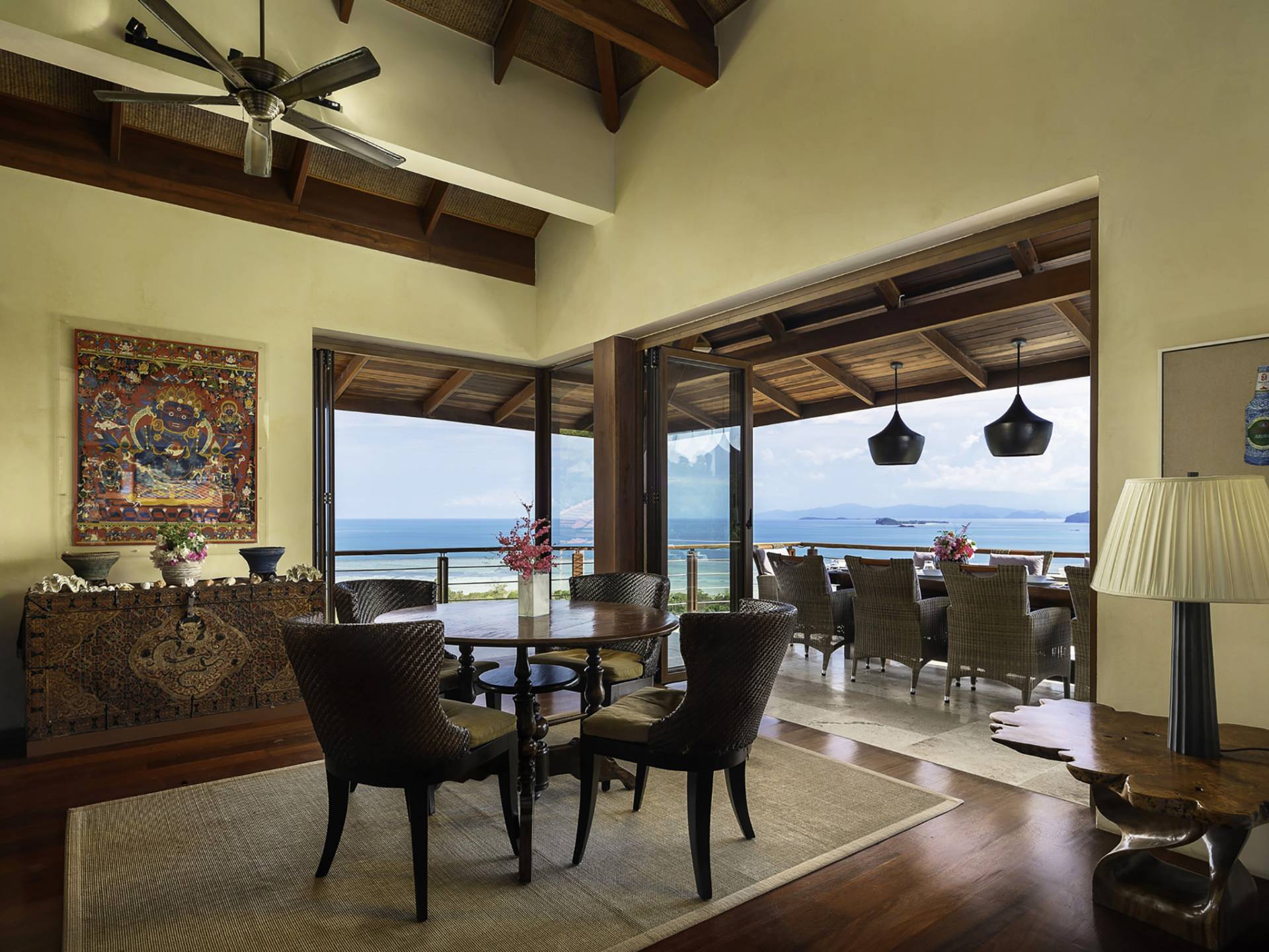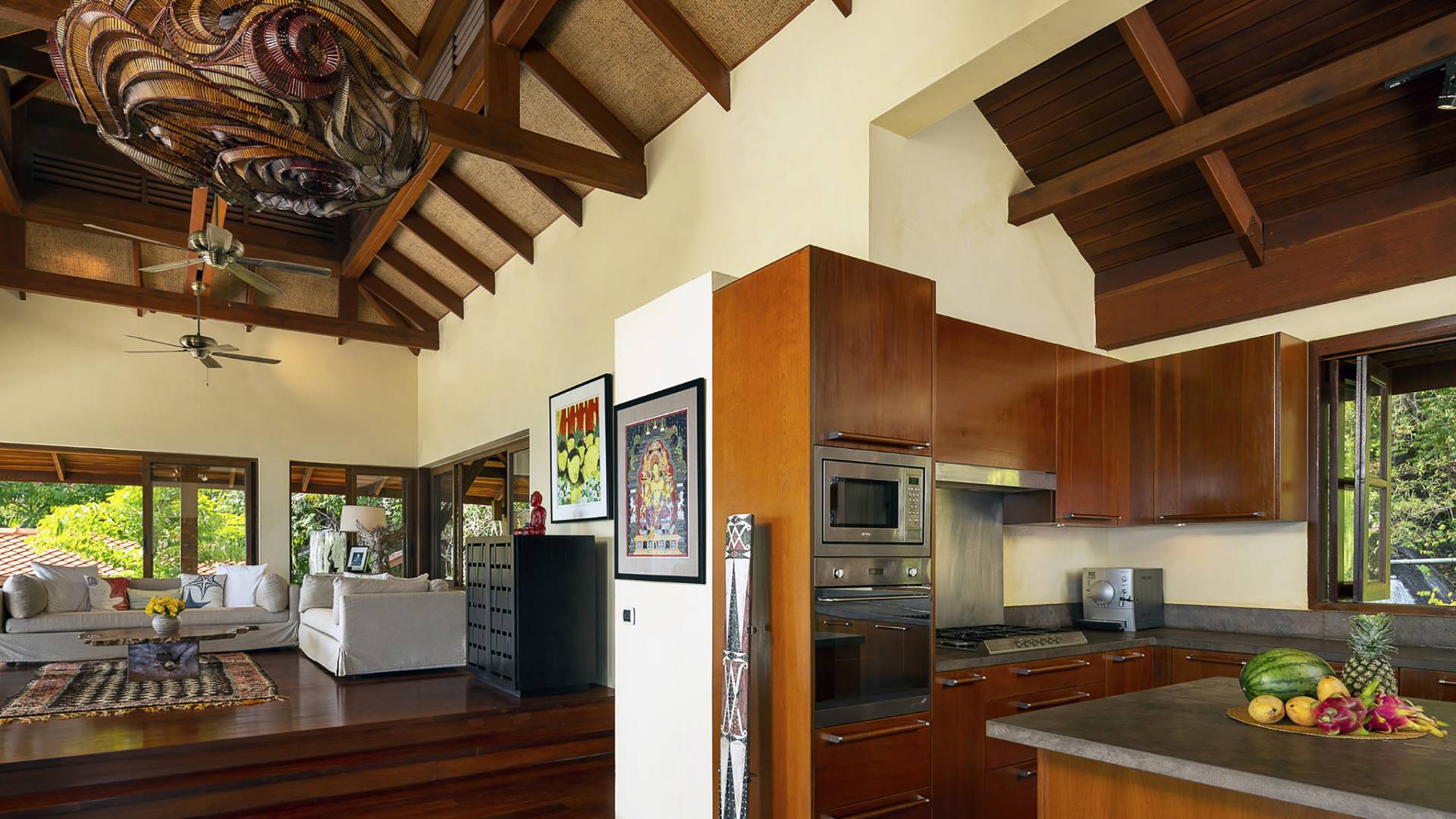 Les intérieurs comportent des luminaires faits à la main qui mettent en valeur les impressionnants plafonds de chaume, tandis que des tables anglo-birmanes antiques, des meubles tibétains, des tables basses en teck balinais, des œuvres d'art contemporaines, des tapis en sisal et des canapés sur mesure conçus pour un confort complet, créent un sentiment d'emplacement unique, élégant et exotique. Sur les balcons en séquoia, des chaises et des tables en rotin offrent aux clients un confort suprême pour l'heure de l'apéritif tout en profitant de la vue imprenable sur le coucher de soleil. Une table en teck balinais peut accueillir dix personnes pour le dîner servie par une cuisine impressionnante qui comprend un îlot central en ardoise portugaise, des comptoirs en ardoise et des armoires en merisier sur mesure avec tous les ustensiles nécessaires pour tout préparer, d'un repas intime à un dîner pour 50 invités (un chef privé est disponible moyennant des frais supplémentaires).