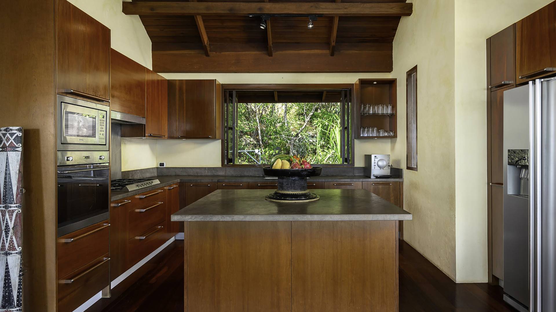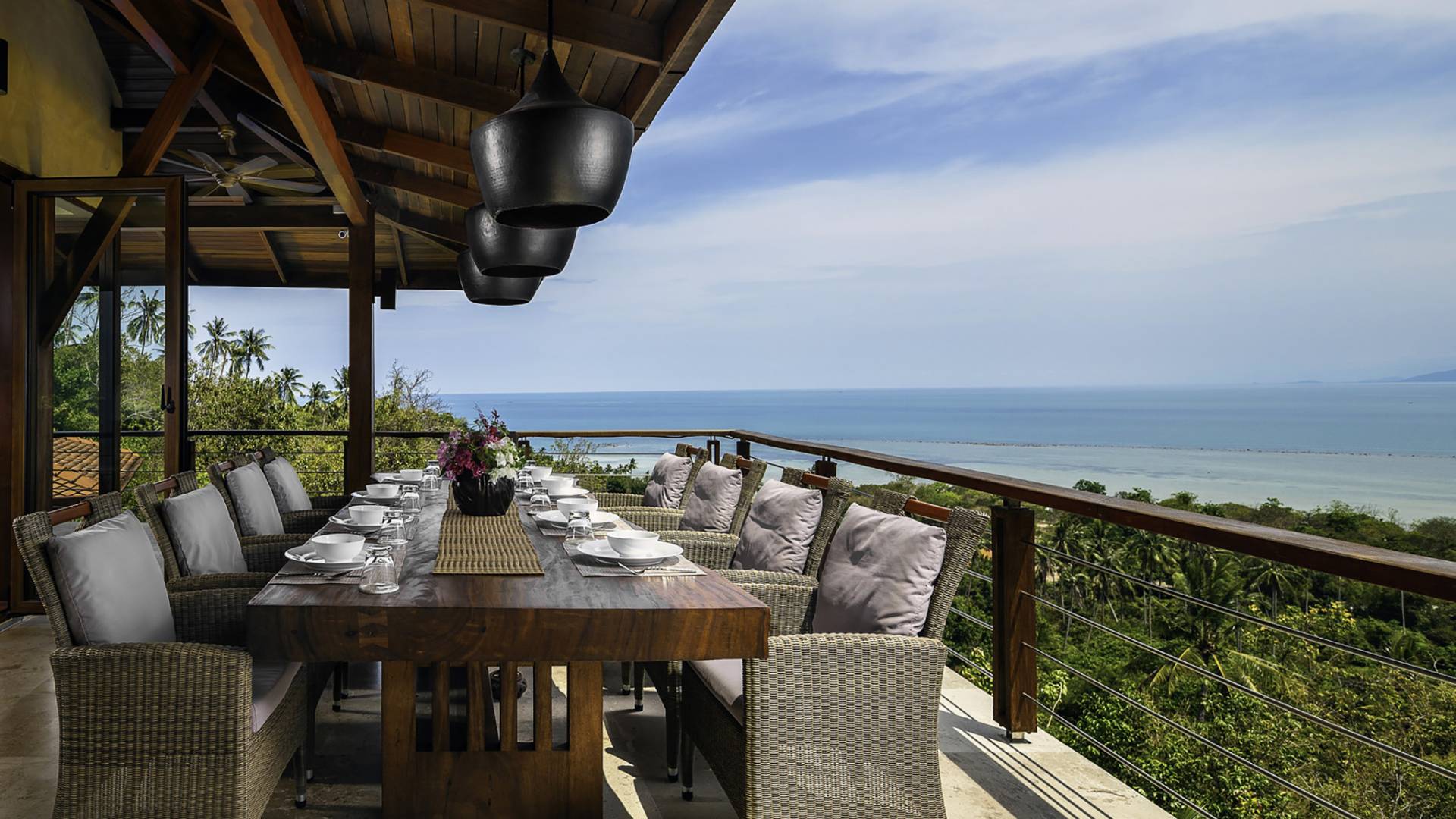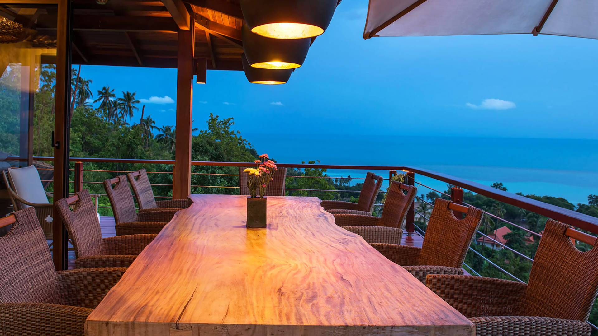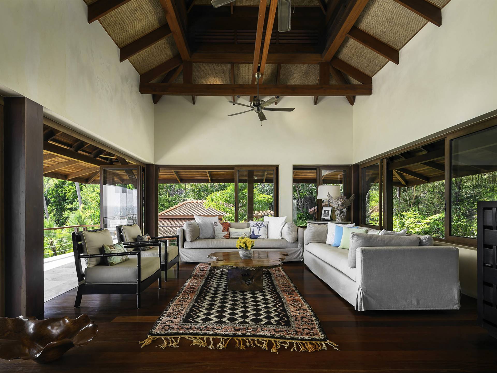 Les intérieurs comportent des luminaires faits à la main qui mettent en valeur les impressionnants plafonds de chaume, tandis que des tables anglo-birmanes antiques, des meubles tibétains, des tables basses en teck balinais, des œuvres d'art contemporaines, des tapis en sisal et des canapés sur mesure conçus pour un confort complet, créent un sentiment d'emplacement unique, élégant et exotique. Sur les balcons en séquoia, des chaises et des tables en rotin offrent aux clients un confort suprême pour l'heure de l'apéritif tout en profitant de la vue imprenable sur le coucher de soleil. Une table en teck balinais peut accueillir dix personnes pour le dîner servie par une cuisine impressionnante qui comprend un îlot central en ardoise portugaise, des comptoirs en ardoise et des armoires en merisier sur mesure avec tous les ustensiles nécessaires pour tout préparer, d'un repas intime à un dîner pour 50 invités (un chef privé est disponible moyennant des frais supplémentaires).