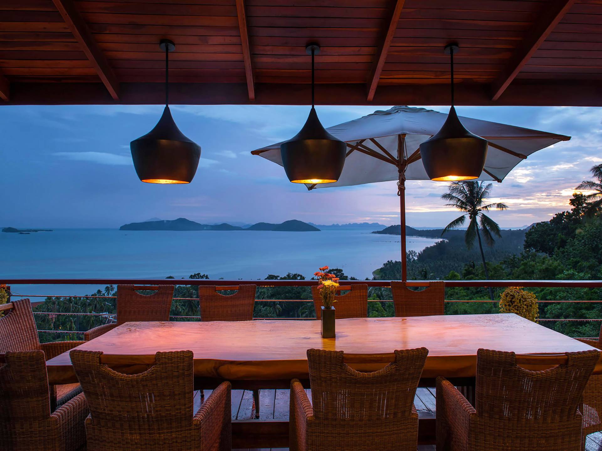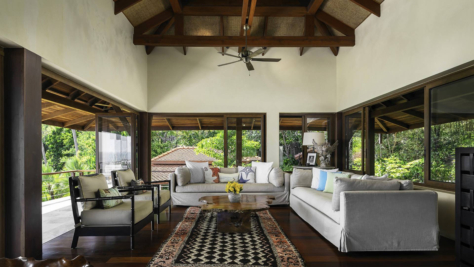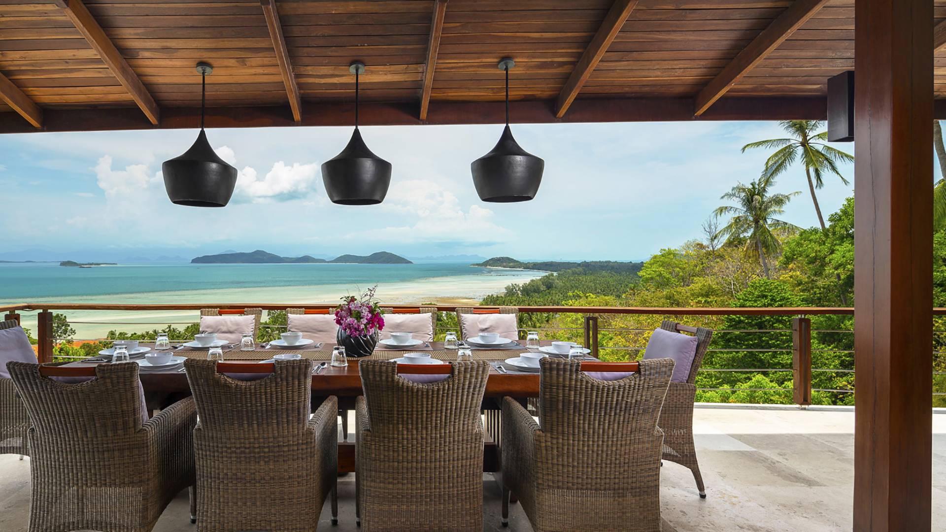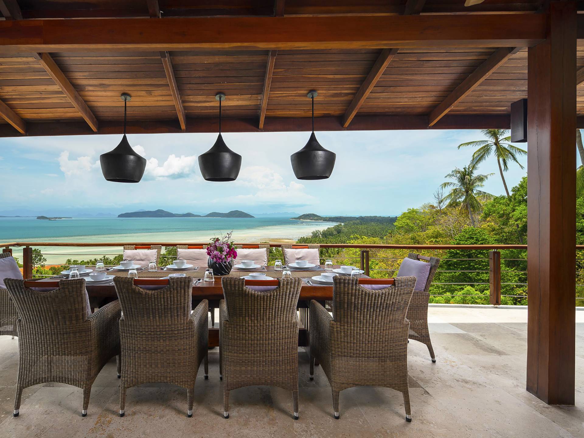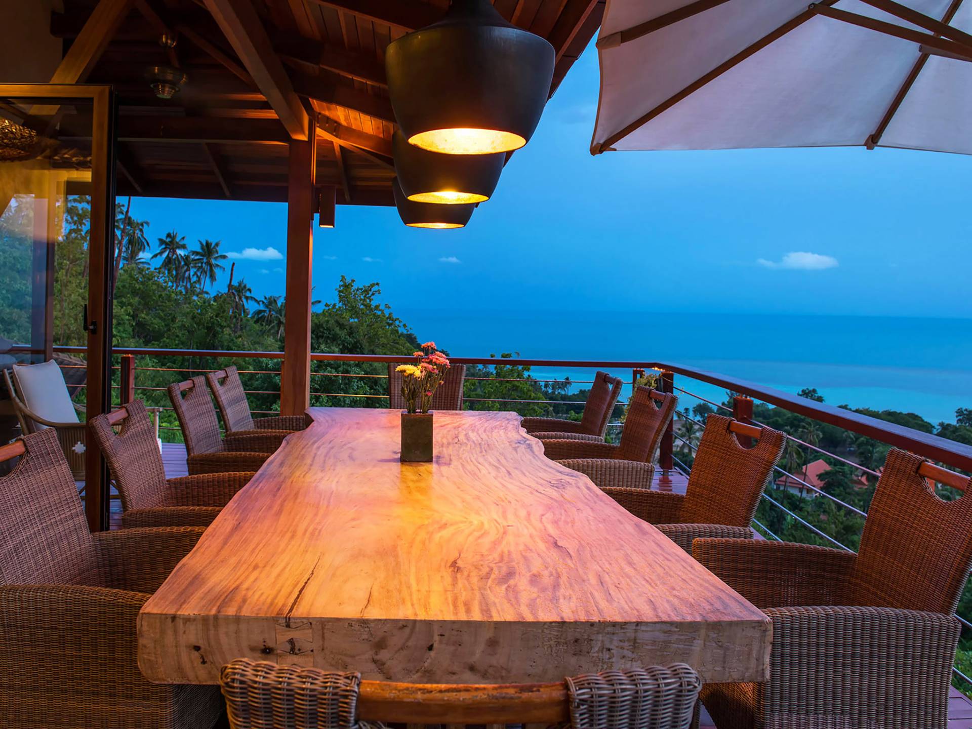 Les intérieurs comportent des luminaires faits à la main qui mettent en valeur les impressionnants plafonds de chaume, tandis que des tables anglo-birmanes antiques, des meubles tibétains, des tables basses en teck balinais, des œuvres d'art contemporaines, des tapis en sisal et des canapés sur mesure conçus pour un confort complet, créent un sentiment d'emplacement unique, élégant et exotique. Sur les balcons en séquoia, des chaises et des tables en rotin offrent aux clients un confort suprême pour l'heure de l'apéritif tout en profitant de la vue imprenable sur le coucher de soleil. Une table en teck balinais peut accueillir dix personnes pour le dîner servie par une cuisine impressionnante qui comprend un îlot central en ardoise portugaise, des comptoirs en ardoise et des armoires en merisier sur mesure avec tous les ustensiles nécessaires pour tout préparer, d'un repas intime à un dîner pour 50 invités (un chef privé est disponible moyennant des frais supplémentaires).