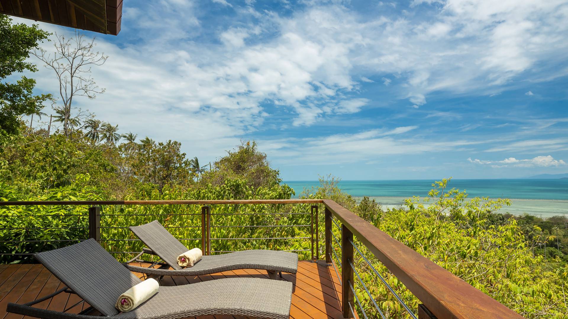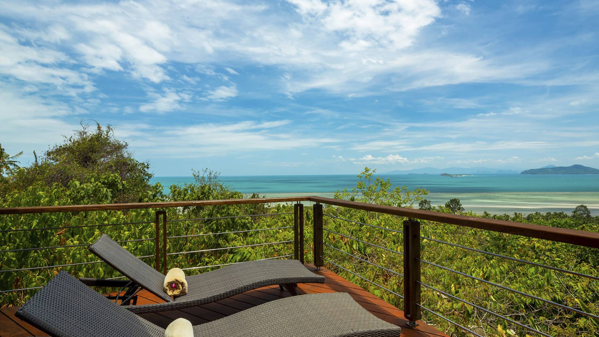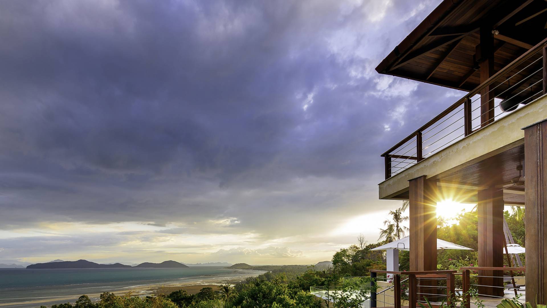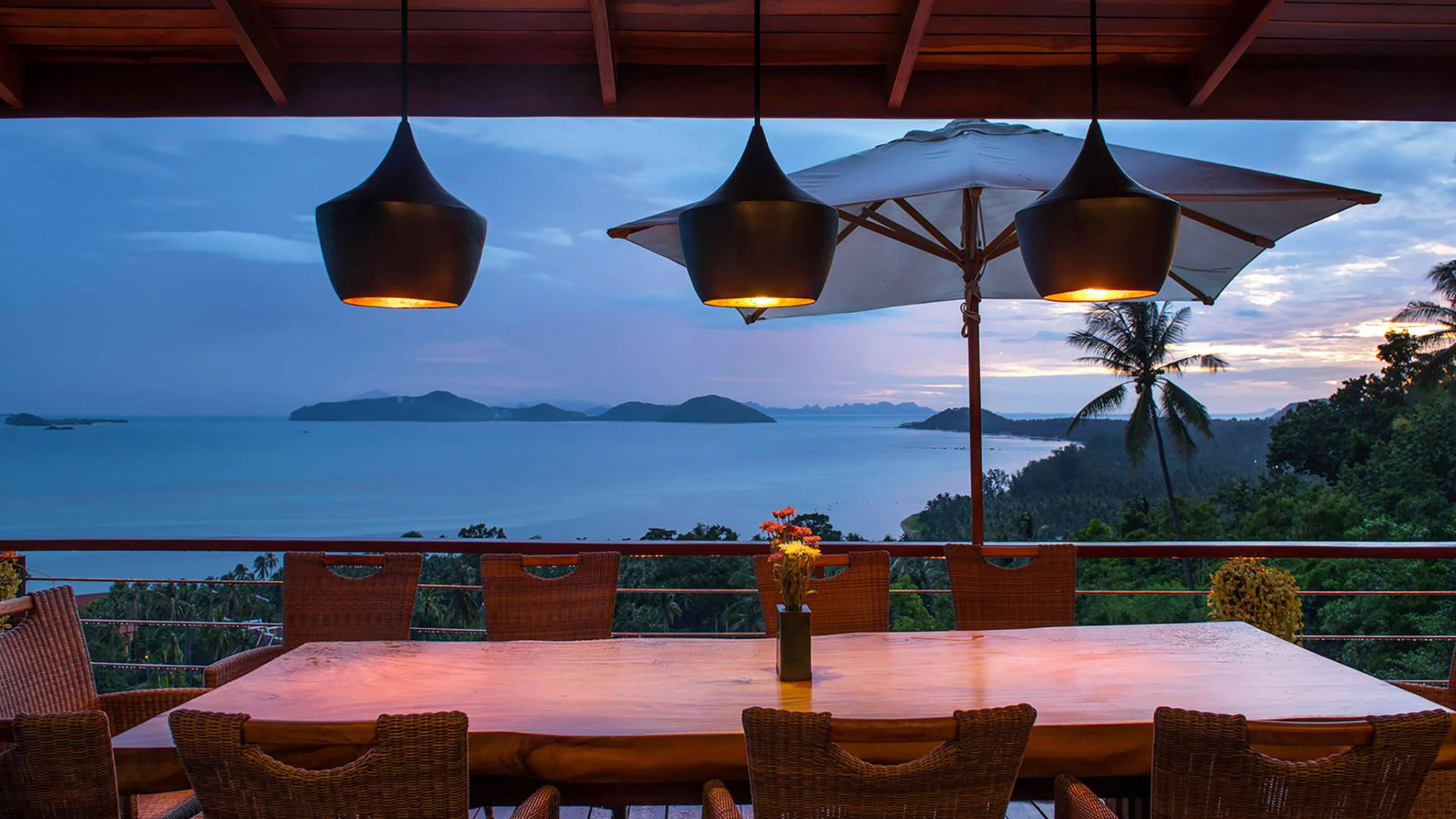 Les intérieurs comportent des luminaires faits à la main qui mettent en valeur les impressionnants plafonds de chaume, tandis que des tables anglo-birmanes antiques, des meubles tibétains, des tables basses en teck balinais, des œuvres d'art contemporaines, des tapis en sisal et des canapés sur mesure conçus pour un confort complet, créent un sentiment d'emplacement unique, élégant et exotique. Sur les balcons en séquoia, des chaises et des tables en rotin offrent aux clients un confort suprême pour l'heure de l'apéritif tout en profitant de la vue imprenable sur le coucher de soleil. Une table en teck balinais peut accueillir dix personnes pour le dîner servie par une cuisine impressionnante qui comprend un îlot central en ardoise portugaise, des comptoirs en ardoise et des armoires en merisier sur mesure avec tous les ustensiles nécessaires pour tout préparer, d'un repas intime à un dîner pour 50 invités (un chef privé est disponible moyennant des frais supplémentaires).