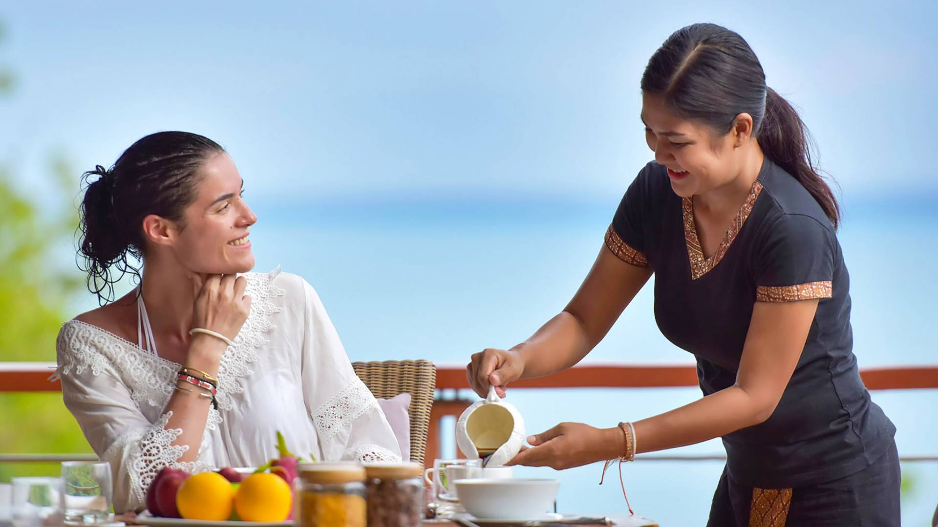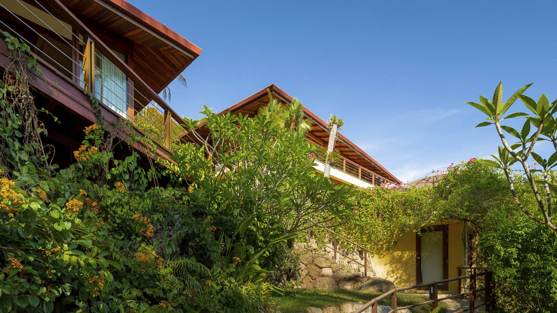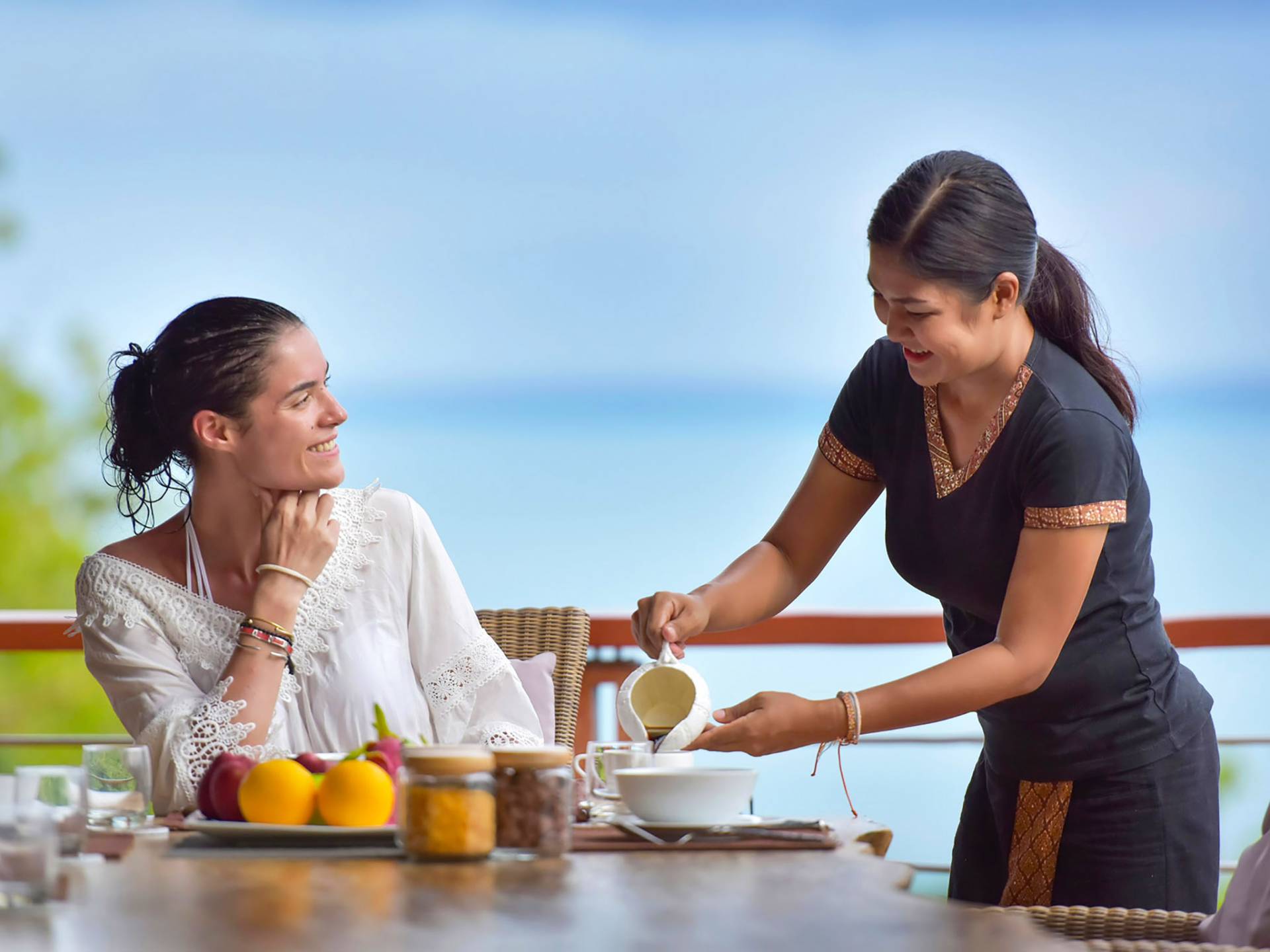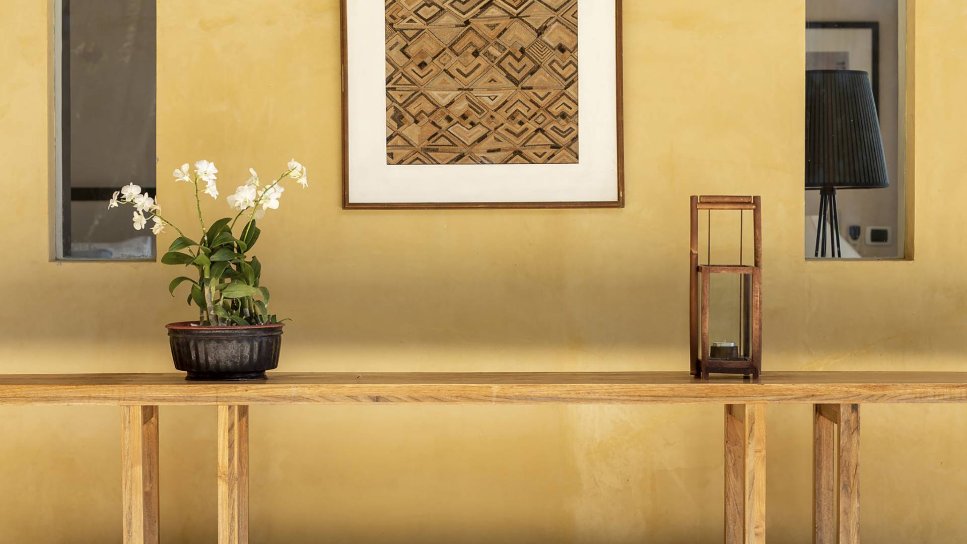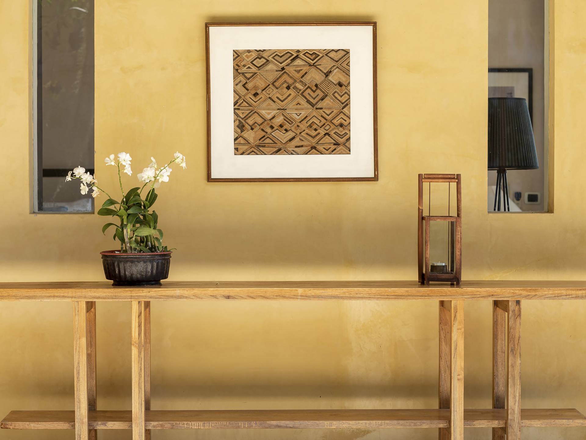 Les intérieurs comportent des luminaires faits à la main qui mettent en valeur les impressionnants plafonds de chaume, tandis que des tables anglo-birmanes antiques, des meubles tibétains, des tables basses en teck balinais, des œuvres d'art contemporaines, des tapis en sisal et des canapés sur mesure conçus pour un confort complet, créent un sentiment d'emplacement unique, élégant et exotique. Sur les balcons en séquoia, des chaises et des tables en rotin offrent aux clients un confort suprême pour l'heure de l'apéritif tout en profitant de la vue imprenable sur le coucher de soleil. Une table en teck balinais peut accueillir dix personnes pour le dîner servie par une cuisine impressionnante qui comprend un îlot central en ardoise portugaise, des comptoirs en ardoise et des armoires en merisier sur mesure avec tous les ustensiles nécessaires pour tout préparer, d'un repas intime à un dîner pour 50 invités (un chef privé est disponible moyennant des frais supplémentaires).