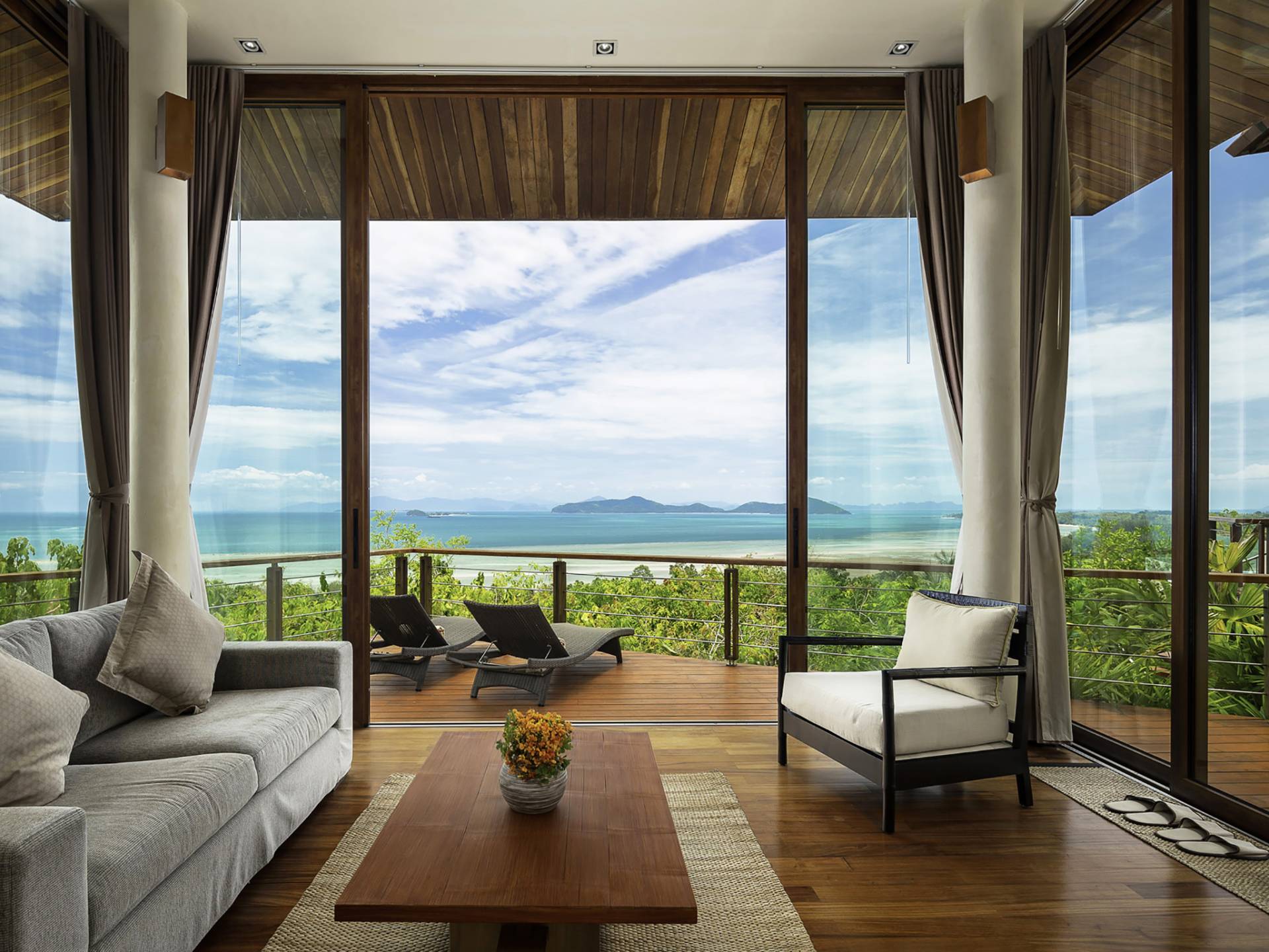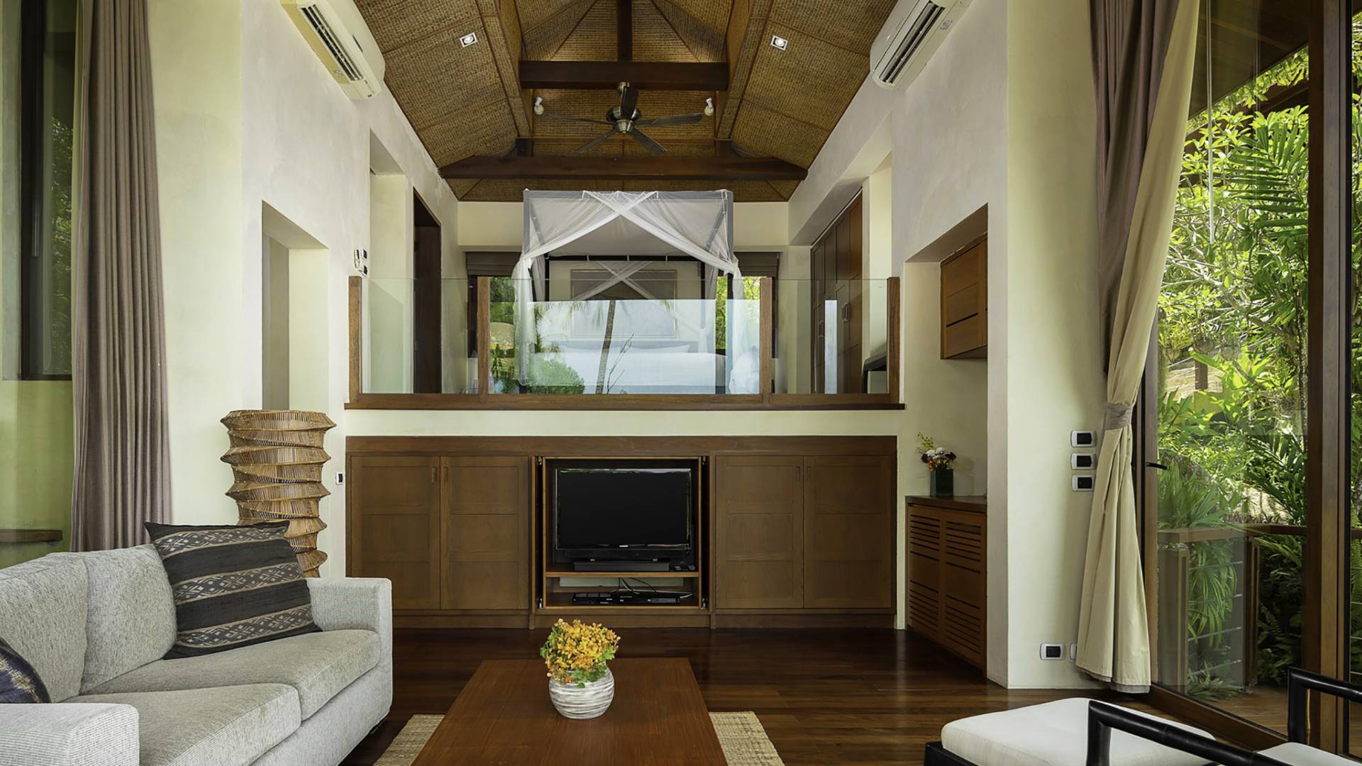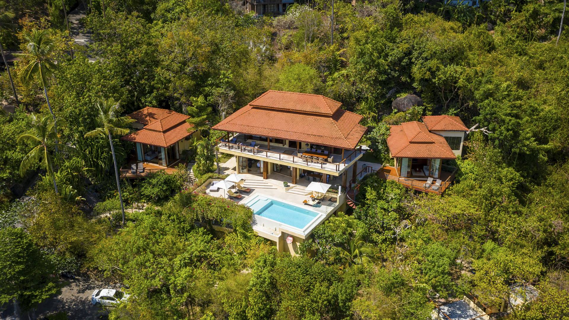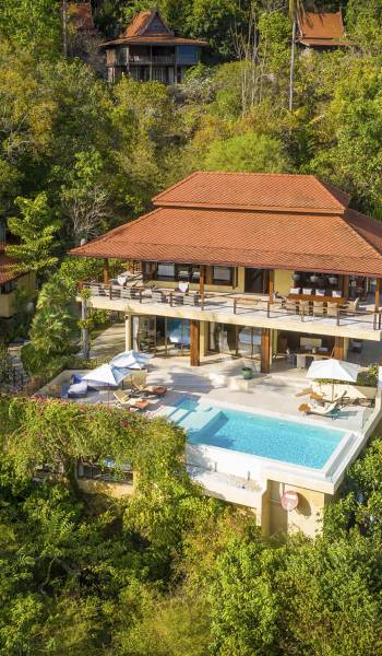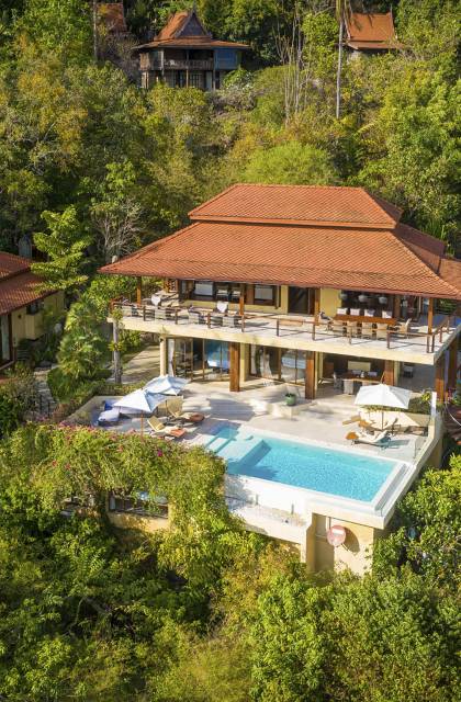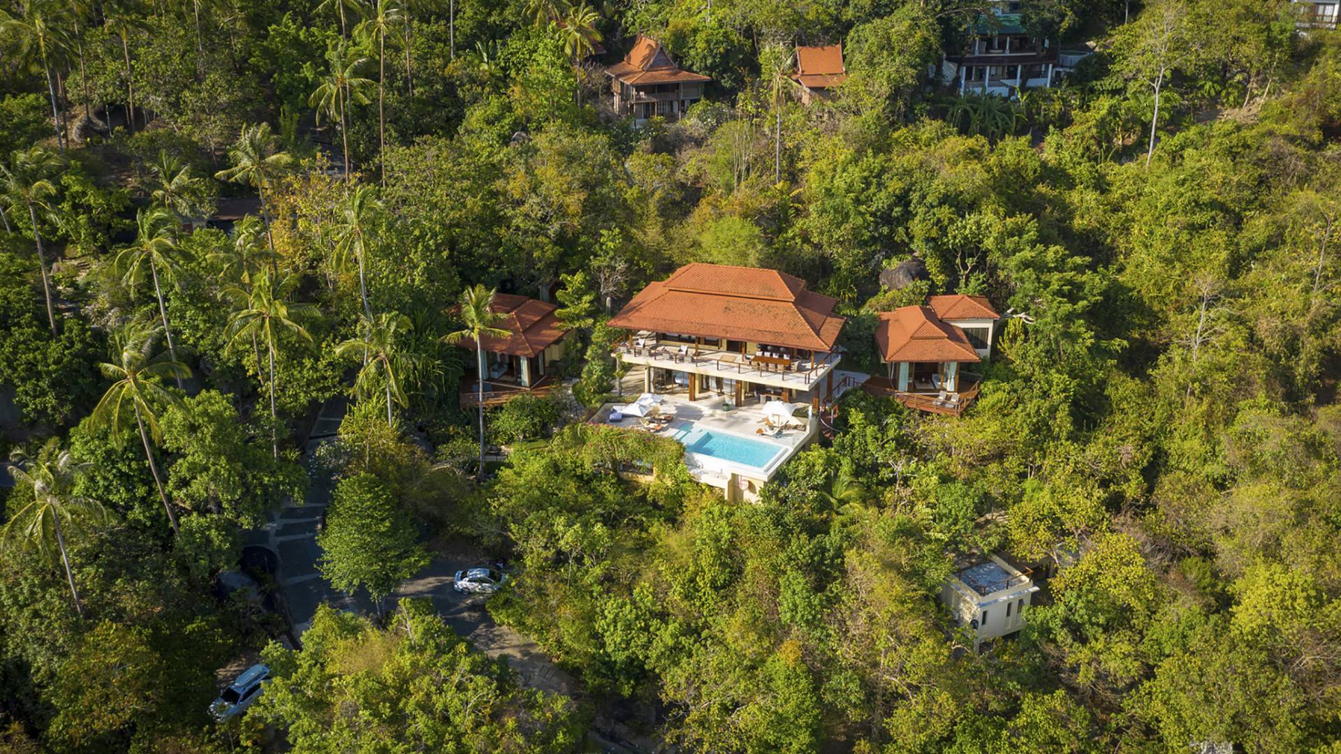 Construite sur plusieurs niveaux dans une colline boisée paradisiaque, la Villa Sila Varee bénéficie d'un style asiatique contemporain et d'un luxe en abondance. Les entrées paysagées des niveaux supérieur et inférieur invitent les visiteurs à pénétrer dans l'enceinte à travers d'anciennes portes indonésiennes en batak, devant des cascades en cascade. Une fois à l'intérieur, le bâtiment principal de deux étages de la villa donne sur la piscine à débordement jusqu'à l'océan au-delà et abrite un salon et une salle à manger décloisonnés à l'étage supérieur, ainsi que trois chambres d'hôtes avec salle de bains privative.