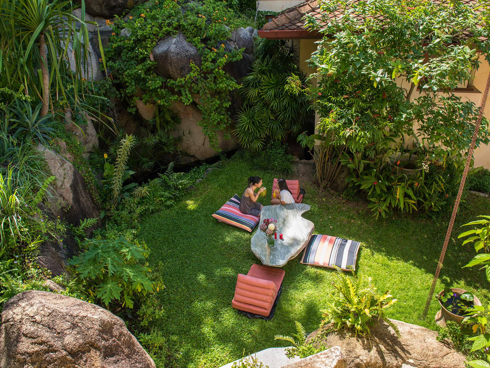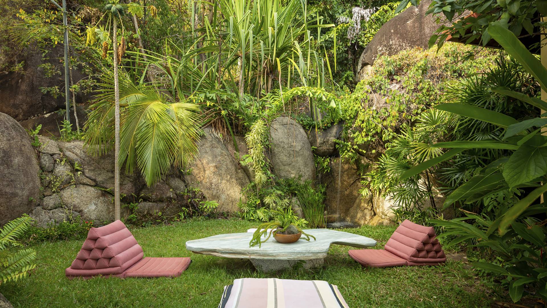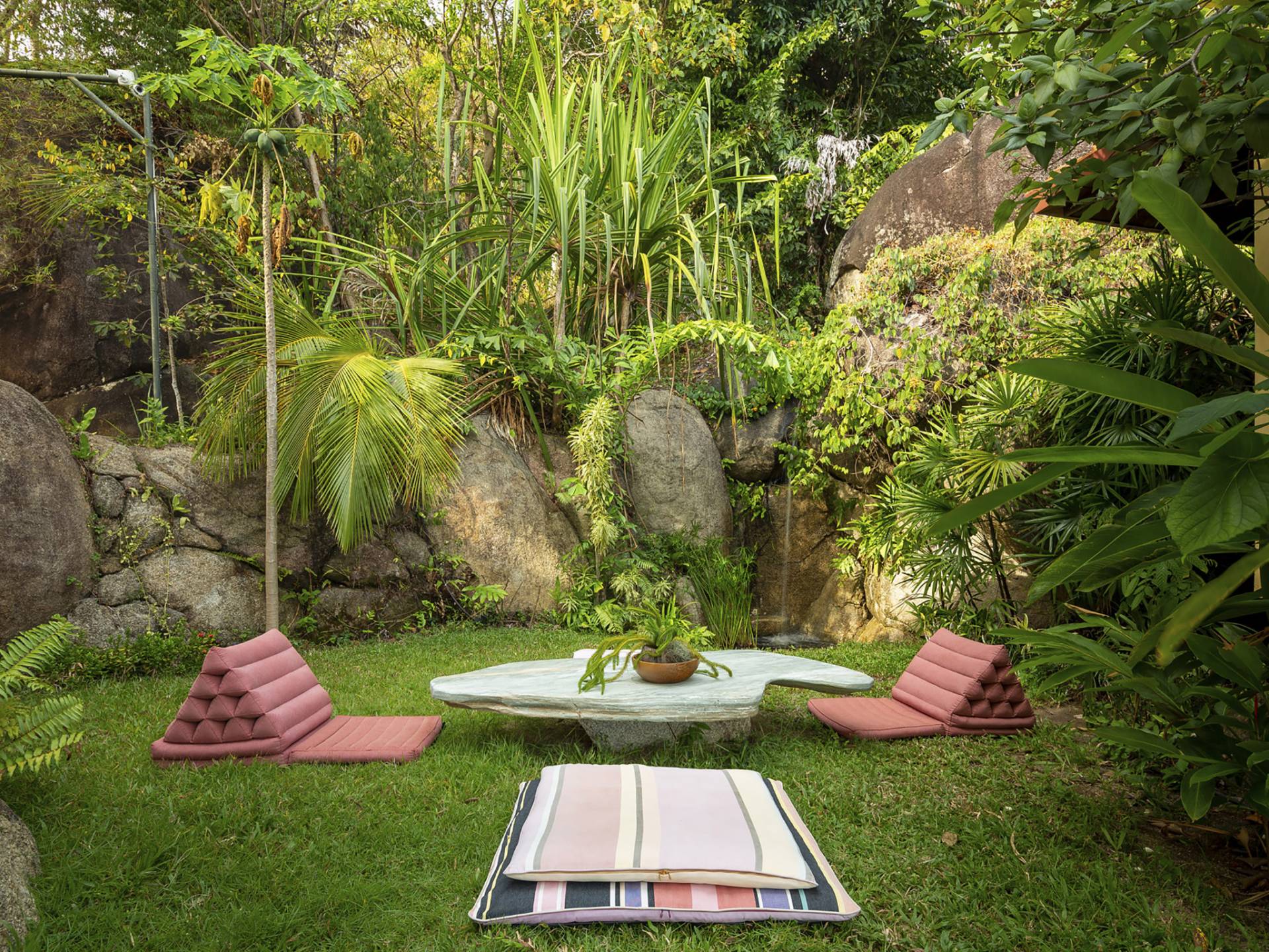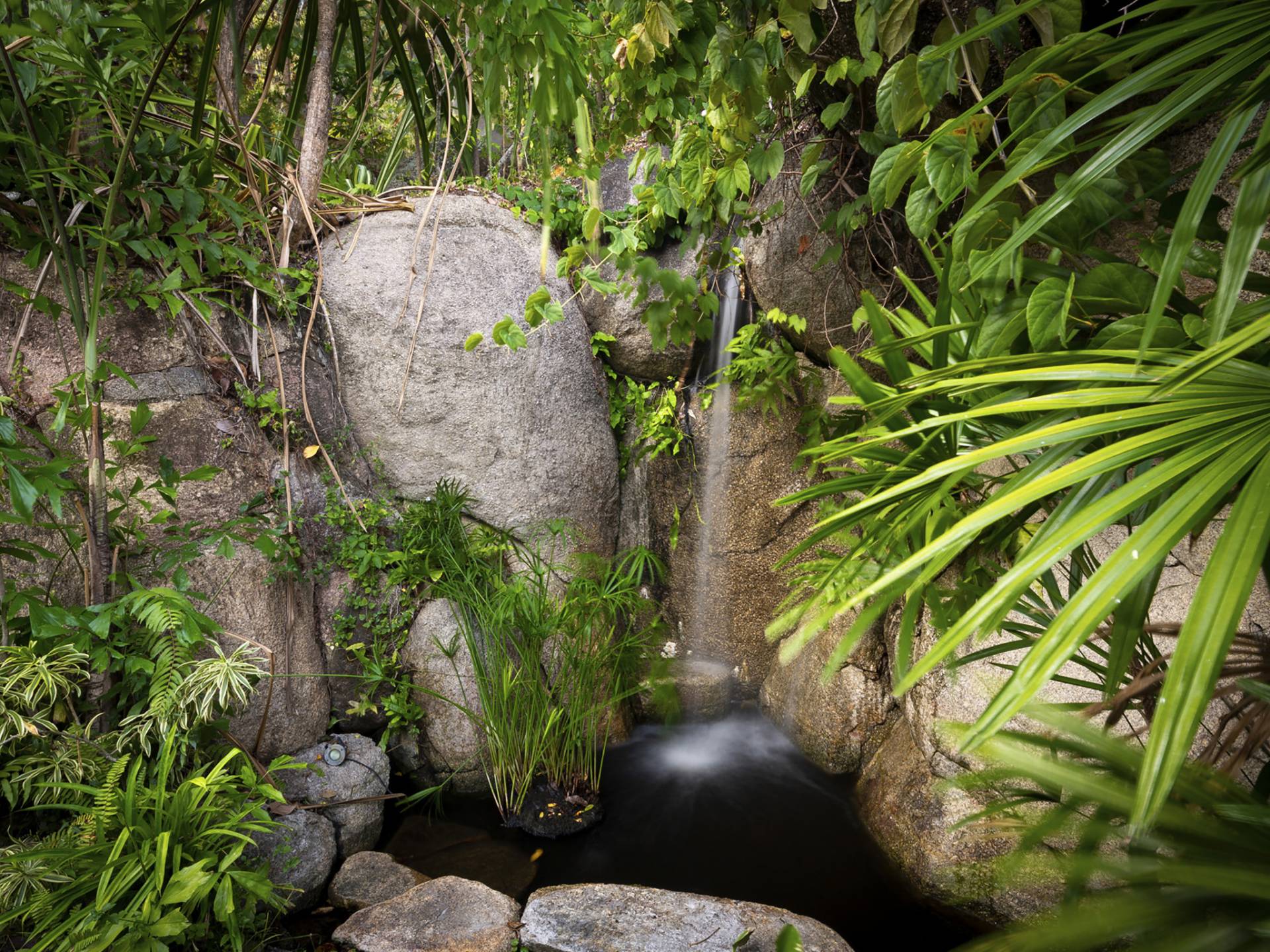 Un espace séparé en bas, au niveau de la piscine, est dédié à la cuisine en plein air, avec un espace barbecue protégé, une cuisine séparée, un bar et un espace repas. Une douche extérieure et un vestiaire sont accessibles pour ceux qui utilisent la piscine, tandis que derrière la maison principale, entre les villas des chambres, un jardin luxuriant à l'arrière comprend une magnifique cascade et constitue l'endroit idéal pour le thé de l'après-midi, les pique-niques ou la méditation.