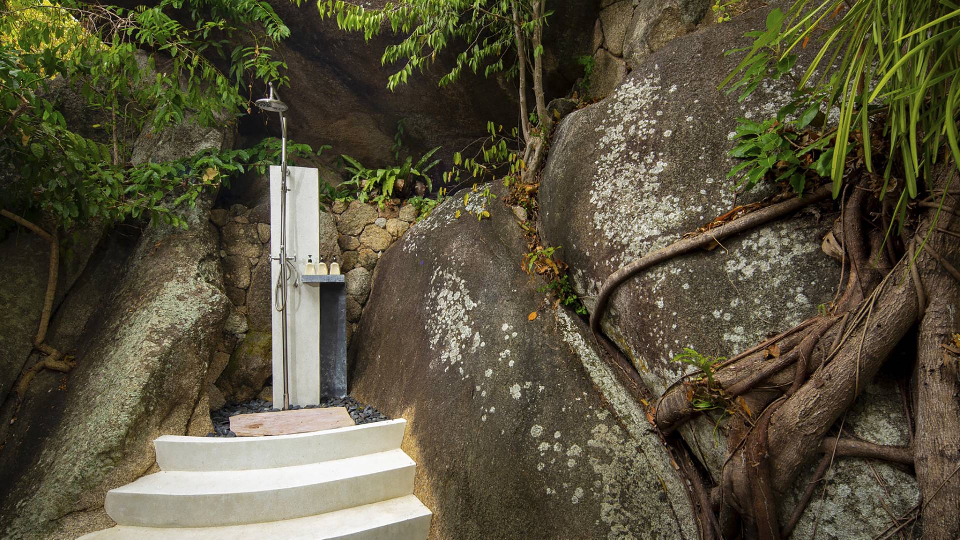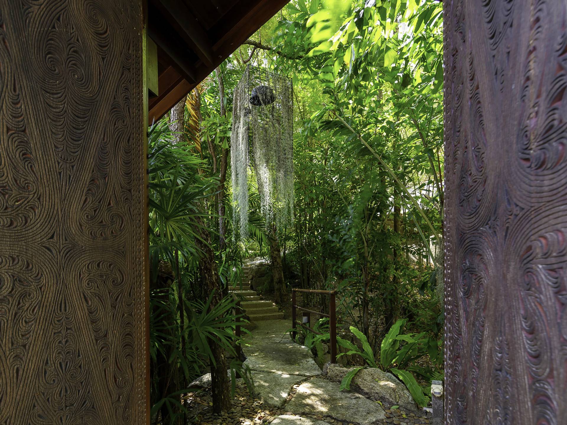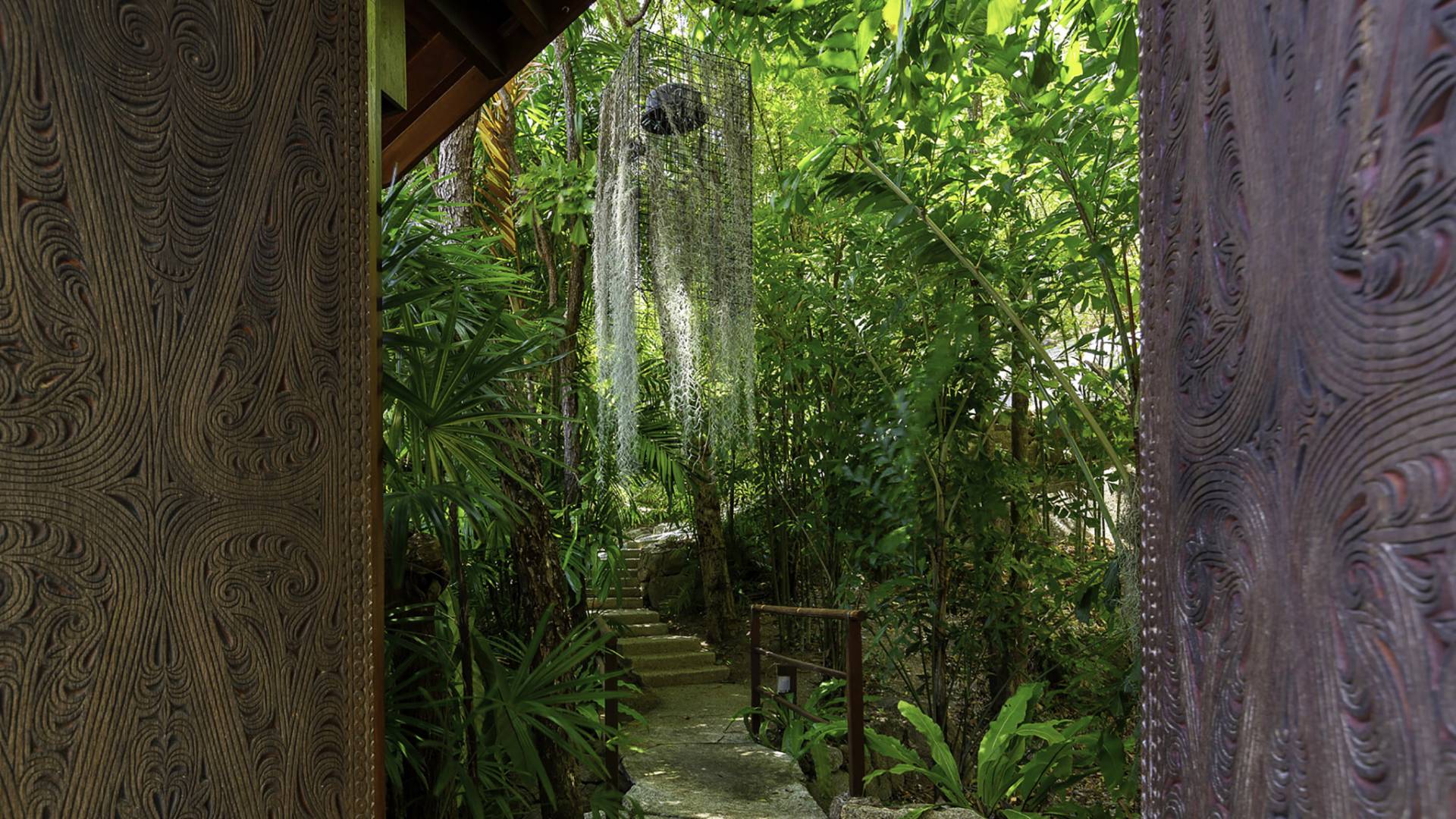 Un espace séparé en bas, au niveau de la piscine, est dédié à la cuisine en plein air, avec un espace barbecue protégé, une cuisine séparée, un bar et un espace repas. Une douche extérieure et un vestiaire sont accessibles pour ceux qui utilisent la piscine, tandis que derrière la maison principale, entre les villas des chambres, un jardin luxuriant à l'arrière comprend une magnifique cascade et constitue l'endroit idéal pour le thé de l'après-midi, les pique-niques ou la méditation.