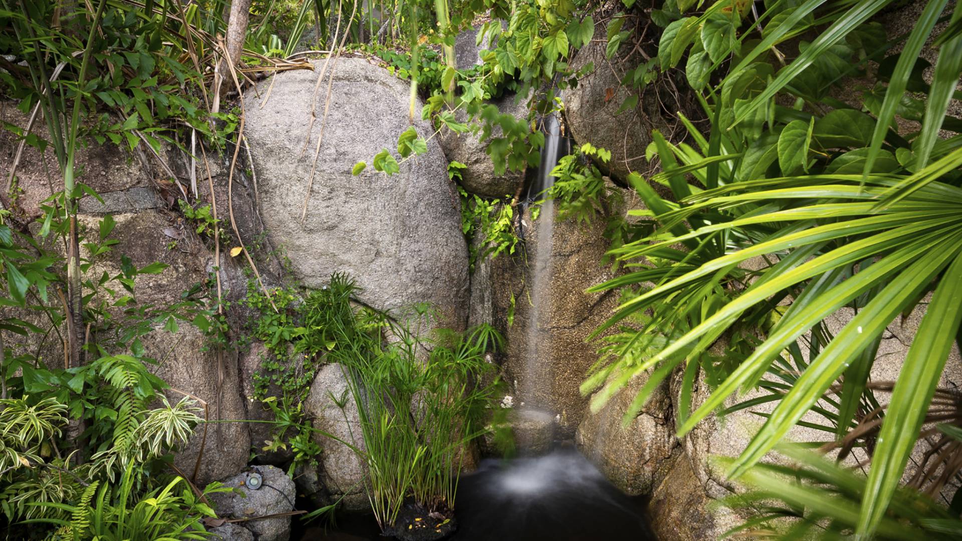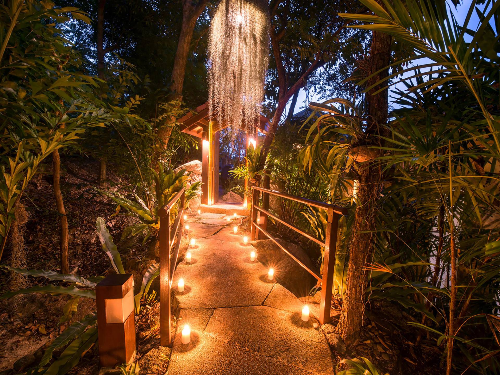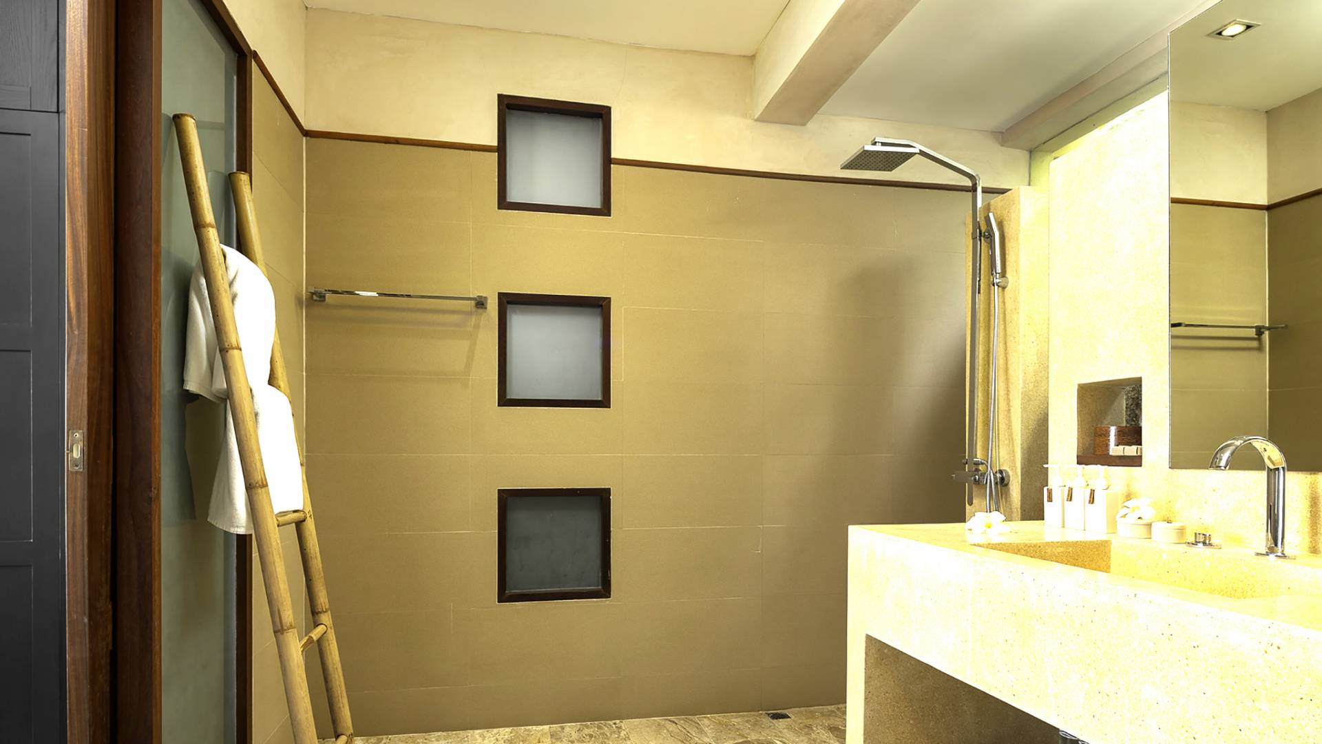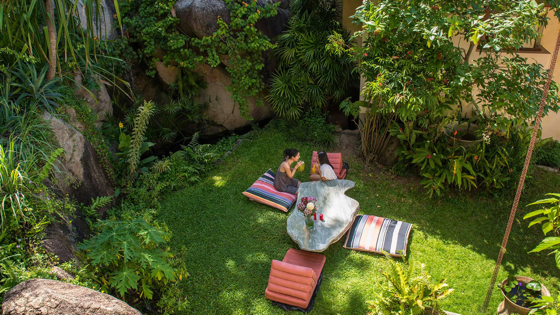 Un espace séparé en bas, au niveau de la piscine, est dédié à la cuisine en plein air, avec un espace barbecue protégé, une cuisine séparée, un bar et un espace repas. Une douche extérieure et un vestiaire sont accessibles pour ceux qui utilisent la piscine, tandis que derrière la maison principale, entre les villas des chambres, un jardin luxuriant à l'arrière comprend une magnifique cascade et constitue l'endroit idéal pour le thé de l'après-midi, les pique-niques ou la méditation.