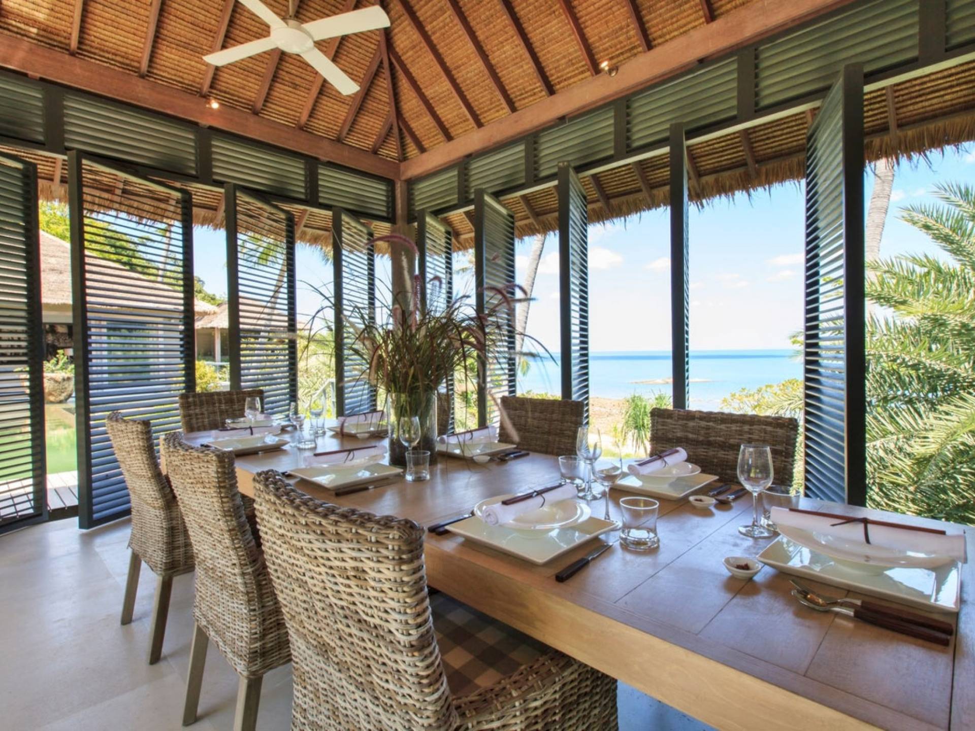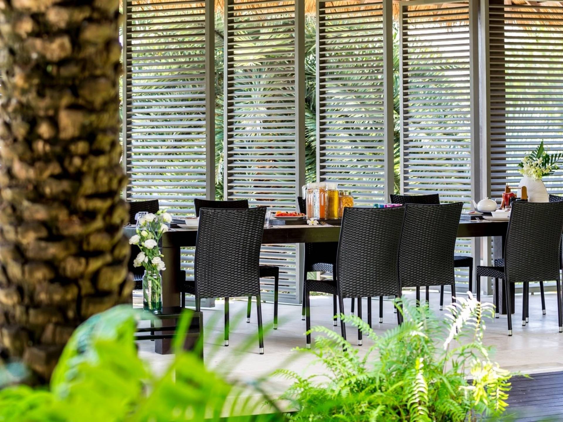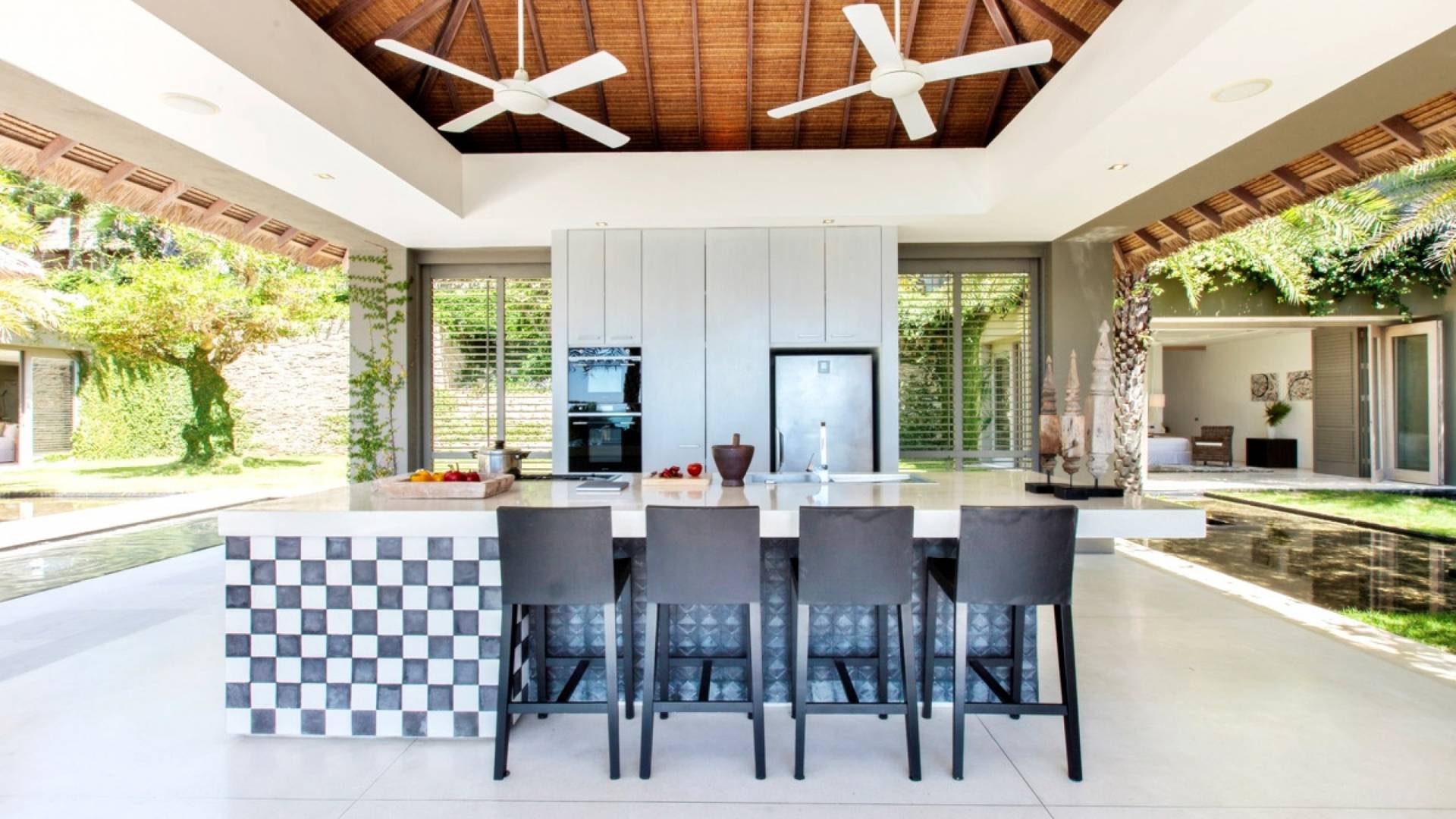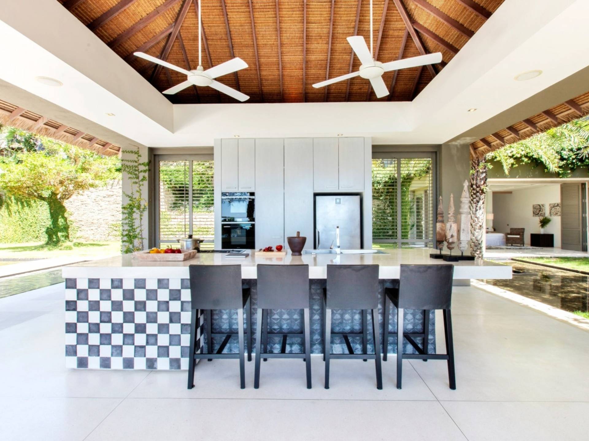 Également au même niveau, des chemins traversent des plans d'eau dans le jardin avec pelouse et se connectent à la cuisine, au salon et à la salle à manger, qui occupent tous leurs propres pavillons séparés au toit de chaume. Le salon est meublé d'un long canapé rembourré et d'une banquette-lit, la cuisine dispose d'un bar central pour le petit-déjeuner et les deux zones sont protégées des éléments par des stores automatisés. Le pavillon de salle à manger avec vue sur l'océan peut accueillir de 8 à 10 personnes et est entouré sur trois côtés de volets en bois à lattes qui pivotent pour profiter de la vue apaisante sur l'océan.