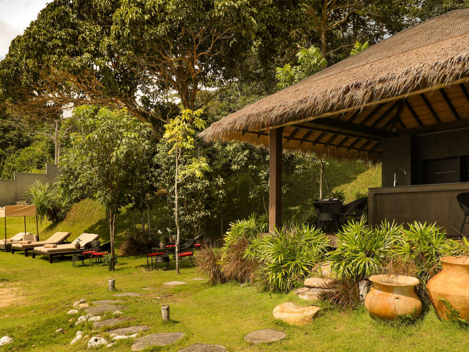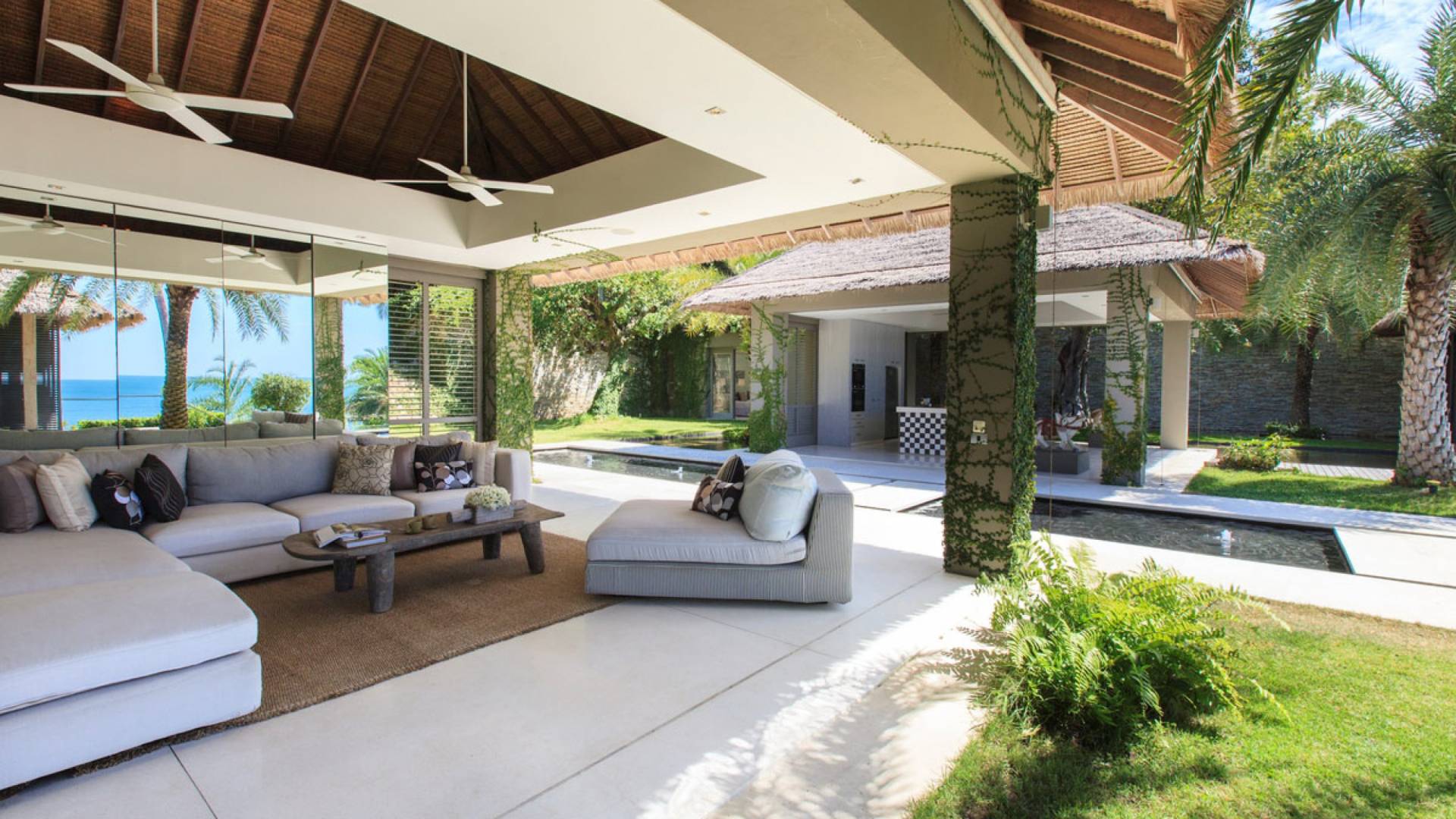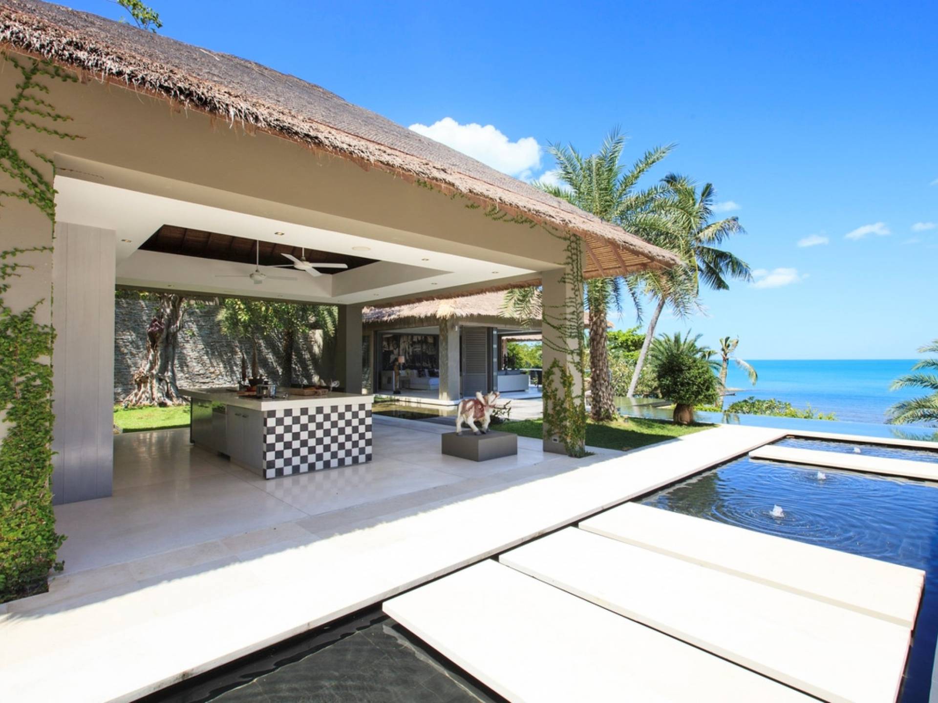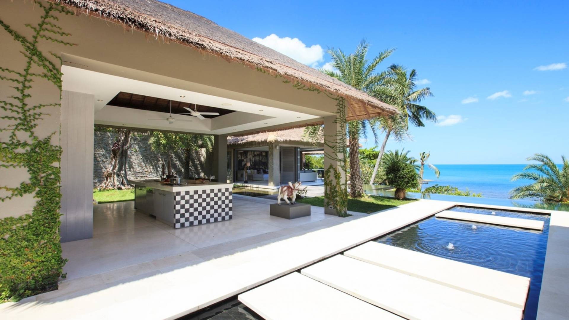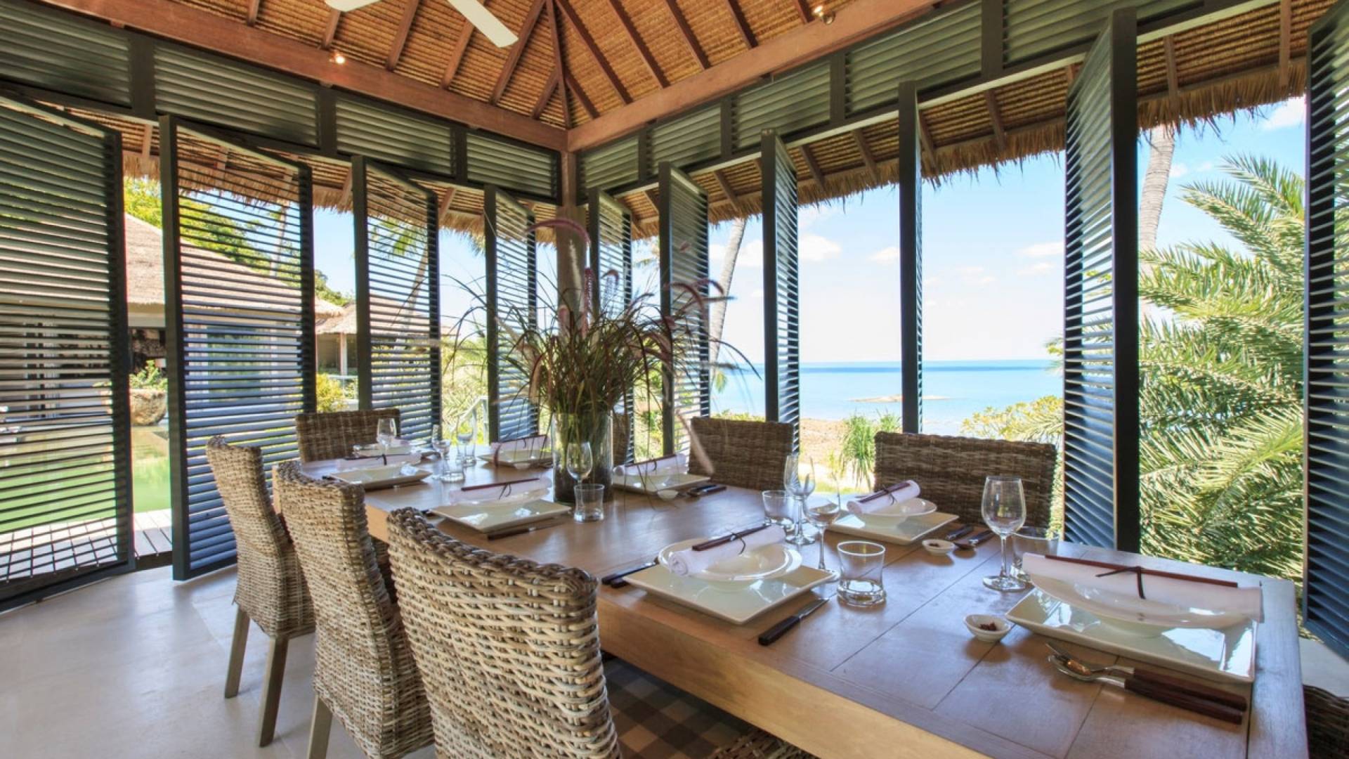 Également au même niveau, des chemins traversent des plans d'eau dans le jardin avec pelouse et se connectent à la cuisine, au salon et à la salle à manger, qui occupent tous leurs propres pavillons séparés au toit de chaume. Le salon est meublé d'un long canapé rembourré et d'une banquette-lit, la cuisine dispose d'un bar central pour le petit-déjeuner et les deux zones sont protégées des éléments par des stores automatisés. Le pavillon de salle à manger avec vue sur l'océan peut accueillir de 8 à 10 personnes et est entouré sur trois côtés de volets en bois à lattes qui pivotent pour profiter de la vue apaisante sur l'océan.