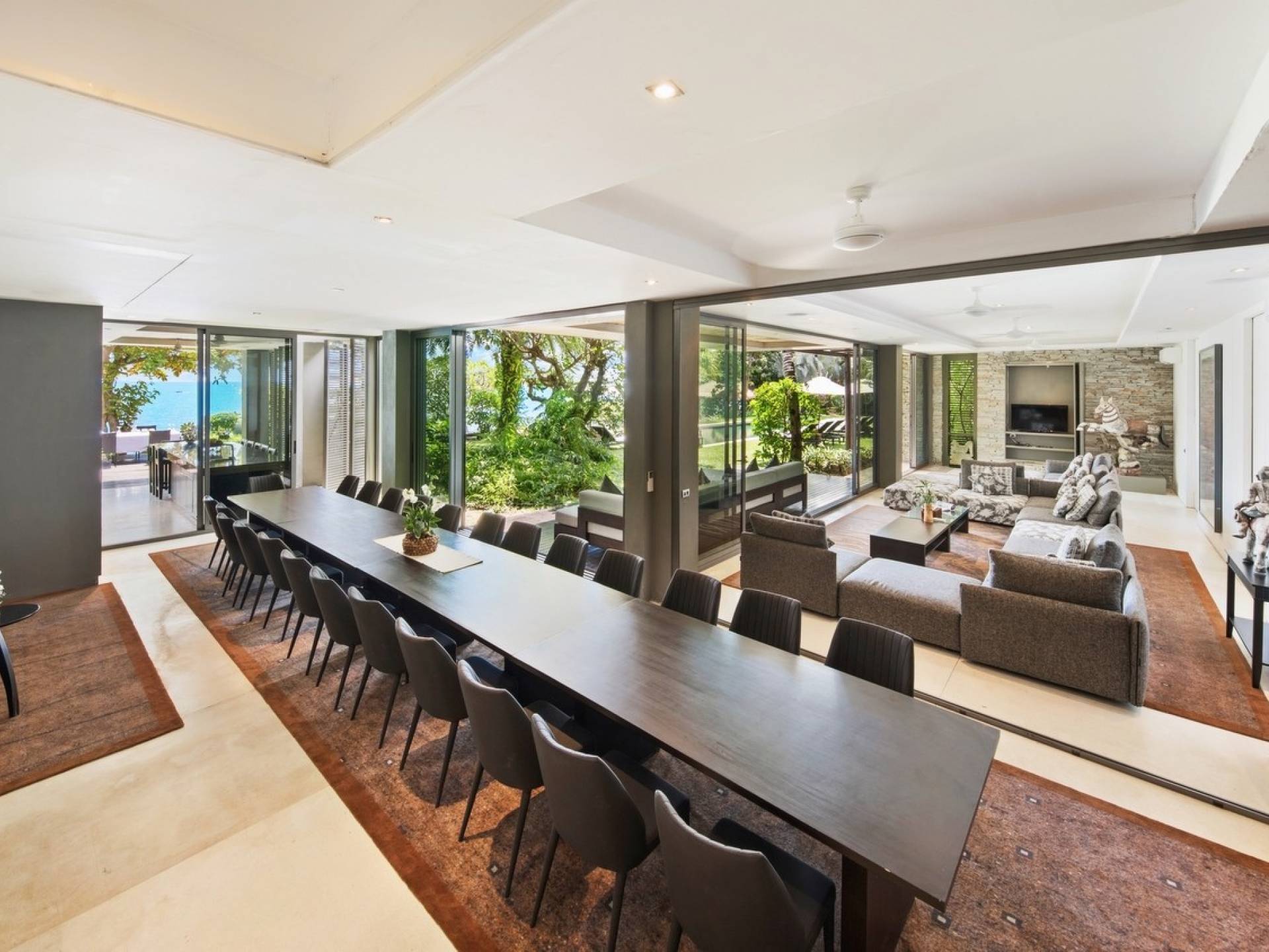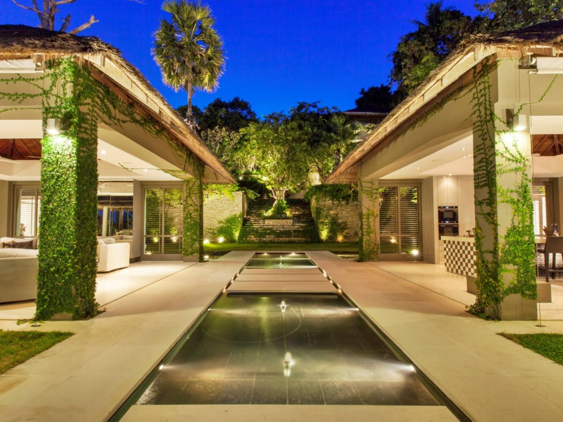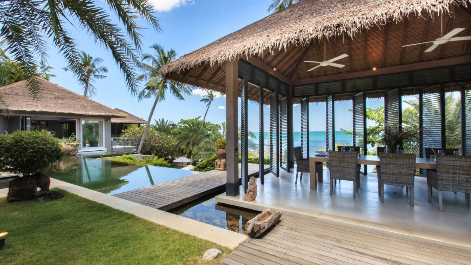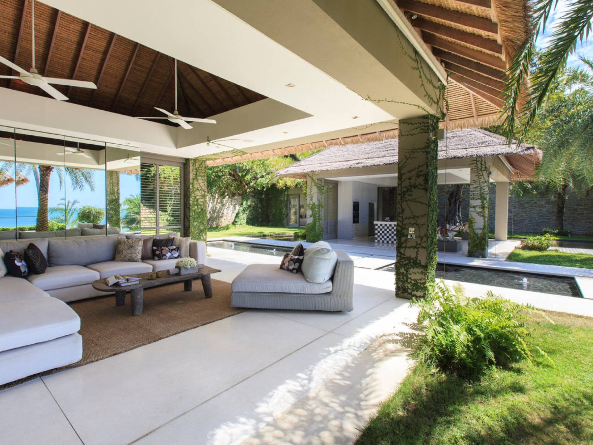 Également au même niveau, des chemins traversent des plans d'eau dans le jardin avec pelouse et se connectent à la cuisine, au salon et à la salle à manger, qui occupent tous leurs propres pavillons séparés au toit de chaume. Le salon est meublé d'un long canapé rembourré et d'une banquette-lit, la cuisine dispose d'un bar central pour le petit-déjeuner et les deux zones sont protégées des éléments par des stores automatisés. Le pavillon de salle à manger avec vue sur l'océan peut accueillir de 8 à 10 personnes et est entouré sur trois côtés de volets en bois à lattes qui pivotent pour profiter de la vue apaisante sur l'océan.