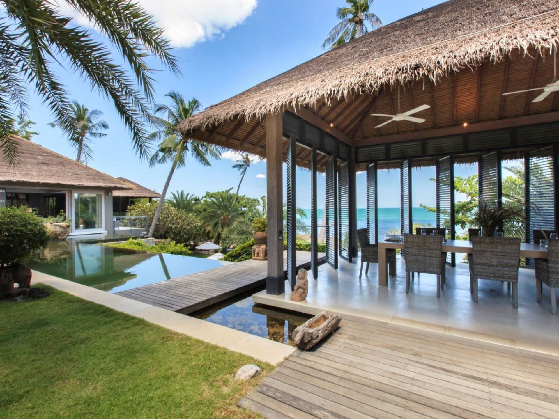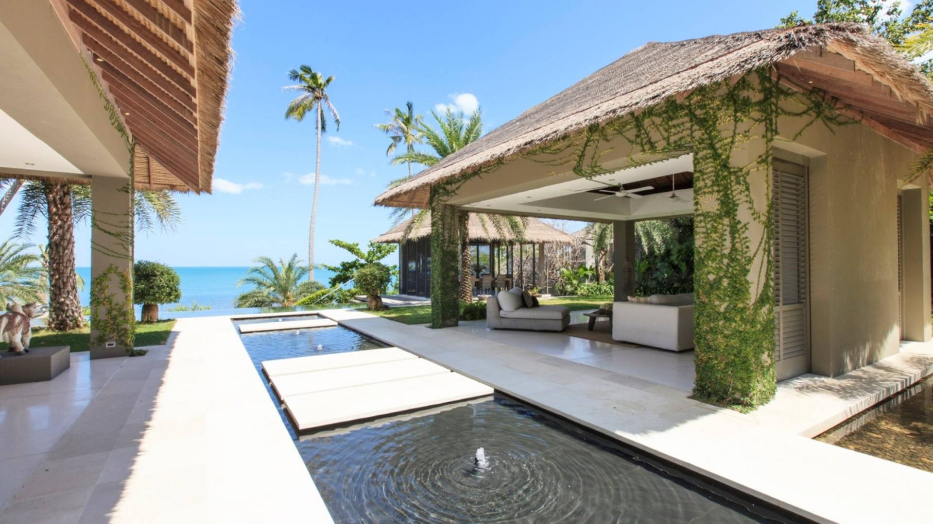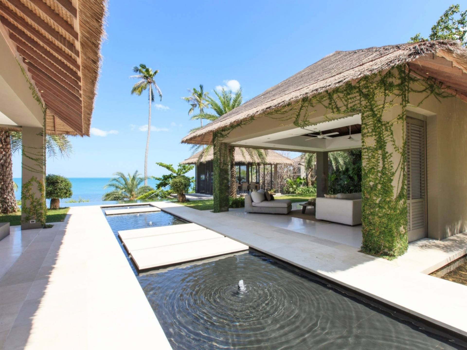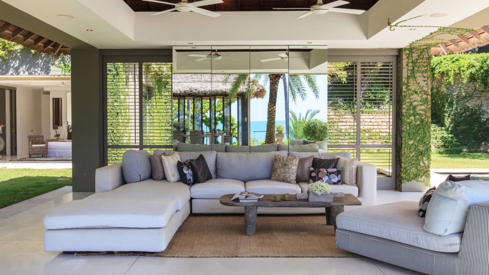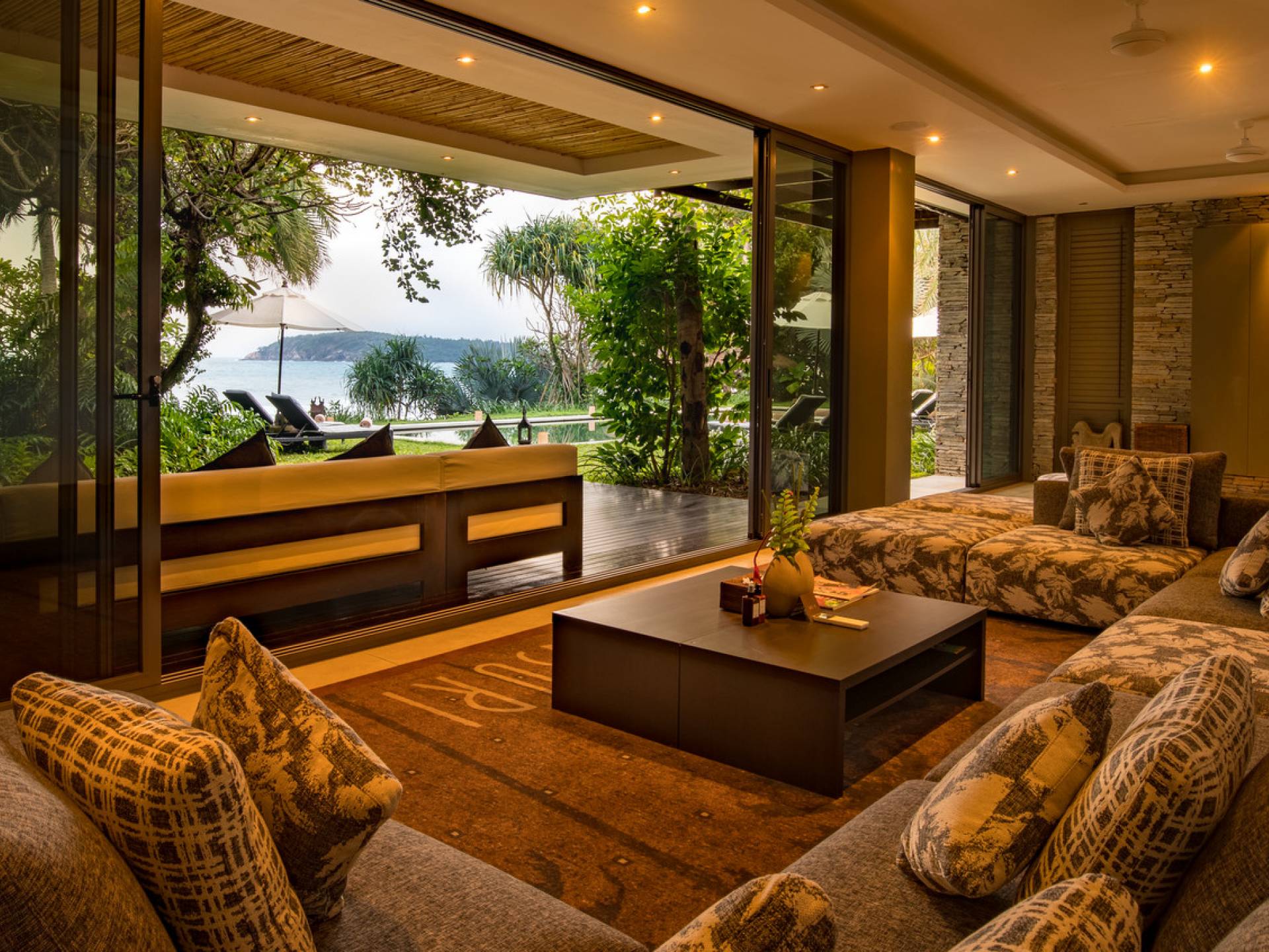 Également au même niveau, des chemins traversent des plans d'eau dans le jardin avec pelouse et se connectent à la cuisine, au salon et à la salle à manger, qui occupent tous leurs propres pavillons séparés au toit de chaume. Le salon est meublé d'un long canapé rembourré et d'une banquette-lit, la cuisine dispose d'un bar central pour le petit-déjeuner et les deux zones sont protégées des éléments par des stores automatisés. Le pavillon de salle à manger avec vue sur l'océan peut accueillir de 8 à 10 personnes et est entouré sur trois côtés de volets en bois à lattes qui pivotent pour profiter de la vue apaisante sur l'océan.