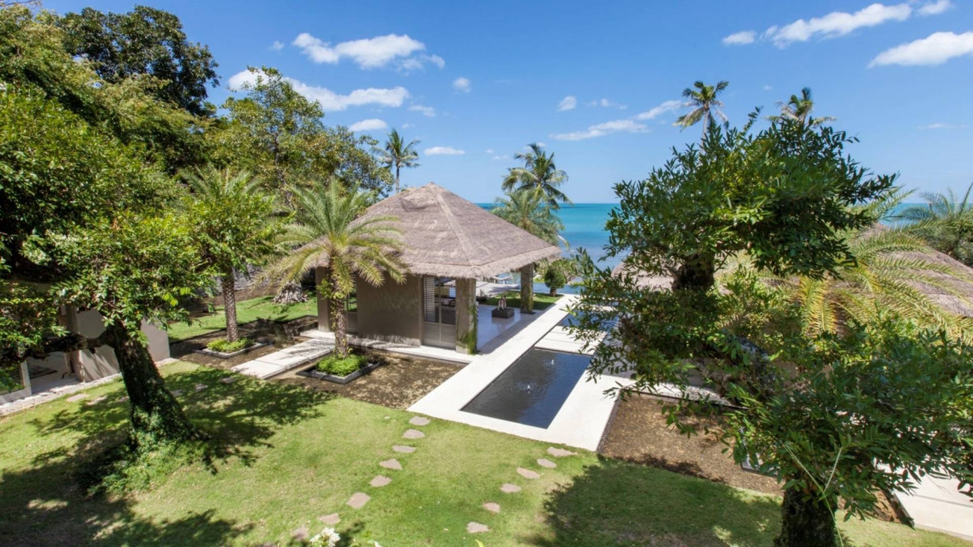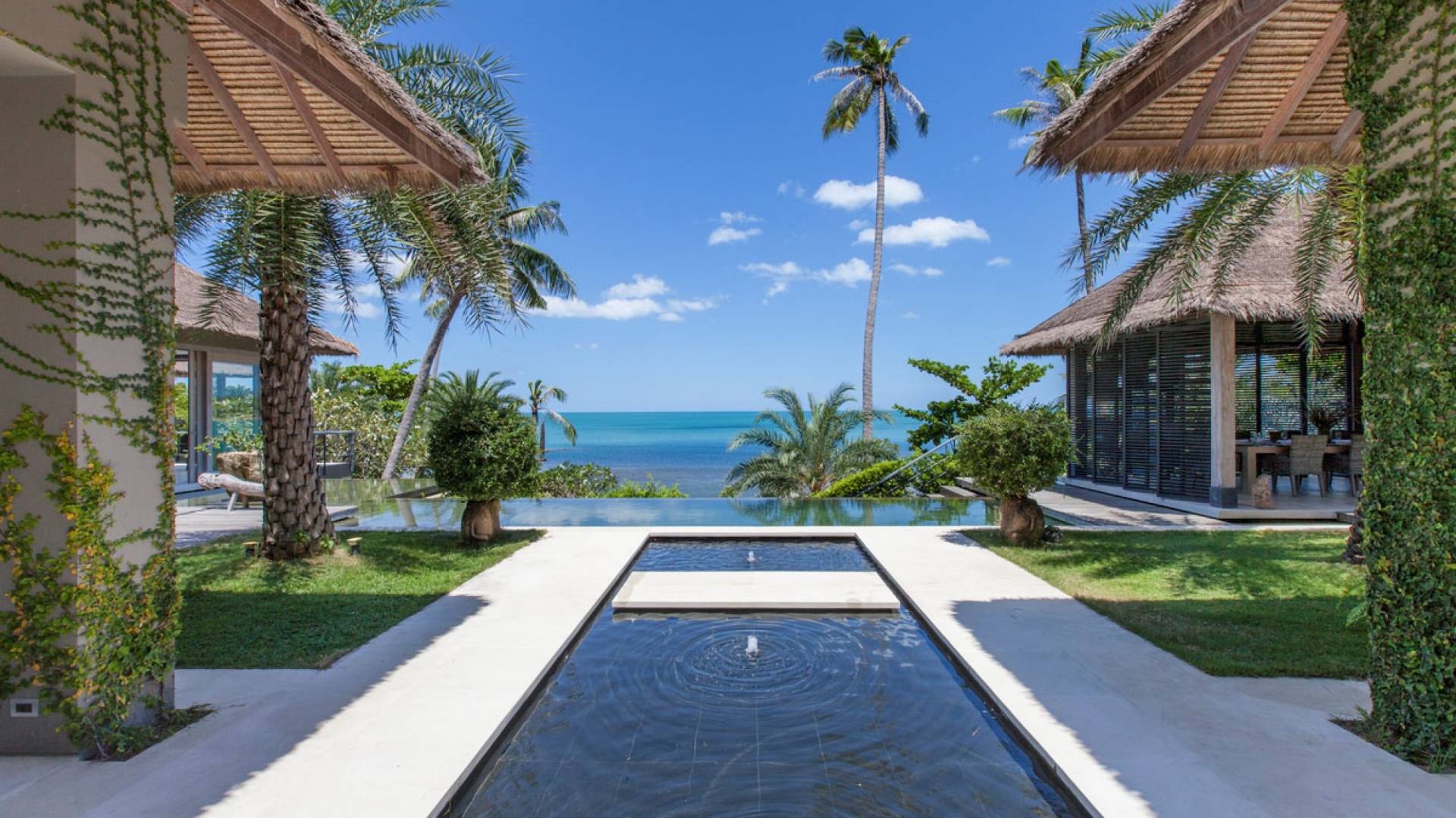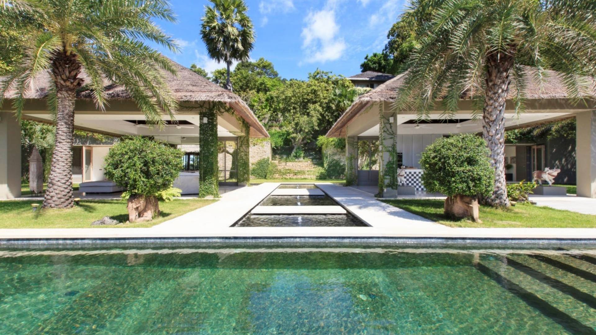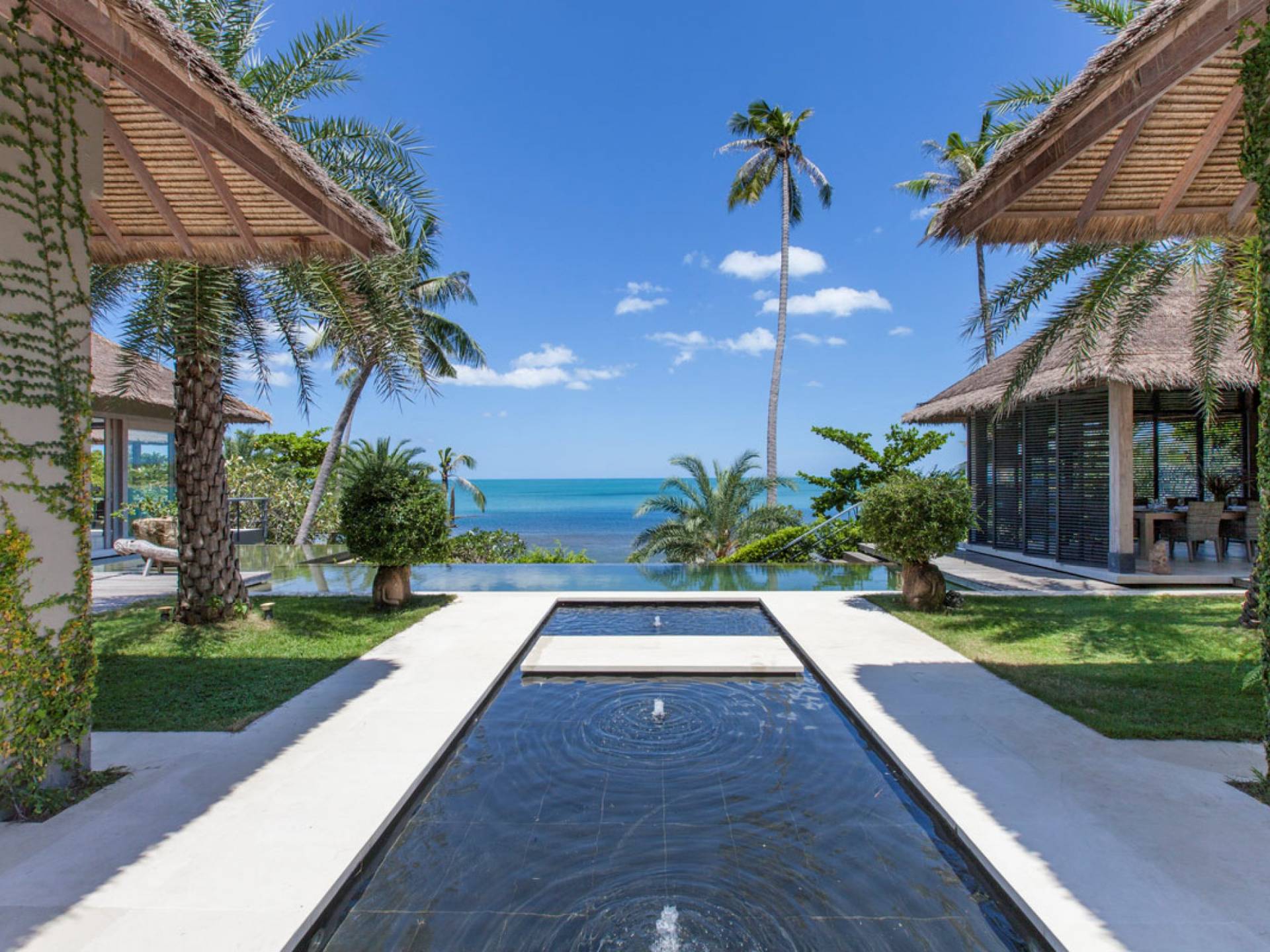 Également au même niveau, des chemins traversent des plans d'eau dans le jardin avec pelouse et se connectent à la cuisine, au salon et à la salle à manger, qui occupent tous leurs propres pavillons séparés au toit de chaume. Le salon est meublé d'un long canapé rembourré et d'une banquette-lit, la cuisine dispose d'un bar central pour le petit-déjeuner et les deux zones sont protégées des éléments par des stores automatisés. Le pavillon de salle à manger avec vue sur l'océan peut accueillir de 8 à 10 personnes et est entouré sur trois côtés de volets en bois à lattes qui pivotent pour profiter de la vue apaisante sur l'océan.