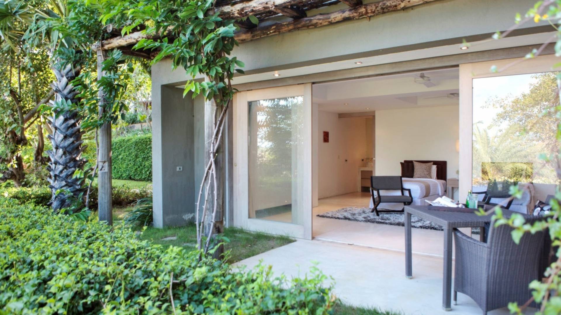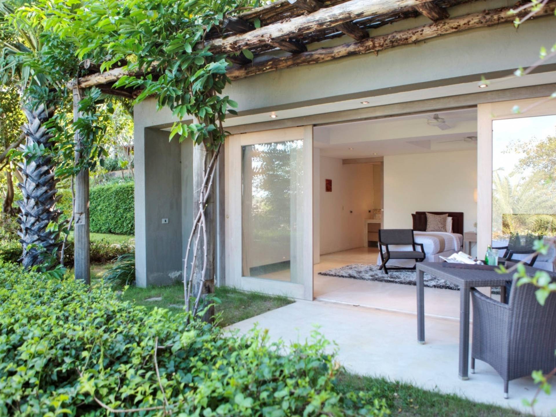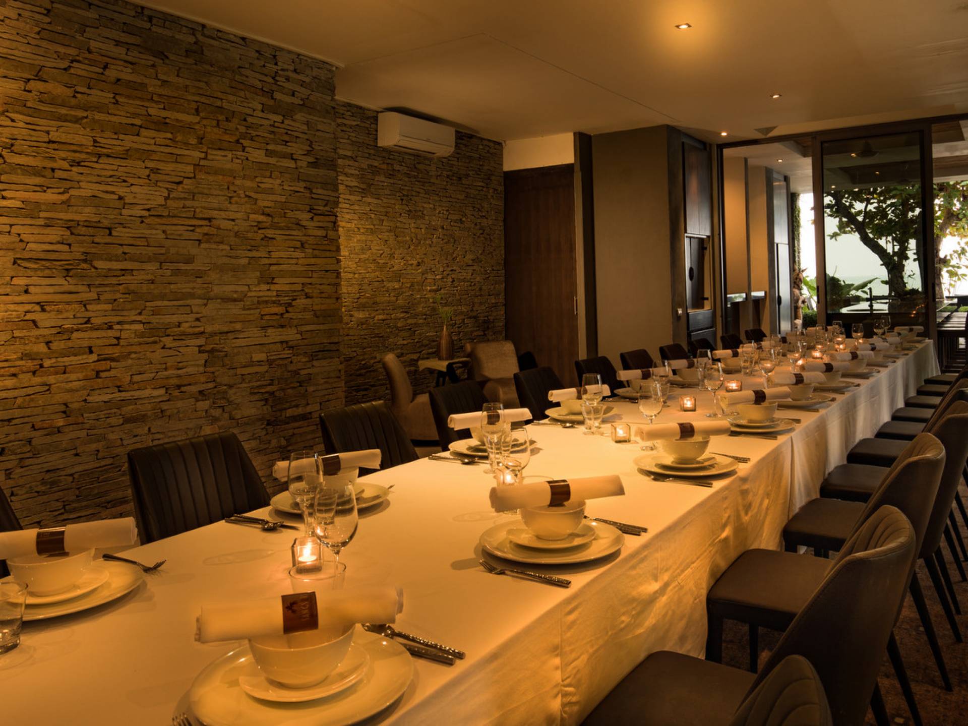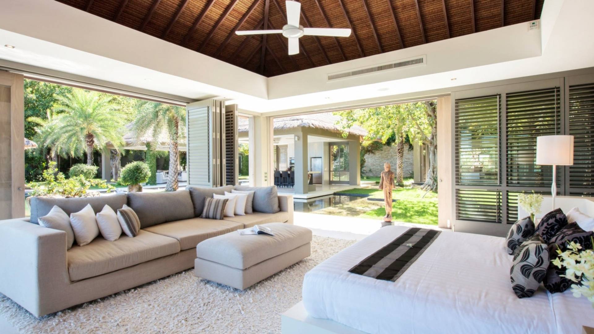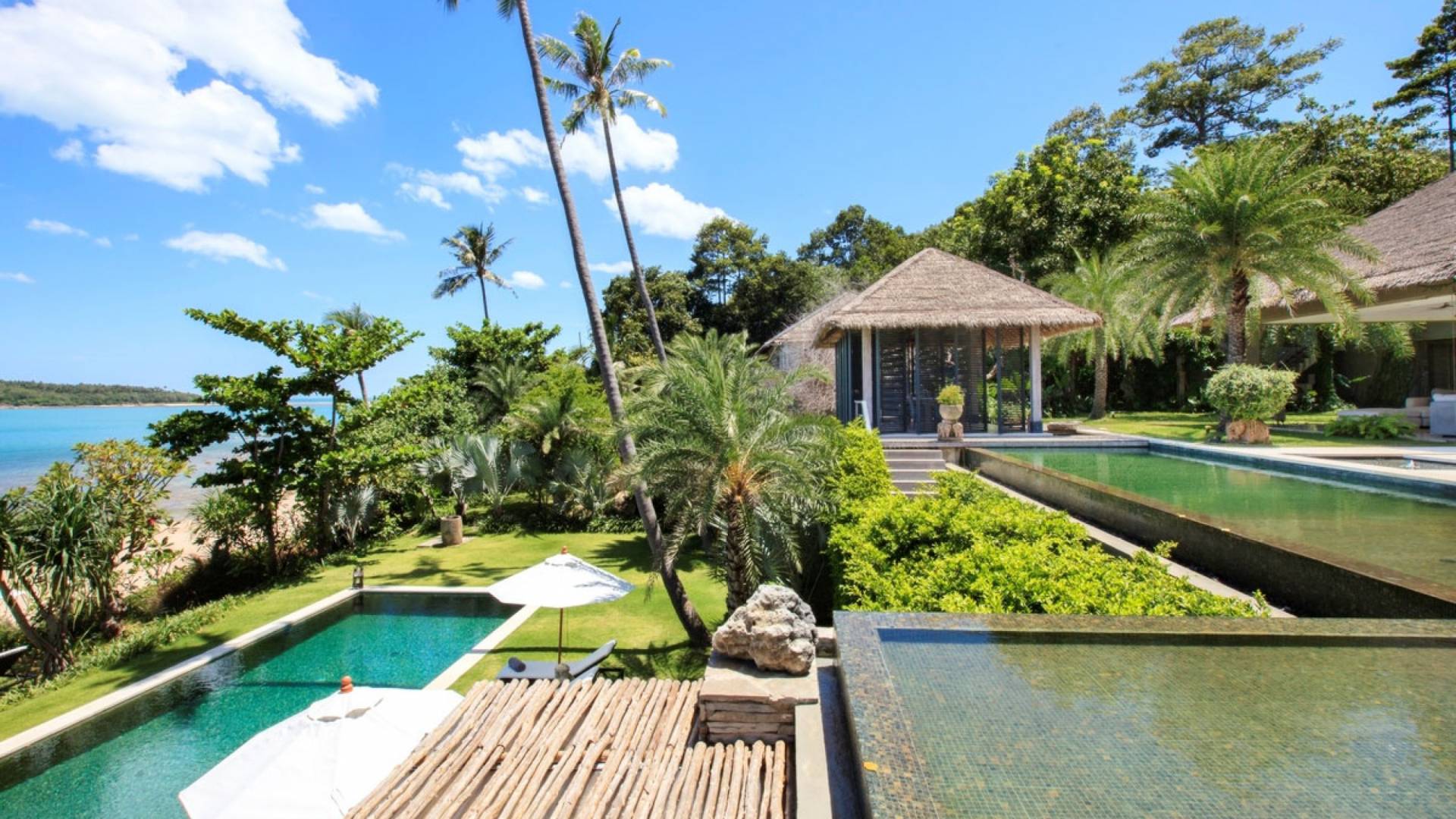 Également au même niveau, des chemins traversent des plans d'eau dans le jardin avec pelouse et se connectent à la cuisine, au salon et à la salle à manger, qui occupent tous leurs propres pavillons séparés au toit de chaume. Le salon est meublé d'un long canapé rembourré et d'une banquette-lit, la cuisine dispose d'un bar central pour le petit-déjeuner et les deux zones sont protégées des éléments par des stores automatisés. Le pavillon de salle à manger avec vue sur l'océan peut accueillir de 8 à 10 personnes et est entouré sur trois côtés de volets en bois à lattes qui pivotent pour profiter de la vue apaisante sur l'océan.