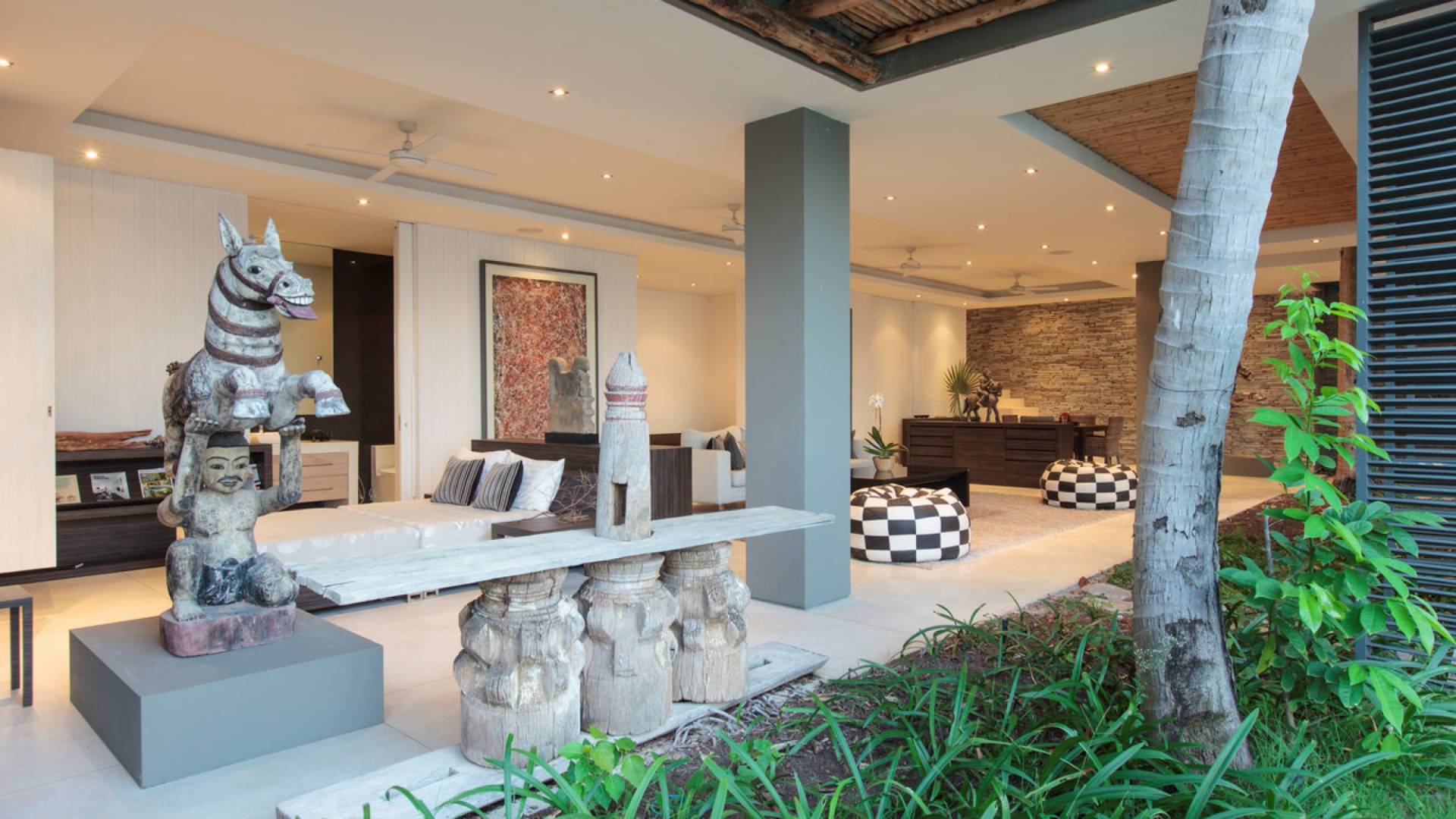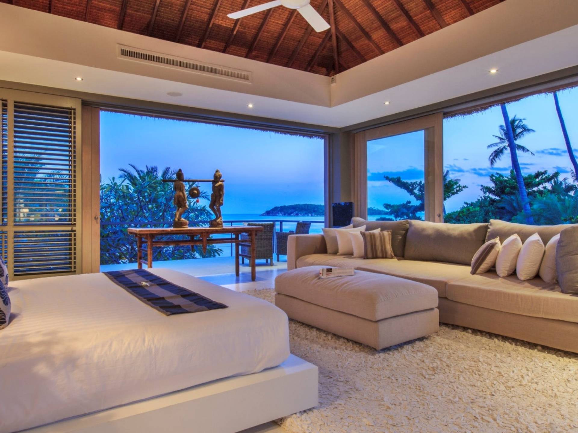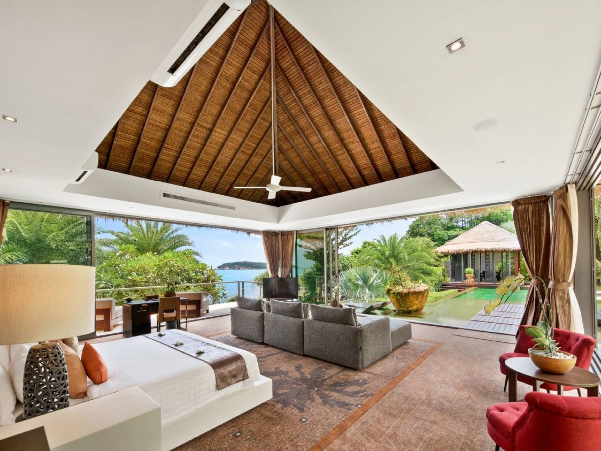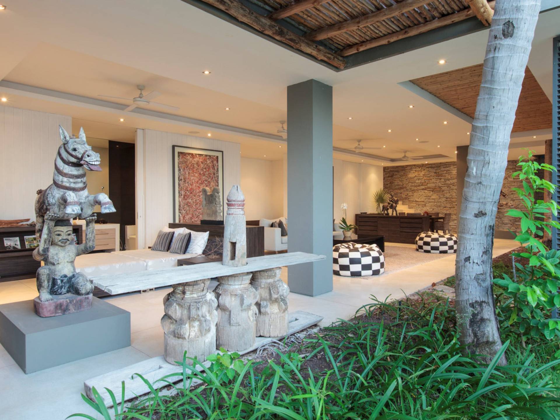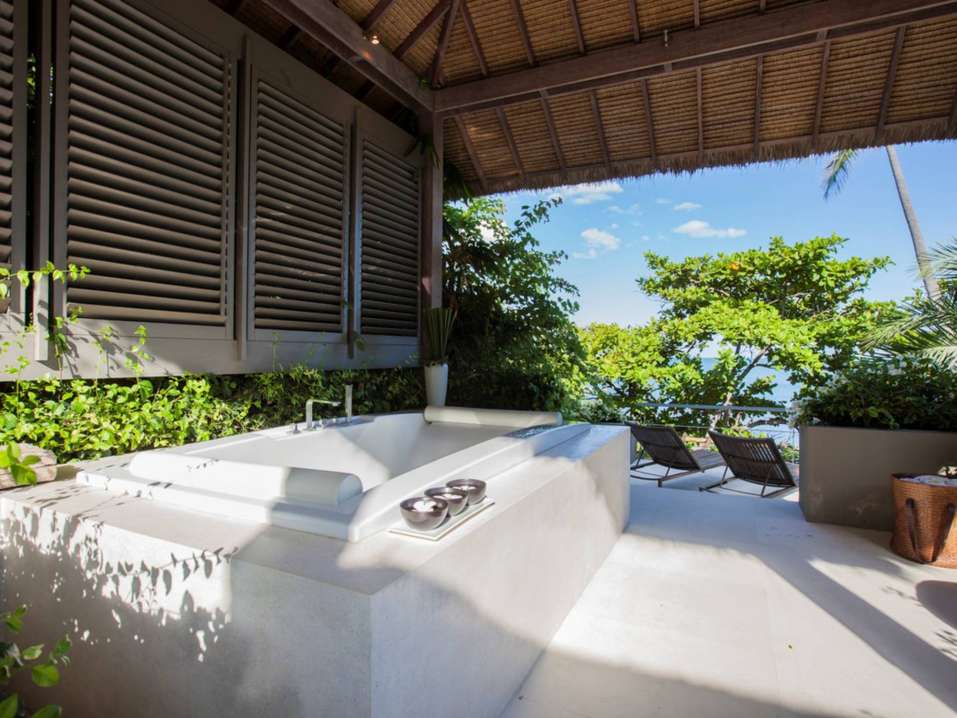 Également à ce niveau, un bassin profond à débordement fait face au pavillon de la chambre principale, ce dernier coulissant s'ouvrant sur trois côtés pour profiter de la vue imprenable. La suite comprend une chambre double de taille généreuse avec un canapé surdimensionné supplémentaire, des sculptures en bois balinaises anciennes et des œuvres d'art originales saisissantes, ainsi que de nombreux rangements intégrés dans un dressing et une salle de bains spacieuse. La suite principale s'ouvre sur une terrasse privée à l'arrière, dotée d'une immense baignoire extérieure et d'une terrasse ensoleillée privée isolée avec deux chaises longues donnant sur la plage.