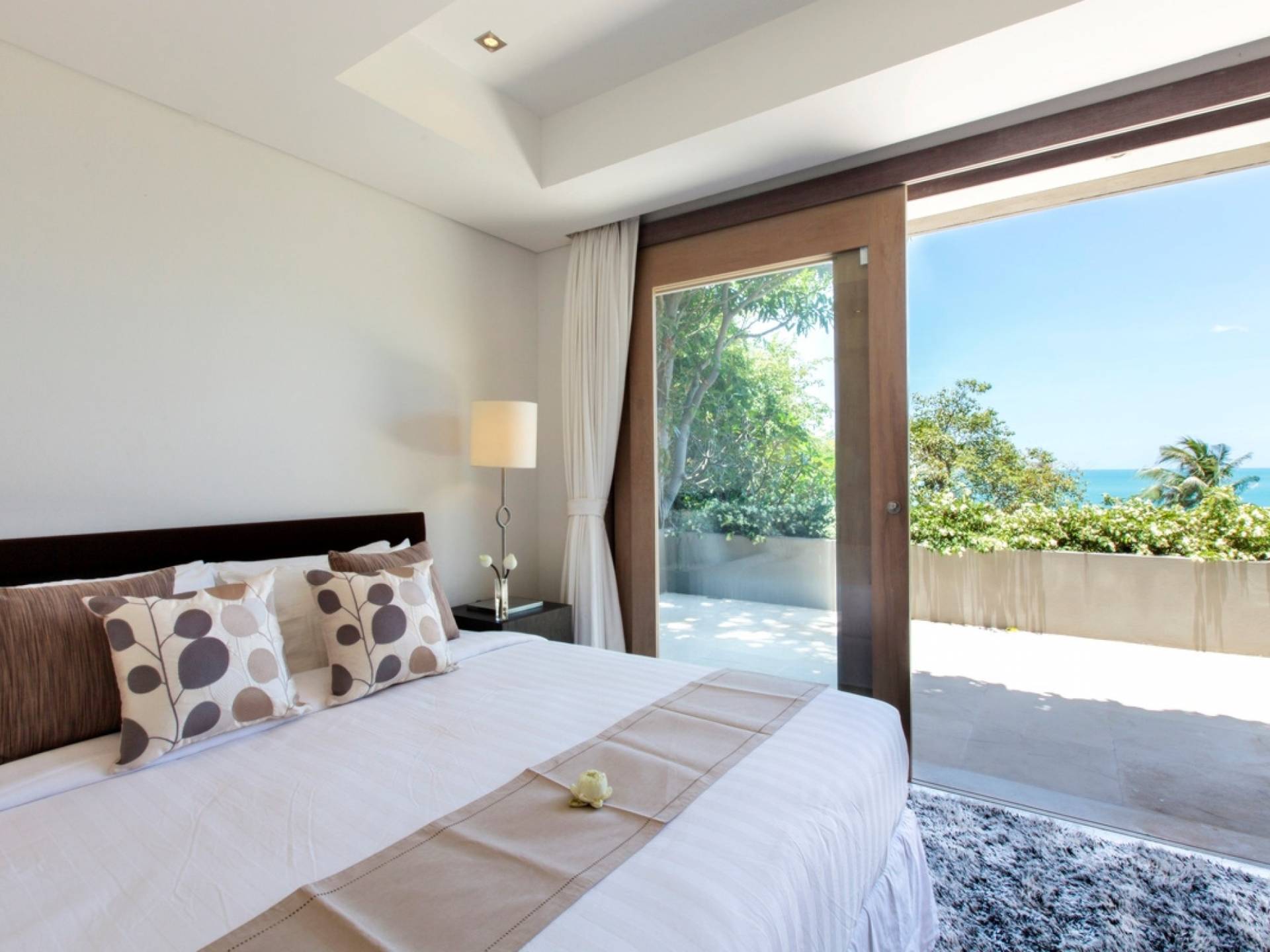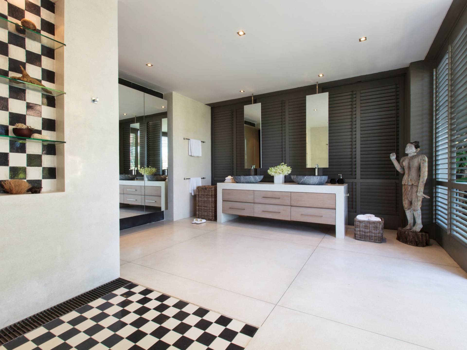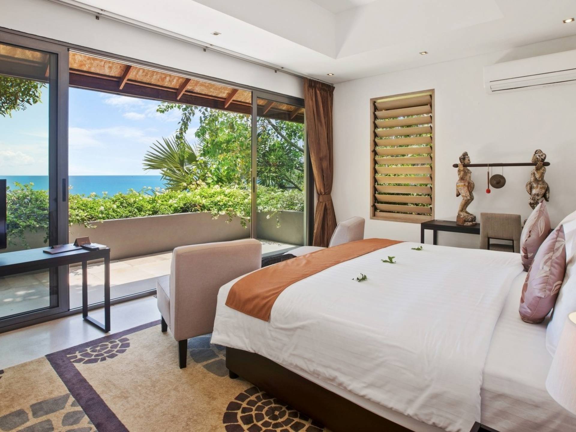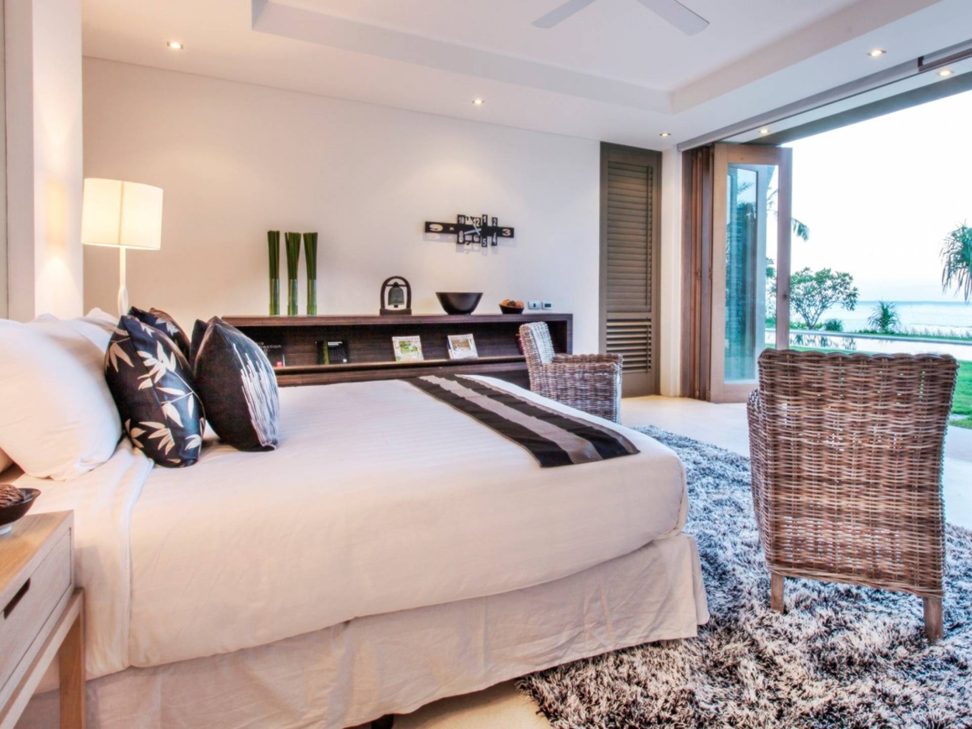 Également à ce niveau, un bassin profond à débordement fait face au pavillon de la chambre principale, ce dernier coulissant s'ouvrant sur trois côtés pour profiter de la vue imprenable. La suite comprend une chambre double de taille généreuse avec un canapé surdimensionné supplémentaire, des sculptures en bois balinaises anciennes et des œuvres d'art originales saisissantes, ainsi que de nombreux rangements intégrés dans un dressing et une salle de bains spacieuse. La suite principale s'ouvre sur une terrasse privée à l'arrière, dotée d'une immense baignoire extérieure et d'une terrasse ensoleillée privée isolée avec deux chaises longues donnant sur la plage.