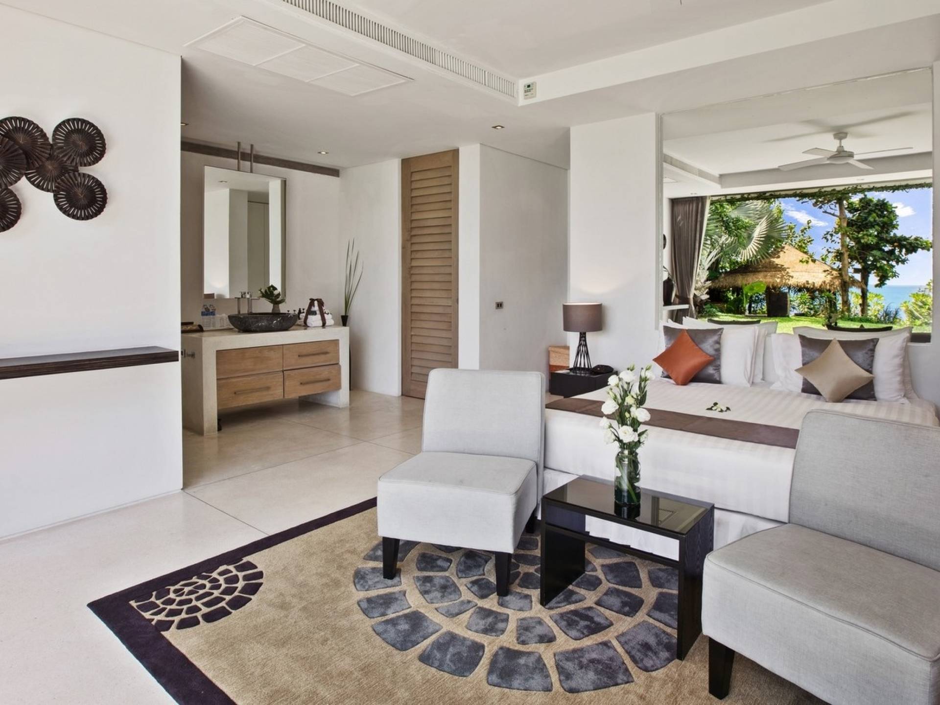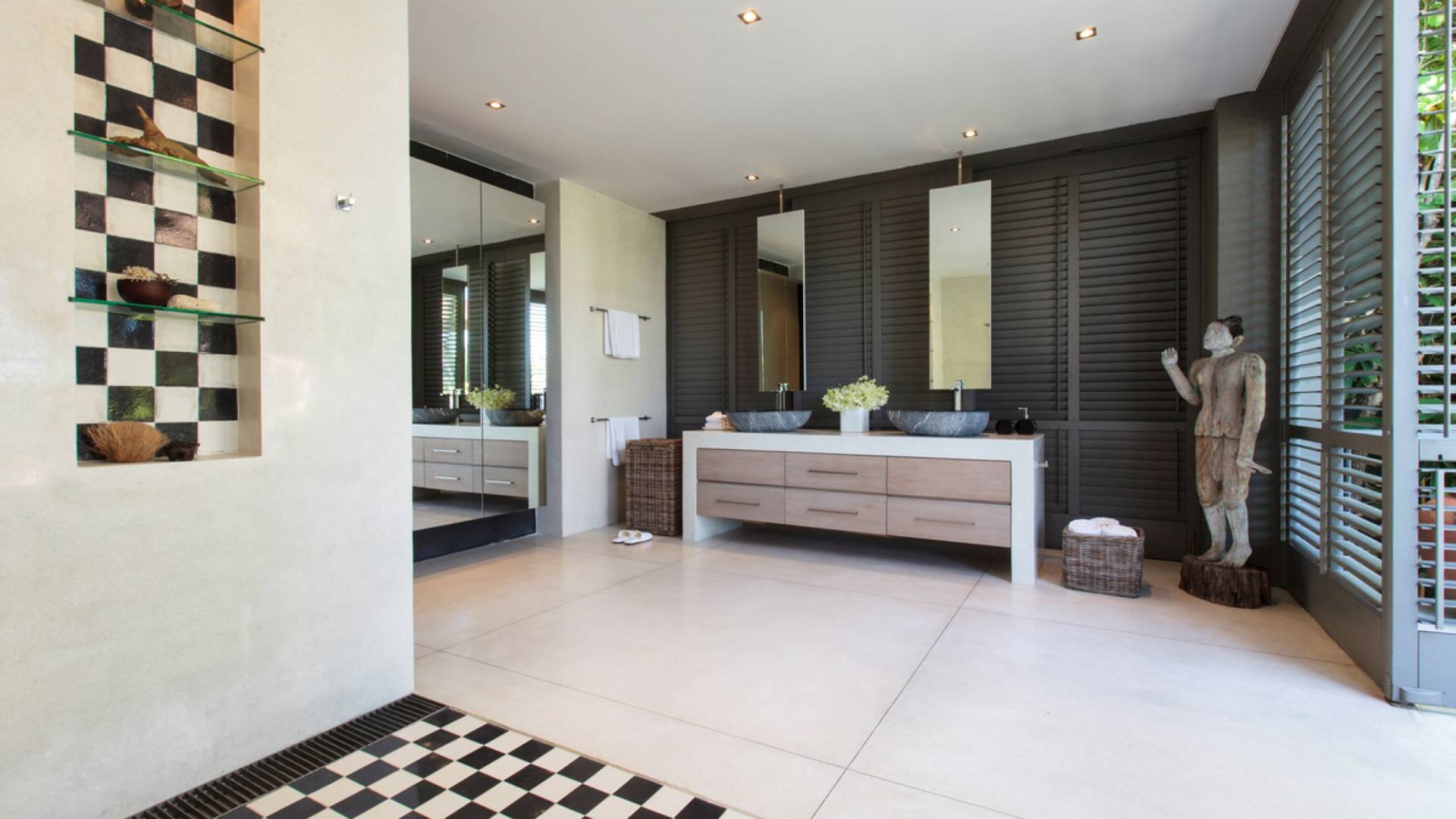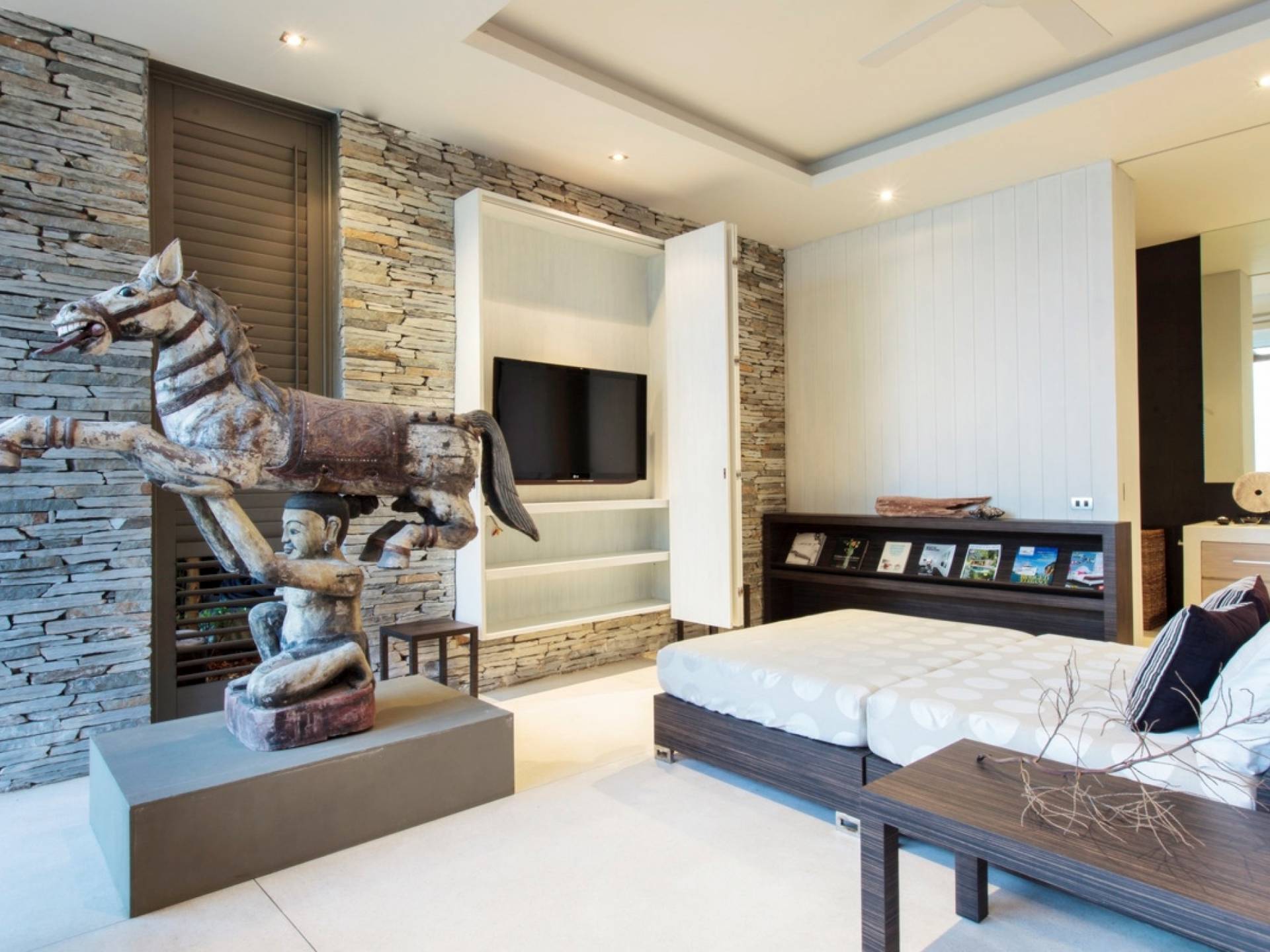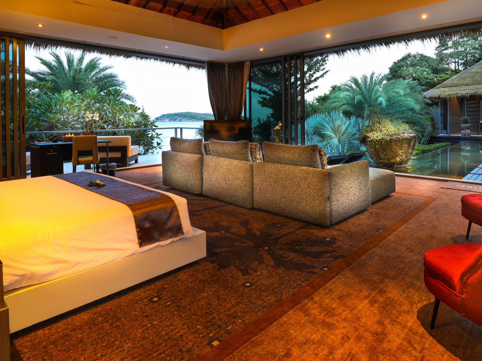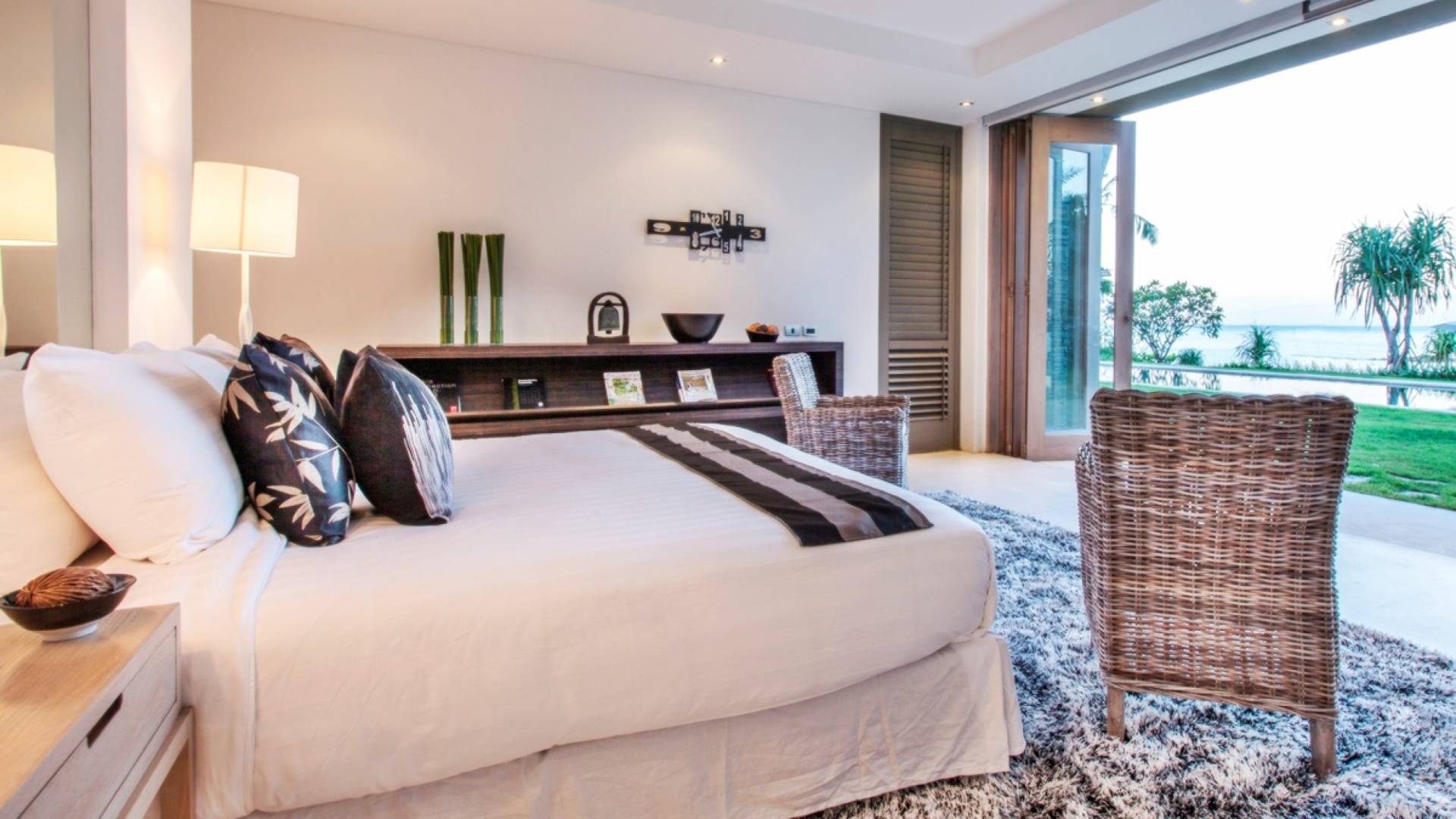 Également à ce niveau, un bassin profond à débordement fait face au pavillon de la chambre principale, ce dernier coulissant s'ouvrant sur trois côtés pour profiter de la vue imprenable. La suite comprend une chambre double de taille généreuse avec un canapé surdimensionné supplémentaire, des sculptures en bois balinaises anciennes et des œuvres d'art originales saisissantes, ainsi que de nombreux rangements intégrés dans un dressing et une salle de bains spacieuse. La suite principale s'ouvre sur une terrasse privée à l'arrière, dotée d'une immense baignoire extérieure et d'une terrasse ensoleillée privée isolée avec deux chaises longues donnant sur la plage.