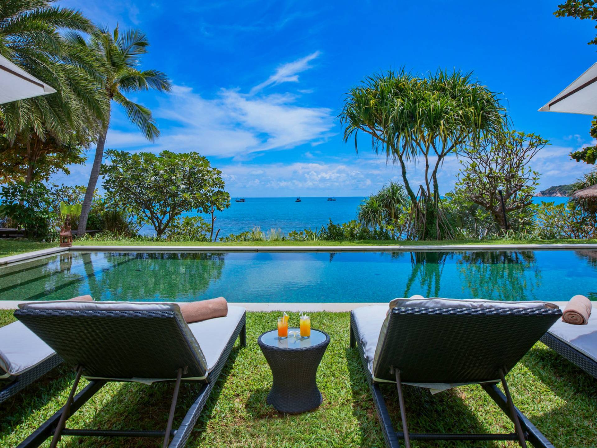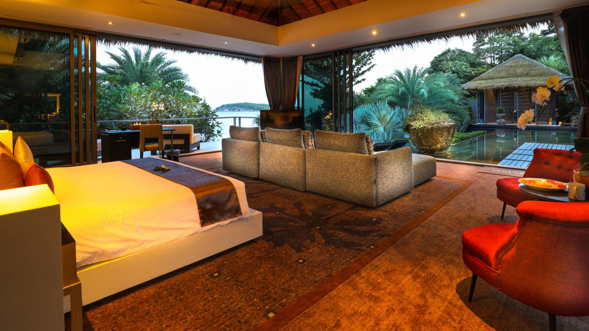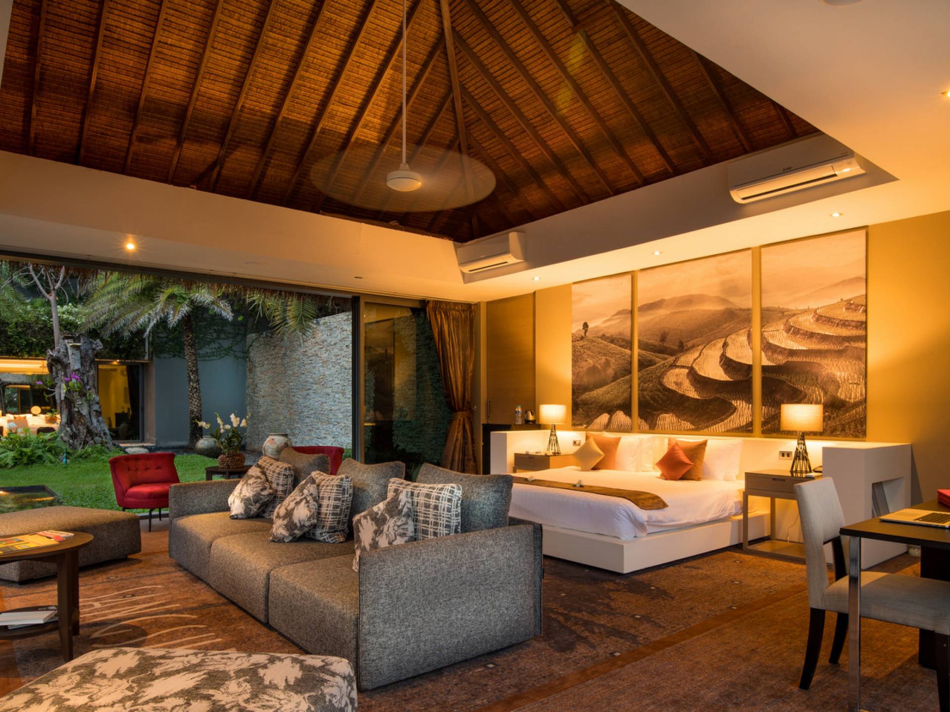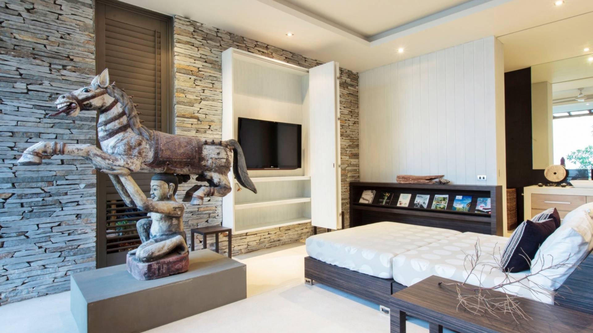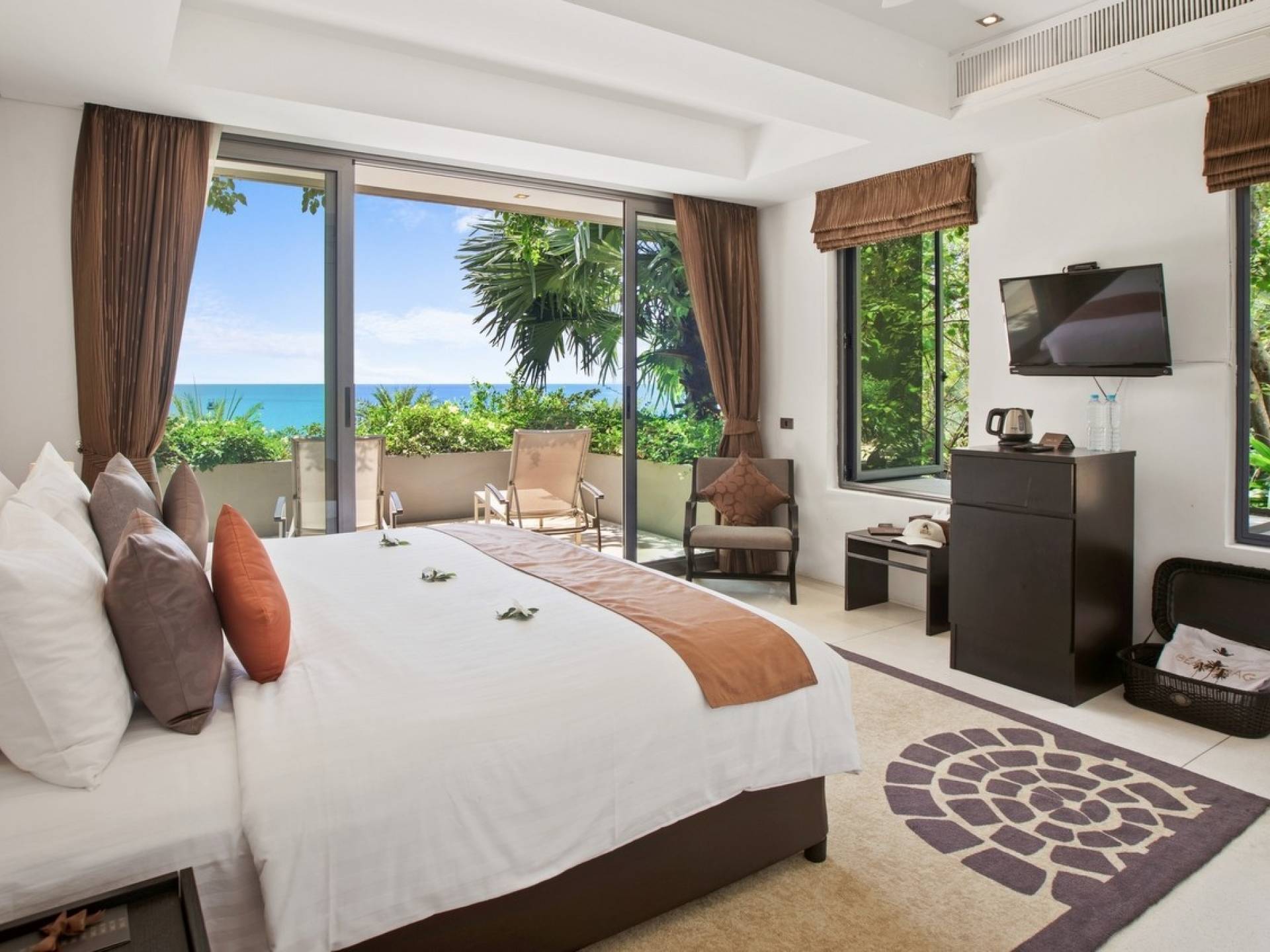 Également à ce niveau, un bassin profond à débordement fait face au pavillon de la chambre principale, ce dernier coulissant s'ouvrant sur trois côtés pour profiter de la vue imprenable. La suite comprend une chambre double de taille généreuse avec un canapé surdimensionné supplémentaire, des sculptures en bois balinaises anciennes et des œuvres d'art originales saisissantes, ainsi que de nombreux rangements intégrés dans un dressing et une salle de bains spacieuse. La suite principale s'ouvre sur une terrasse privée à l'arrière, dotée d'une immense baignoire extérieure et d'une terrasse ensoleillée privée isolée avec deux chaises longues donnant sur la plage.