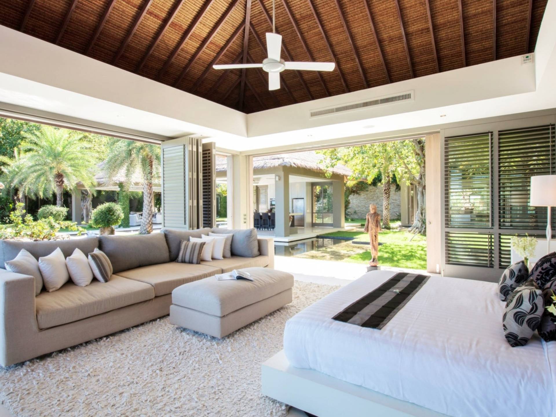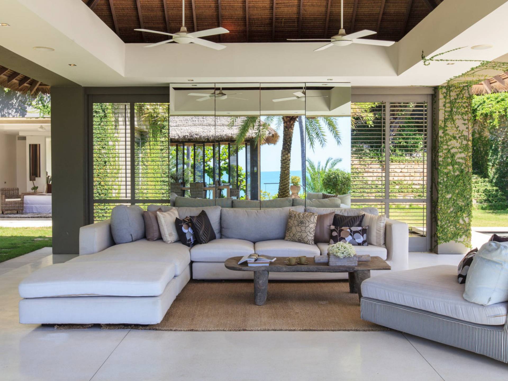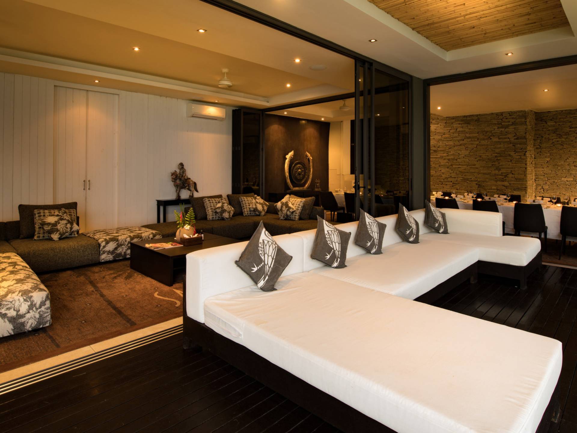 Des escaliers intérieurs mènent directement de l'intérieur de la suite principale à un grand salon de jour au niveau inférieur de la villa, également accessible par des marches à côté du pavillon de la salle à manger et placé à côté de la deuxième piscine plus grande de la villa (21 mètres). Le confortable coin salon couvert est meublé d'un canapé et d'un lit de repos propice à la détente. Il y a une salle de bain pour invités, une deuxième cuisine et un espace barbecue dans cette partie de la villa, cette dernière servant une table à manger extérieure de 10 places sur une terrasse juste à côté de la plage. La terrasse s'étend le long du front de mer et abrite un lit de repos confortable avec des marches descendant dans une immense piscine jacuzzi au bord de la plage.
