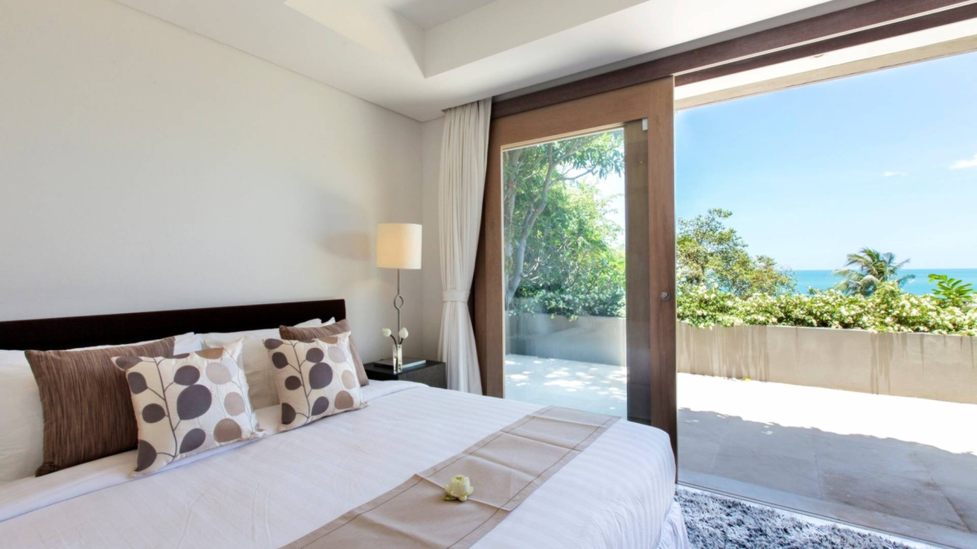 Une chambre d'amis double occupe le rez-de-chaussée du même bâtiment et s'ouvre sur sa propre terrasse privée avec vue sur l'océan avec une salle de bain attenante à l'arrière. Les escaliers à l'intérieur de la chambre se connectent à un sous-sol, qui abrite une spacieuse chambre lits jumeaux idéale pour les enfants plus âgés avec son propre dressing et sa douche attenante.