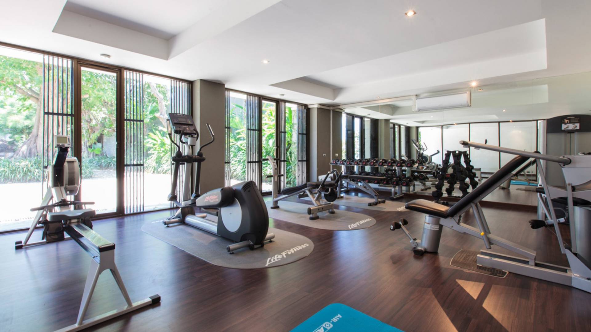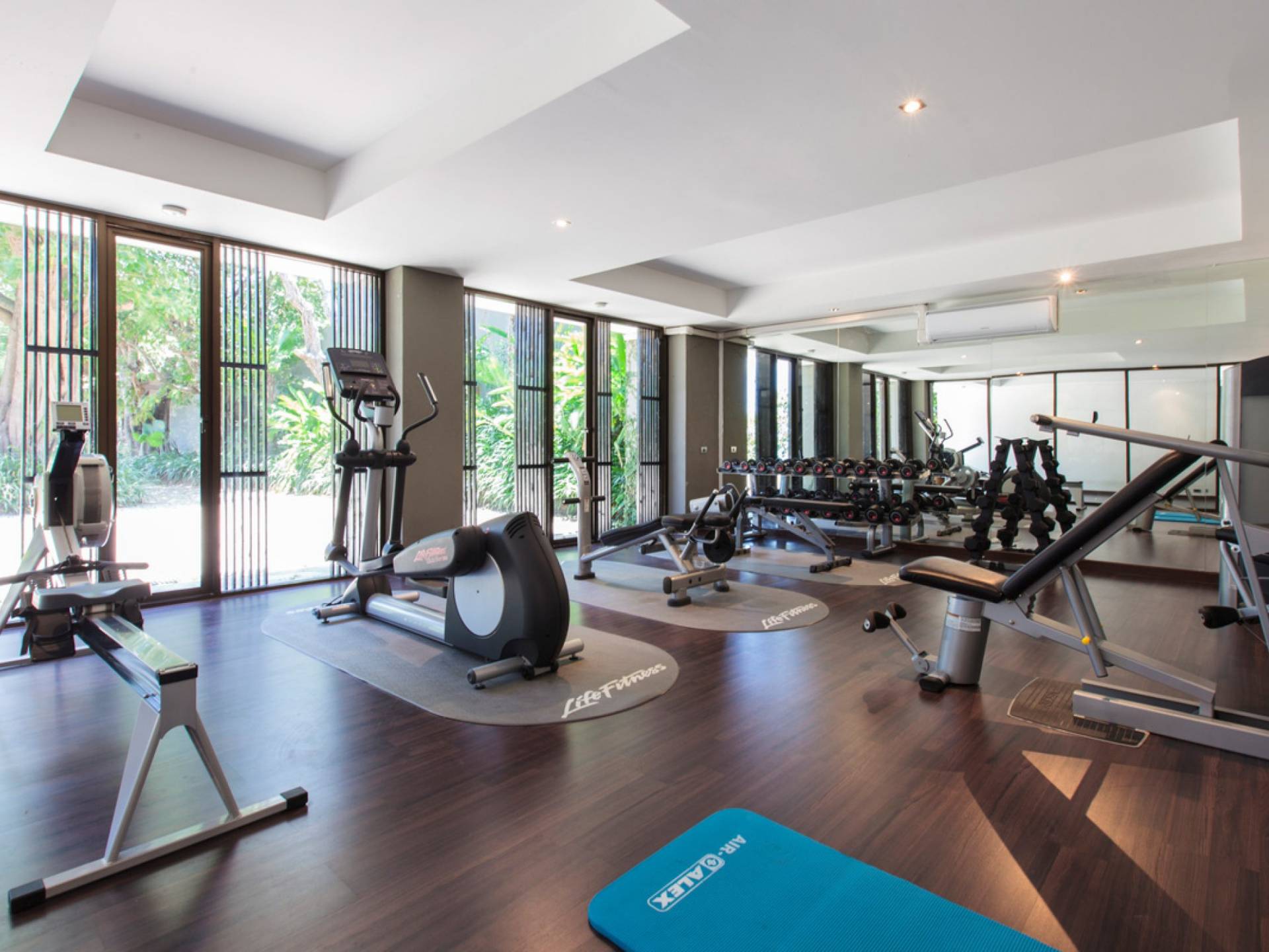 Un portail télécommandé presque caché s'ouvre sur une allée privée en gravier qui dessert à la fois la Villa Sangsuri 2 et la Villa Sangsuri 3, avec un espace pour plusieurs voitures pour se garer et une zone désignée pour le gardien de sécurité de nuit. Le trajet mène également au seul pavillon à plusieurs étages de la villa, qui abrite les logements du personnel à l'étage et une salle de sport spacieuse au rez-de-chaussée équipée d'équipements Life Fitness® pour le cardio et le travail musculaire.