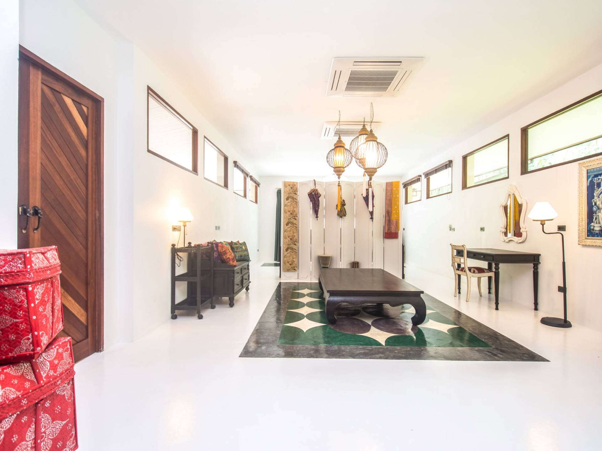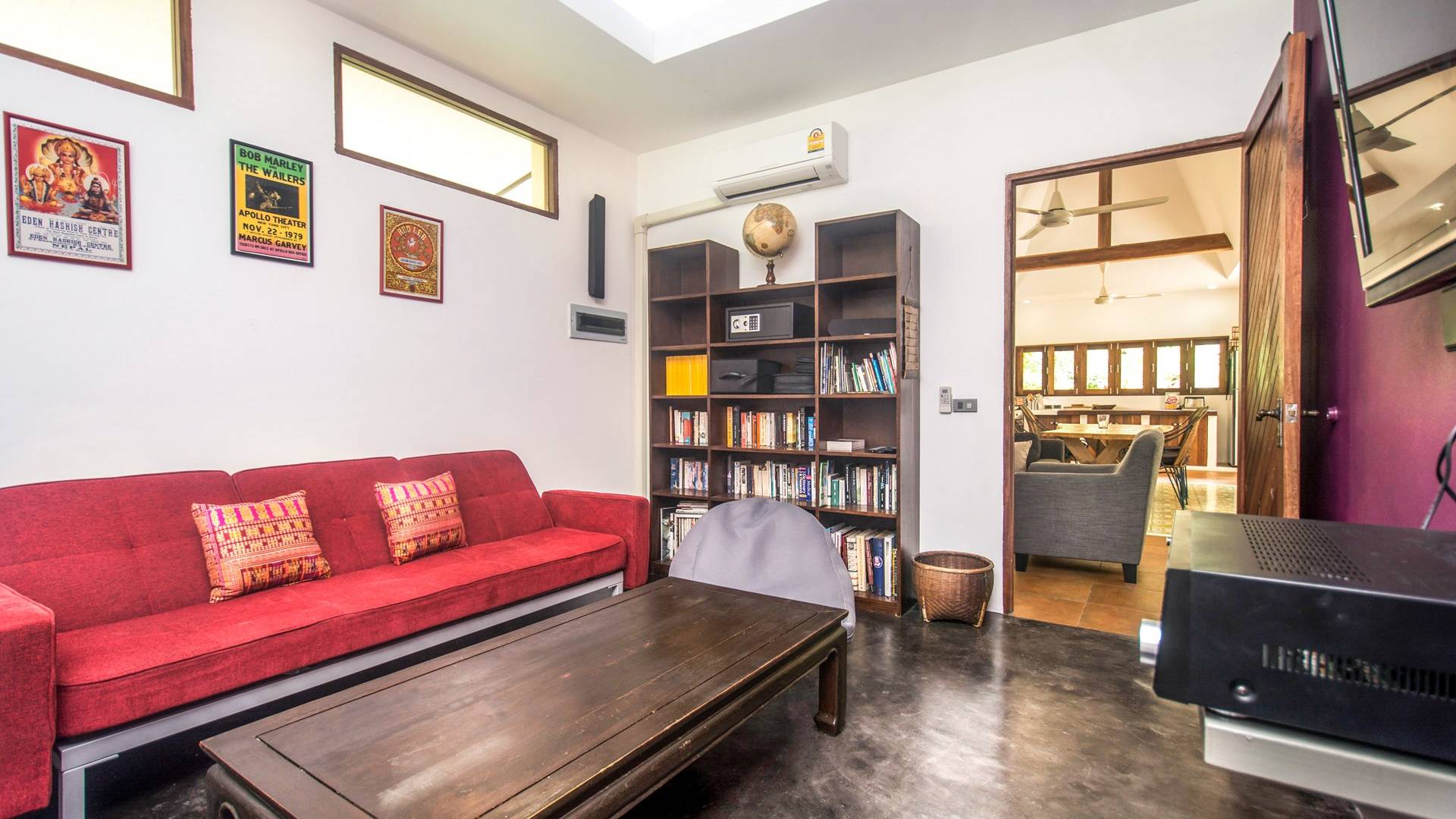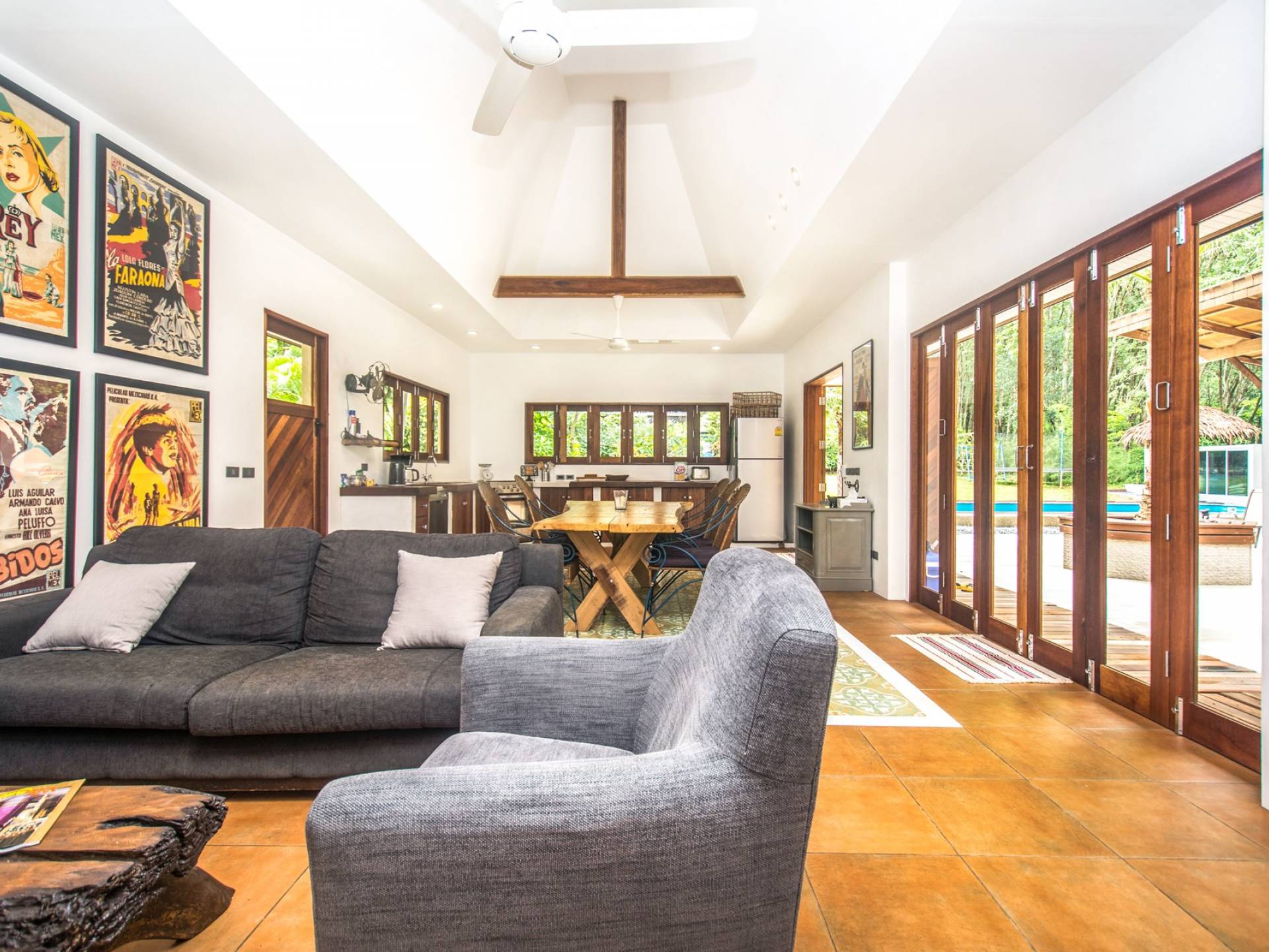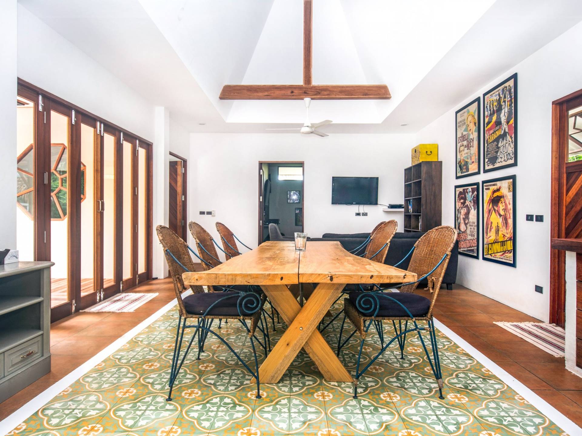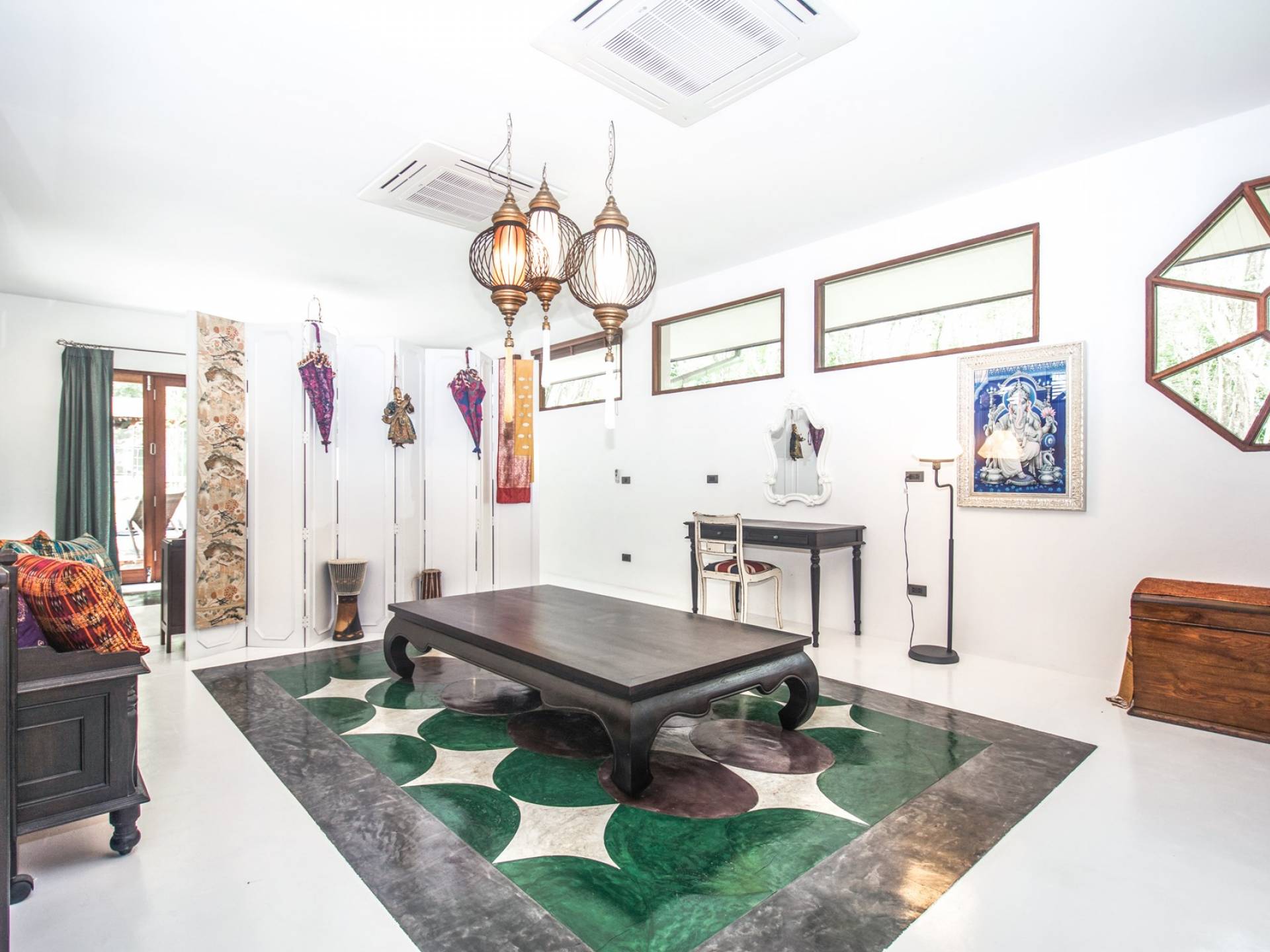 Une porte du salon mène au cinéma et à la salle de jeux. Choisissez votre musique, livre, film ou jeu préféré et évadez-vous dans votre maison de vacances, entièrement climatisée pour votre confort. La cuisine et le salon s'ouvrent sur une grande cour avec un espace couvert. Équipé d'un réfrigérateur, d'un évier, de tables et de sièges confortables pour se détendre, manger et boire. Pour se détendre tranquillement dans la nature, il y a la salle de yoga. Une sala artistique et rustique où vous pourrez passer du temps sous le toit de chaume traditionnel en profitant du climat tropical sous le chaud soleil ou sous une pluie rafraîchissante.