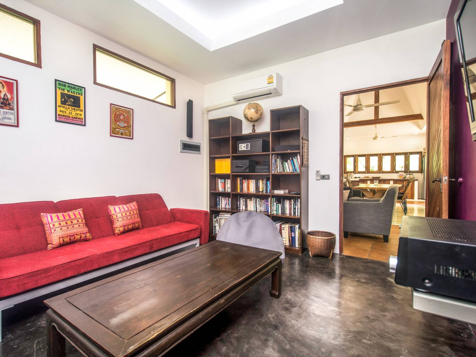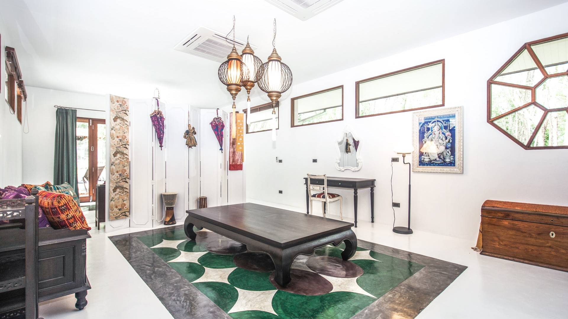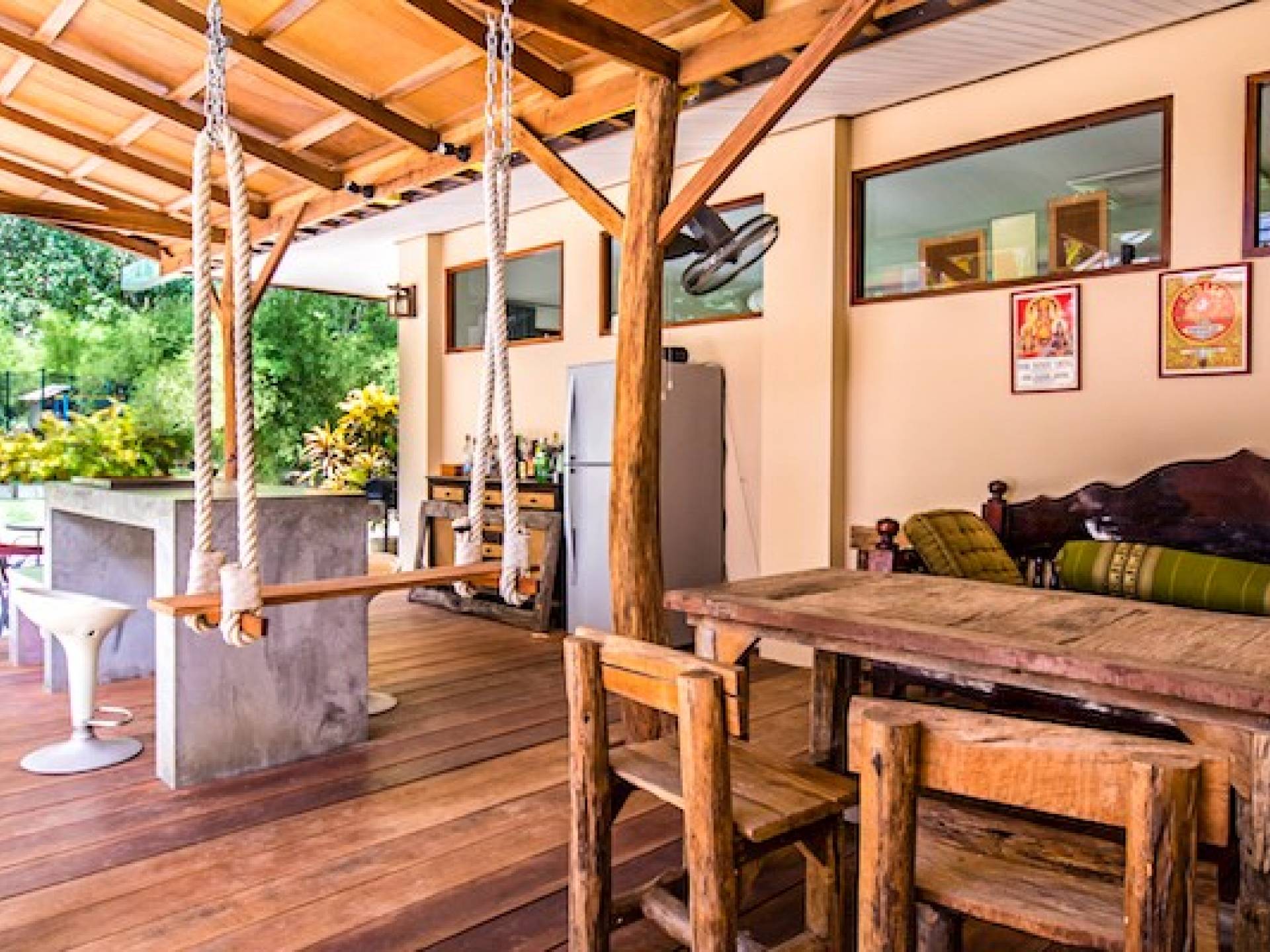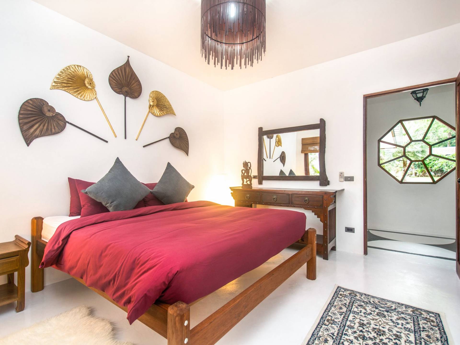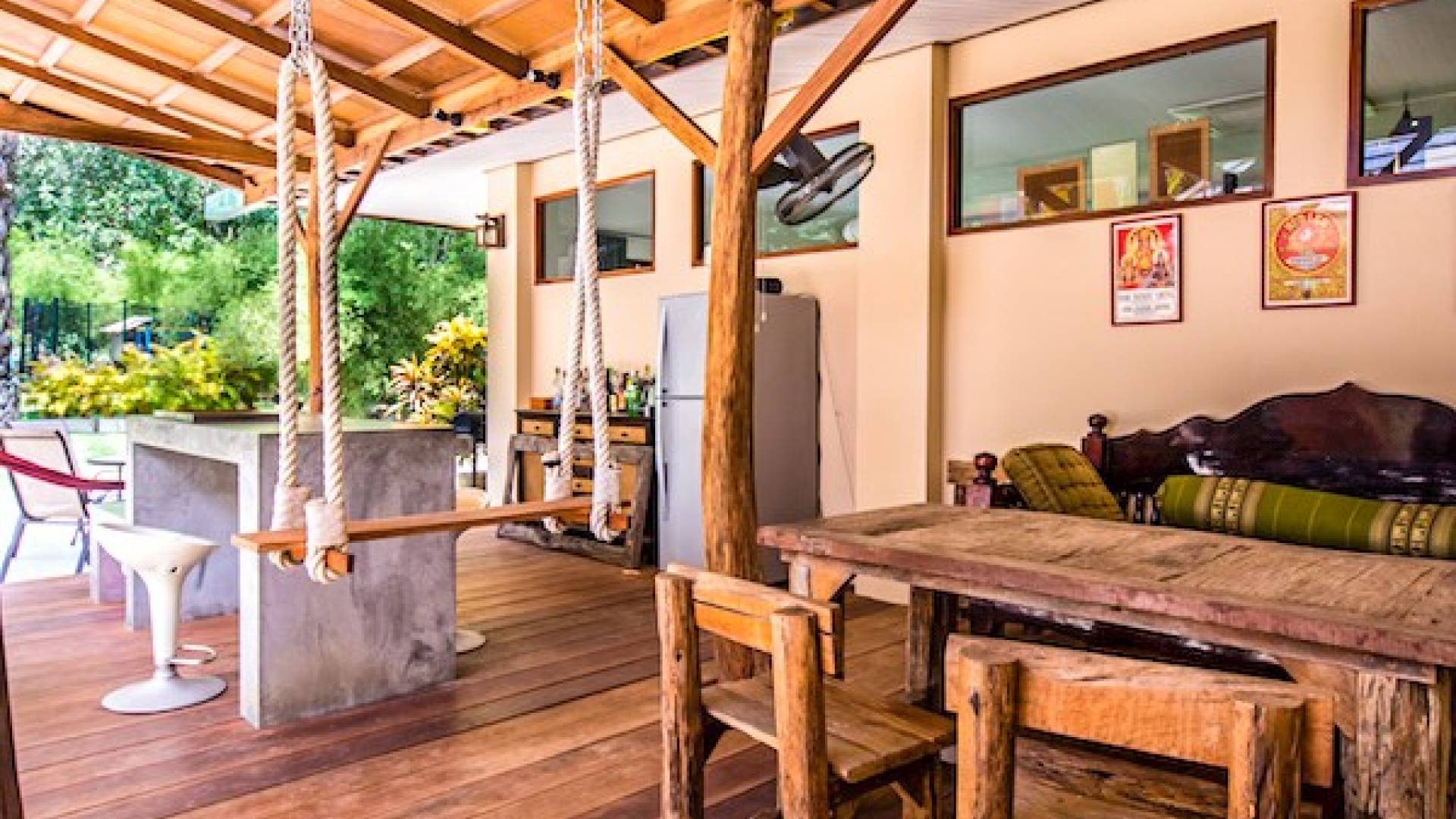 Une porte du salon mène au cinéma et à la salle de jeux. Choisissez votre musique, livre, film ou jeu préféré et évadez-vous dans votre maison de vacances, entièrement climatisée pour votre confort. La cuisine et le salon s'ouvrent sur une grande cour avec un espace couvert. Équipé d'un réfrigérateur, d'un évier, de tables et de sièges confortables pour se détendre, manger et boire. Pour se détendre tranquillement dans la nature, il y a la salle de yoga. Une sala artistique et rustique où vous pourrez passer du temps sous le toit de chaume traditionnel en profitant du climat tropical sous le chaud soleil ou sous une pluie rafraîchissante.
