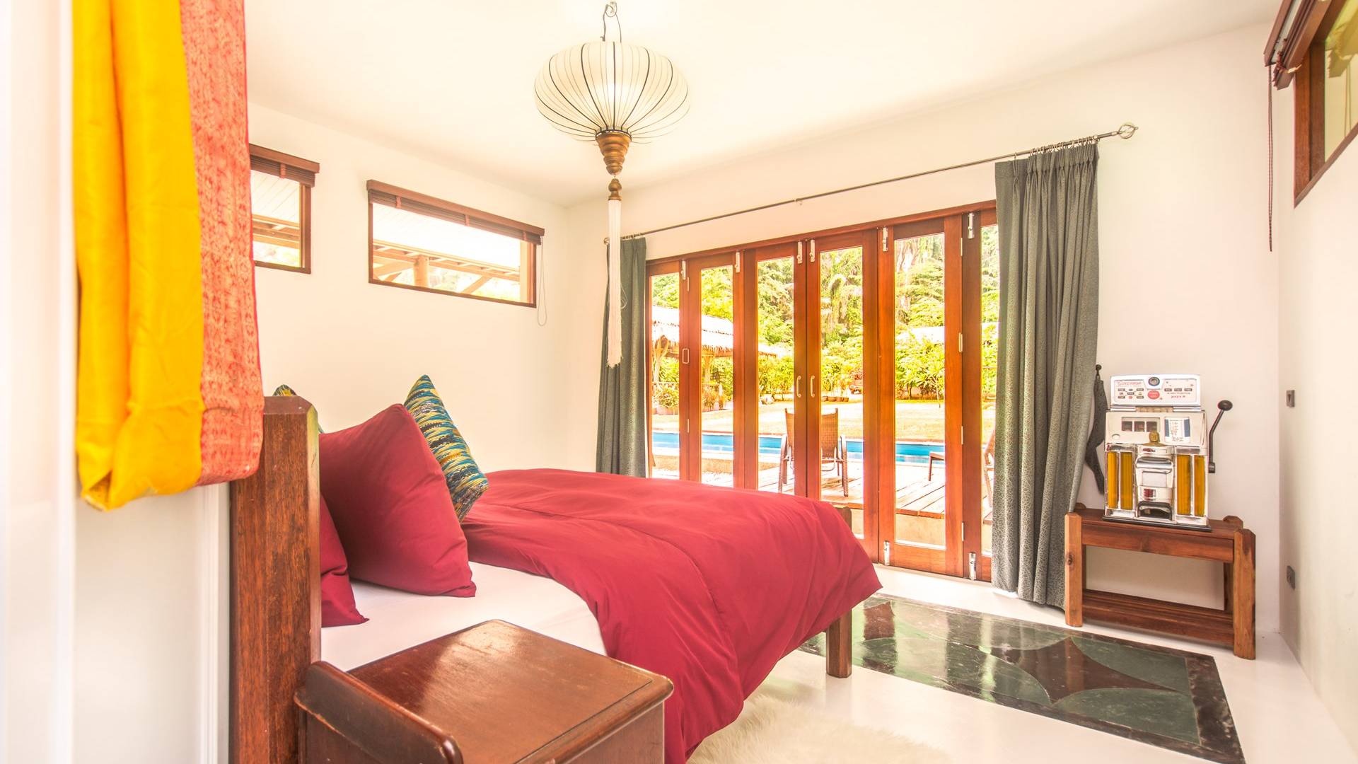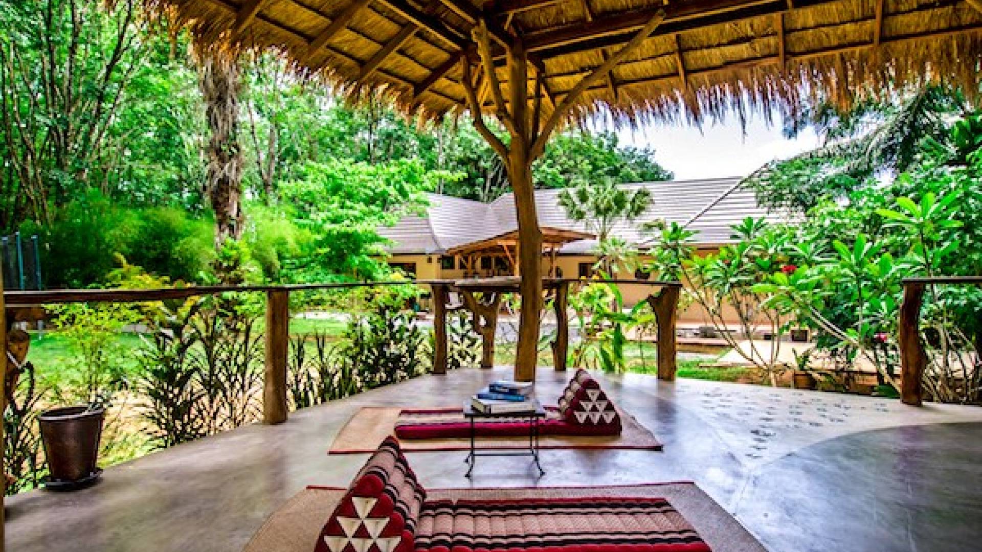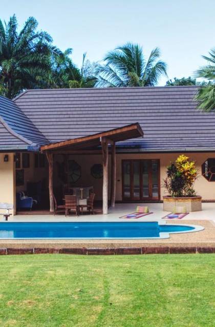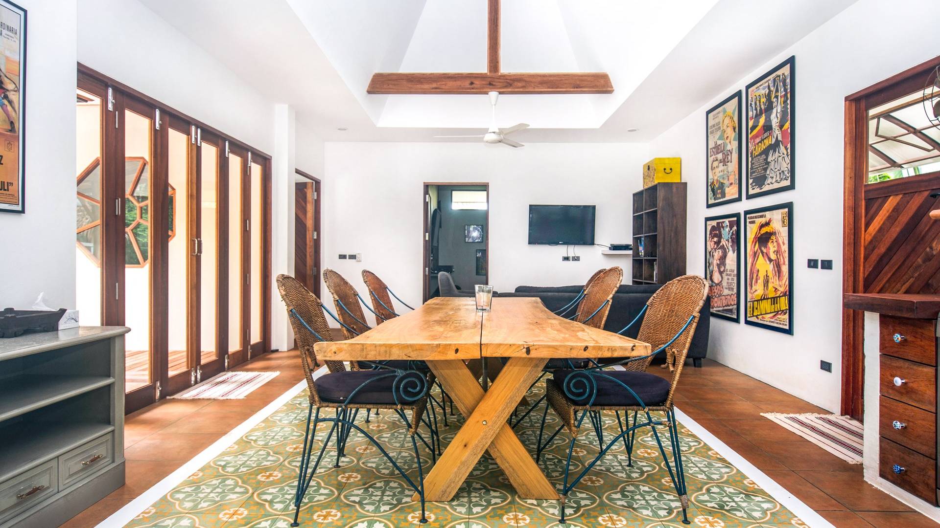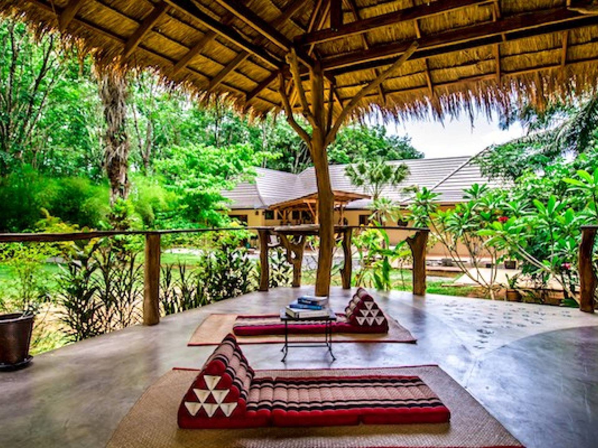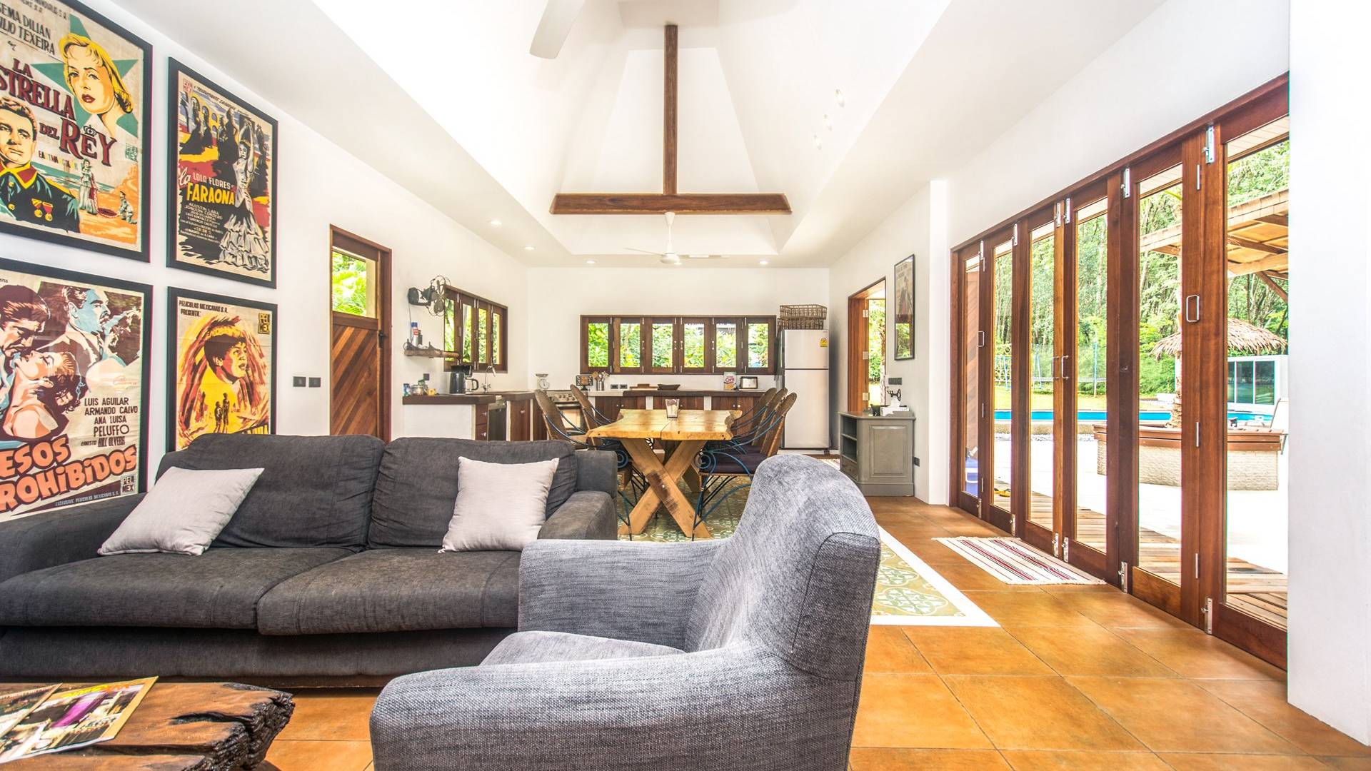 Une porte du salon mène au cinéma et à la salle de jeux. Choisissez votre musique, livre, film ou jeu préféré et évadez-vous dans votre maison de vacances, entièrement climatisée pour votre confort. La cuisine et le salon s'ouvrent sur une grande cour avec un espace couvert. Équipé d'un réfrigérateur, d'un évier, de tables et de sièges confortables pour se détendre, manger et boire. Pour se détendre tranquillement dans la nature, il y a la salle de yoga. Une sala artistique et rustique où vous pourrez passer du temps sous le toit de chaume traditionnel en profitant du climat tropical sous le chaud soleil ou sous une pluie rafraîchissante.