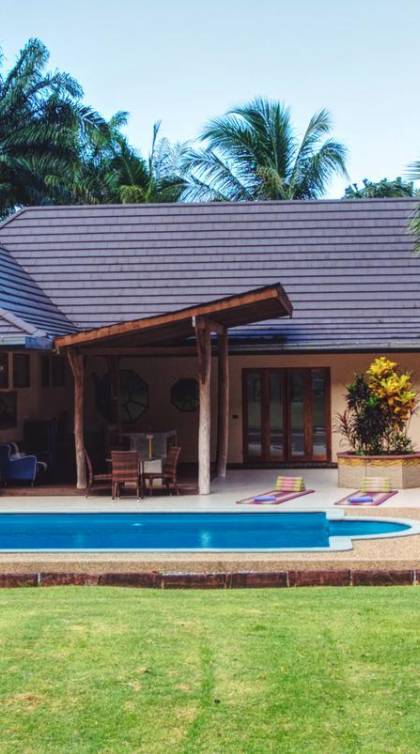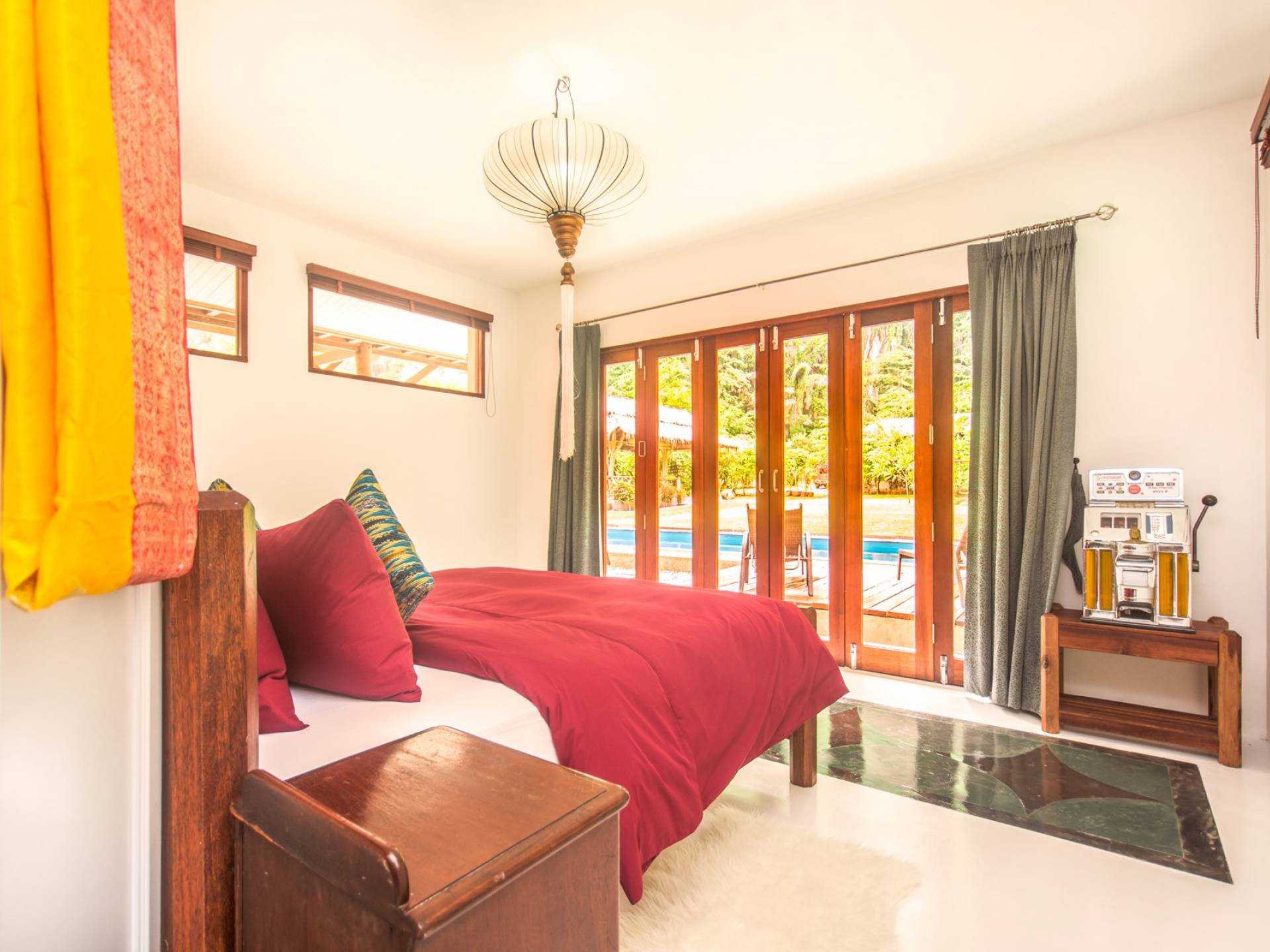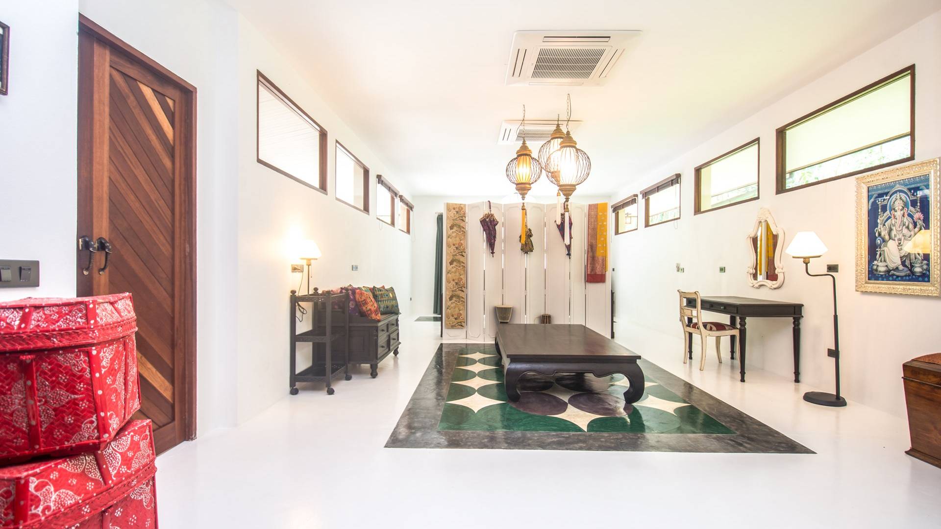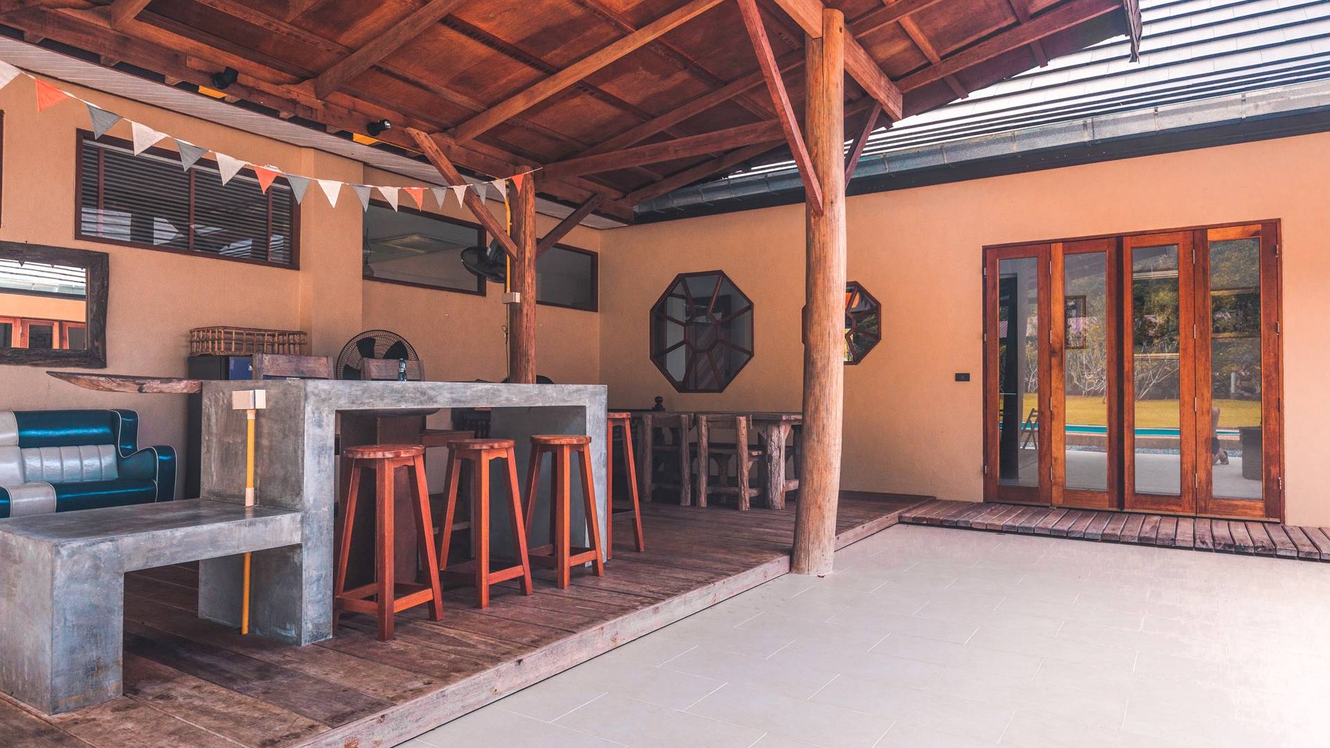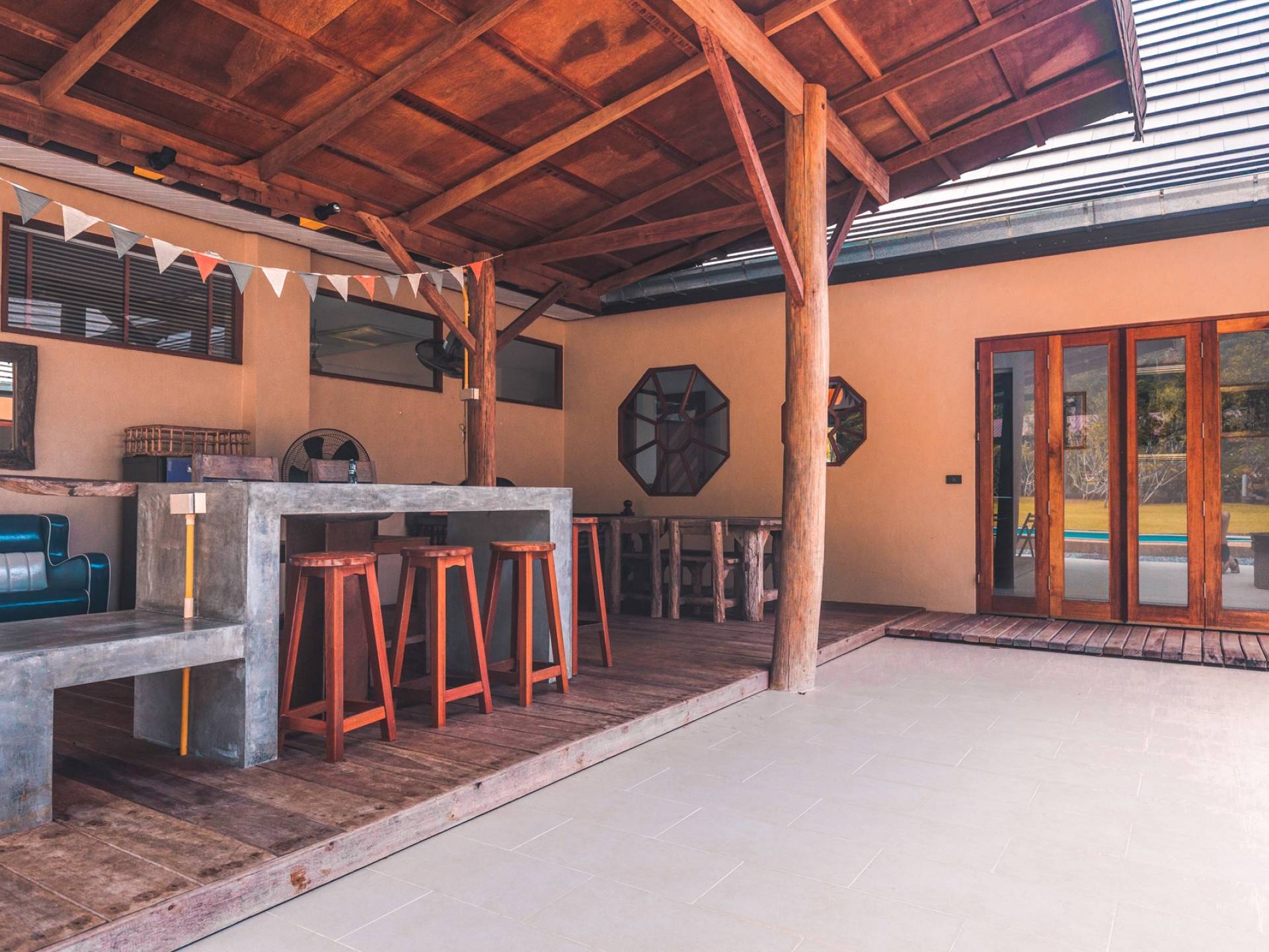 Une porte du salon mène au cinéma et à la salle de jeux. Choisissez votre musique, livre, film ou jeu préféré et évadez-vous dans votre maison de vacances, entièrement climatisée pour votre confort. La cuisine et le salon s'ouvrent sur une grande cour avec un espace couvert. Équipé d'un réfrigérateur, d'un évier, de tables et de sièges confortables pour se détendre, manger et boire. Pour se détendre tranquillement dans la nature, il y a la salle de yoga. Une sala artistique et rustique où vous pourrez passer du temps sous le toit de chaume traditionnel en profitant du climat tropical sous le chaud soleil ou sous une pluie rafraîchissante.