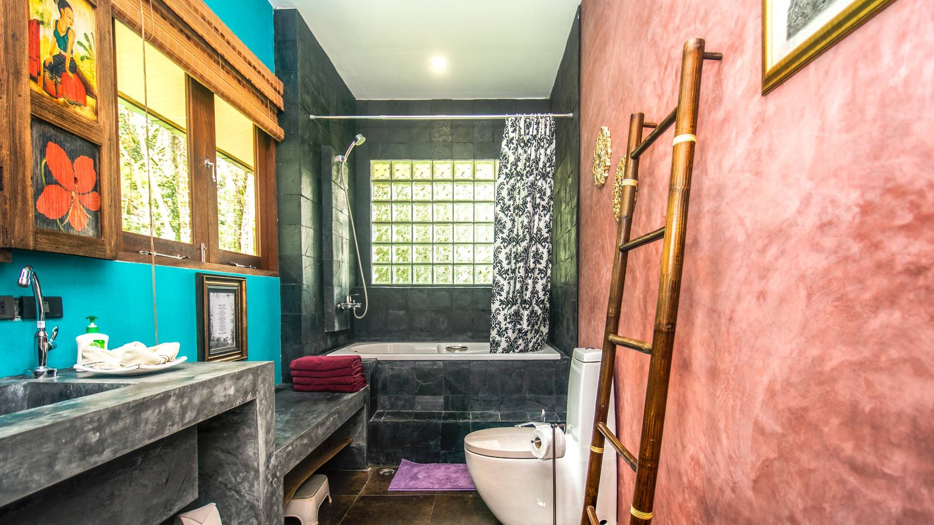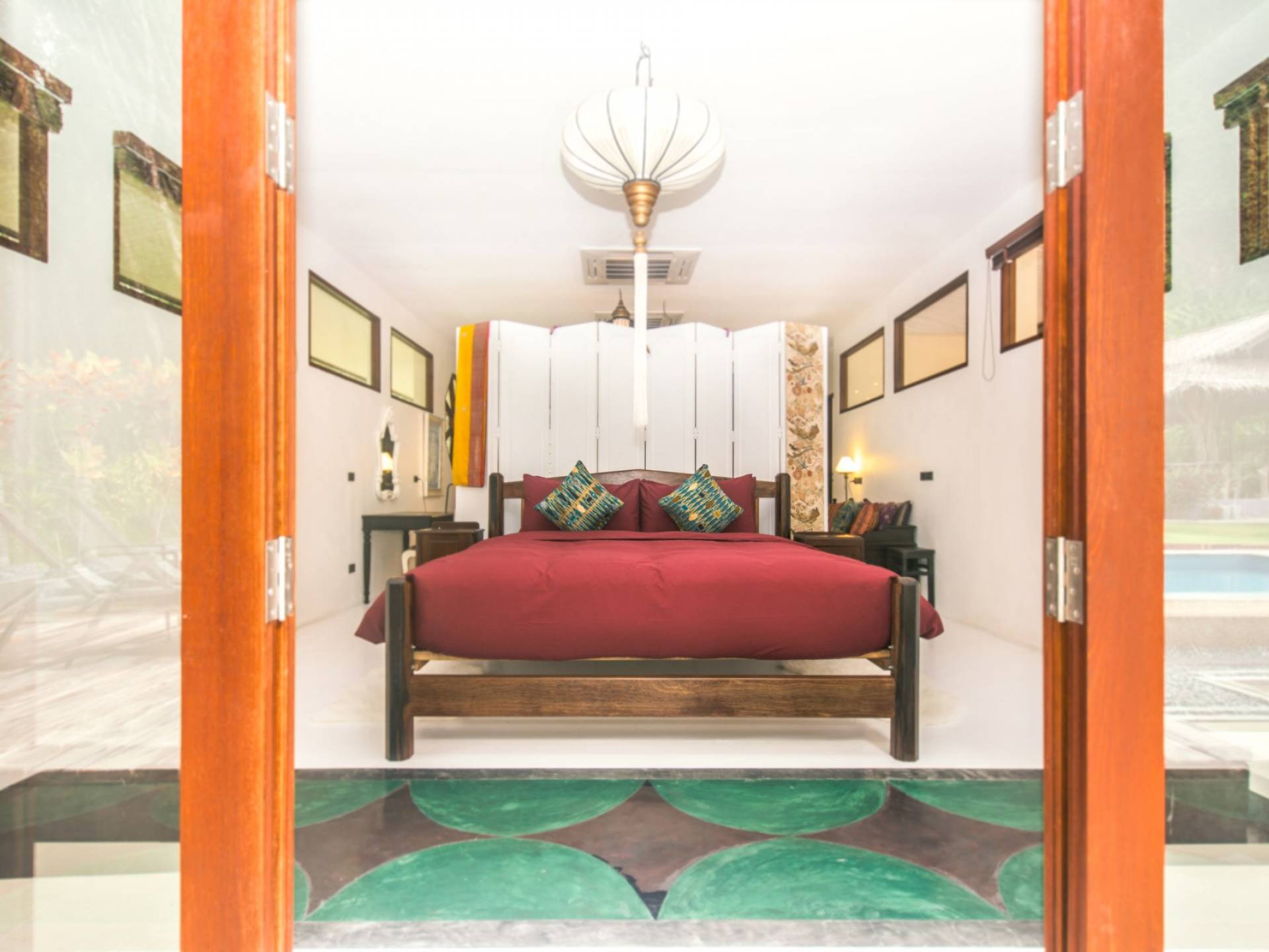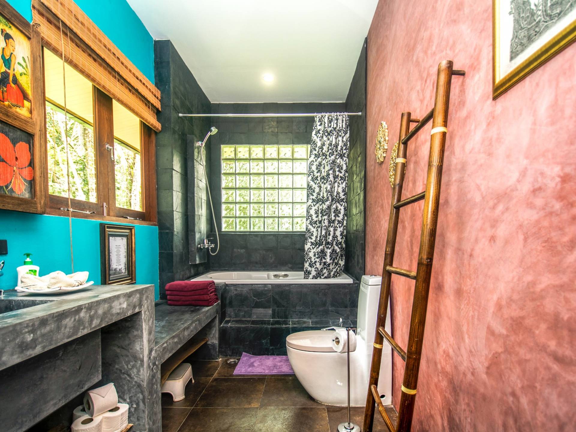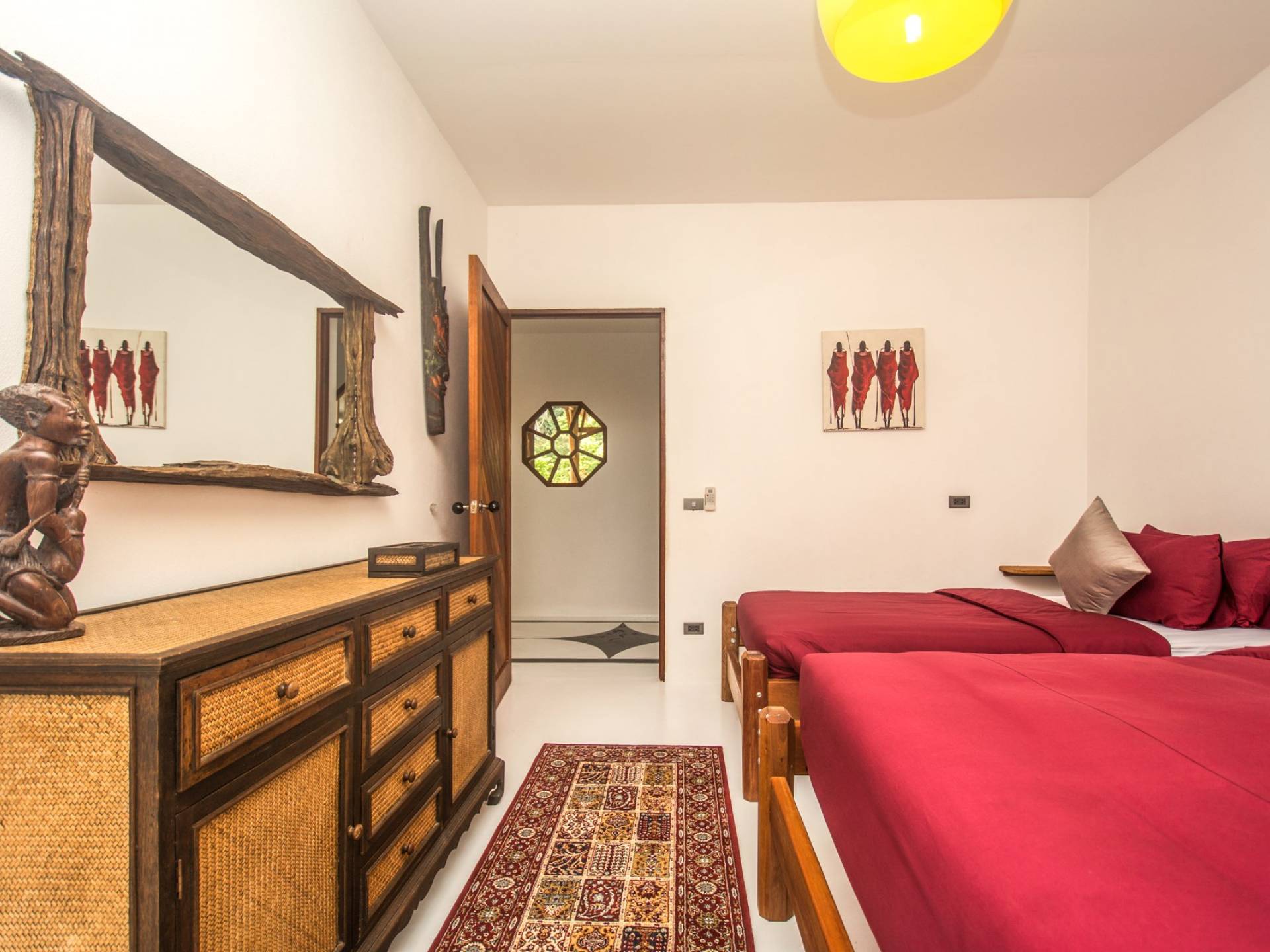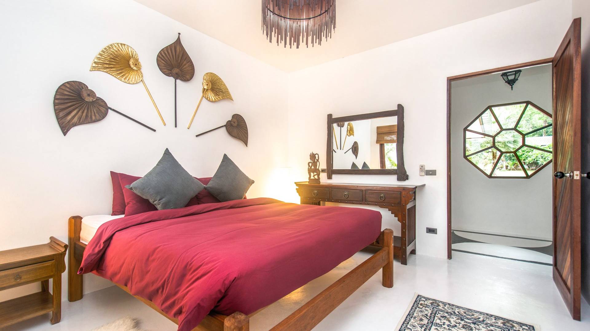 Une porte du salon mène au cinéma et à la salle de jeux. Choisissez votre musique, livre, film ou jeu préféré et évadez-vous dans votre maison de vacances, entièrement climatisée pour votre confort. La cuisine et le salon s'ouvrent sur une grande cour avec un espace couvert. Équipé d'un réfrigérateur, d'un évier, de tables et de sièges confortables pour se détendre, manger et boire. Pour se détendre tranquillement dans la nature, il y a la salle de yoga. Une sala artistique et rustique où vous pourrez passer du temps sous le toit de chaume traditionnel en profitant du climat tropical sous le chaud soleil ou sous une pluie rafraîchissante.