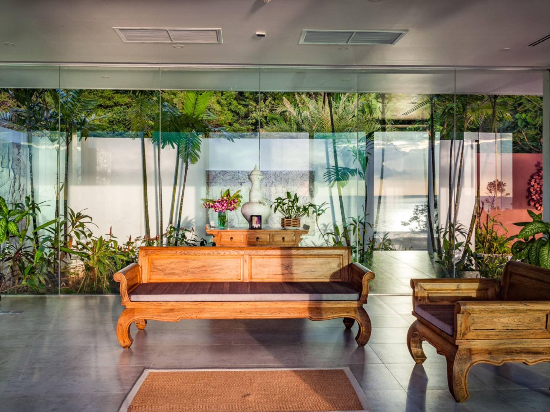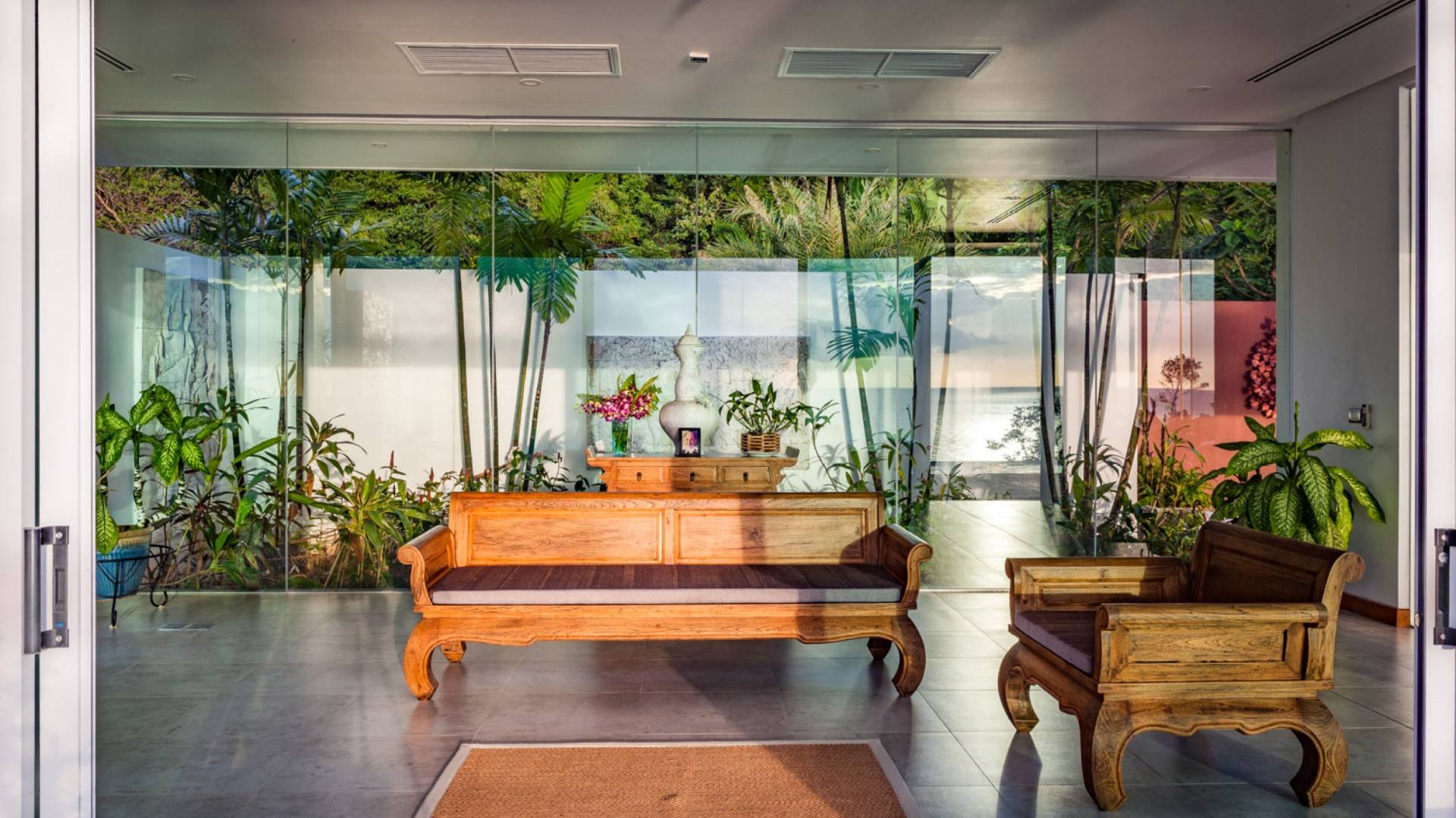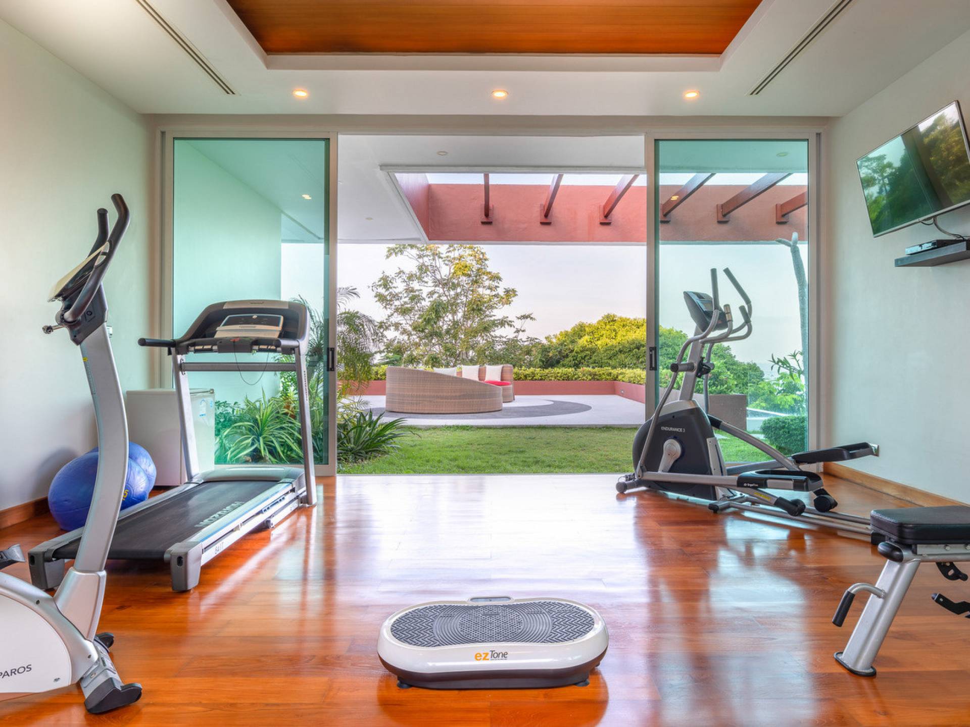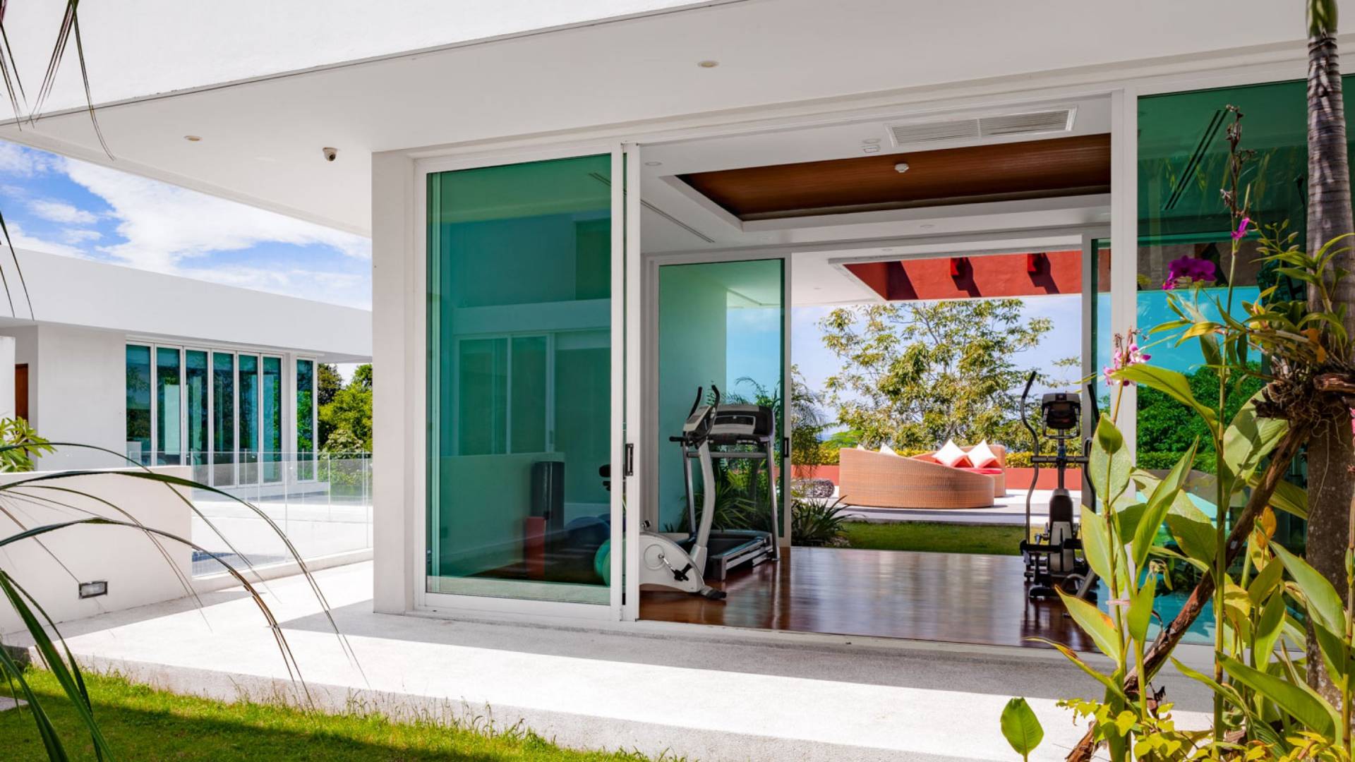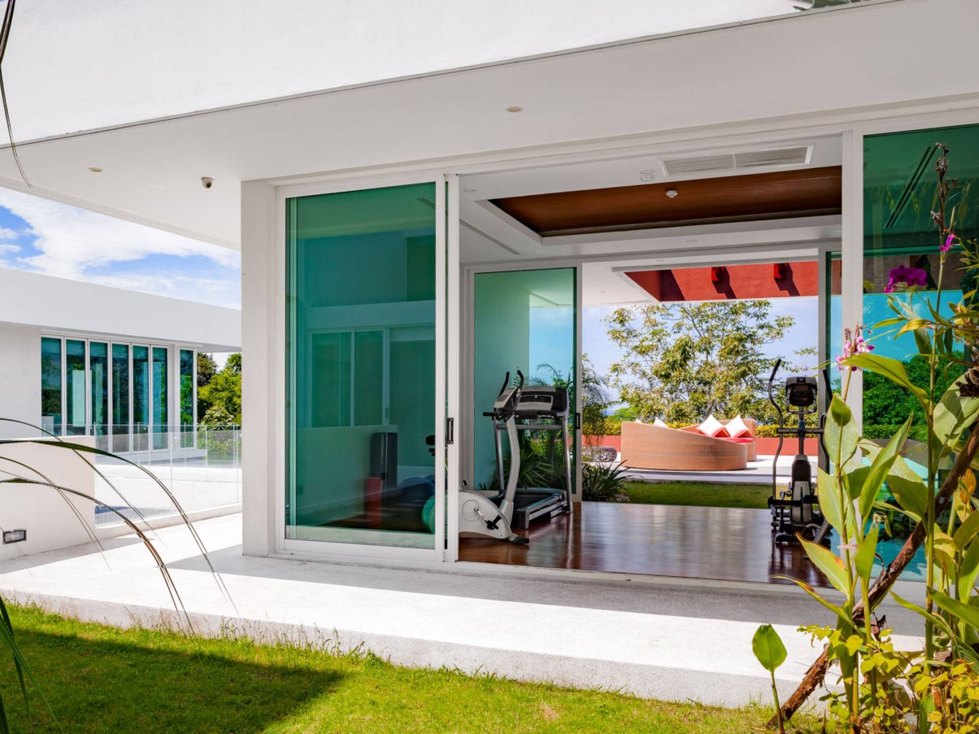 Le pavillon central contient une salle de sport privée, une salle de massage ainsi qu'une chambre offrant une vue spectaculaire à vol d'oiseau sur la mer en contrebas et les troisième et quatrième chambres. En dessous se trouve la deuxième chambre principale, avec la troisième piscine adjacente à un espace barbecue. Entre les trois pavillons principaux, le terrain de la villa est resplendissant de jardins tropicaux matures et de sentiers qui serpentent à travers la vaste propriété.