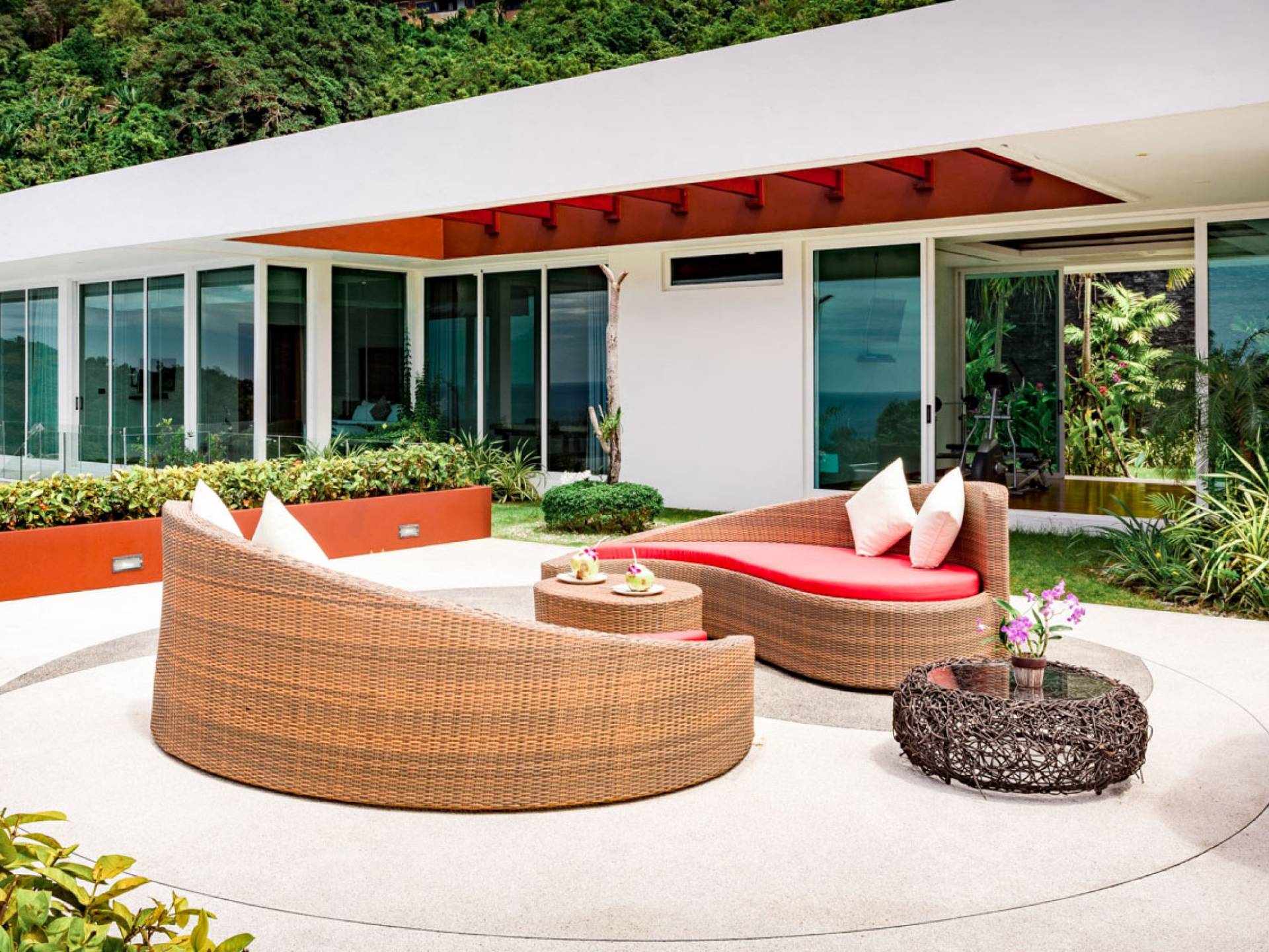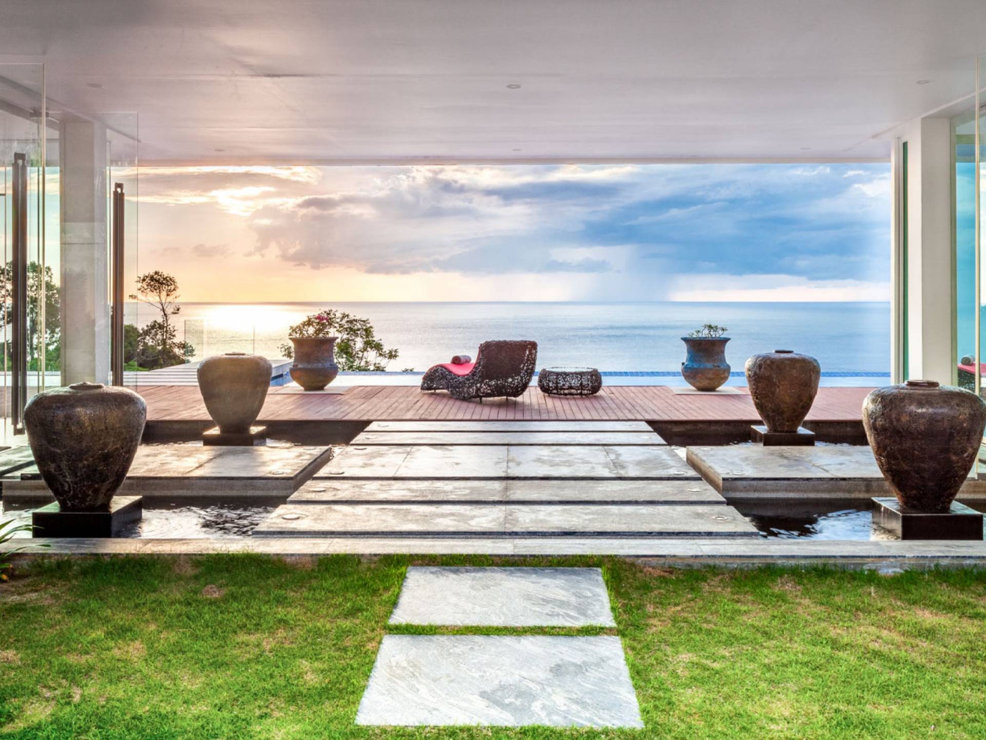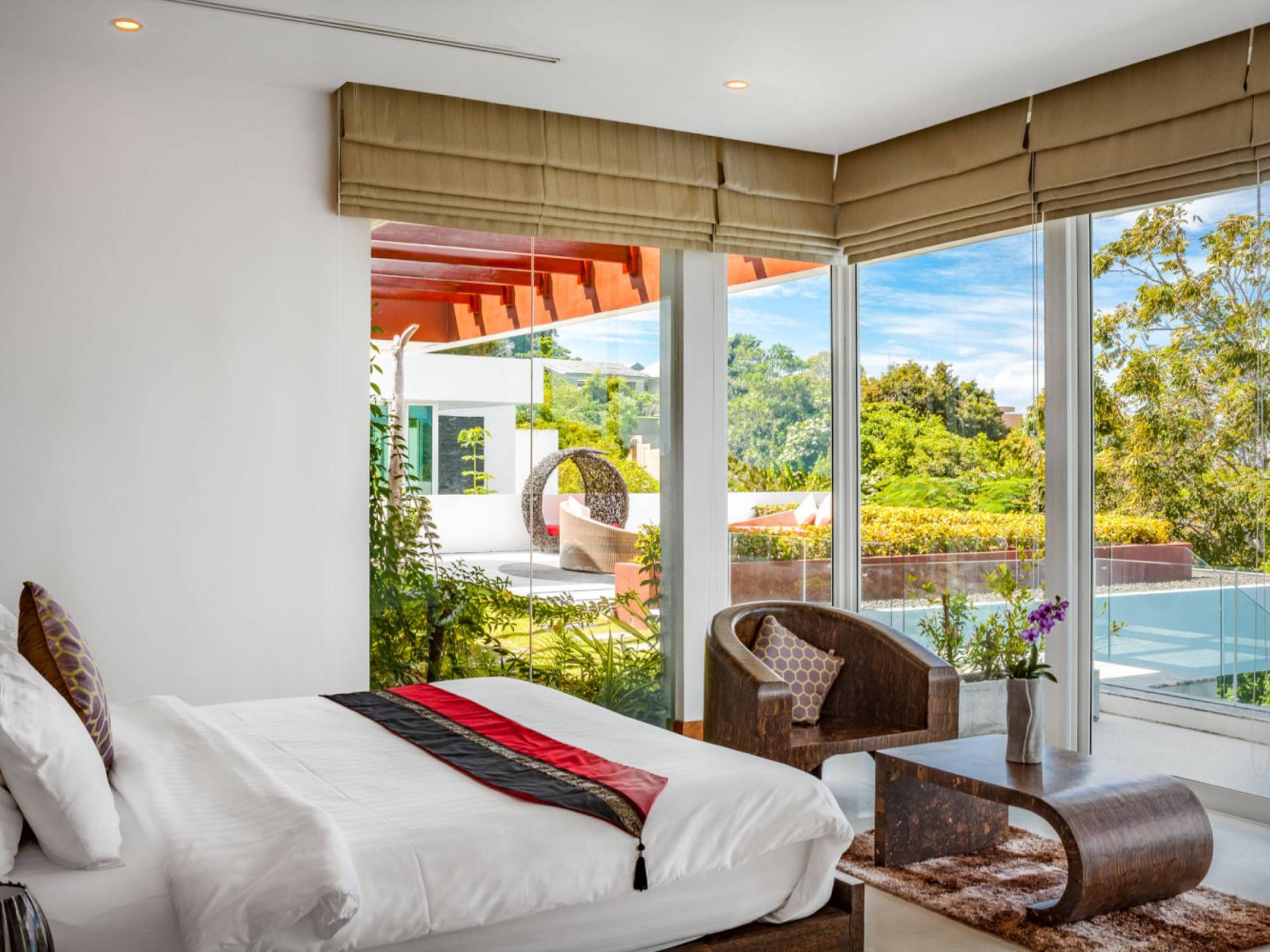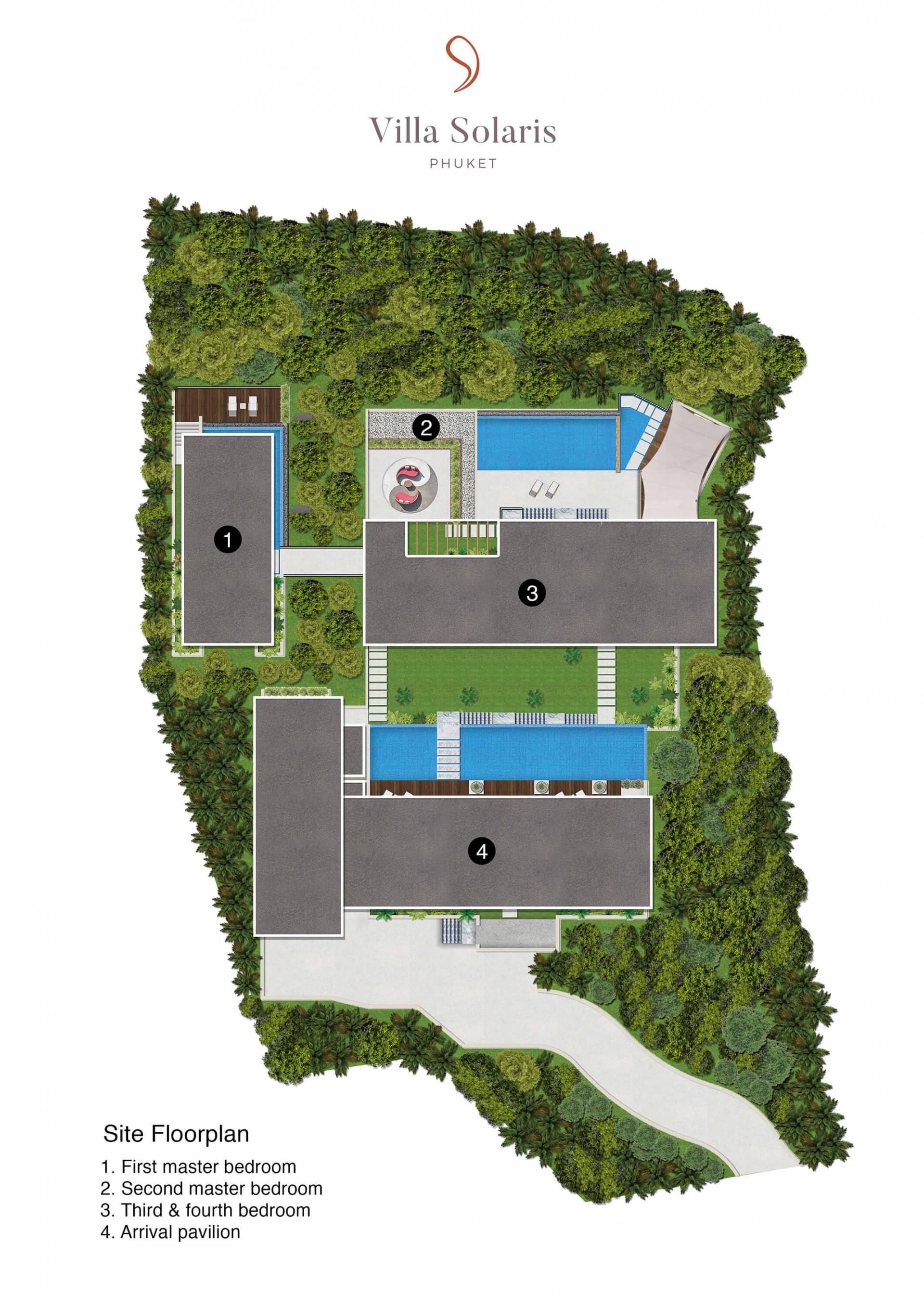Le pavillon central contient une salle de sport privée, une salle de massage ainsi qu'une chambre offrant une vue spectaculaire à vol d'oiseau sur la mer en contrebas et les troisième et quatrième chambres. En dessous se trouve la deuxième chambre principale, avec la troisième piscine adjacente à un espace barbecue. Entre les trois pavillons principaux, le terrain de la villa est resplendissant de jardins tropicaux matures et de sentiers qui serpentent à travers la vaste propriété.