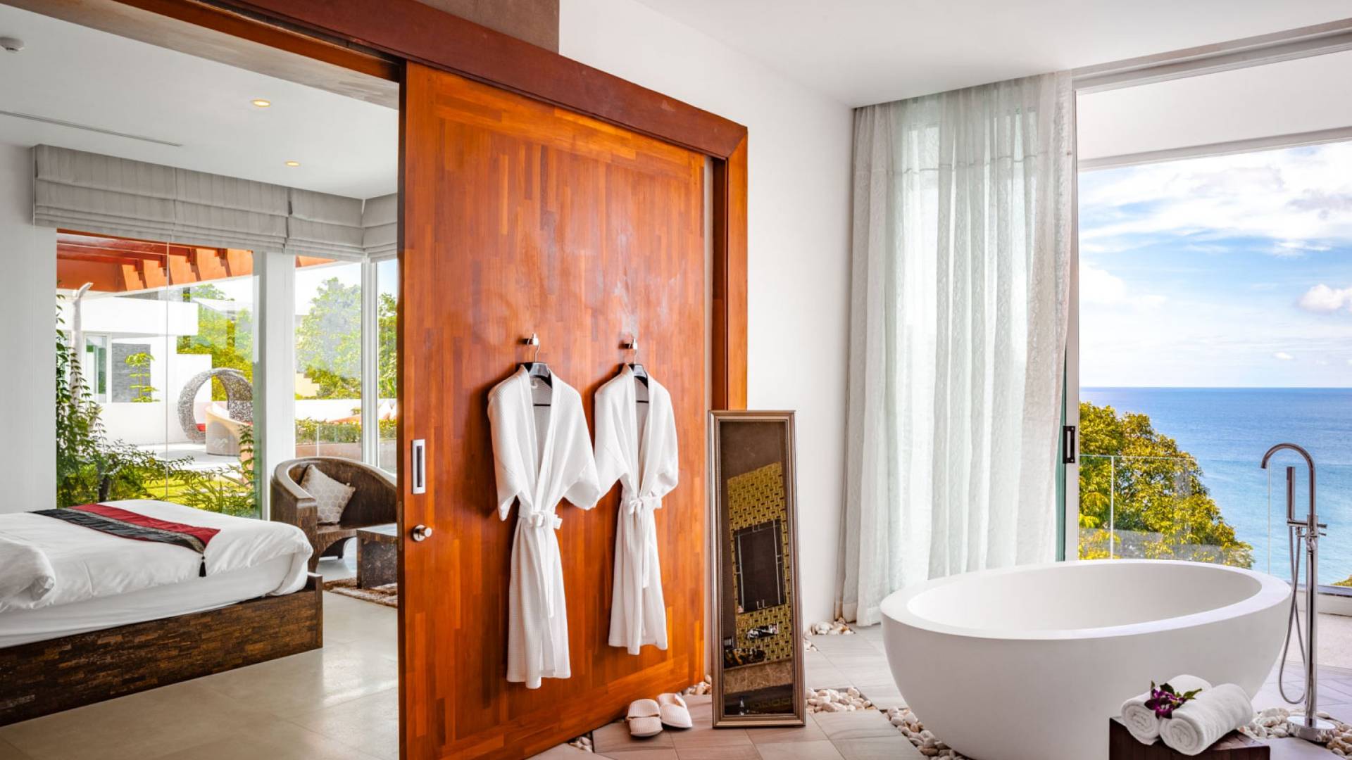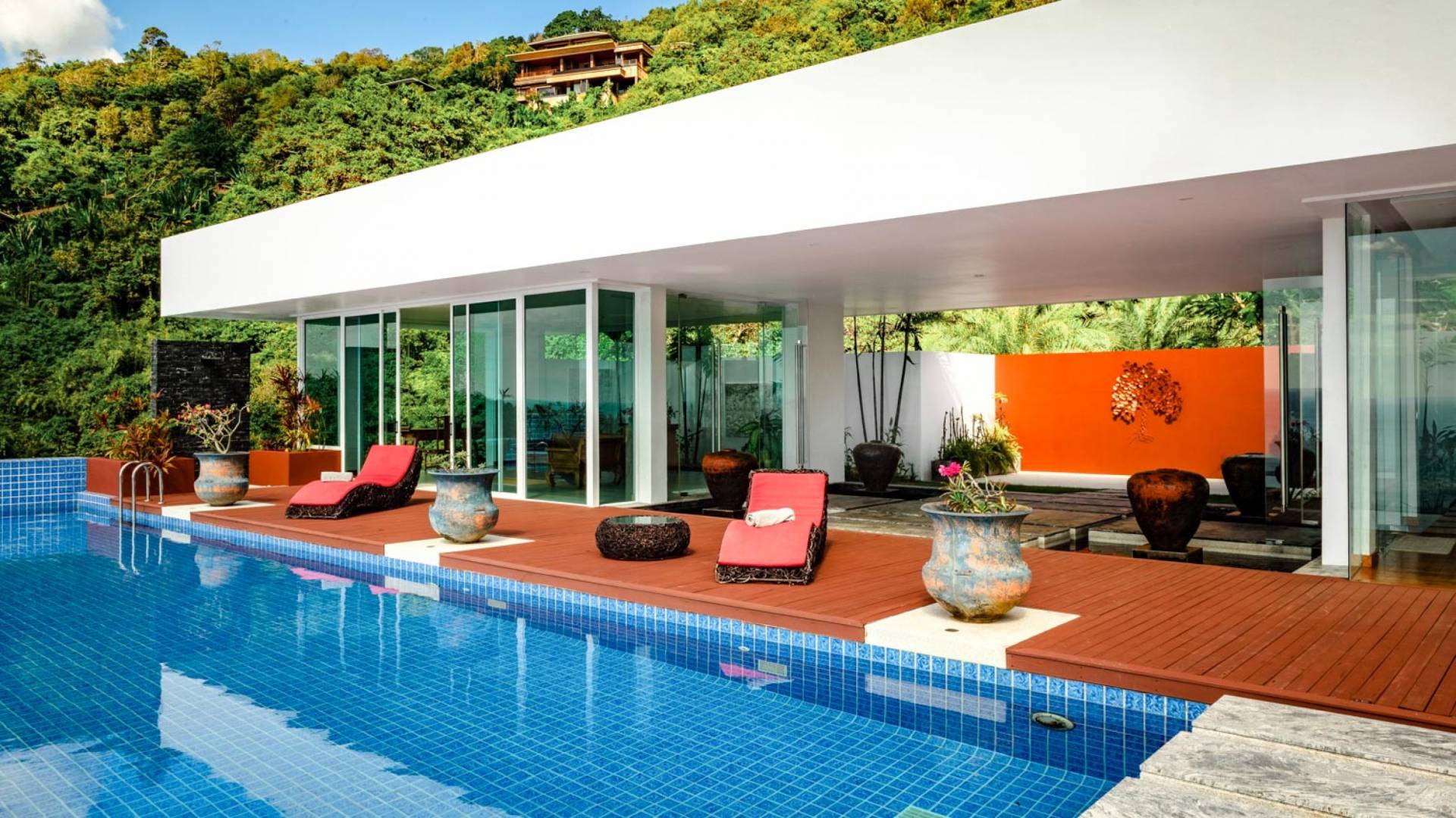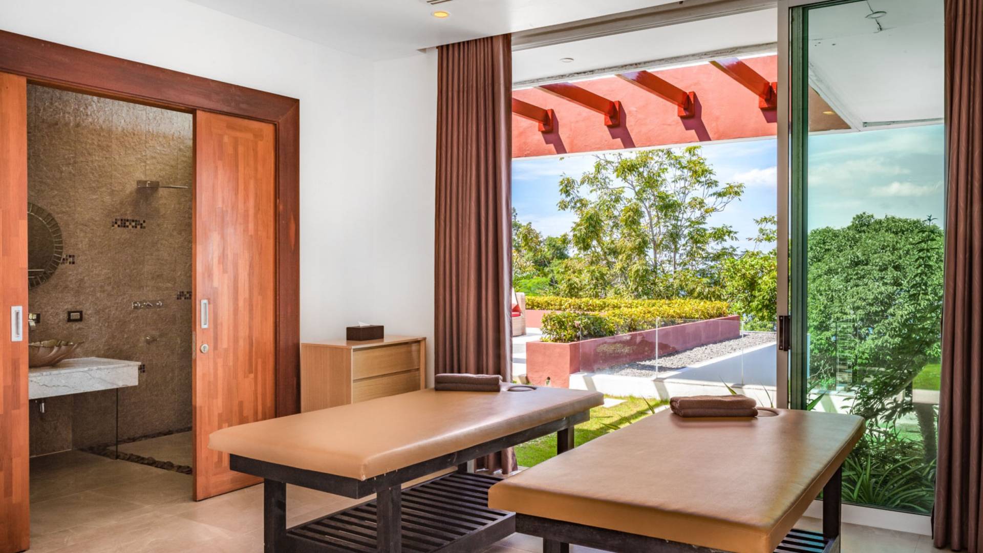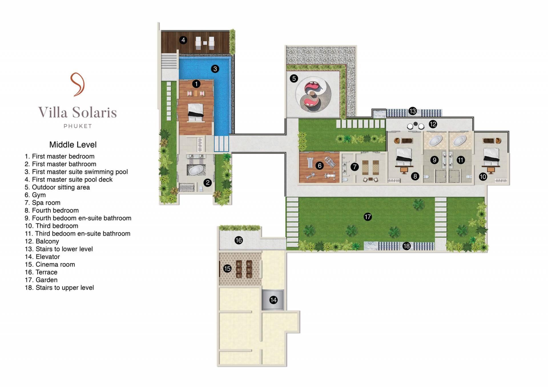 Le pavillon central contient une salle de sport privée, une salle de massage ainsi qu'une chambre offrant une vue spectaculaire à vol d'oiseau sur la mer en contrebas et les troisième et quatrième chambres. En dessous se trouve la deuxième chambre principale, avec la troisième piscine adjacente à un espace barbecue. Entre les trois pavillons principaux, le terrain de la villa est resplendissant de jardins tropicaux matures et de sentiers qui serpentent à travers la vaste propriété.