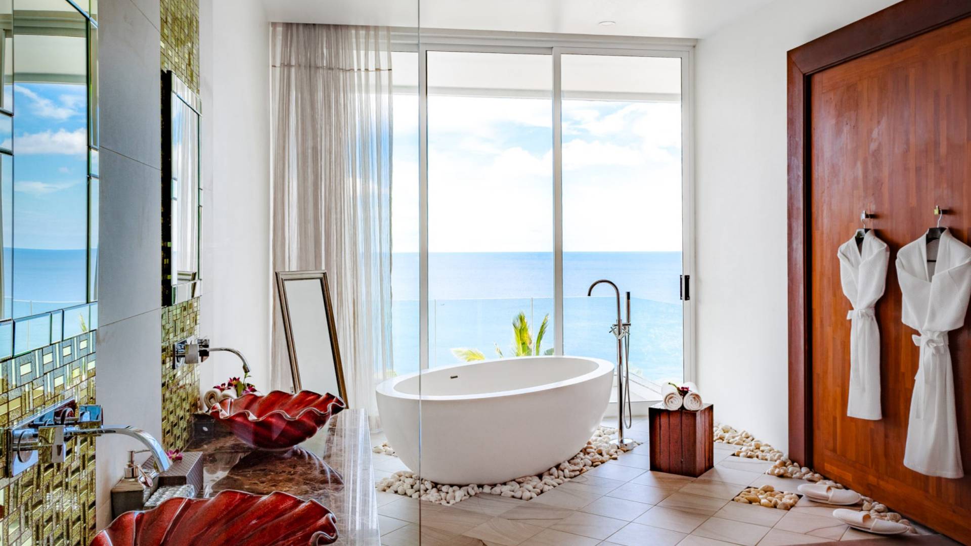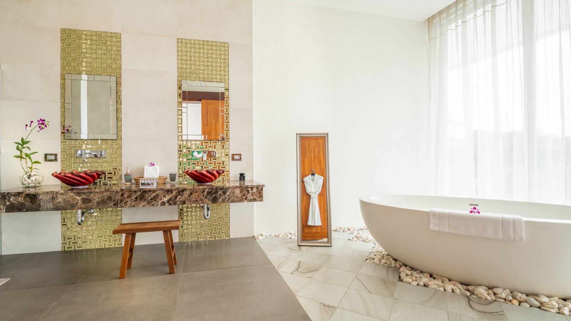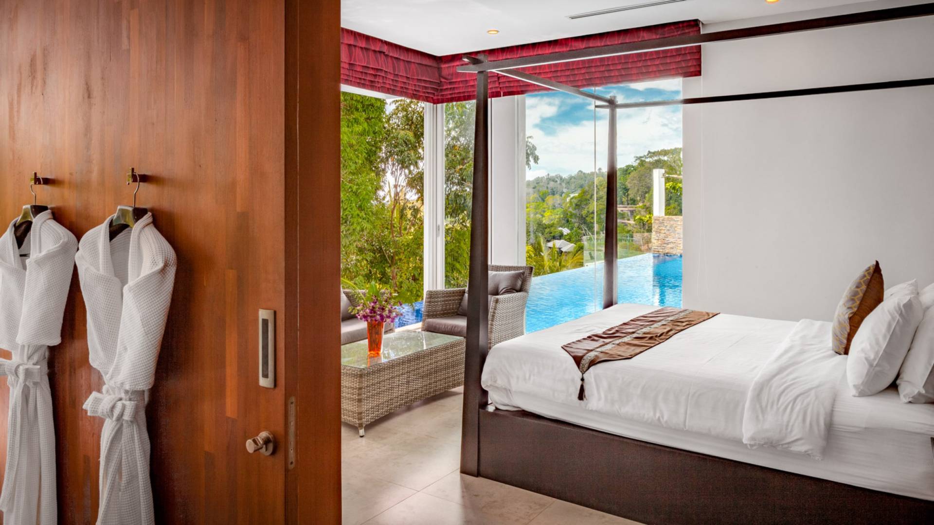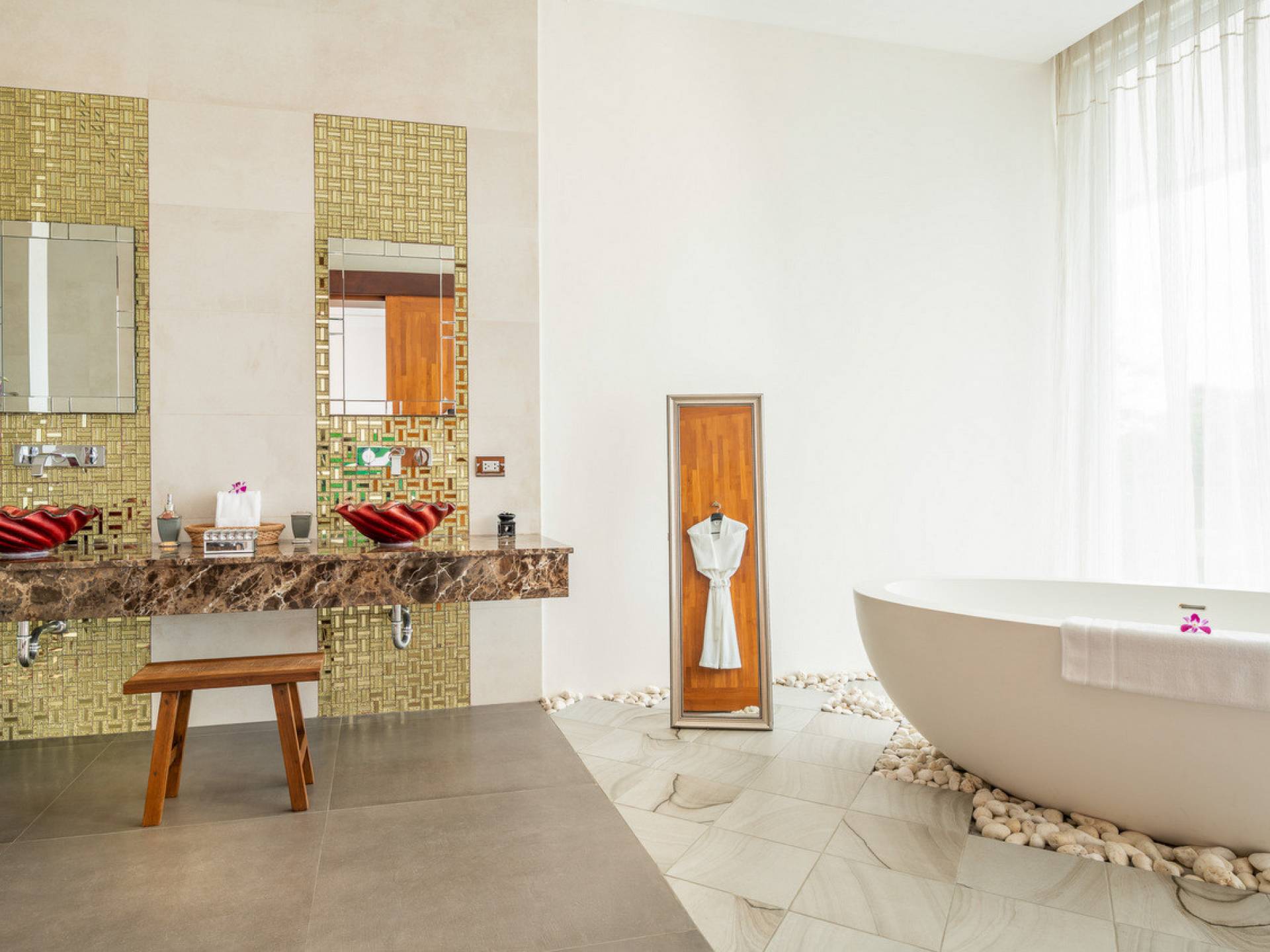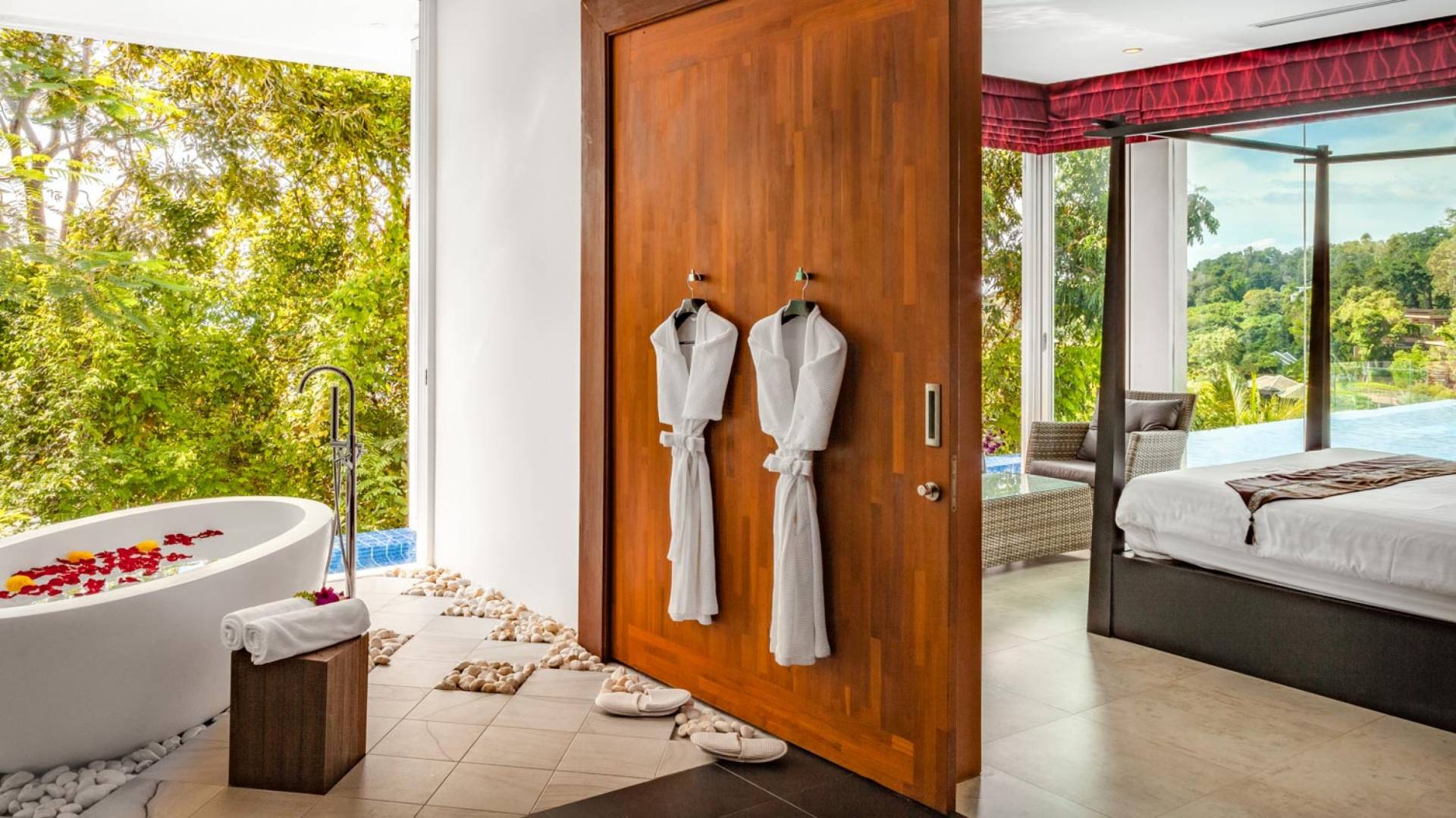 Le pavillon central contient une salle de sport privée, une salle de massage ainsi qu'une chambre offrant une vue spectaculaire à vol d'oiseau sur la mer en contrebas et les troisième et quatrième chambres. En dessous se trouve la deuxième chambre principale, avec la troisième piscine adjacente à un espace barbecue. Entre les trois pavillons principaux, le terrain de la villa est resplendissant de jardins tropicaux matures et de sentiers qui serpentent à travers la vaste propriété.