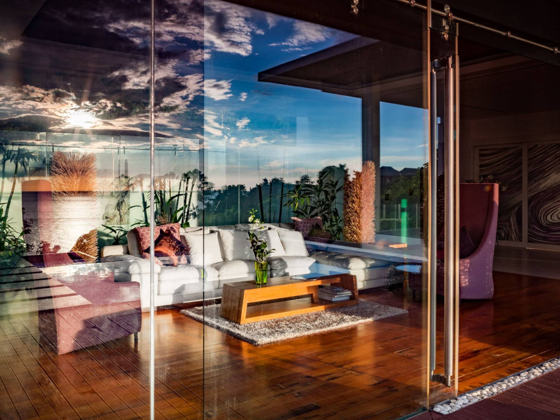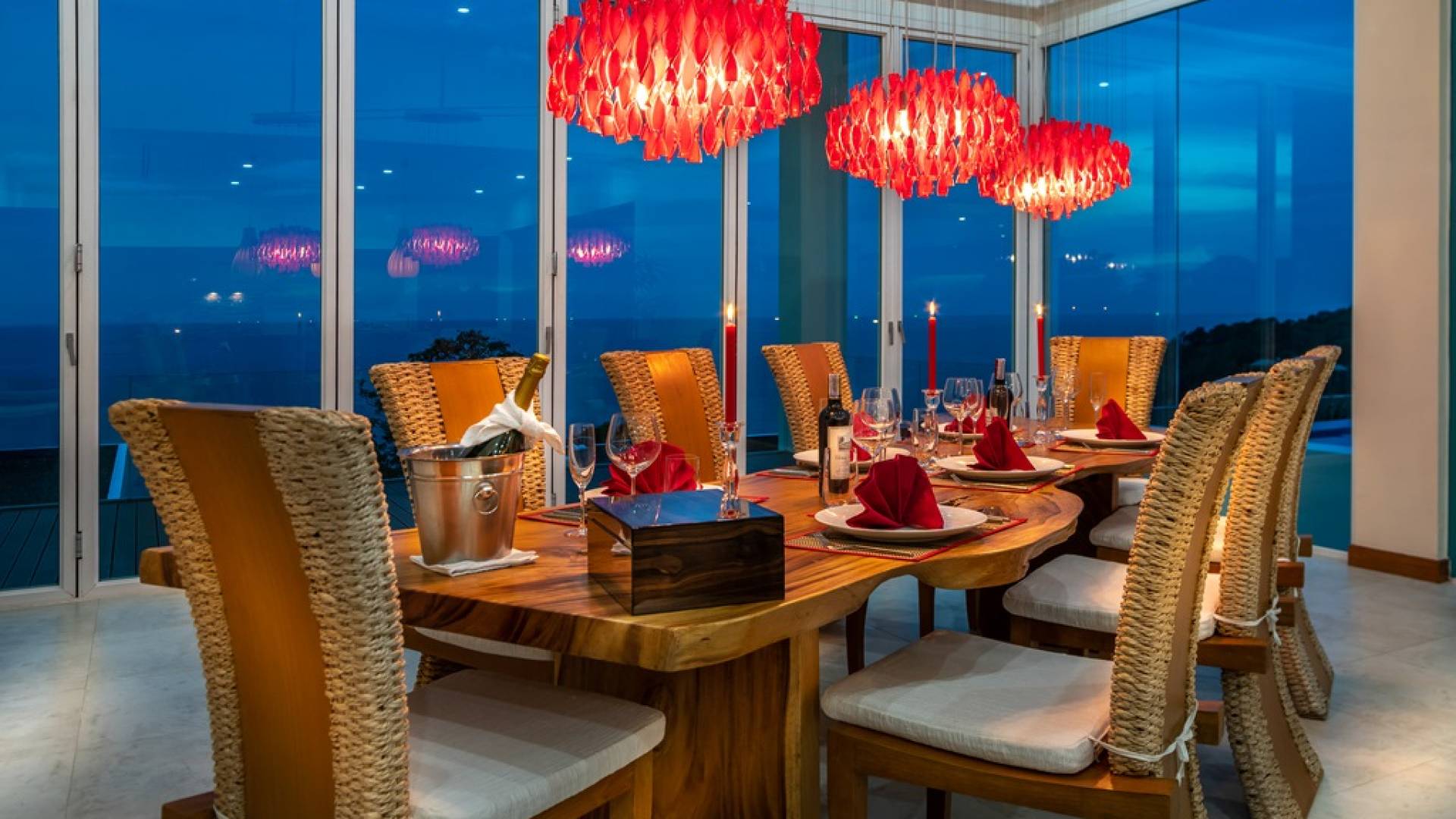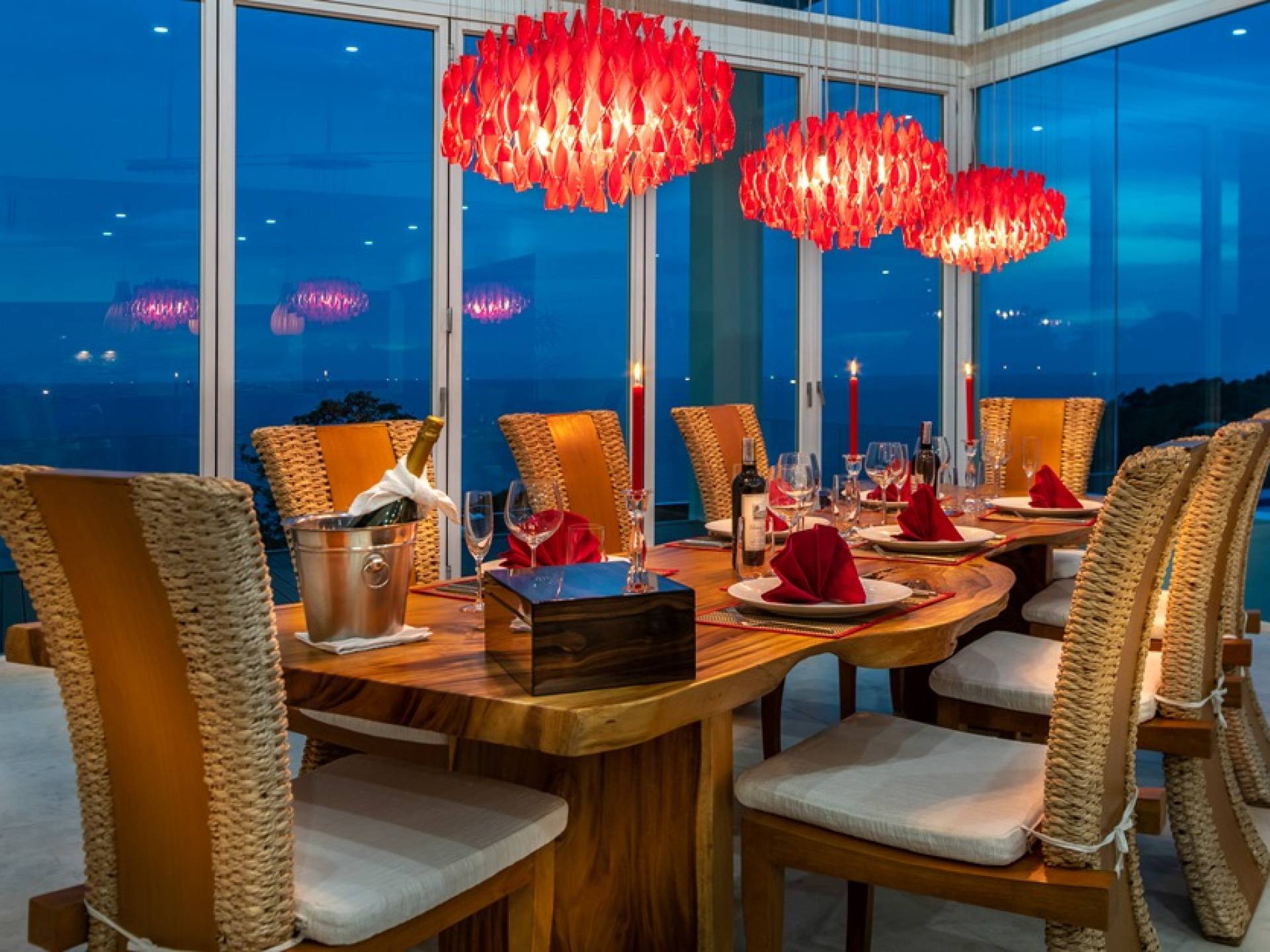 Enroulé autour de la piscine supérieure du pavillon de vie principal se trouve un vaste espace de vie décloisonné qui est relié à une grande terrasse surplombant le reste de la villa et la première des trois piscines. Les baies vitrées rendent l'espace à la fois lumineux et aéré et offrent une vue panoramique imprenable depuis le salon et la salle à manger. Attenante à la salle à manger se trouve une cuisine moderne et entièrement équipée. Accédez à l'ascenseur ou descendez les escaliers pour atteindre les autres niveaux du complexe.