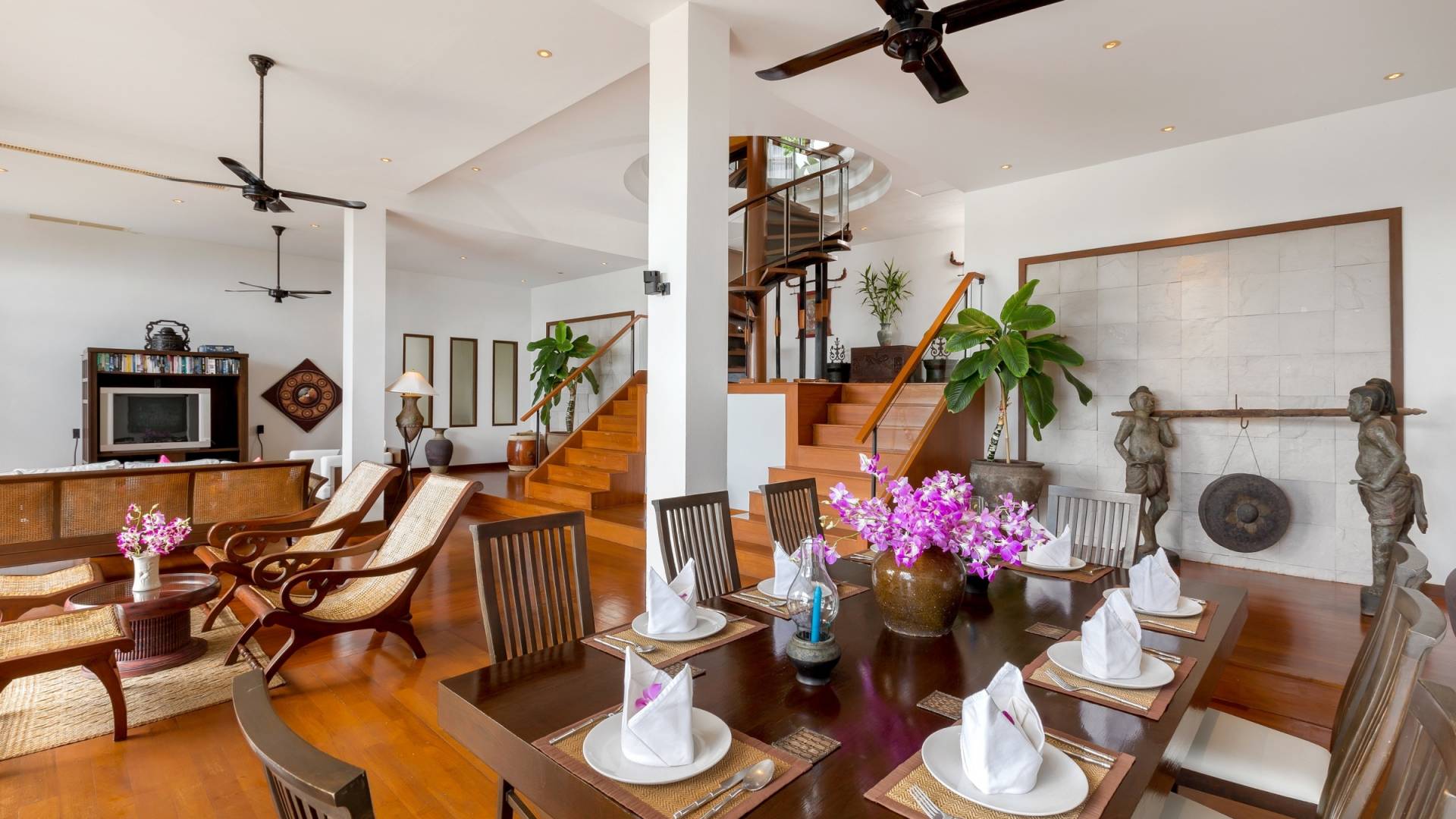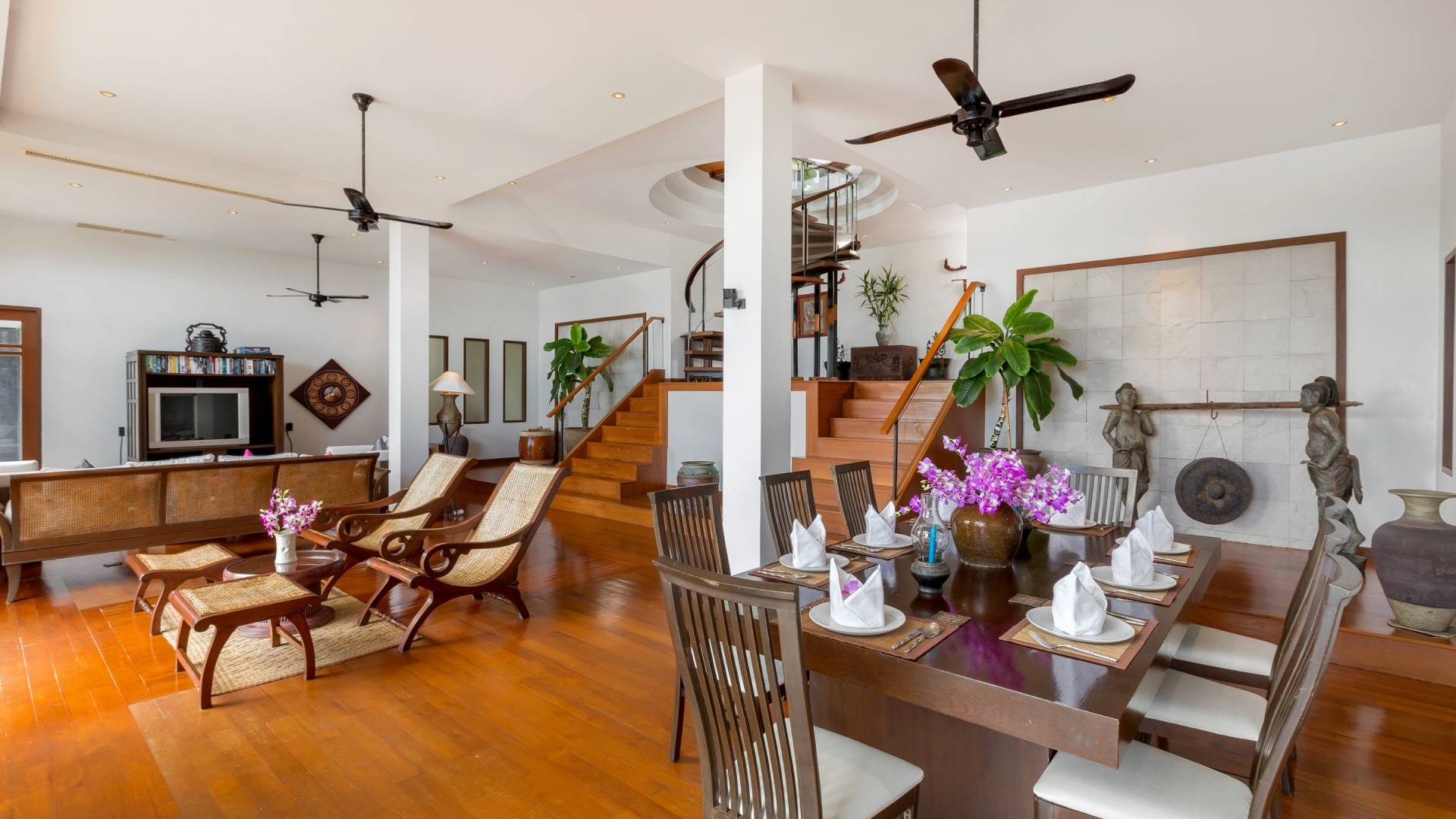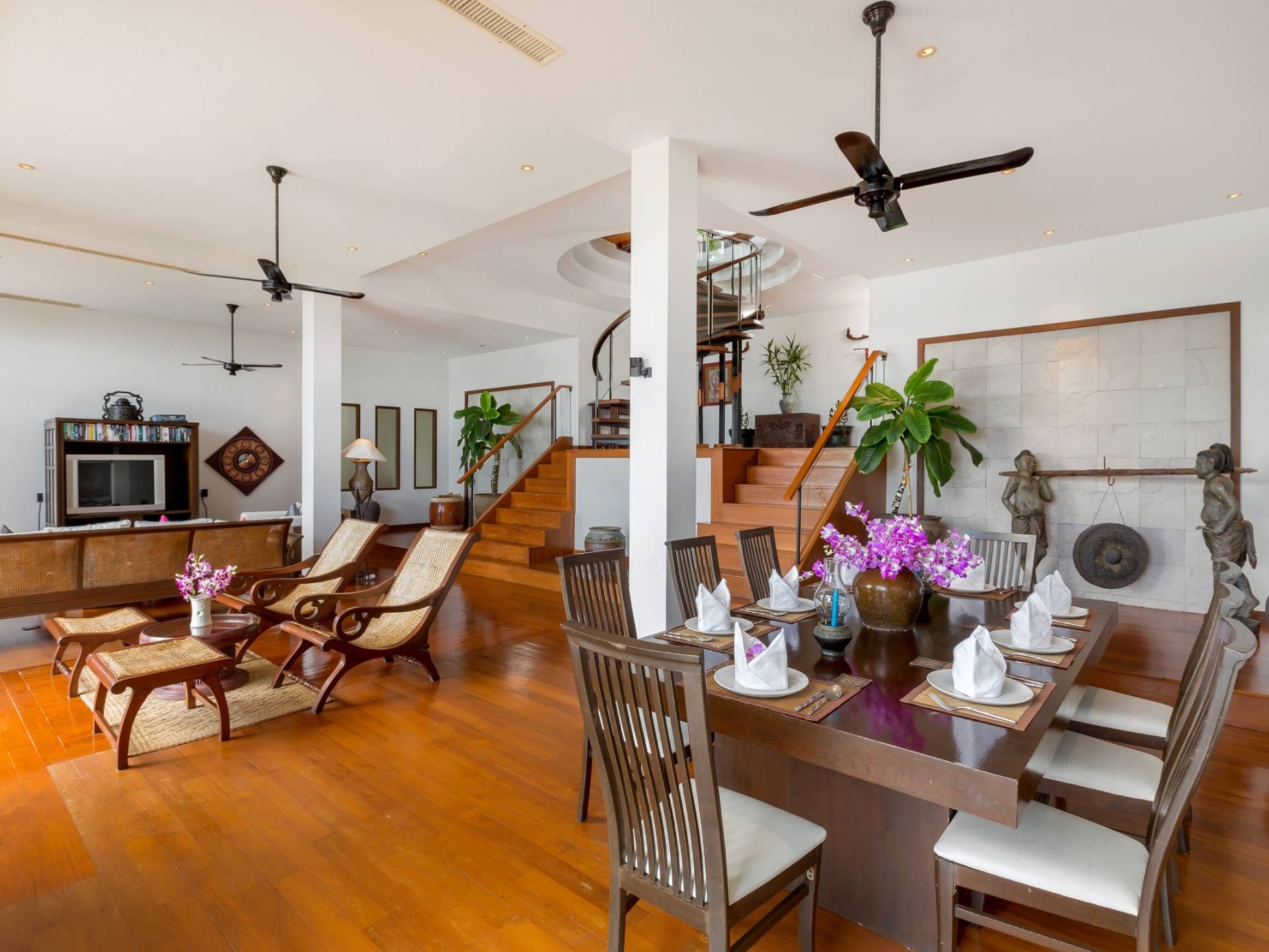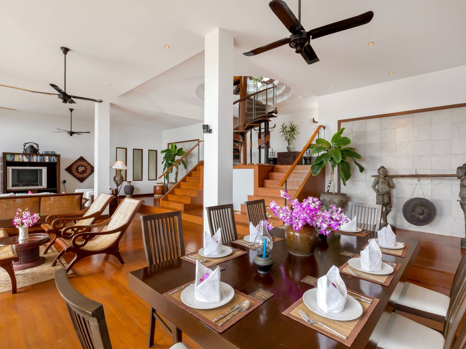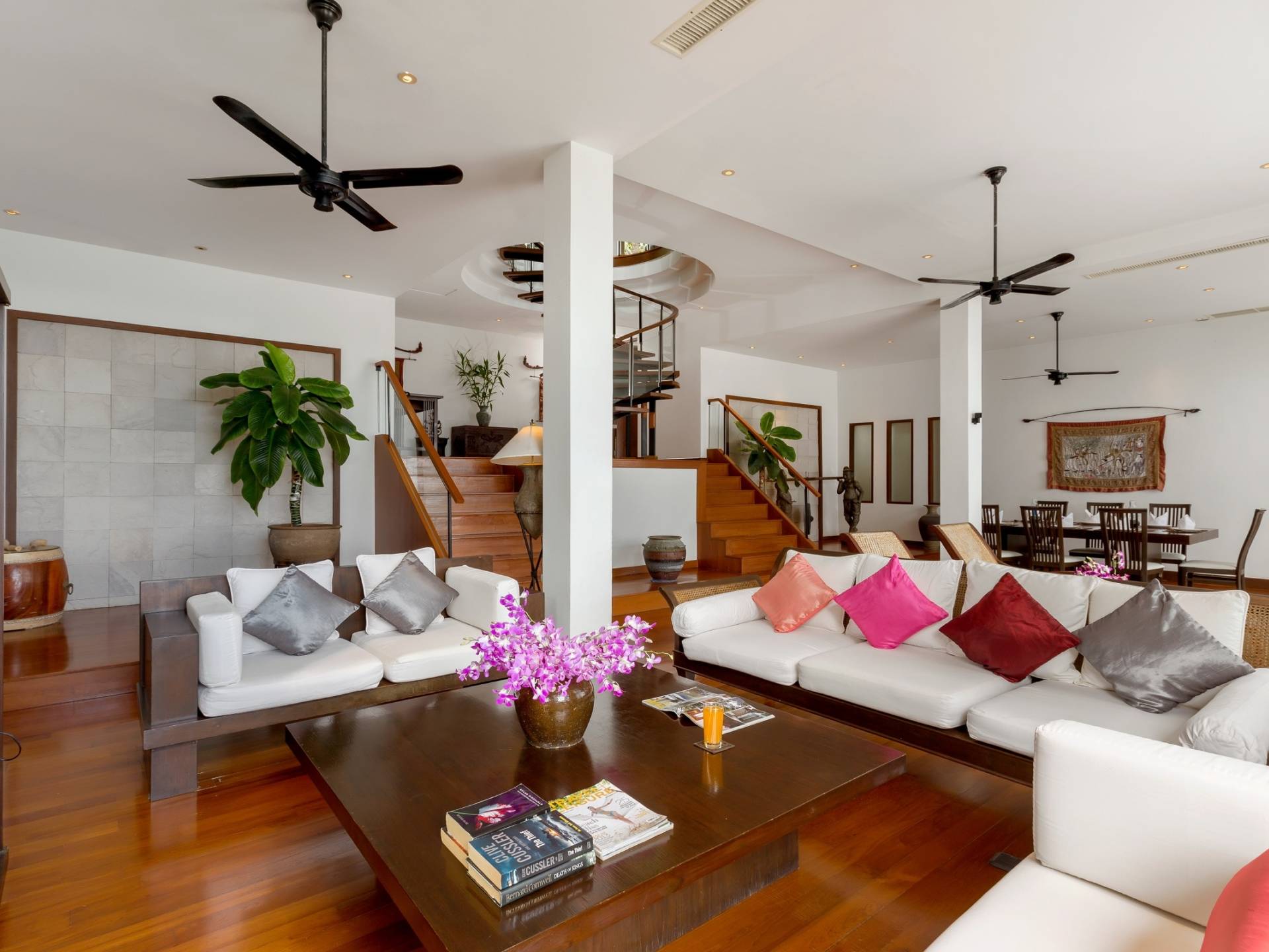 Un étage supplémentaire comprend une grande chambre/salle polyvalente idéale pour les enfants et bénéficiant d'une vue sur la mer et dispose d'une petite terrasse ainsi que d'une salle de bain privée (pas attenante). Les lits jumeaux peuvent être rapprochés pour former un lit king-size et deux lits pliants sont disponibles pour les enfants supplémentaires. Le grand espace de vie avec un plafond exceptionnellement haut et une étendue de verre dans les portes s'ouvre sur la terrasse et donne une merveilleuse sensation d'espace et de lumière. Une grande table à manger à une extrémité peut facilement accueillir 10 personnes. Le coin salon comprend des canapés et des chaises confortables disposés autour d'une grande table basse. Un système audio Bose télécommandé à la pointe de la technologie est relié au home cinéma, avec une télévision satellite grand écran avec une large gamme de chaînes, DVD, magnétoscope et CD. L'éclairage informatisé spécialisé vous permet de créer la bonne ambiance à toute heure du jour ou de la nuit sur simple pression d'un bouton. La climatisation entièrement contrôlable vous permet d'obtenir la température idéale, bien qu'avec toutes les portes ouvertes, vous puissiez profiter d'une brise merveilleuse. Le visiophone permet ici de parler aux visiteurs à la porte et de l'ouvrir pour eux. Juste à côté, la cuisine de style occidental entièrement équipée est le quartier de la bonne. Conçu pour donner une intimité totale aux invités, cet espace dispose d'une cuisine de bonne et d'une buanderie séparée.
