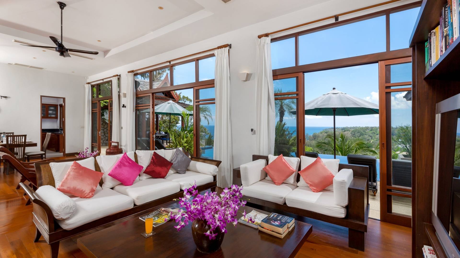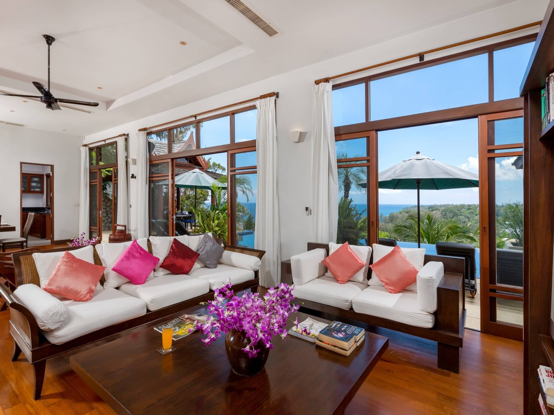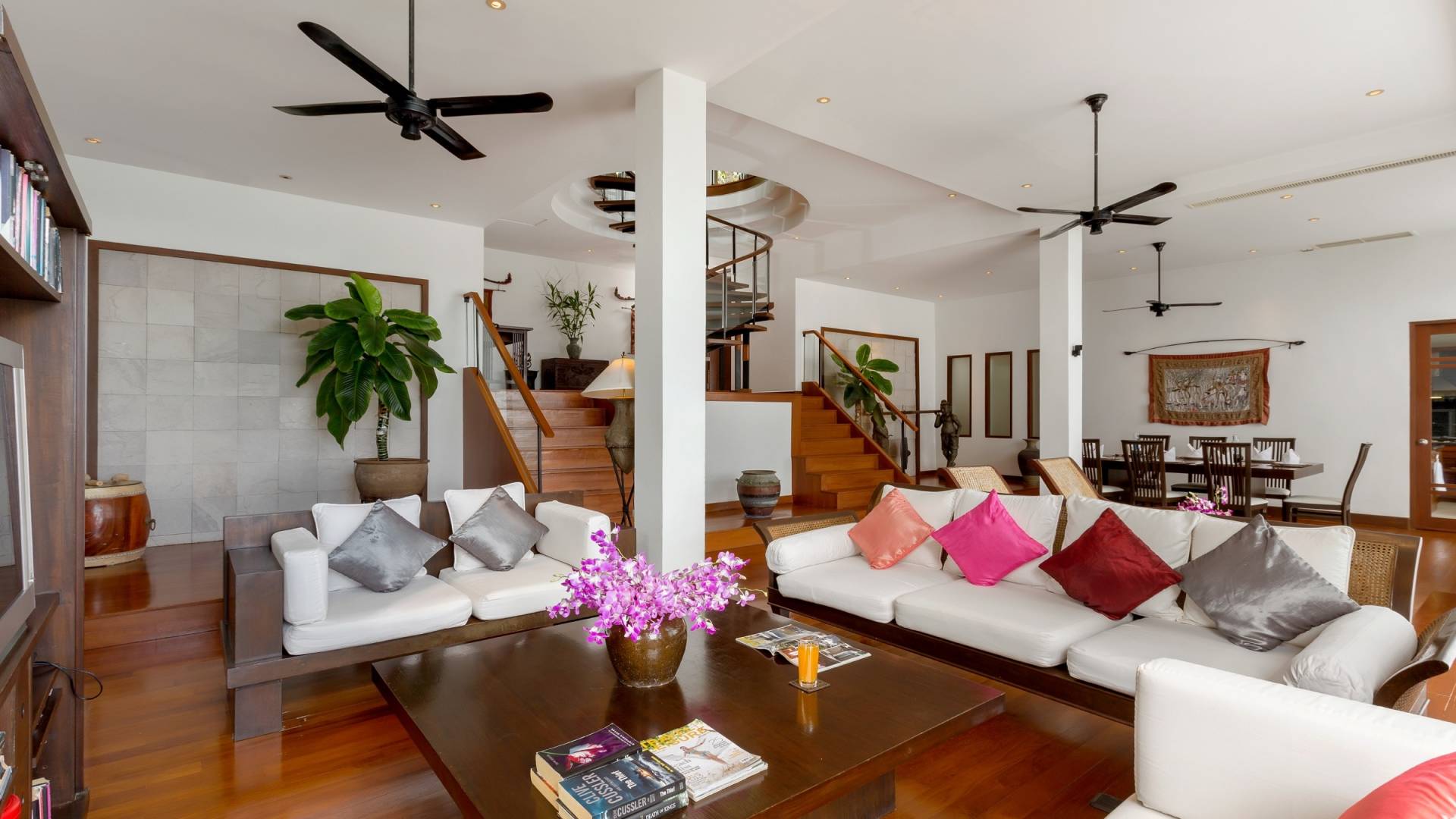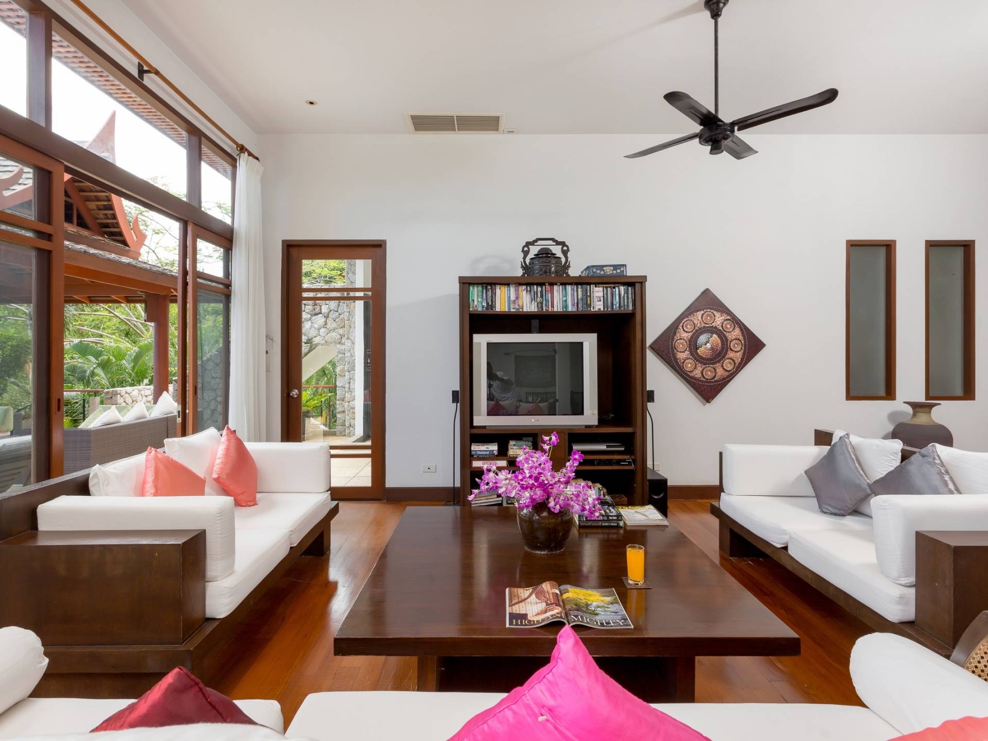 Un étage supplémentaire comprend une grande chambre/salle polyvalente idéale pour les enfants et bénéficiant d'une vue sur la mer et dispose d'une petite terrasse ainsi que d'une salle de bain privée (pas attenante). Les lits jumeaux peuvent être rapprochés pour former un lit king-size et deux lits pliants sont disponibles pour les enfants supplémentaires. Le grand espace de vie avec un plafond exceptionnellement haut et une étendue de verre dans les portes s'ouvre sur la terrasse et donne une merveilleuse sensation d'espace et de lumière. Une grande table à manger à une extrémité peut facilement accueillir 10 personnes. Le coin salon comprend des canapés et des chaises confortables disposés autour d'une grande table basse. Un système audio Bose télécommandé à la pointe de la technologie est relié au home cinéma, avec une télévision satellite grand écran avec une large gamme de chaînes, DVD, magnétoscope et CD. L'éclairage informatisé spécialisé vous permet de créer la bonne ambiance à toute heure du jour ou de la nuit sur simple pression d'un bouton. La climatisation entièrement contrôlable vous permet d'obtenir la température idéale, bien qu'avec toutes les portes ouvertes, vous puissiez profiter d'une brise merveilleuse. Le visiophone permet ici de parler aux visiteurs à la porte et de l'ouvrir pour eux. Juste à côté, la cuisine de style occidental entièrement équipée est le quartier de la bonne. Conçu pour donner une intimité totale aux invités, cet espace dispose d'une cuisine de bonne et d'une buanderie séparée.